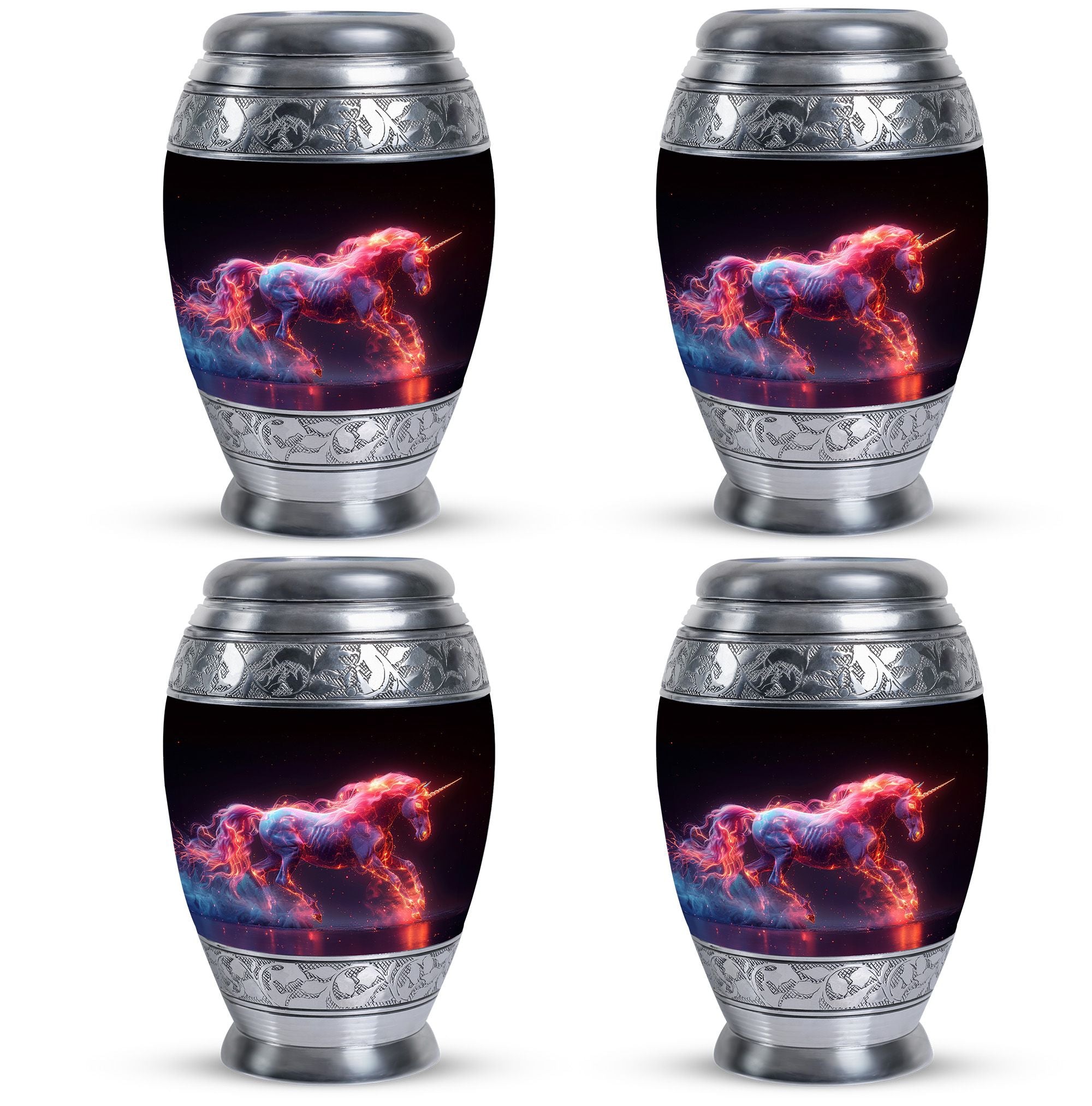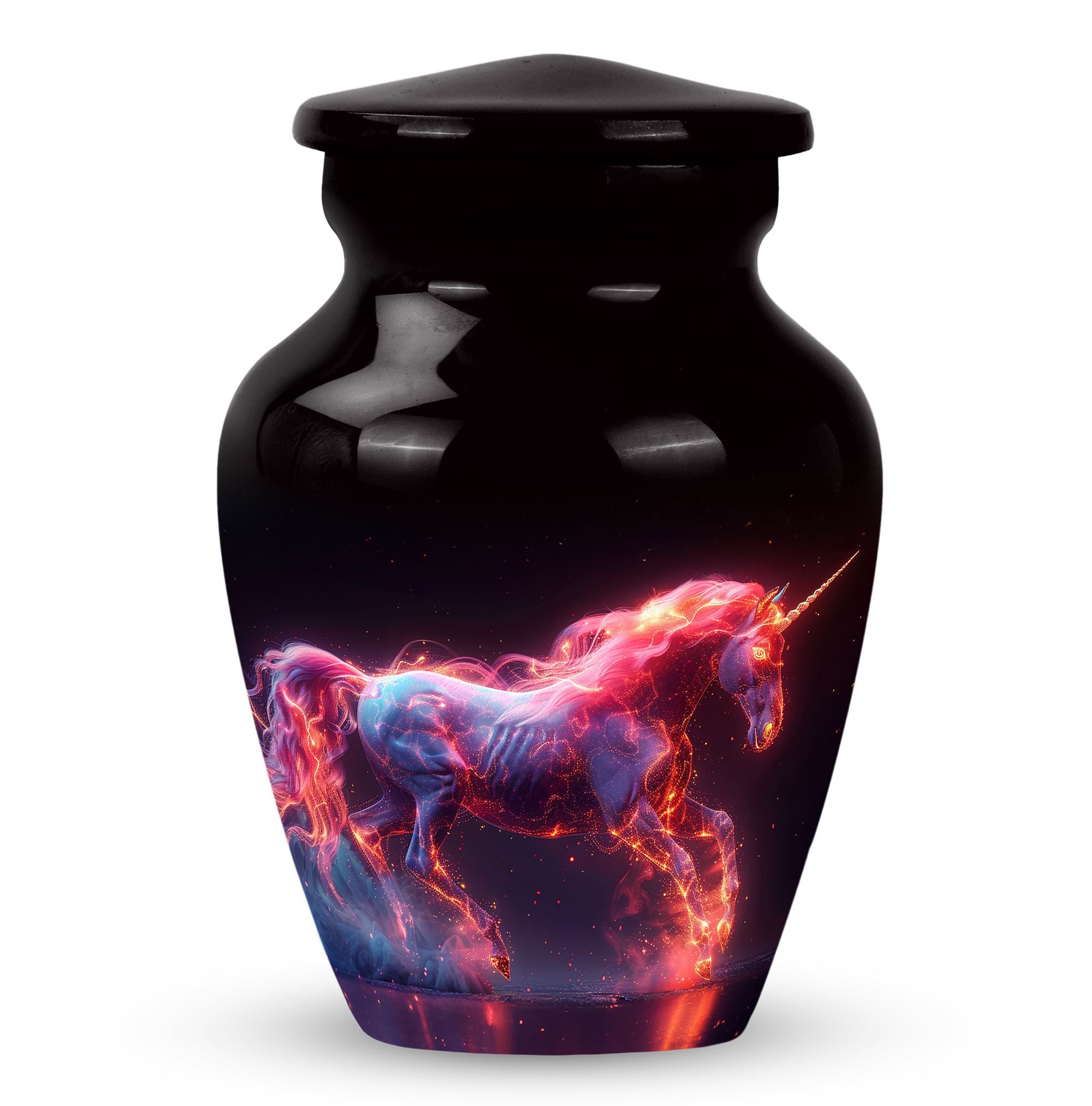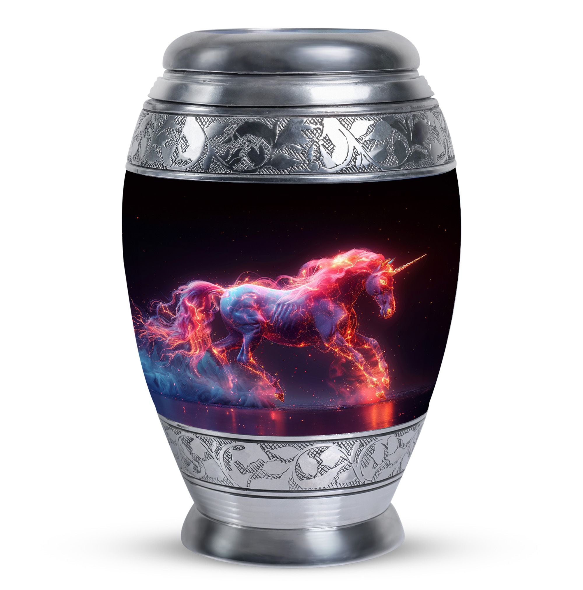 Crafted from durable aluminum, this urn combines strength with radiant artistry. Its cosmic unicorn design reflects hope, purity, and eternal light. With a secure screw-top lid, it keeps ashes safe while standing as a symbol of love. Perfect as adult funeral urns for men or women, it also serves as one of our unique urns for ashes, treasured for its rare design and meaningful symbolism.