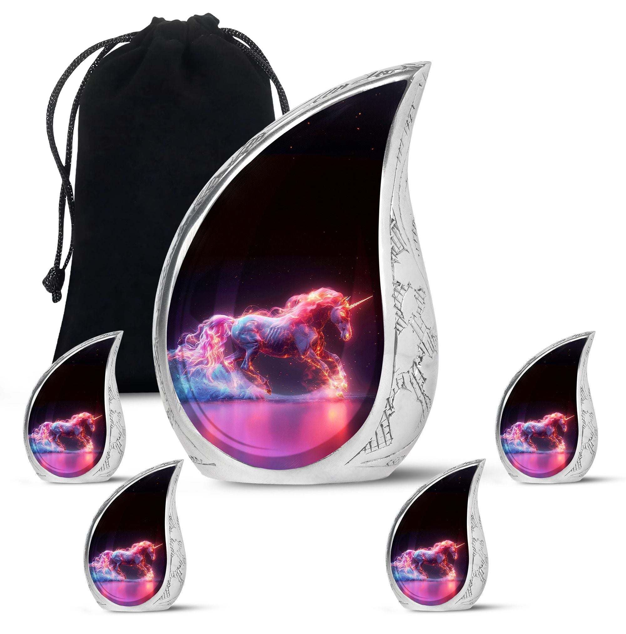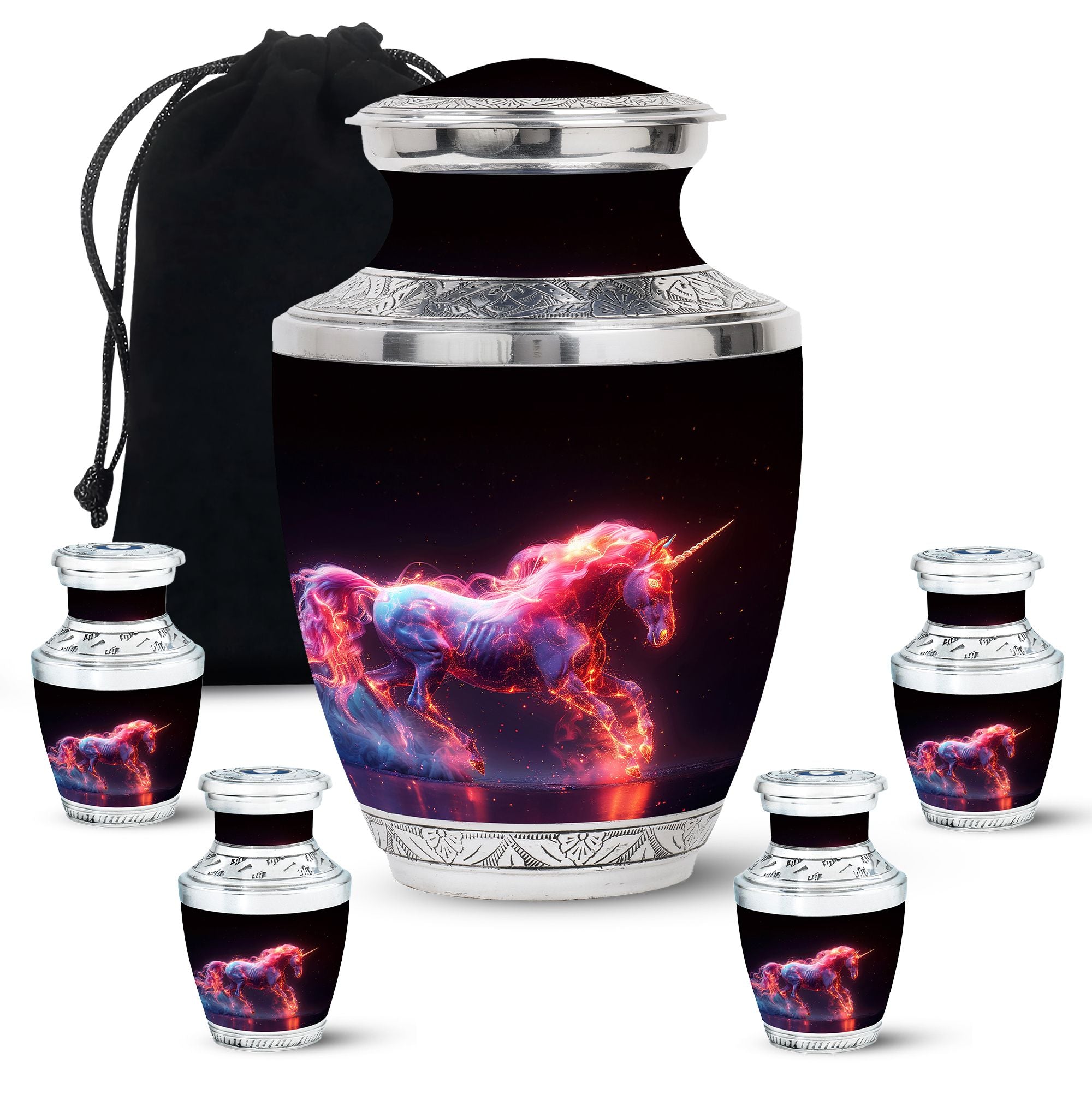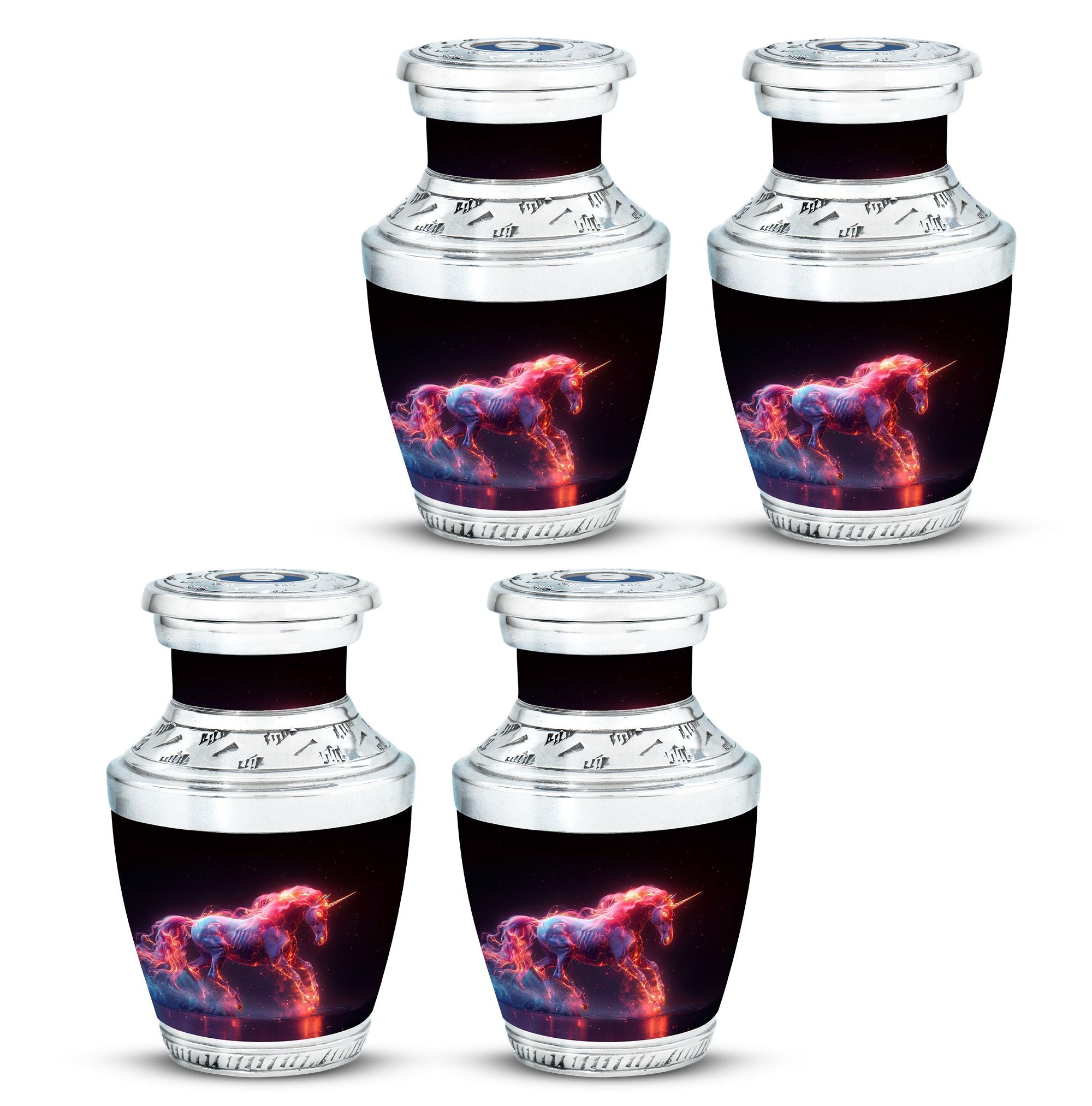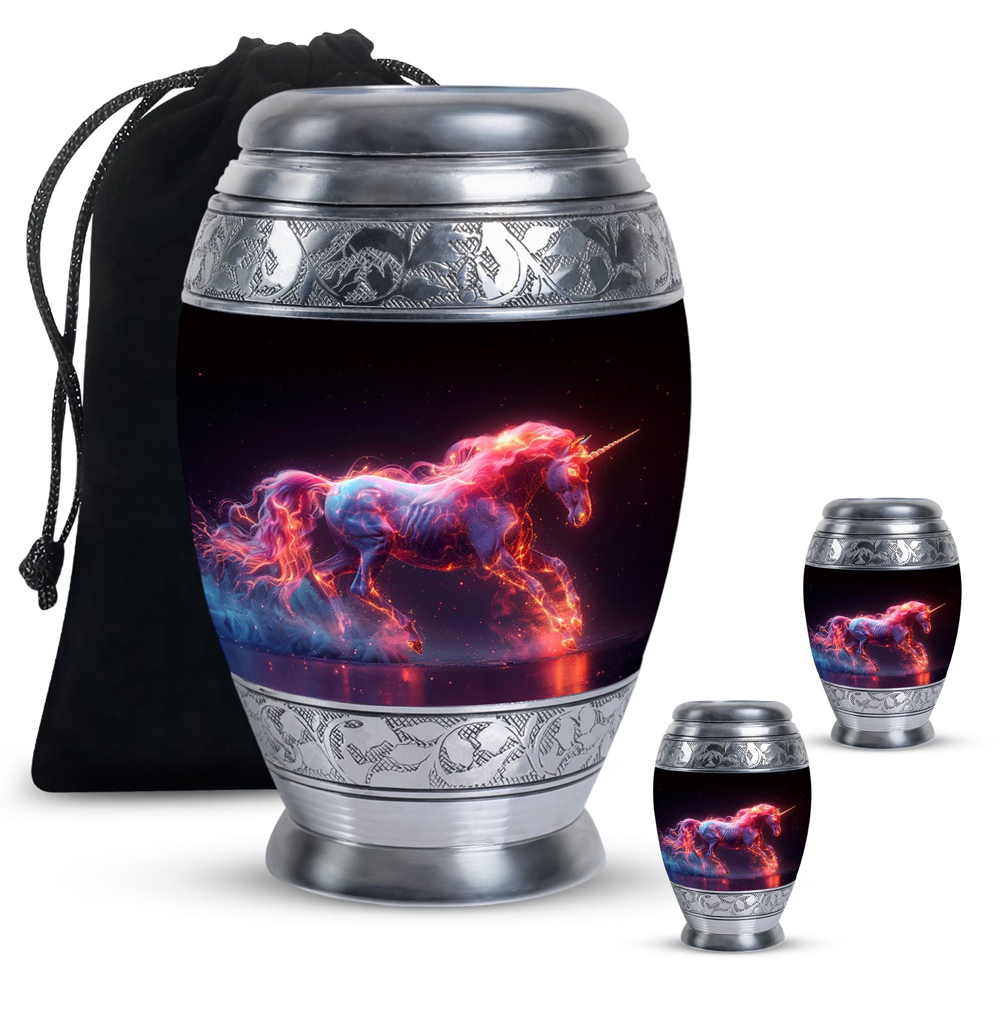 Crafted from durable aluminum, this urn combines strength with radiant artistry. Its cosmic unicorn design reflects hope, purity, and eternal light. With a secure screw-top lid, it keeps ashes safe while standing as a symbol of love. Perfect as adult funeral urns for men or women, it also serves as one of our unique urns for ashes, treasured for its rare design and meaningful symbolism.