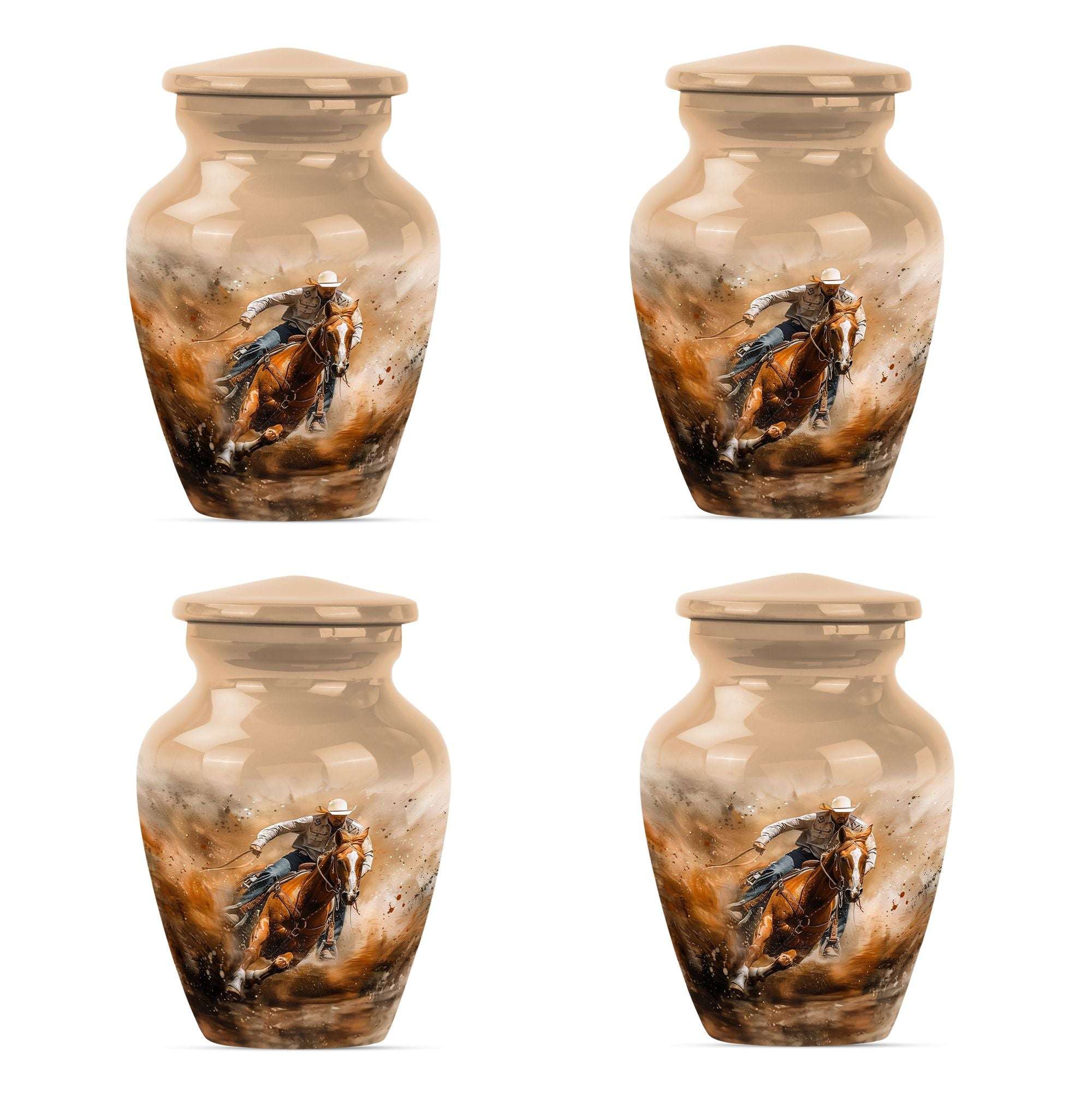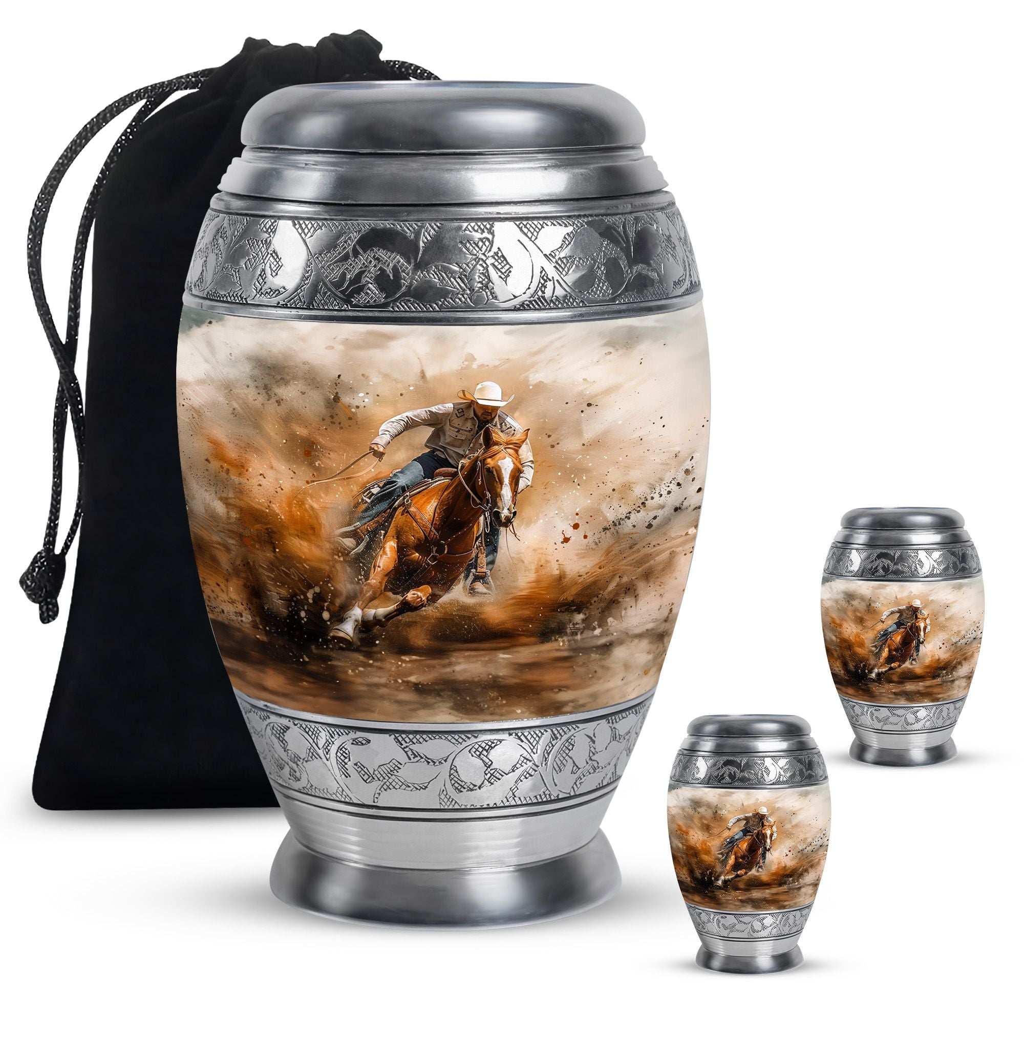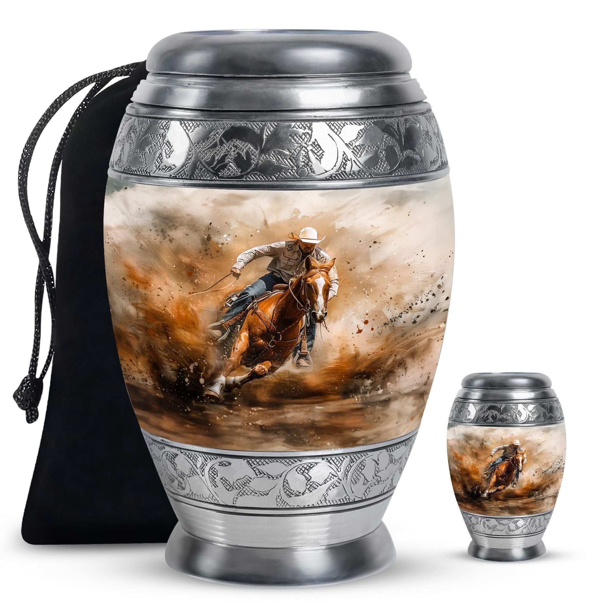 Crafted from durable aluminum, this keepsake urn features a rustic cowboy theme, symbolizing independence, resilience, and timeless spirit. With a secure screw-top lid, it ensures ashes are safely contained. Its compact size makes it ideal as cremation urns small, small urns for human ashes keepsake, or small keepsake urns for human ashes to share among family members. Families often select it alongside full-size cremation urns adults to create a complete memorial set.