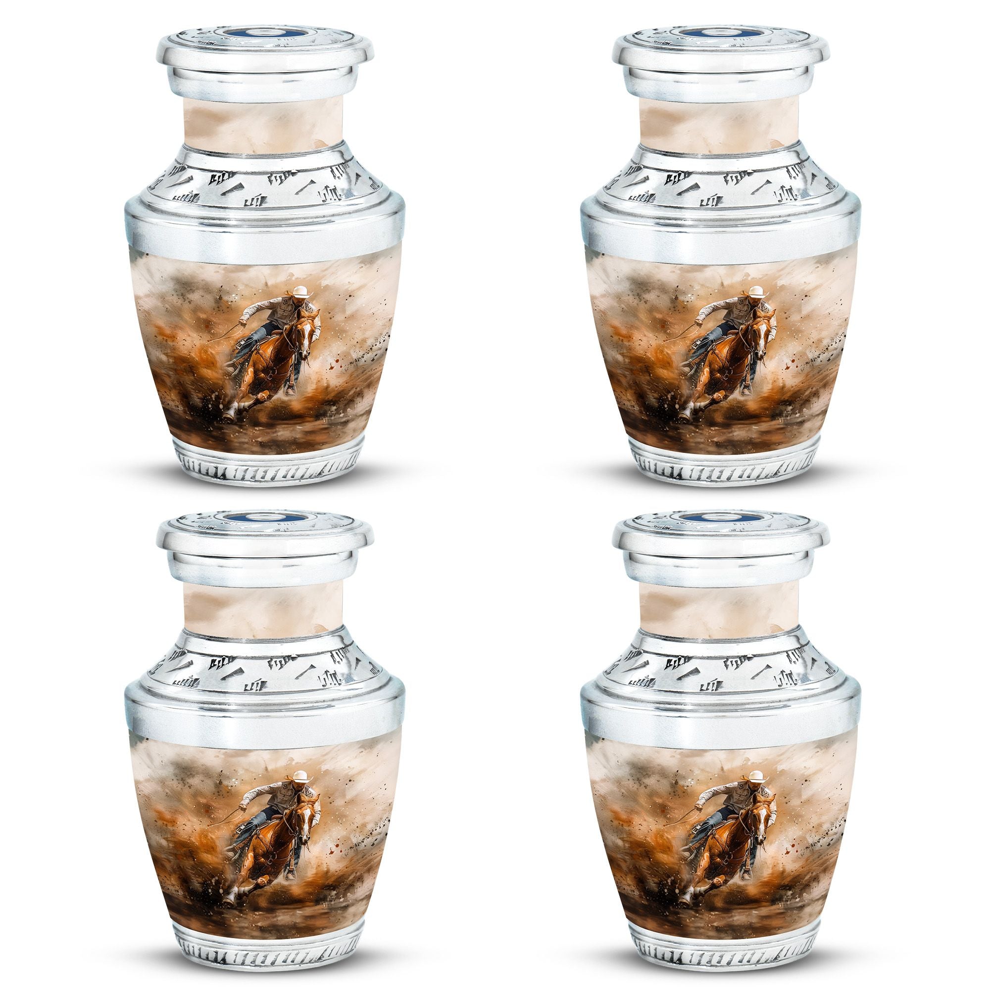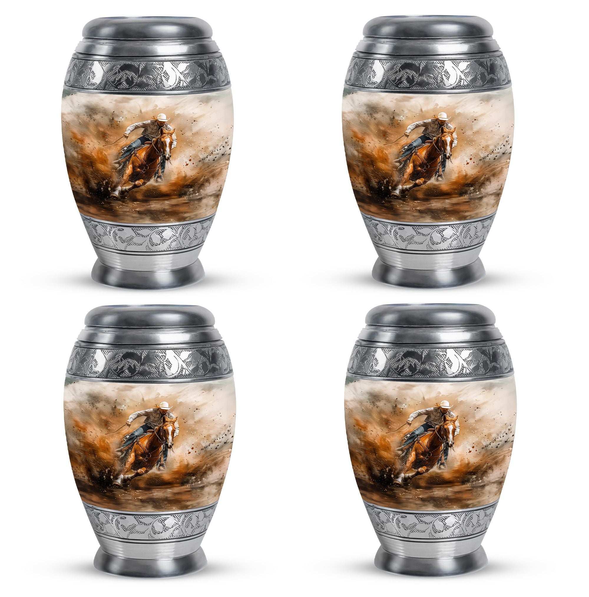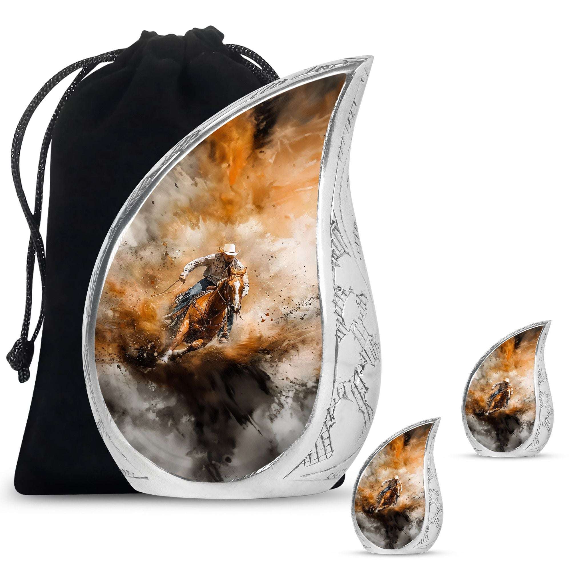 Crafted from durable aluminum, this keepsake urn features a rustic cowboy theme, symbolizing independence, resilience, and timeless spirit. With a secure screw-top lid, it ensures ashes are safely contained. Its compact size makes it ideal as cremation urns small, small urns for human ashes keepsake, or small keepsake urns for human ashes to share among family members. Families often select it alongside full-size cremation urns adults to create a complete memorial set.