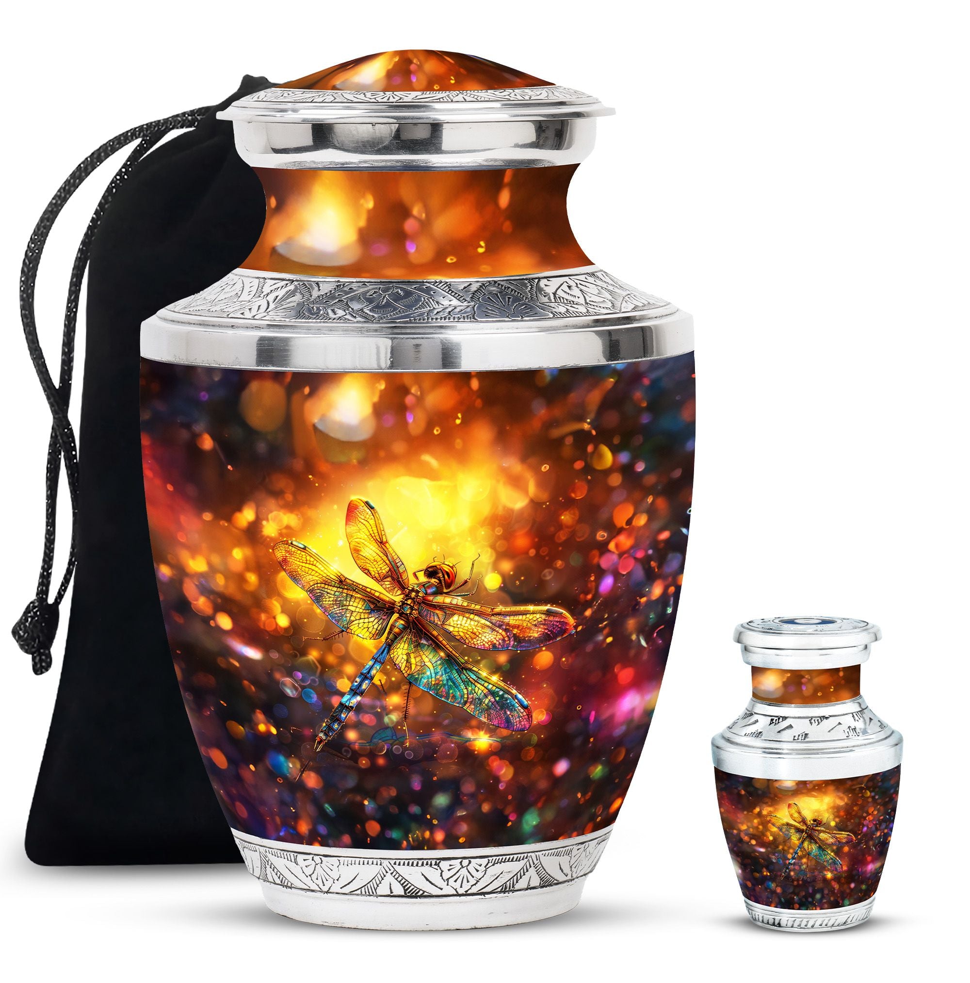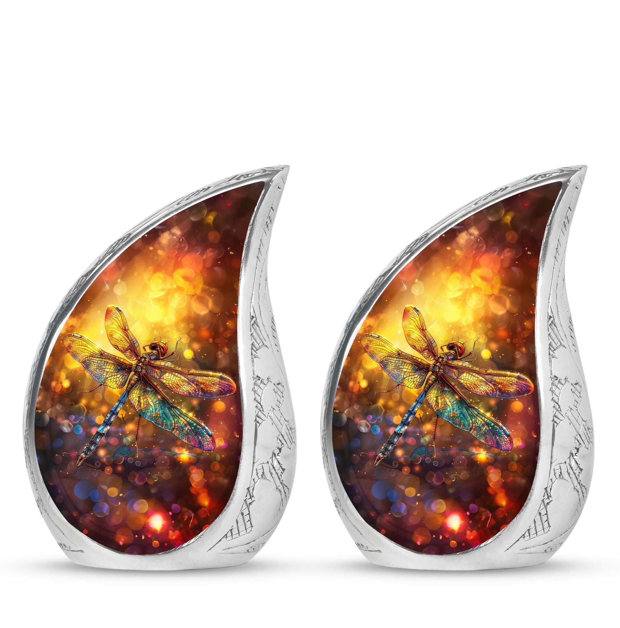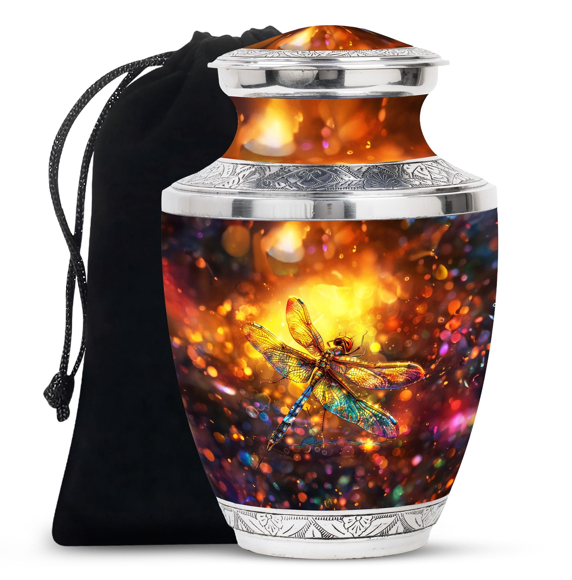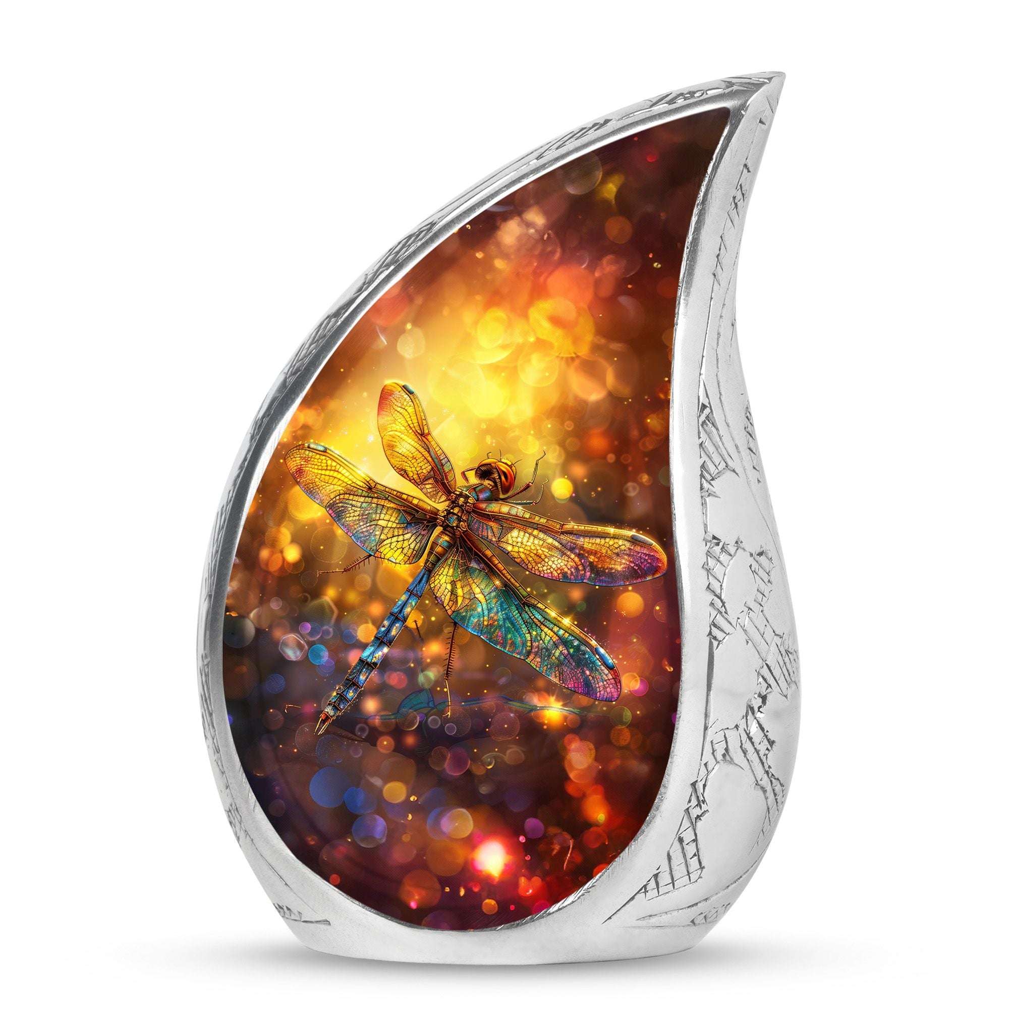 Crafted with premium detail, this cremation urn for adults features a graceful dragonfly design symbolizing transformation and eternal connection. Made from durable aluminum, it ensures lasting quality while its smooth finish enhances the beauty of your memorial display. Designed as one of our adult size cremation urns, it offers ample capacity while remaining timeless and elegant.