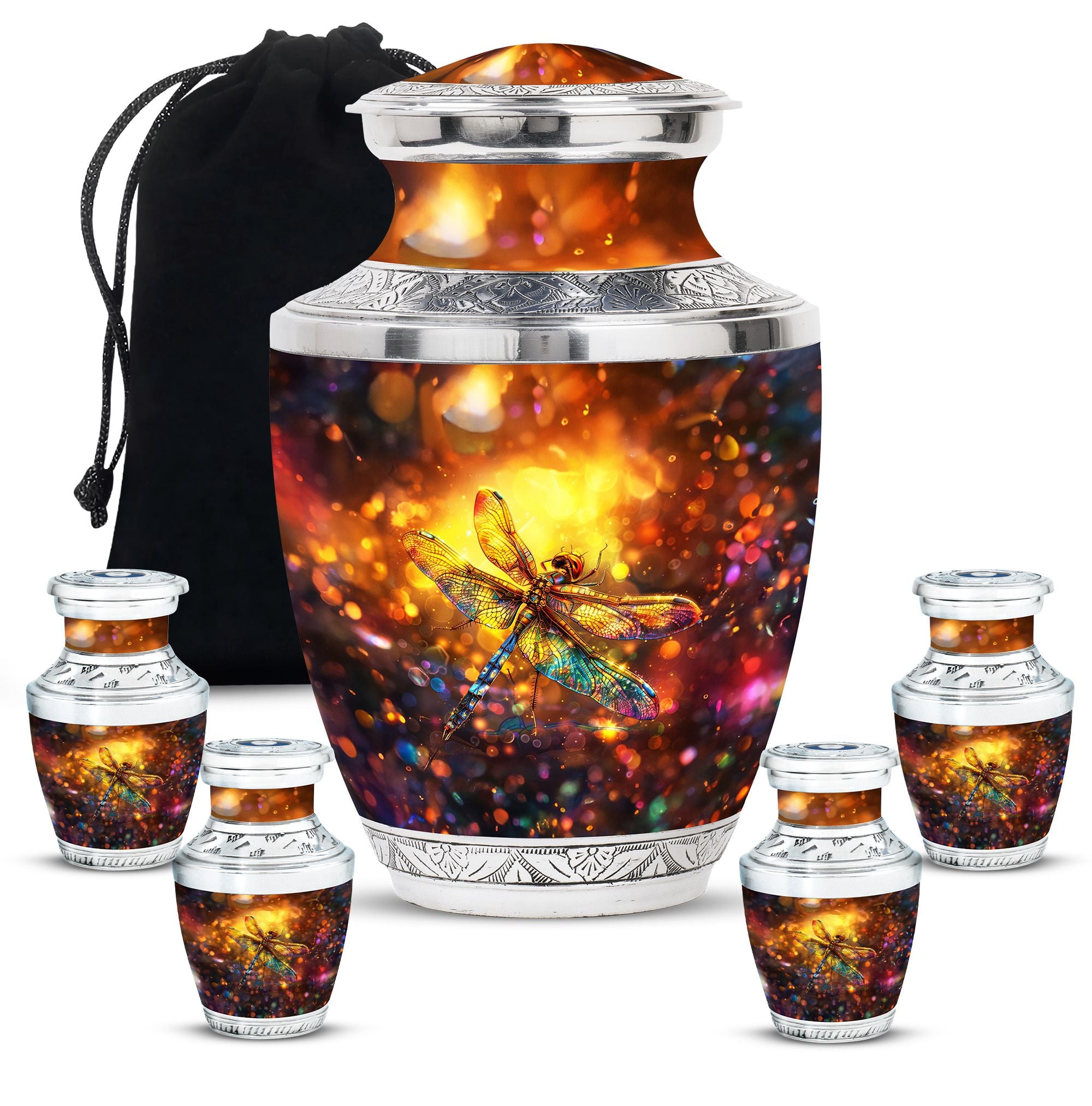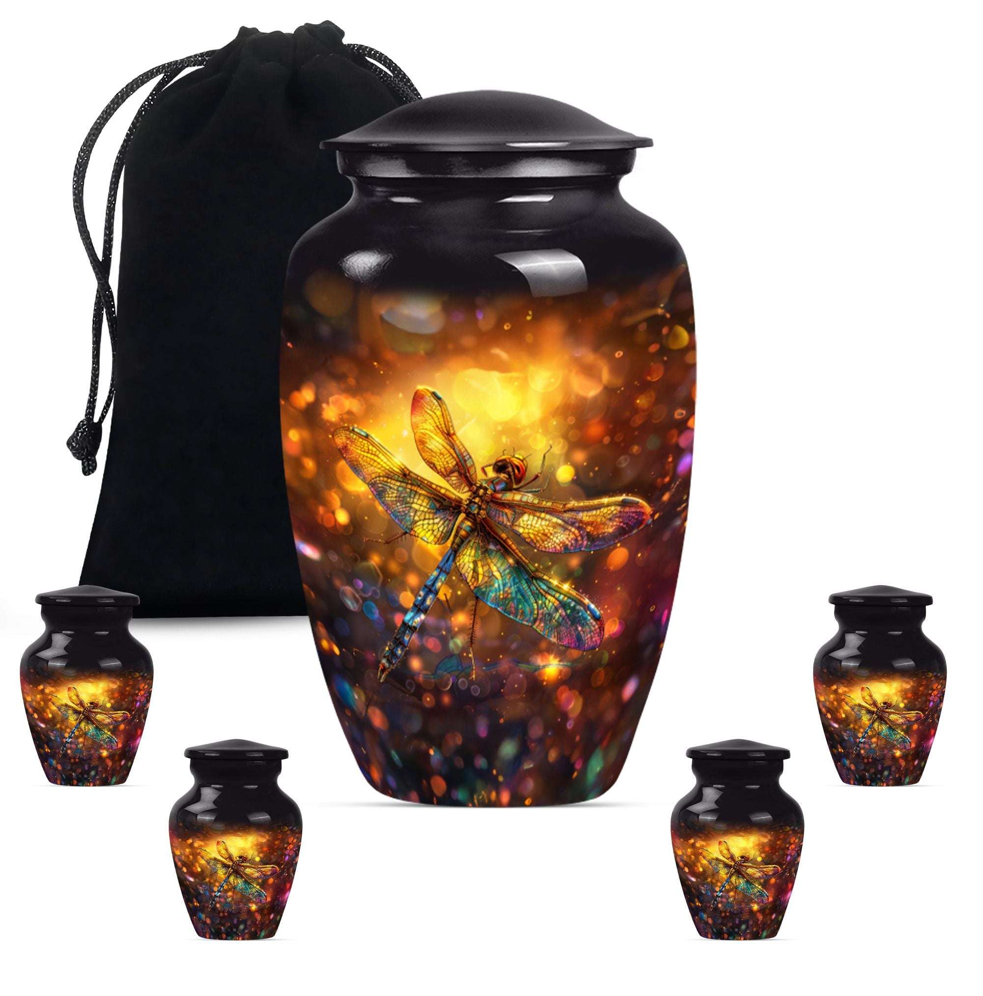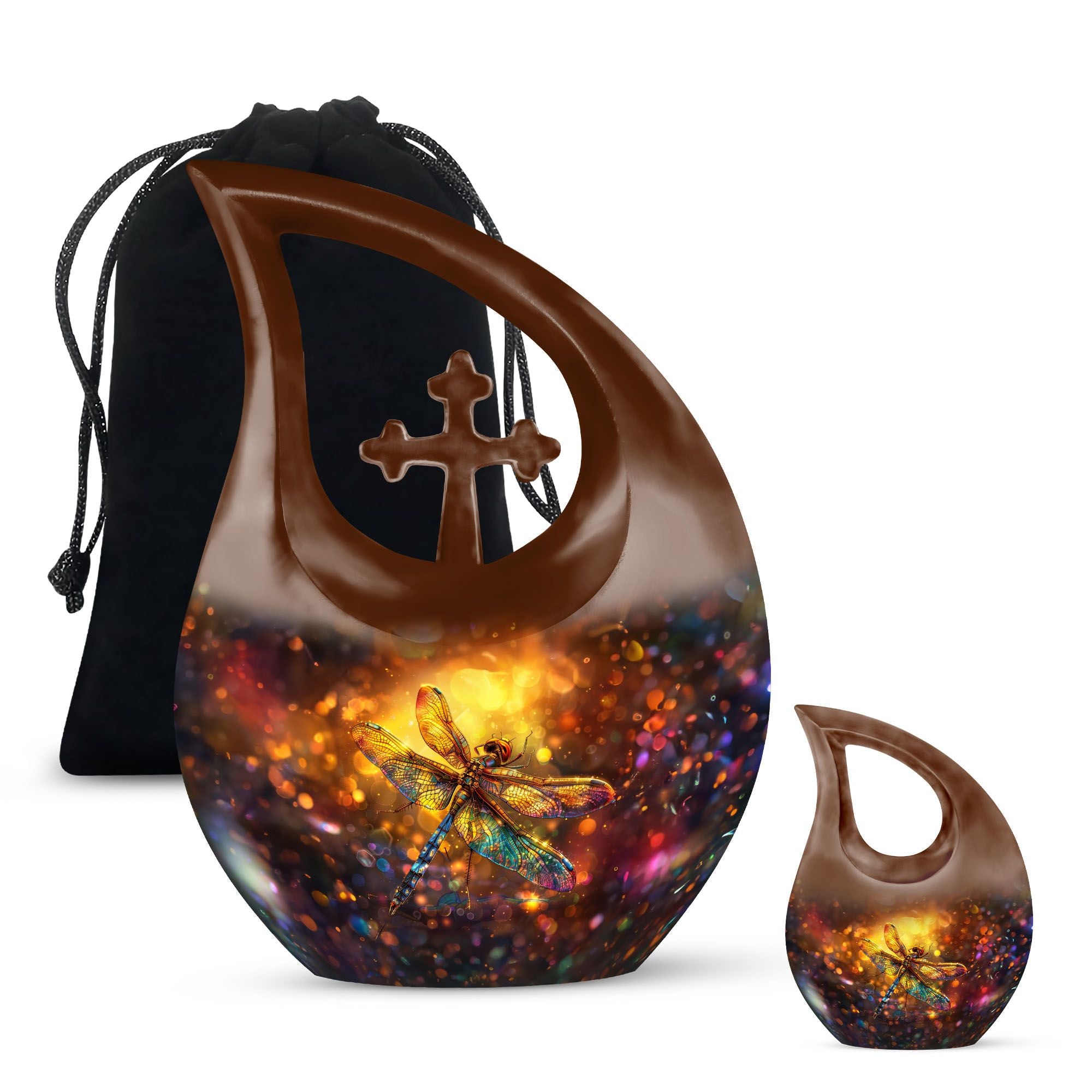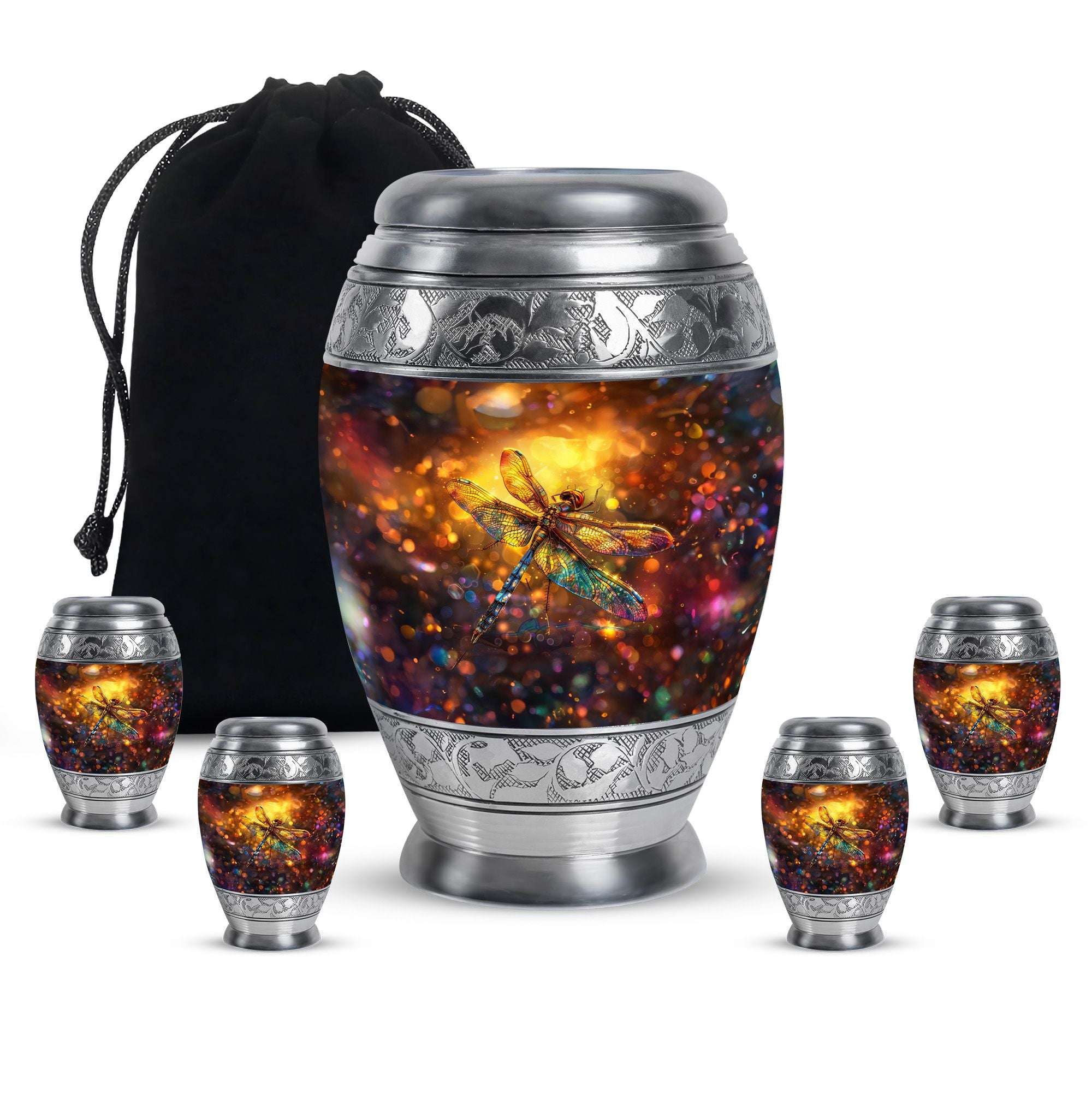 Crafted with premium detail, this cremation urn for adults features a graceful dragonfly design symbolizing transformation and eternal connection. Made from durable aluminum, it ensures lasting quality while its smooth finish enhances the beauty of your memorial display. Designed as one of our adult size cremation urns, it offers ample capacity while remaining timeless and elegant.
