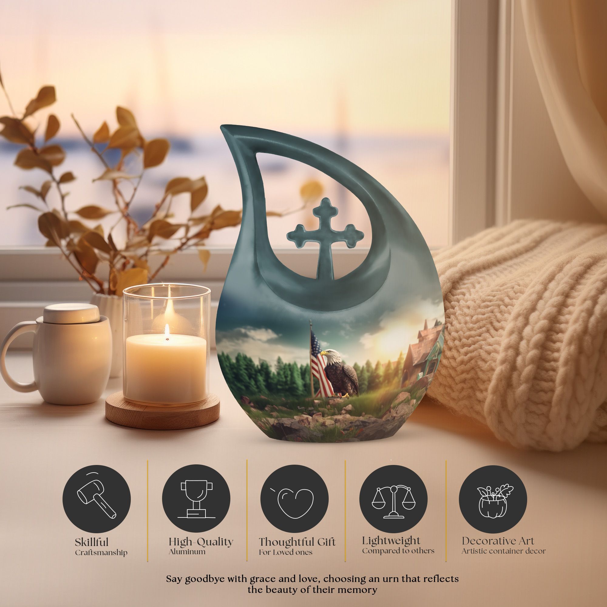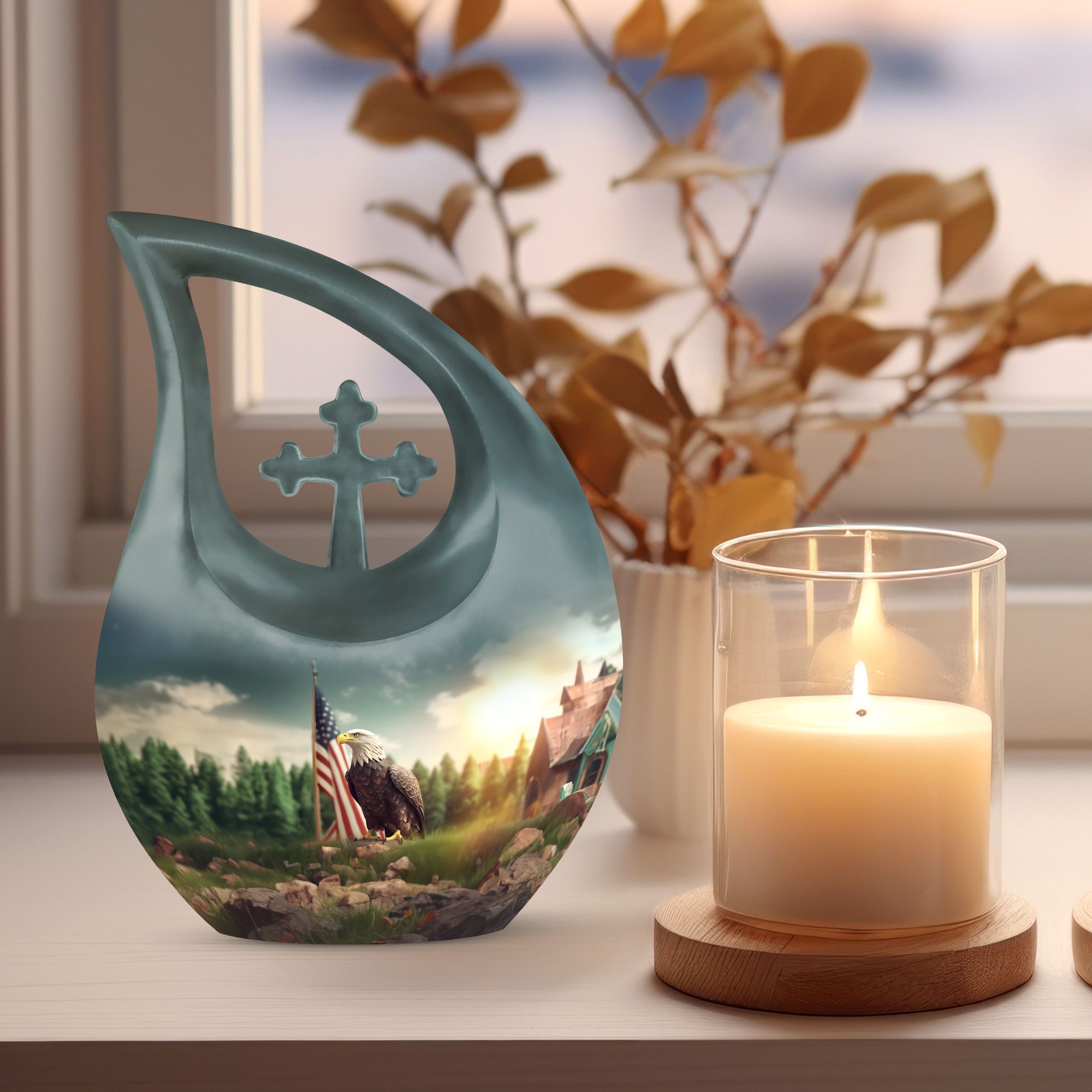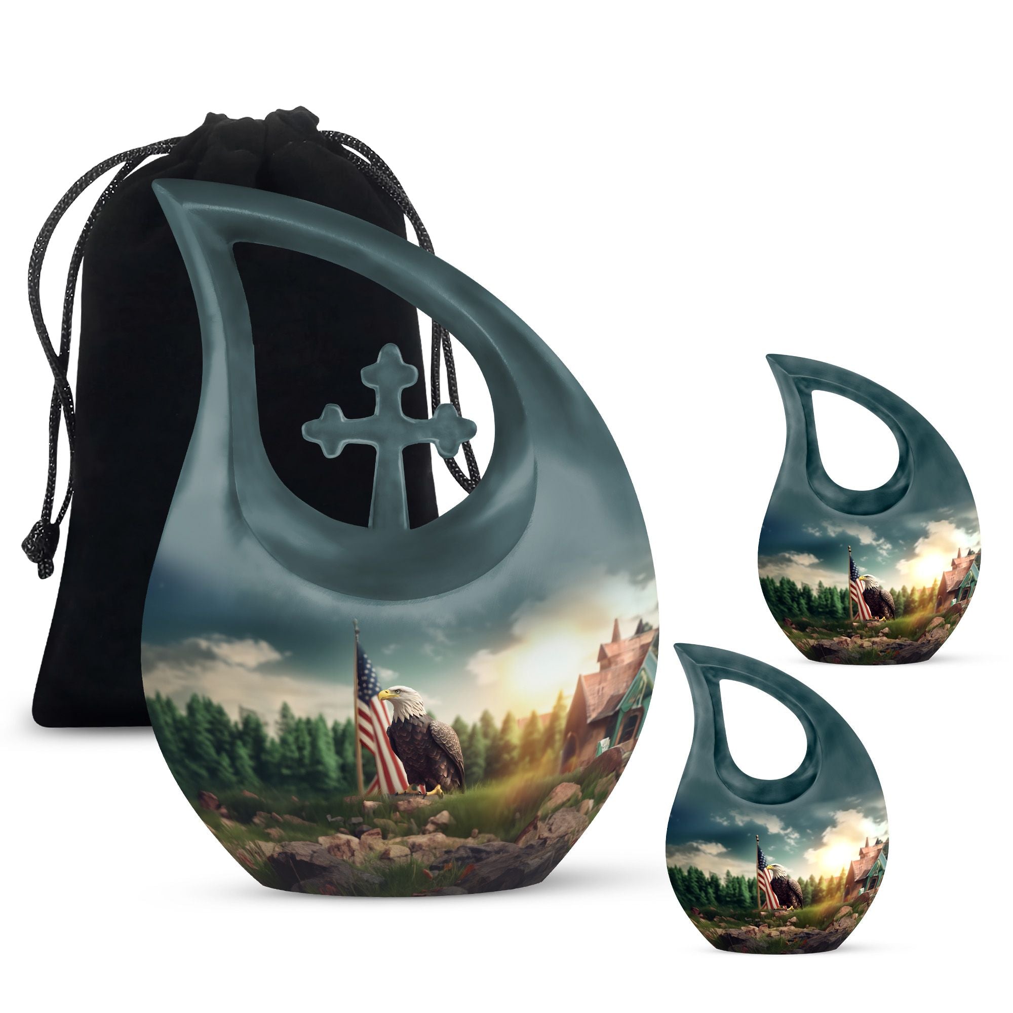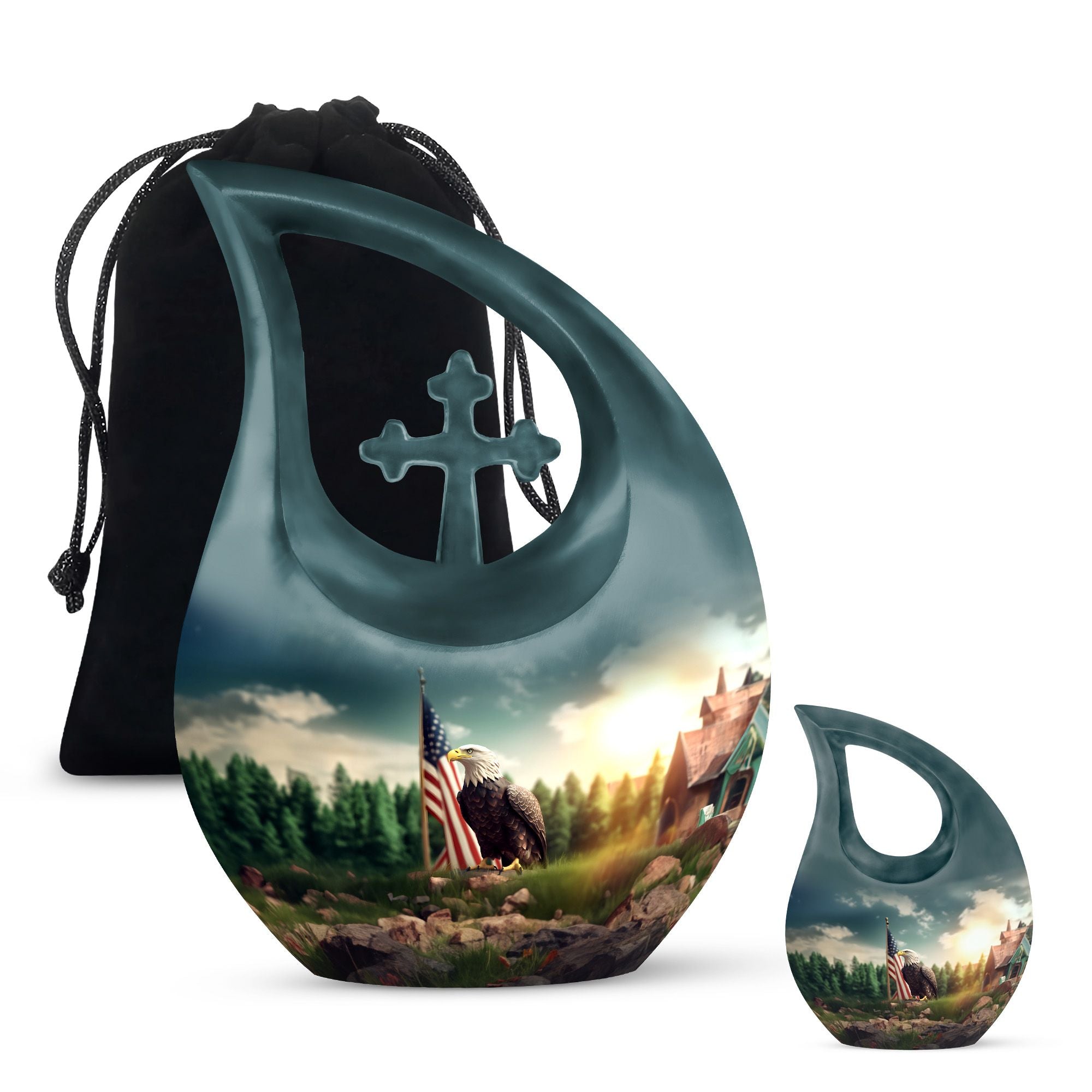 Expertly crafted from premium-grade aluminum, this American flag urn for ashes combines durability with intricate artistry. The polished surface and secure screw-top lid ensure safe and dignified preservation. Matching small keepsake urns for human ashes are available for families wishing to share ashes among loved ones, creating an enduring memorial collection.