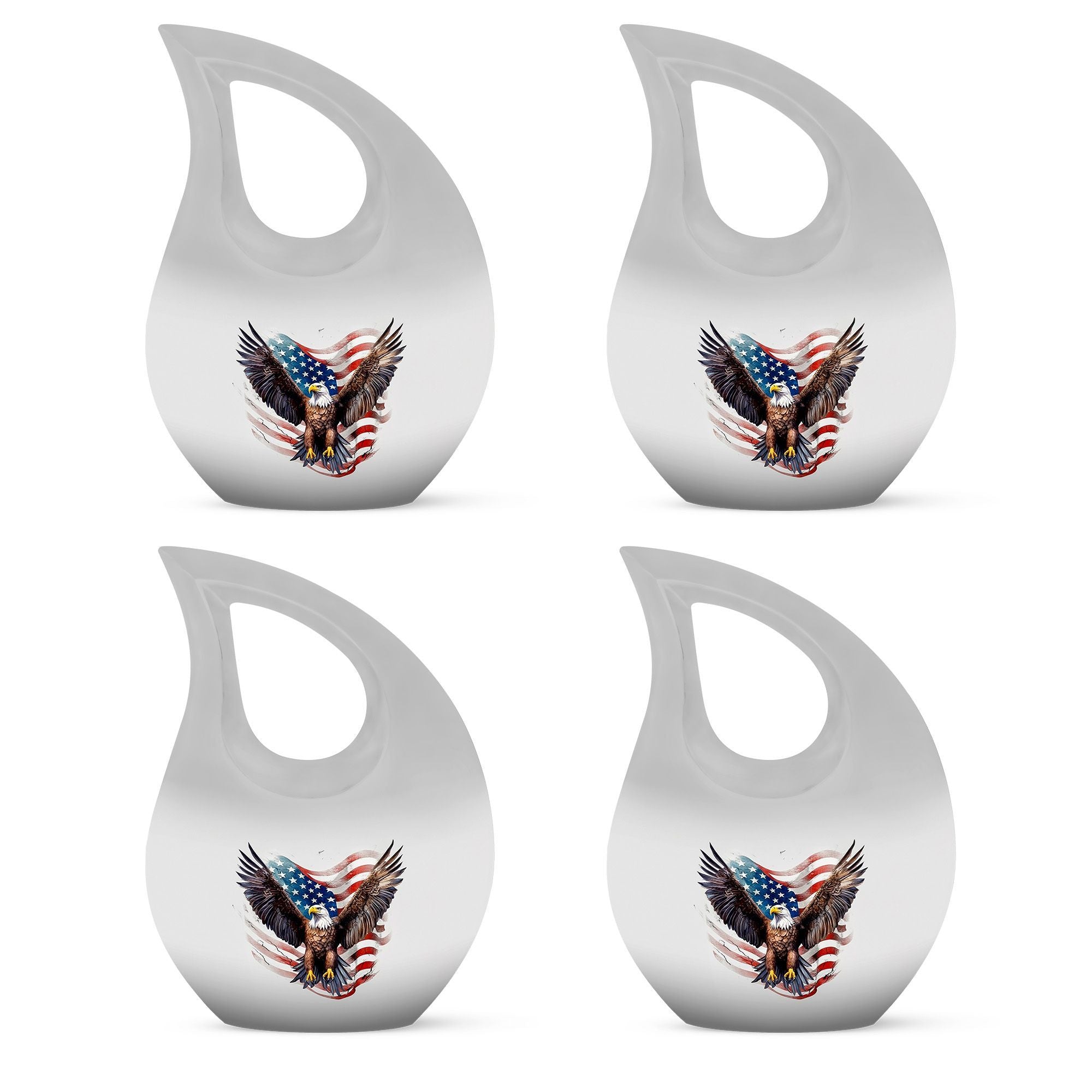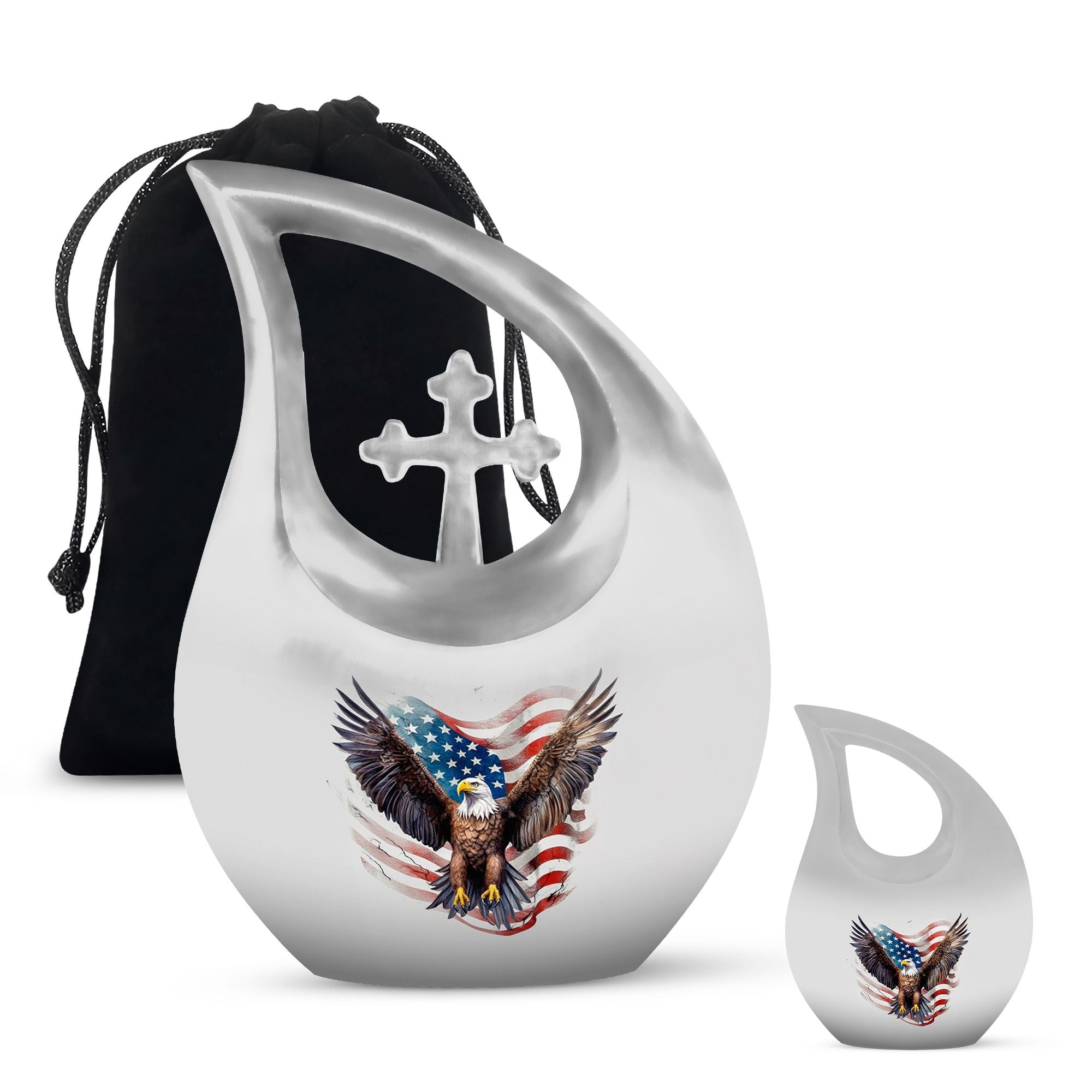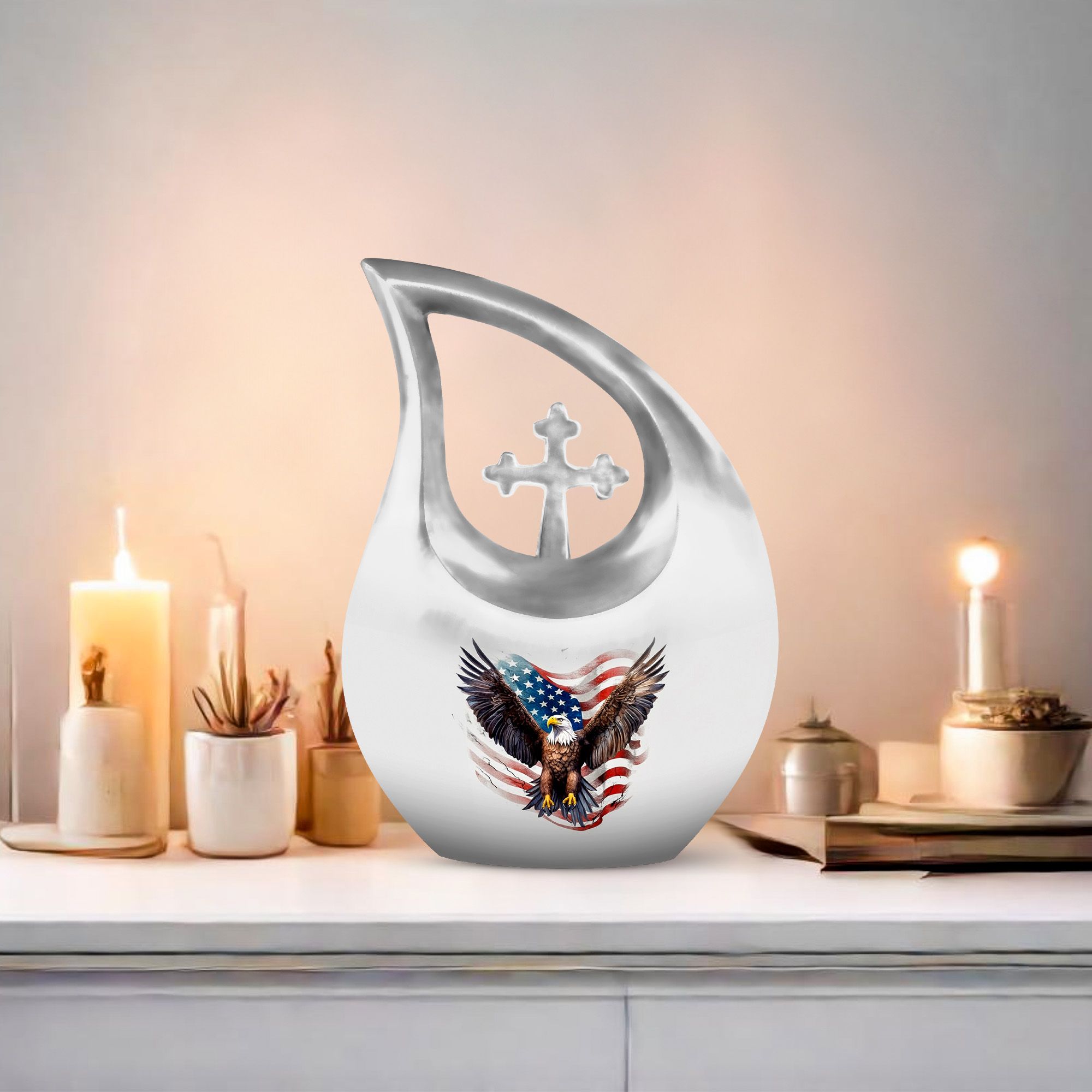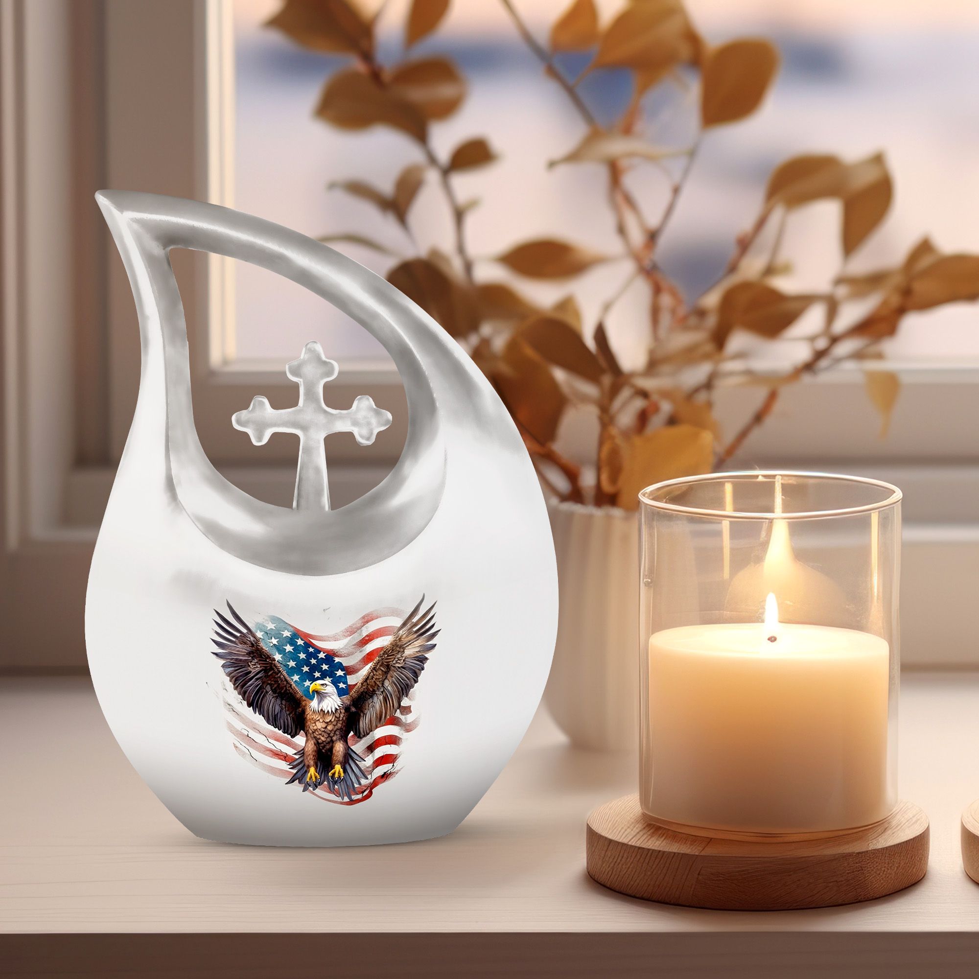 Expertly handcrafted from durable aluminum, this large decorative urn for human ashes features a pristine white finish that beautifully highlights the detailed American flag and eagle design. The secure screw-top lid ensures ashes are safely preserved, while the urn’s elegant shape makes it suitable for both home display and burial. Ideal for adult urns for human ashes men, this piece also brings grace to memorials for women, pairing harmoniously with urn for ashes for women or keepsake urns for women.