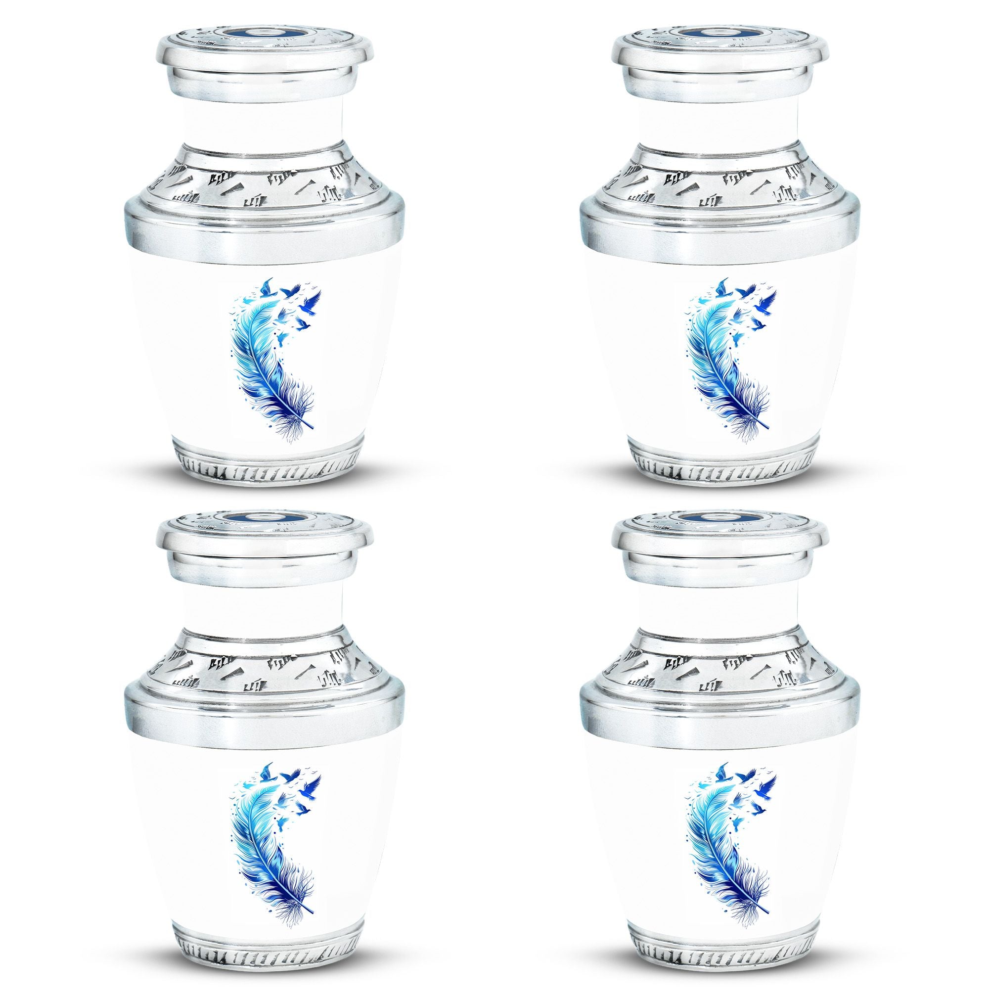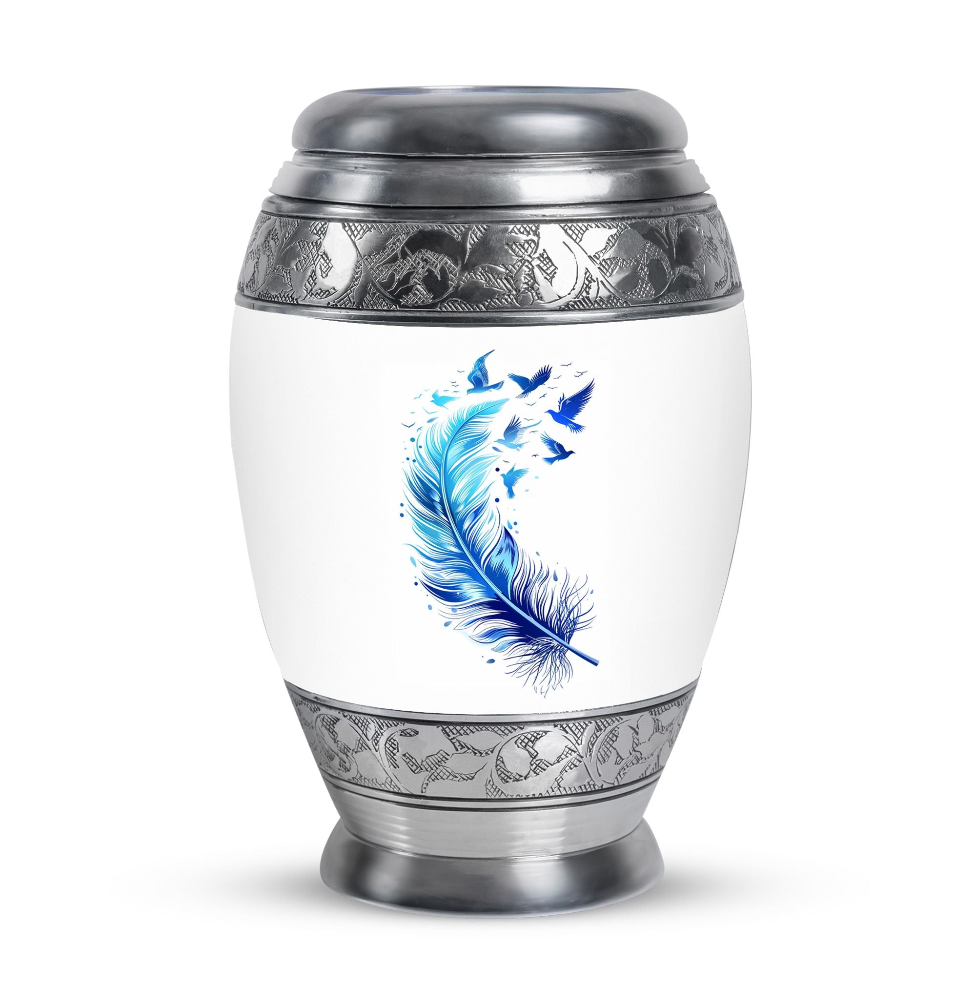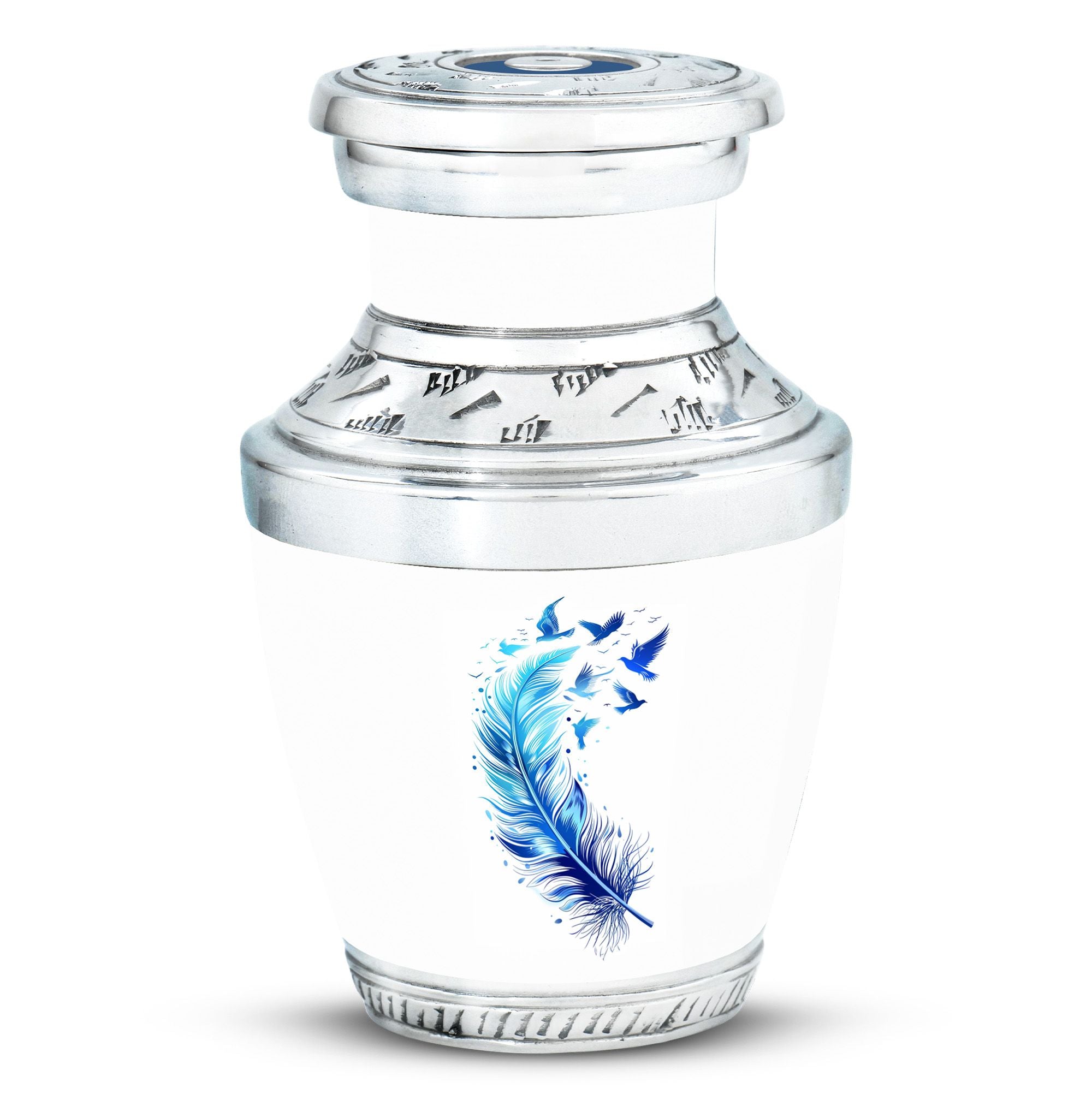 Crafted with precision and care, this keepsake urn features a serene blue feathered bird design symbolizing freedom and remembrance. Made from durable aluminium, it combines elegance and practicality. Its secure screw-top lid ensures safe storage, while its compact size makes it perfect for mini urns for sharing ashes, mini urns for decor, or memorial keepsakes for ashes.