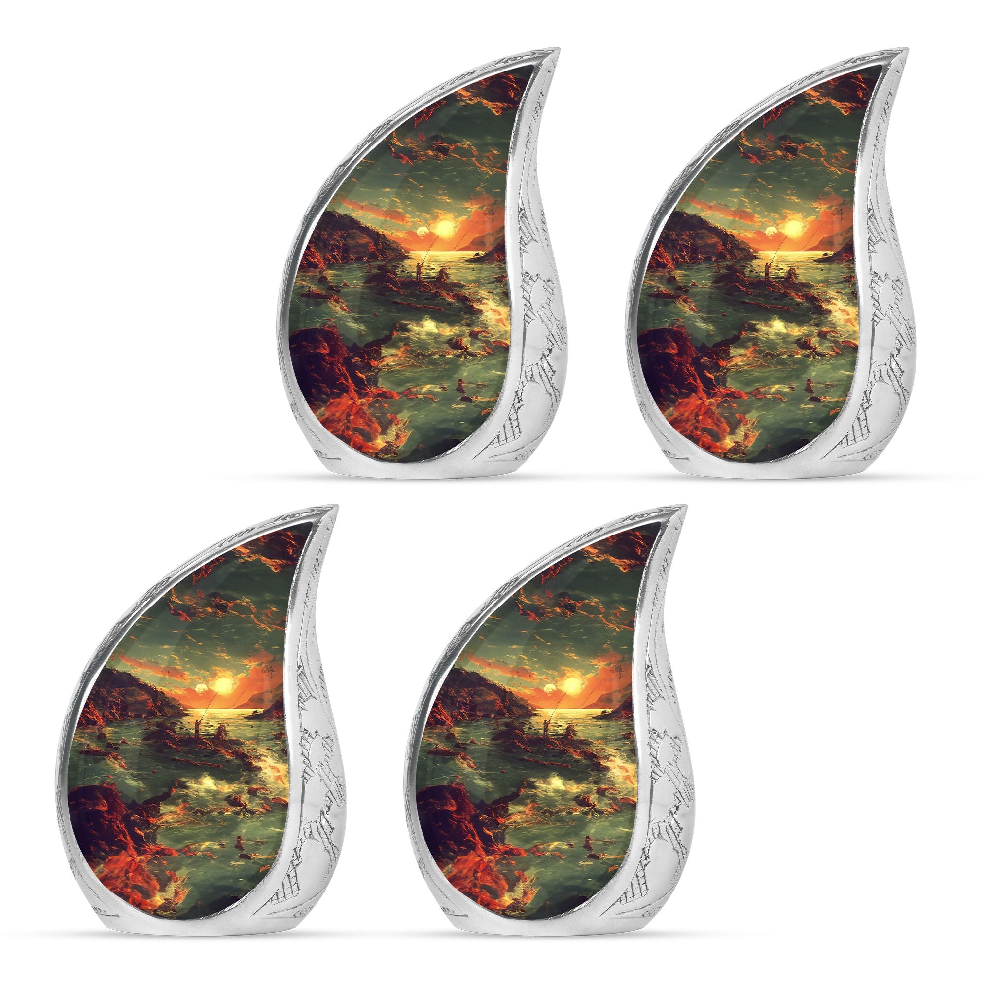 Expertly crafted from durable aluminium, the Coastal Sunset Urn combines timeless design with practical use. Its soothing coastal imagery and warm sunset tones make it a visually striking urn keepsake combo set. Compact yet substantial, this keepsake urn set accommodates adult human ashes while maintaining a dignified presence. Whether displayed at home or at a memorial service, it offers a harmonious blend of beauty and remembrance.