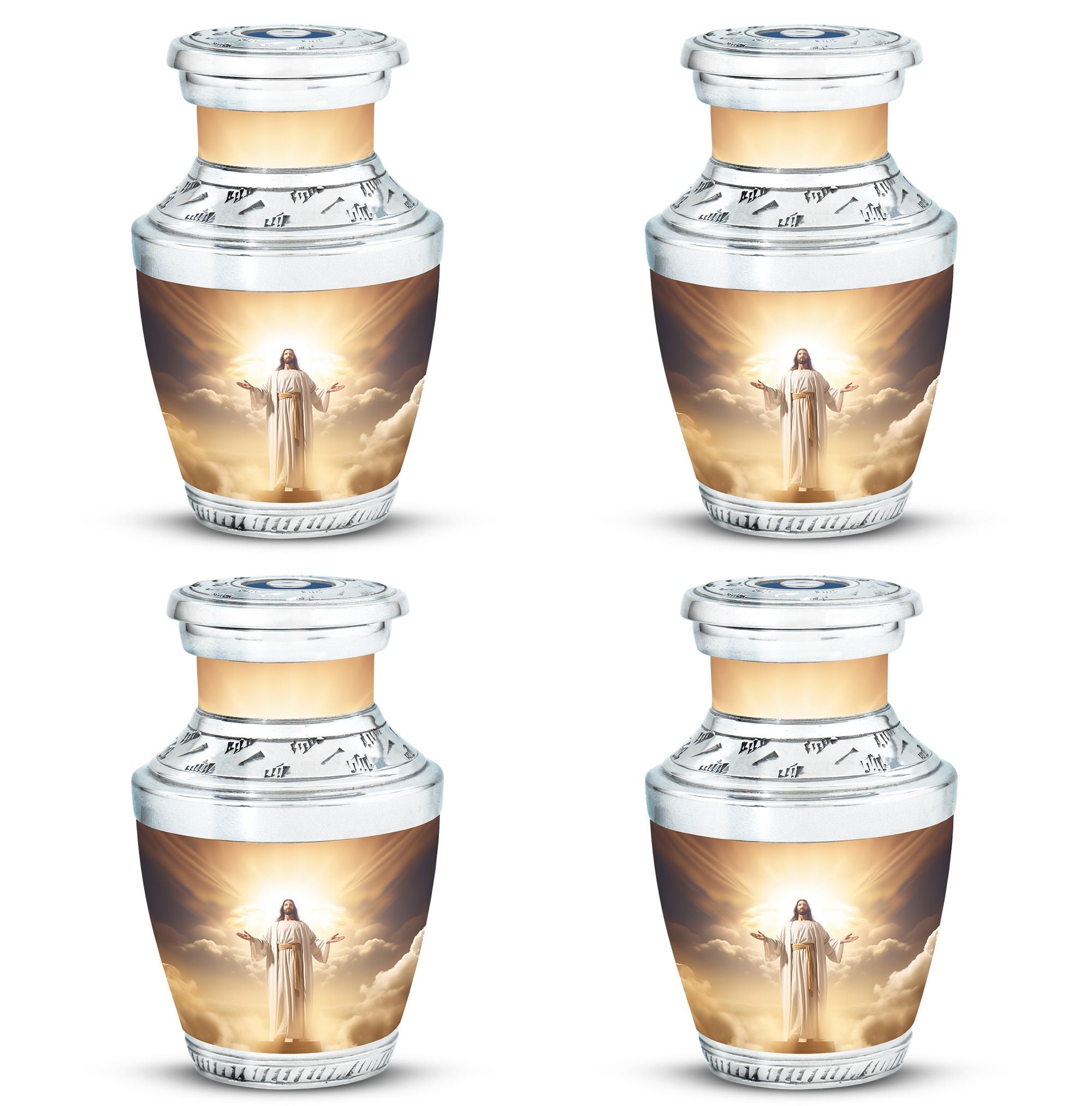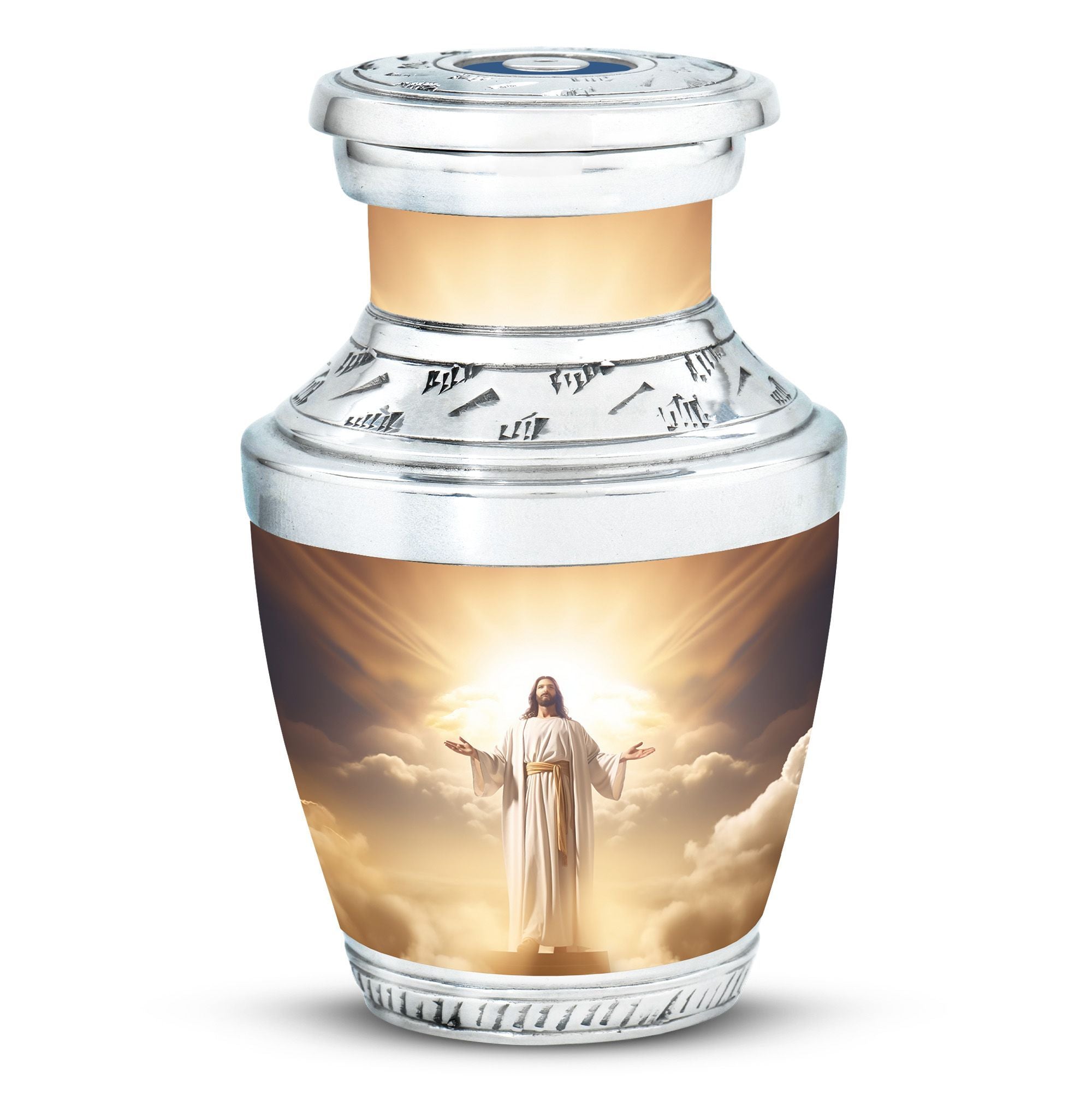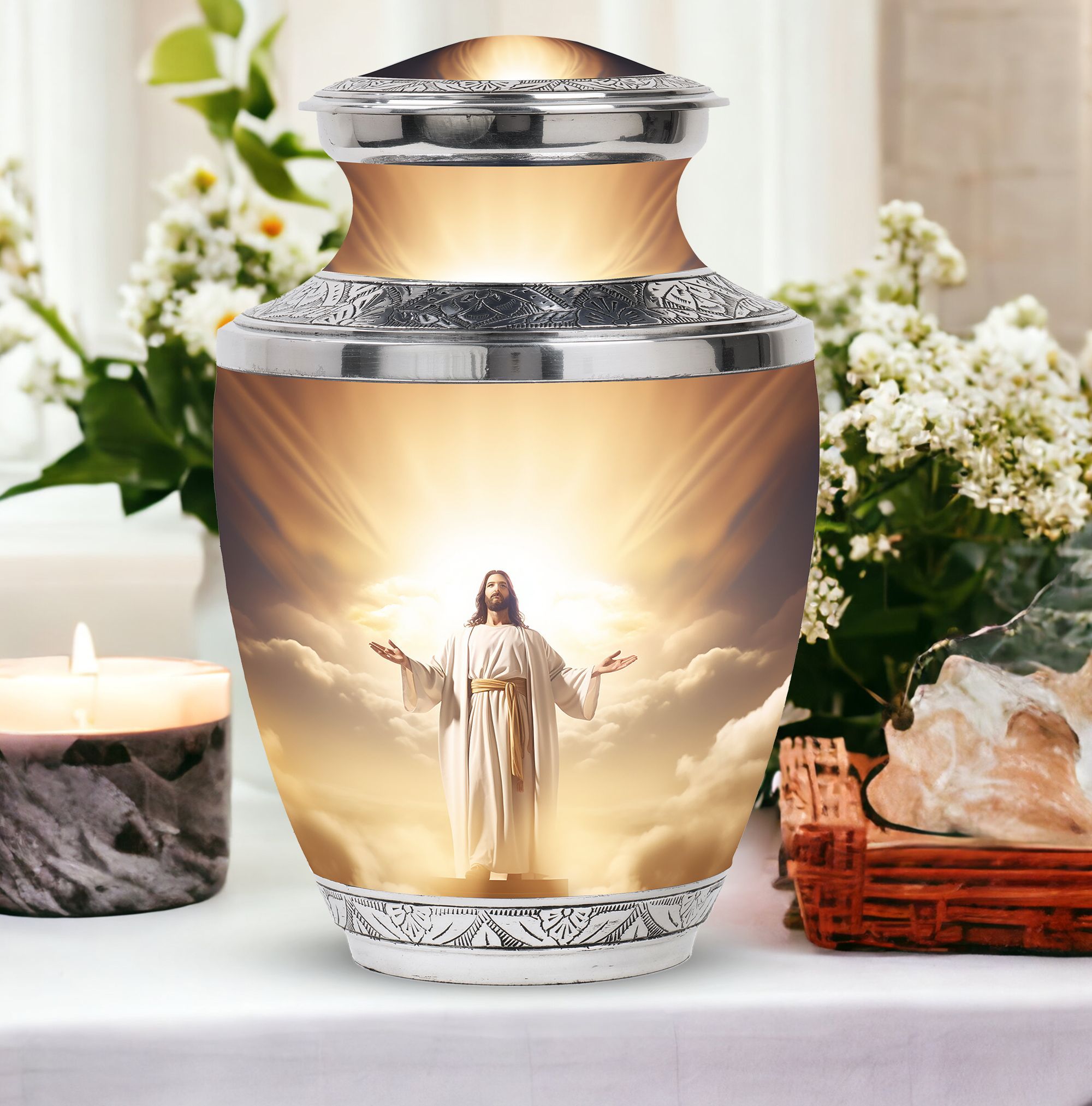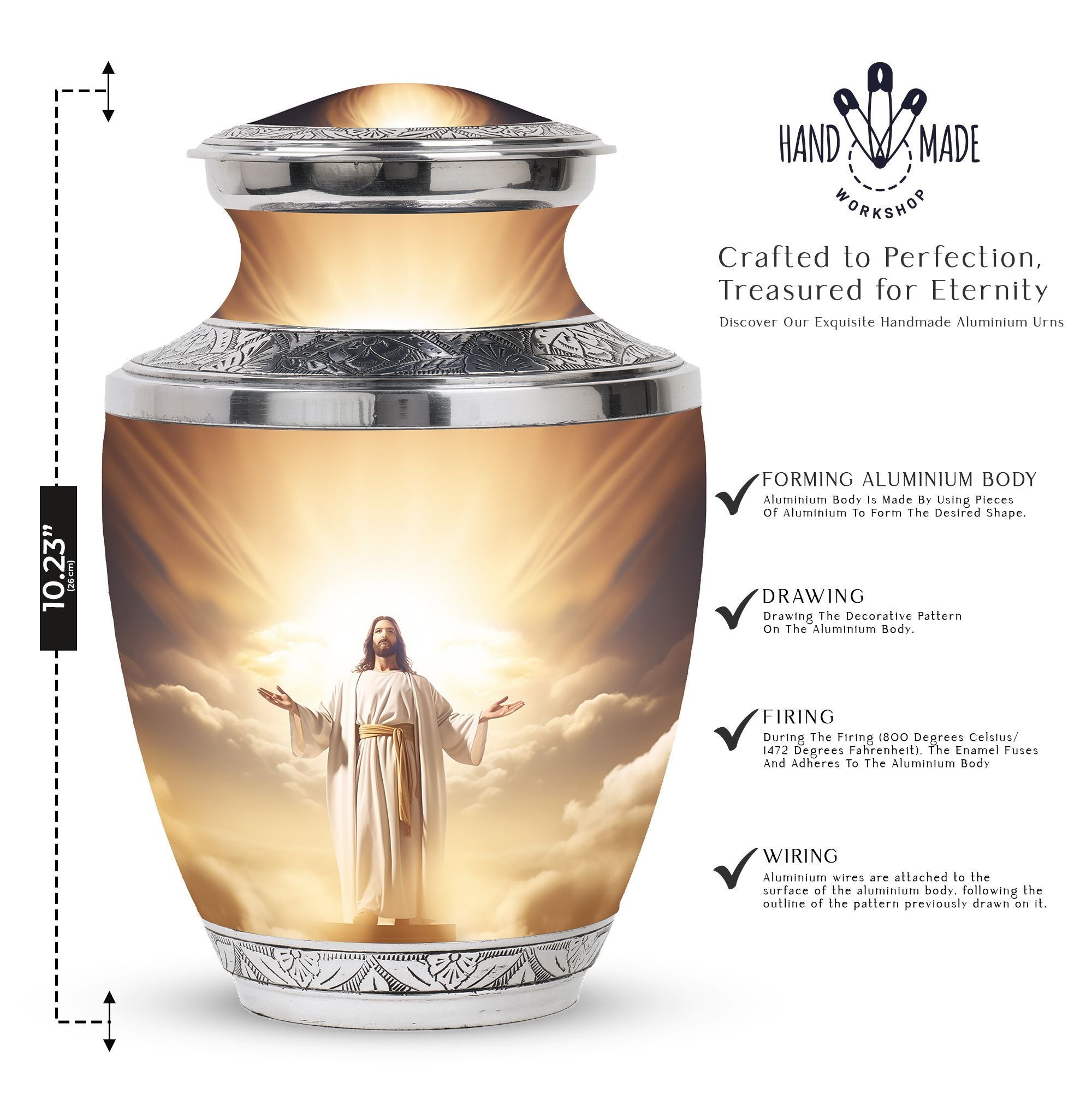 Cherish the memory of your loved ones with this exceptional Jesus Christ Cross Urn, a perfect emblem of faith and love. Expertly tailored to serve as a worthy resting place for human cremation ashes, this 3-inch classic urn exudes an air of refined religious piety. Meticulously crafted from robust aluminium, the urn holds a sizable volume of 200 cubic inches, making it one of the large urns in the market. Its precise dimensions stand at 10 inches in height, and it weighs a sturdy 3.3 pounds. This urn also presents an opportunity to add a personal touch to the memorial of your loved one. Make it even more special by personalizing it with engraved names. Coating the urn is a sumptuous velvet pouch, intended to lovingly contain the ashes. Truly an epitome of modern urns for ashes, this unique religious item seamlessly combines functionality with personal sentiment. Cherish those dear to you with this piece that’s more than just a metal urn for ashes - it’s a heartfelt symbol of everlasting memory.