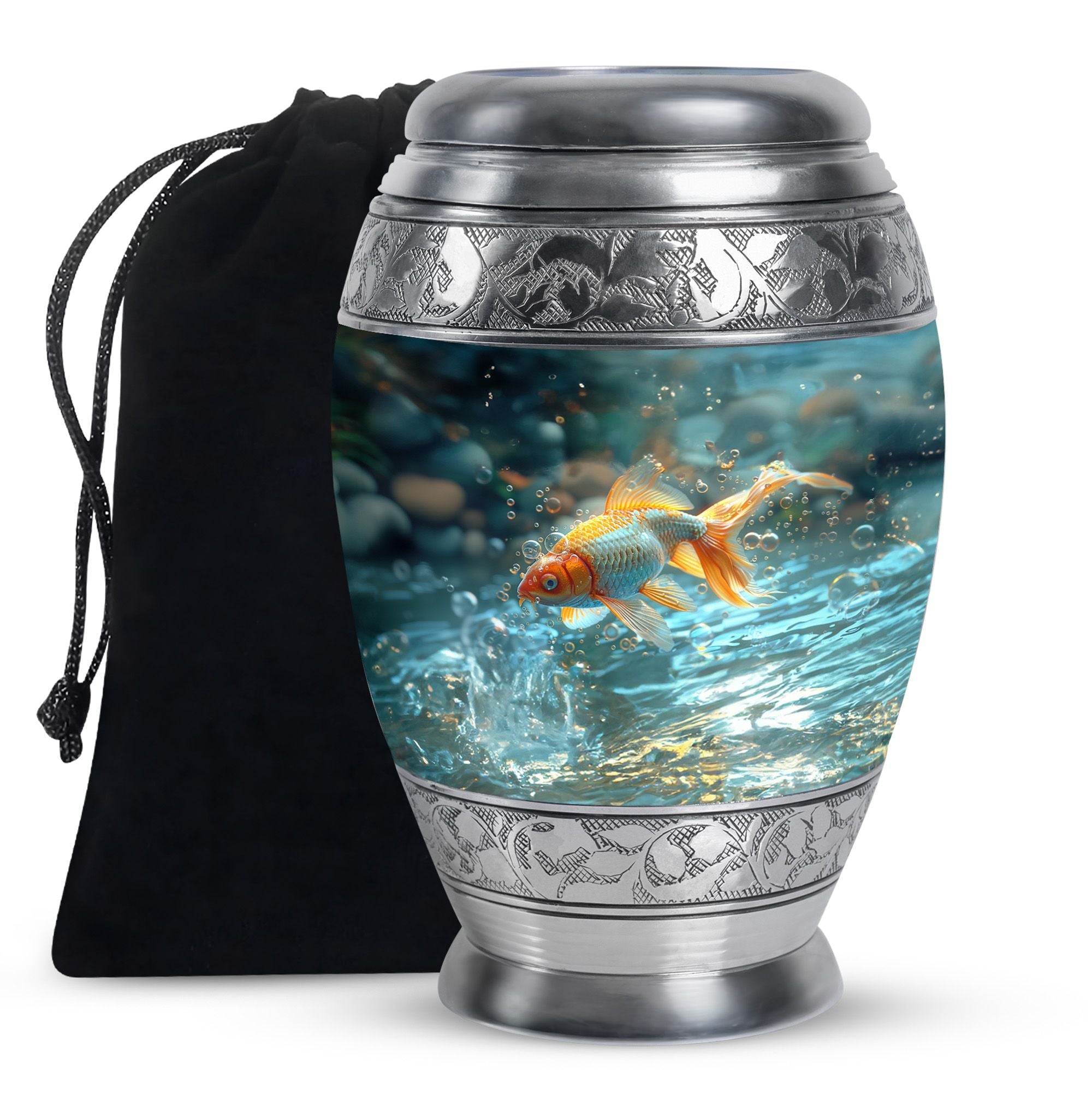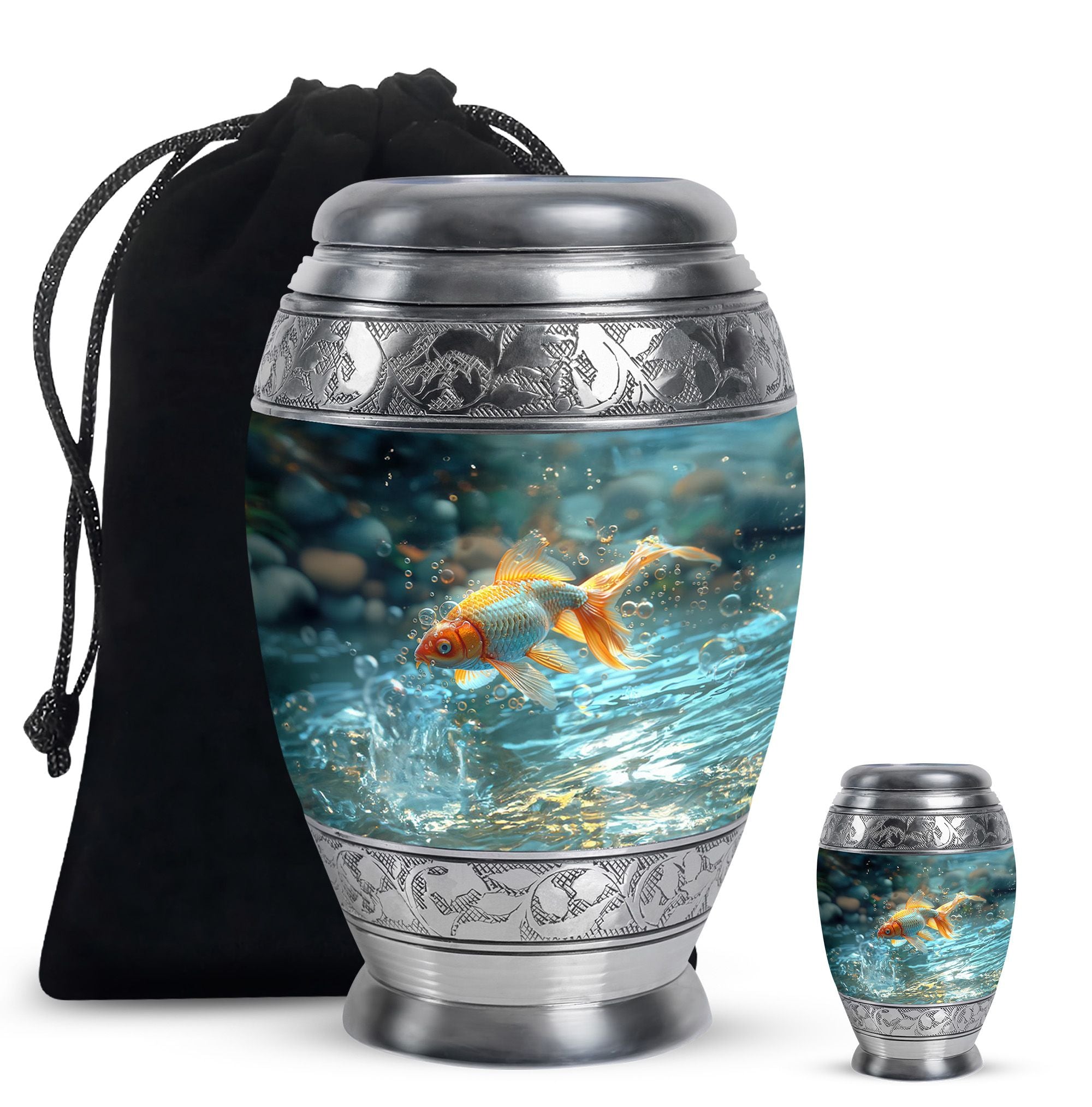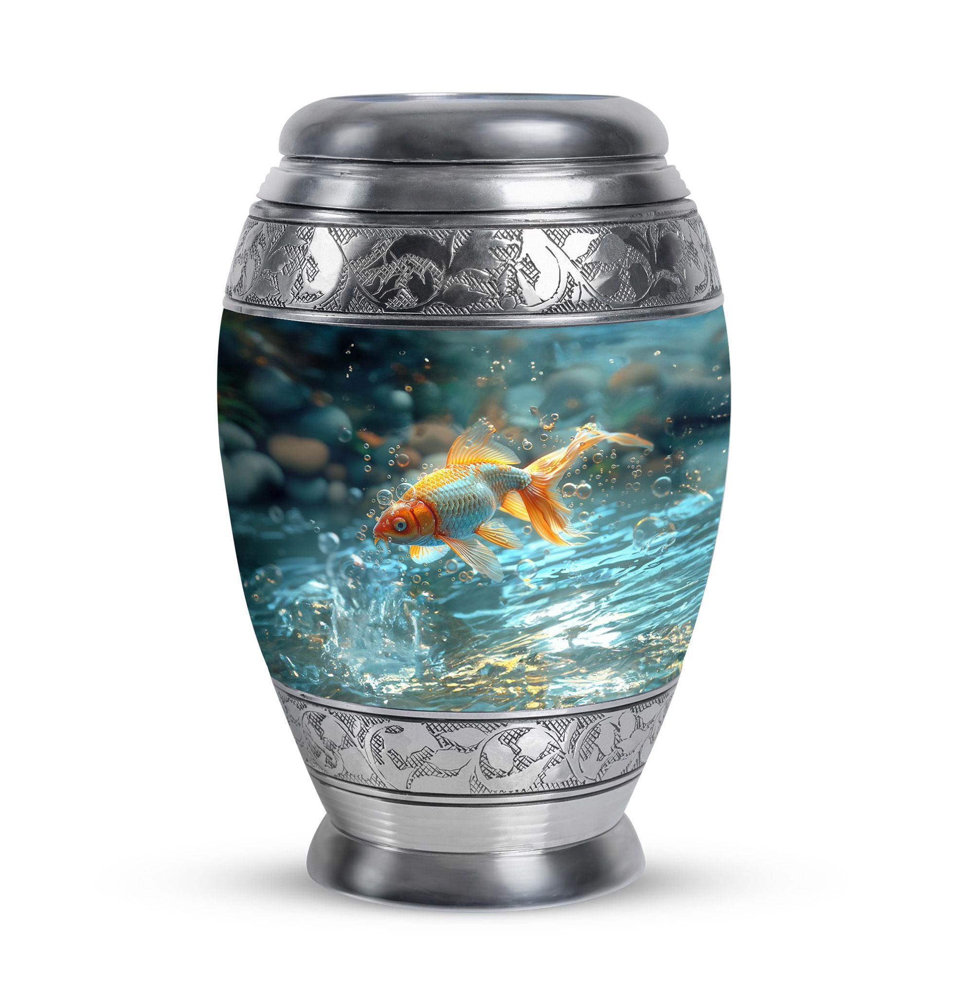 The Gold Fish Cremation Urn Adult Memorial is a graceful aquatic-inspired urn, symbolizing peace, harmony, and the eternal flow of life. With its elegant design, it provides families with comfort in remembrance, making it a meaningful choice for beautiful urns women, adult urns women, or urns women human ashes.
