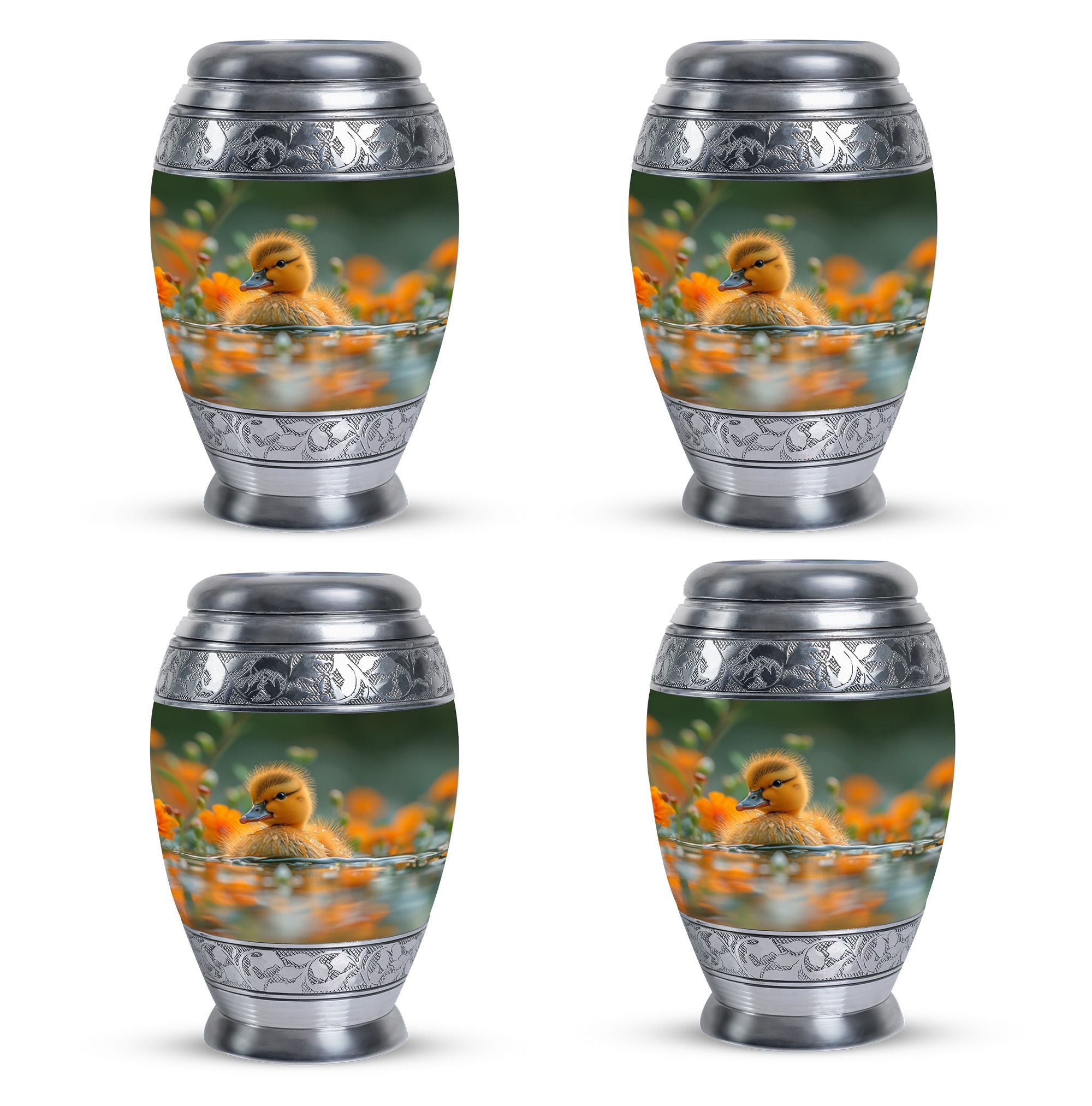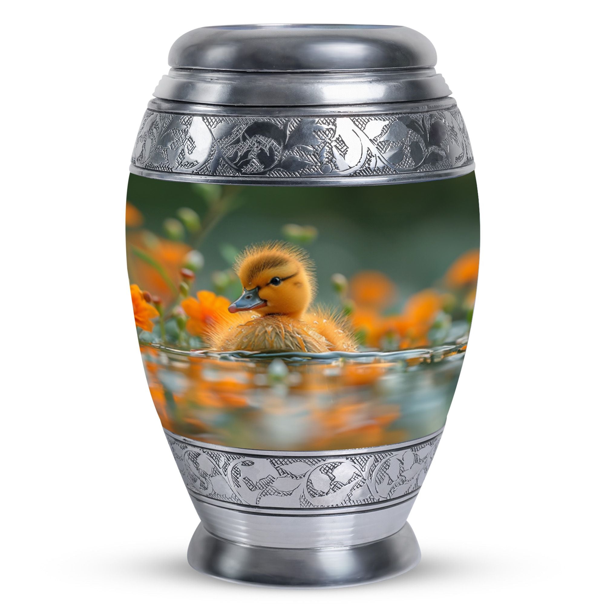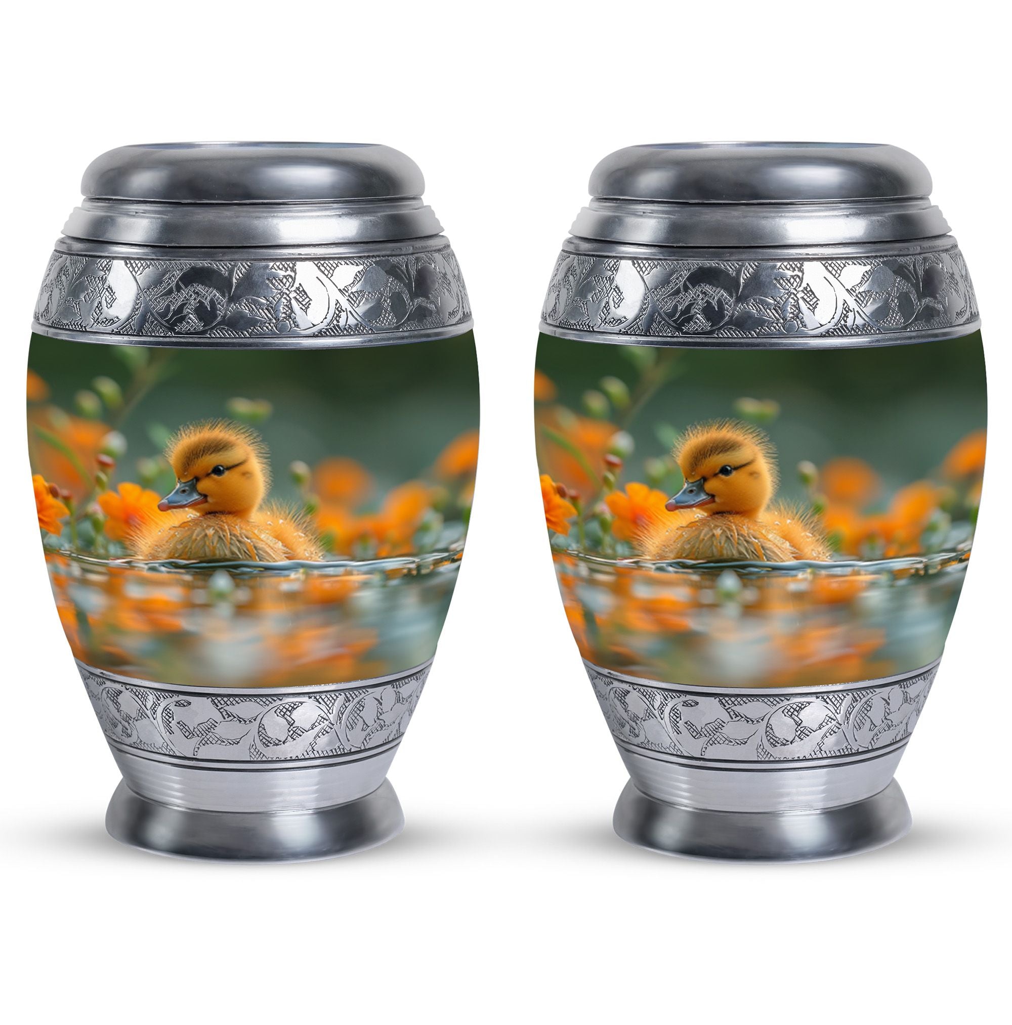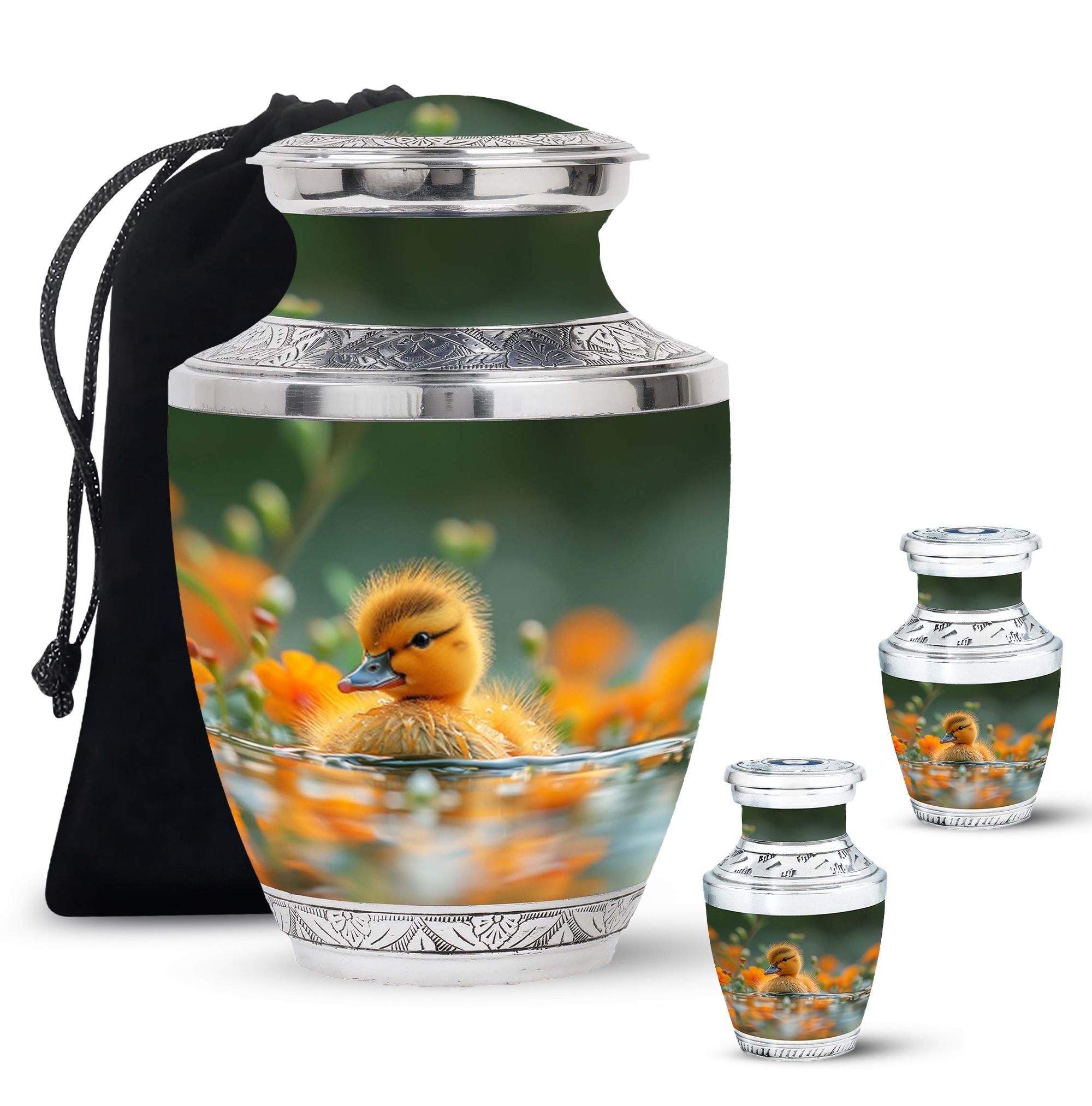 Expertly handcrafted from high-quality aluminum, the 10 inch large urn for human ashes adult male features a soft golden finish accented with delicate duckling engravings surrounded by pastel floral details. The design radiates calmness and grace, while the secure screw-top lid ensures ashes are kept safe and preserved. Matching small urns for human ashes adult female or urn for ashes adult male small keepsakes accompany the main piece, allowing loved ones to share and treasure precious memories.