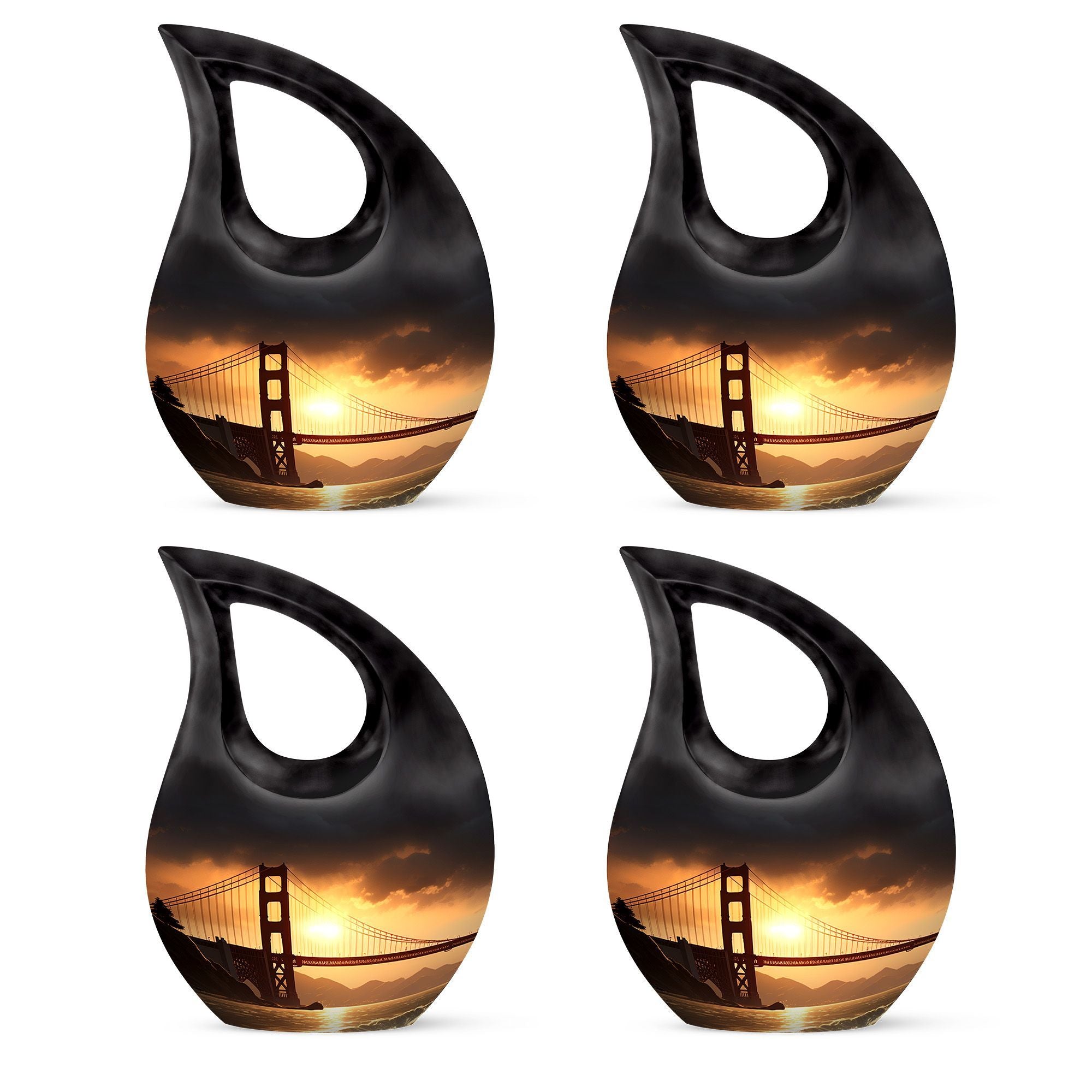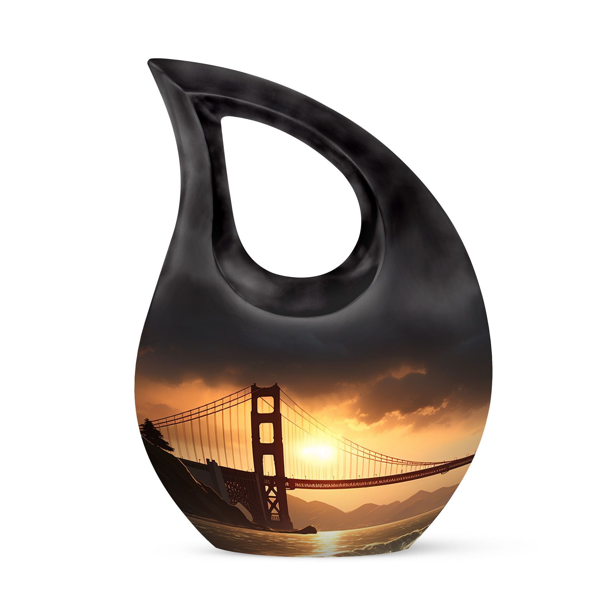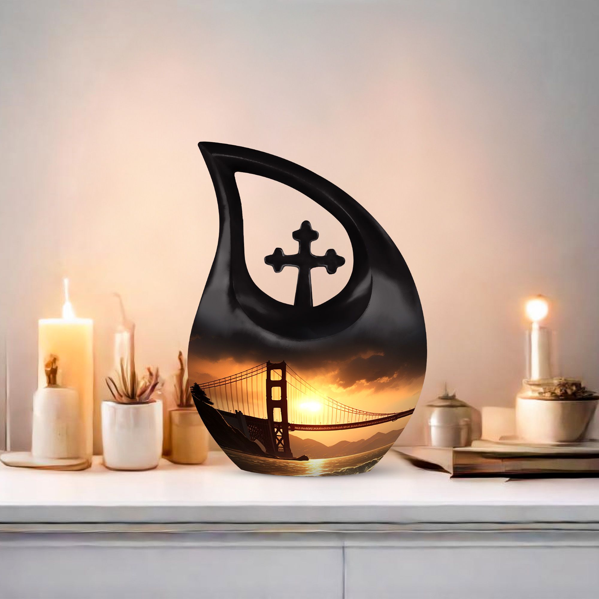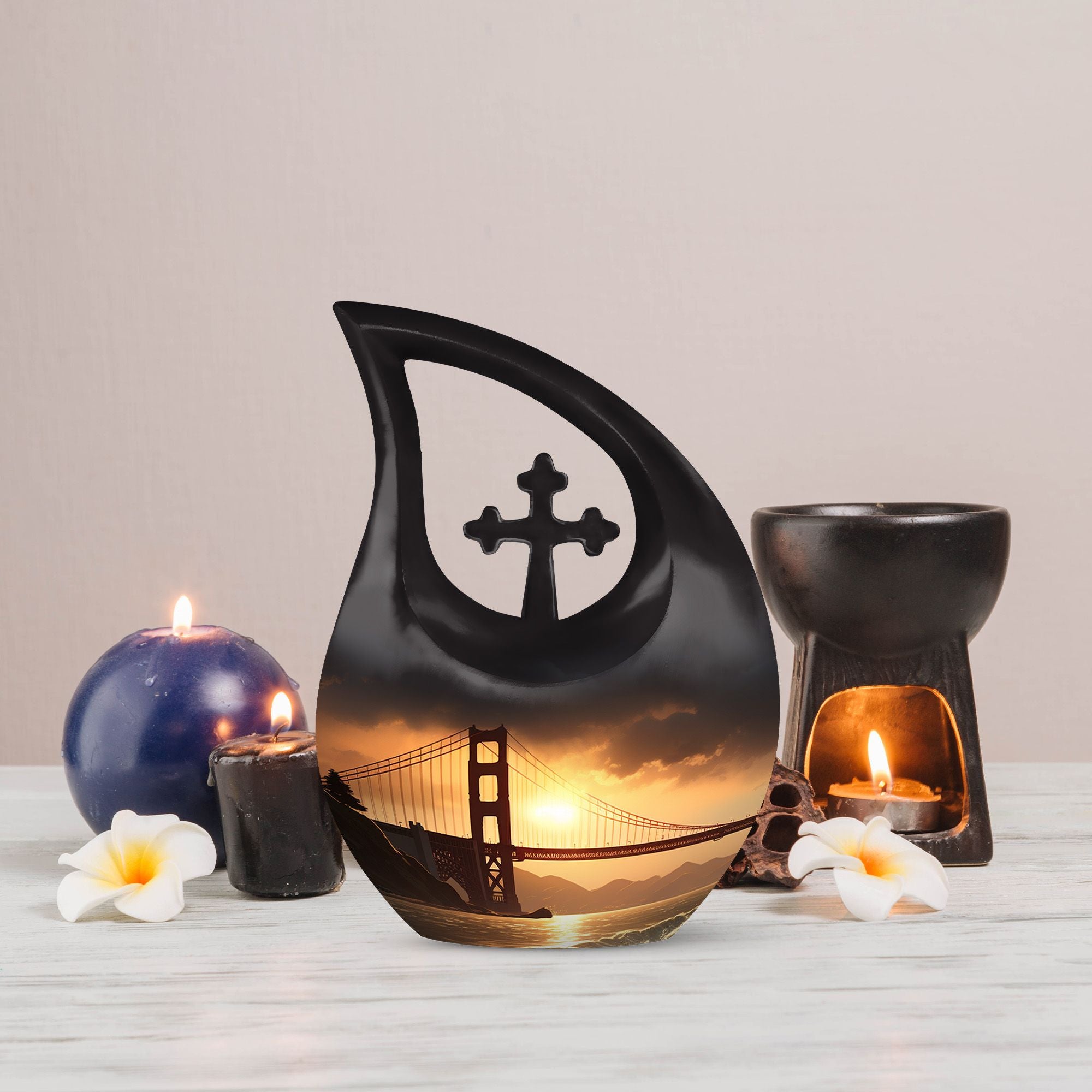 Experience a moving tribute to your beloved ones with our 'Golden Gate Bridge Urn', a magnificent cremation piece for the two you hold dearest. This 10-inch aluminium urn, weighing just 3.3 pounds, superbly exhibits a 'Cross Drop' theme, a poignant ember of timeless affinity. With the capacity to hold up to 200 cubic inches, this urn ensures your departed remain together in one resting place. The 'Golden Gate Bridge Urn' comes with a refined velvet pouch for containment of ashes, adding an extra touch of dignity. Make this memorial urn uniquely yours by personalizing it with engraved names. From pet urn vase to outdoor urns, we ensure to offer high-value choices to honor your loved ones. Our large urns, infused with the sentiment of the 'Golden Gate Bridge' design indeed make for an aesthetically pleasing, yet solemn remembrance. Choose us for memorial urns that share your cherishable stories and unspoken feelings.