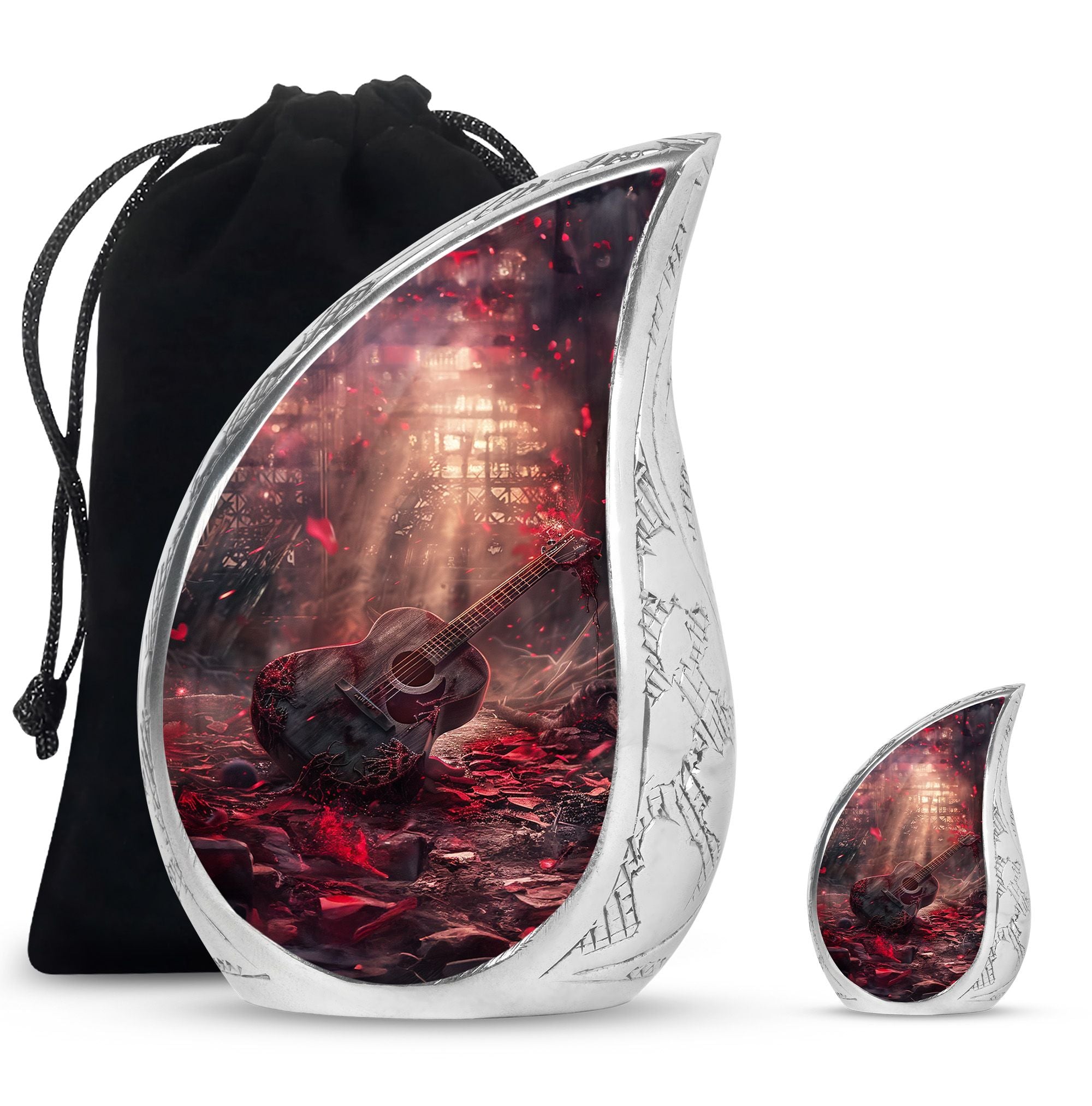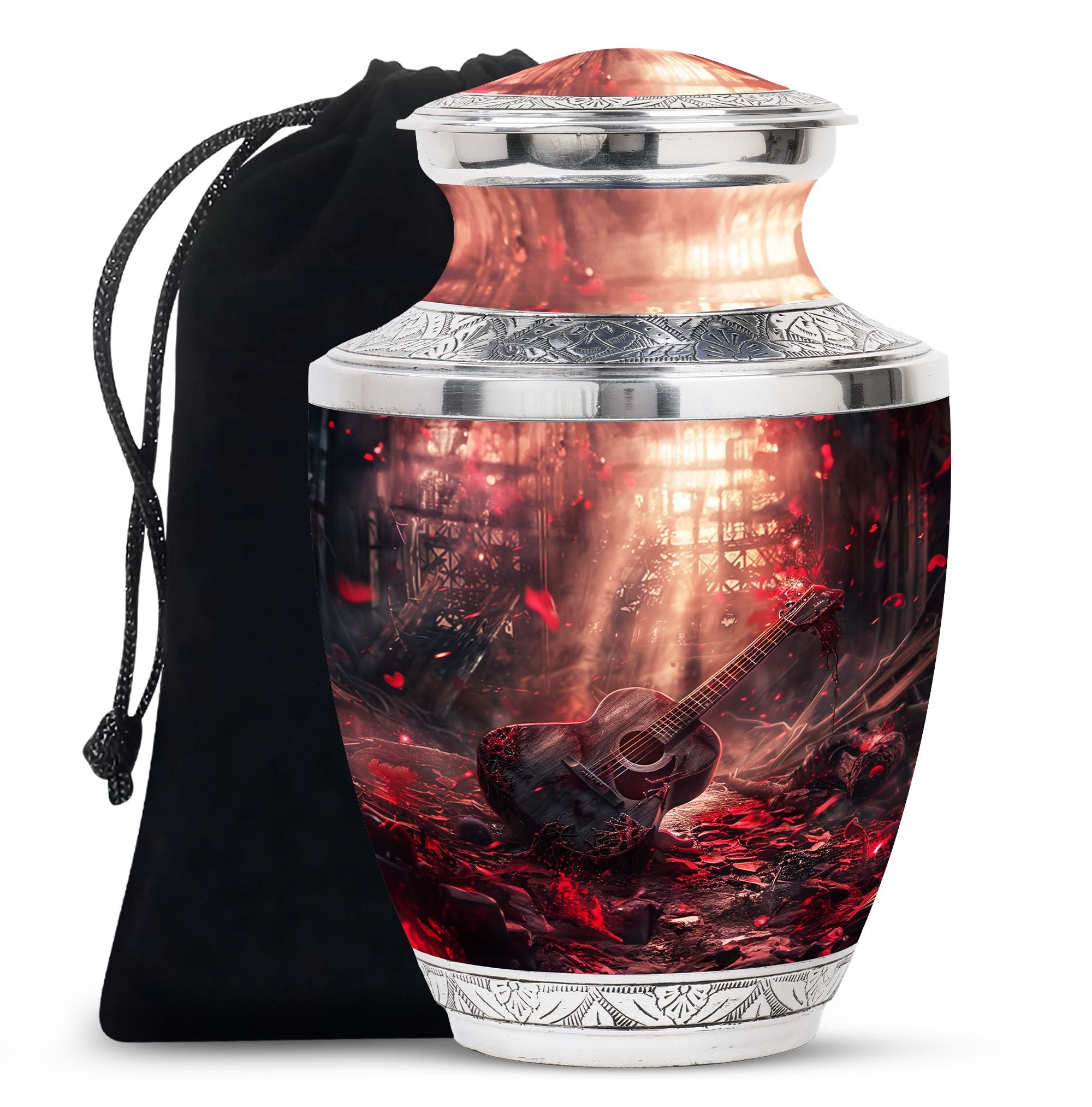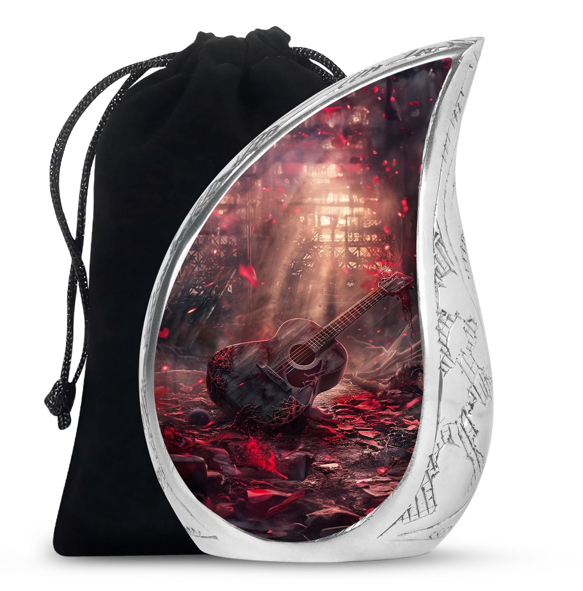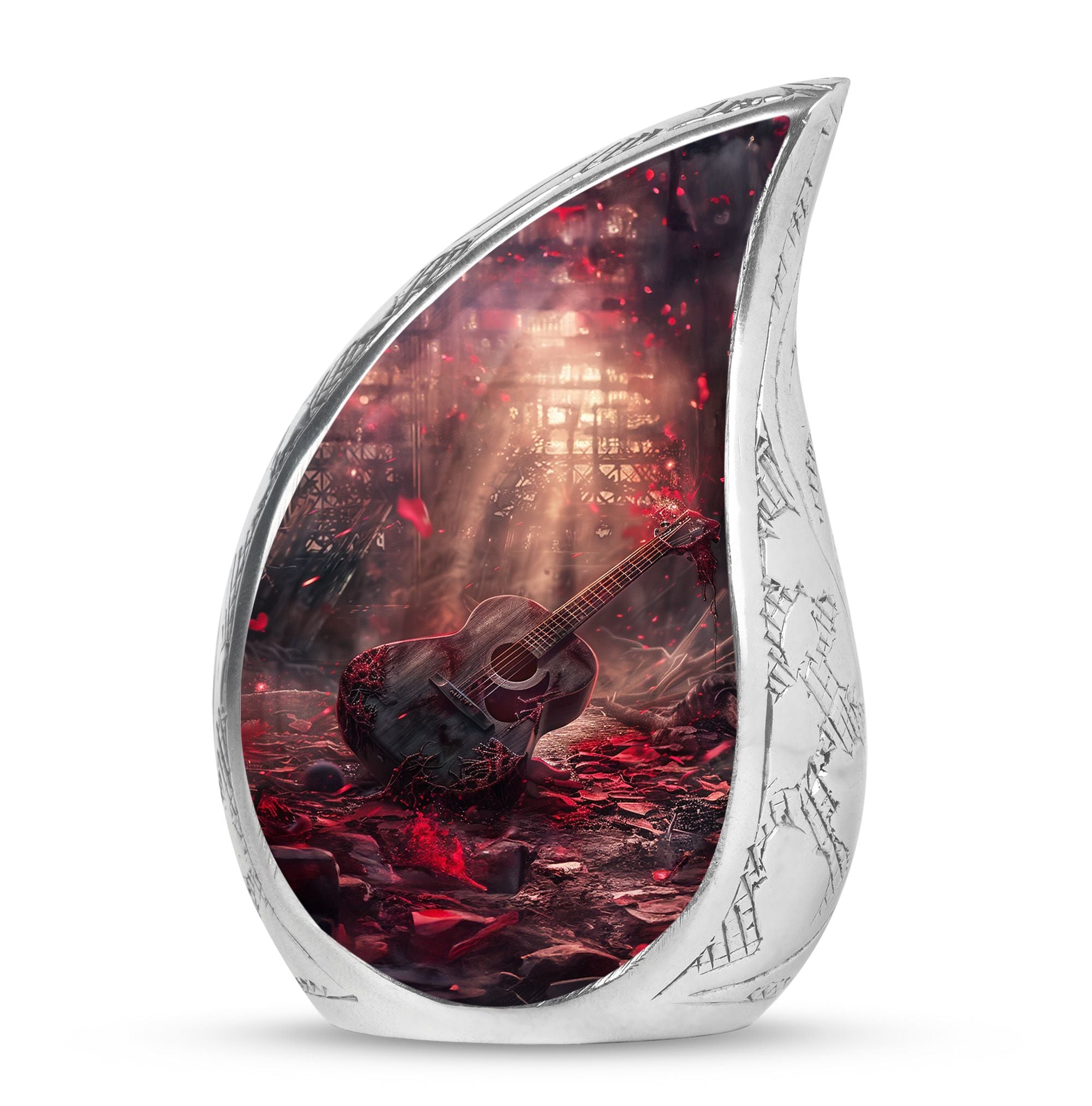 Crafted from durable aluminum, this burial urn showcases detailed artistry and a musical theme that speaks to the soul. Its polished finish and guitar design make it one of the most unique funeral urns for men, yet equally meaningful as an urn for ashes for women. With a secure screw-top lid and generous capacity, it is ideal as a large urn for human ashes adult men or women.