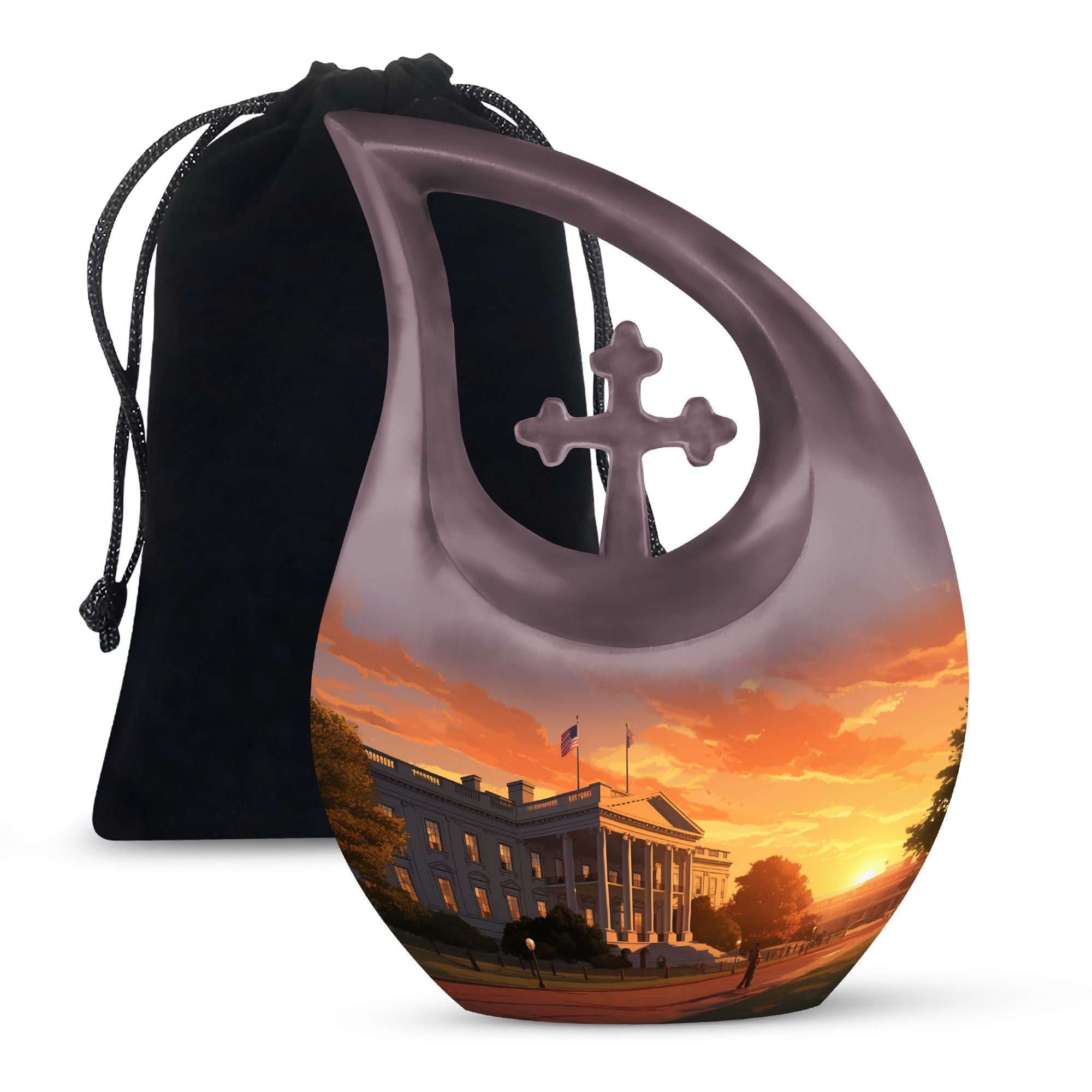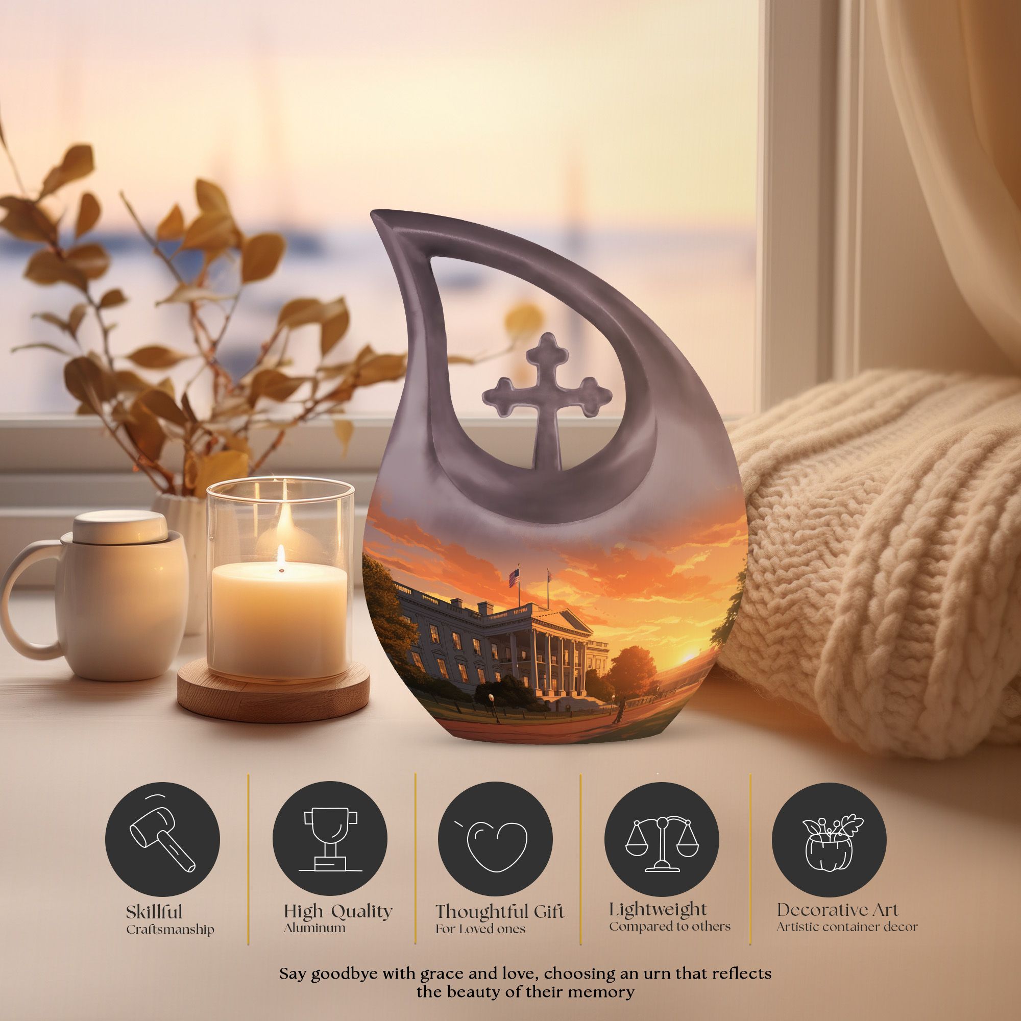 Expertly crafted from durable aluminum, this large cremation urns for human ashes design features a smooth gray and mauve gradient finish with a refined White House engraving — a symbol of honor, unity, and remembrance. Its secure screw-top lid ensures ashes are protected with the utmost care. The elegant teardrop form makes it a timeless centerpiece among large adult urns for human ashes, blending strength with subtle elegance.