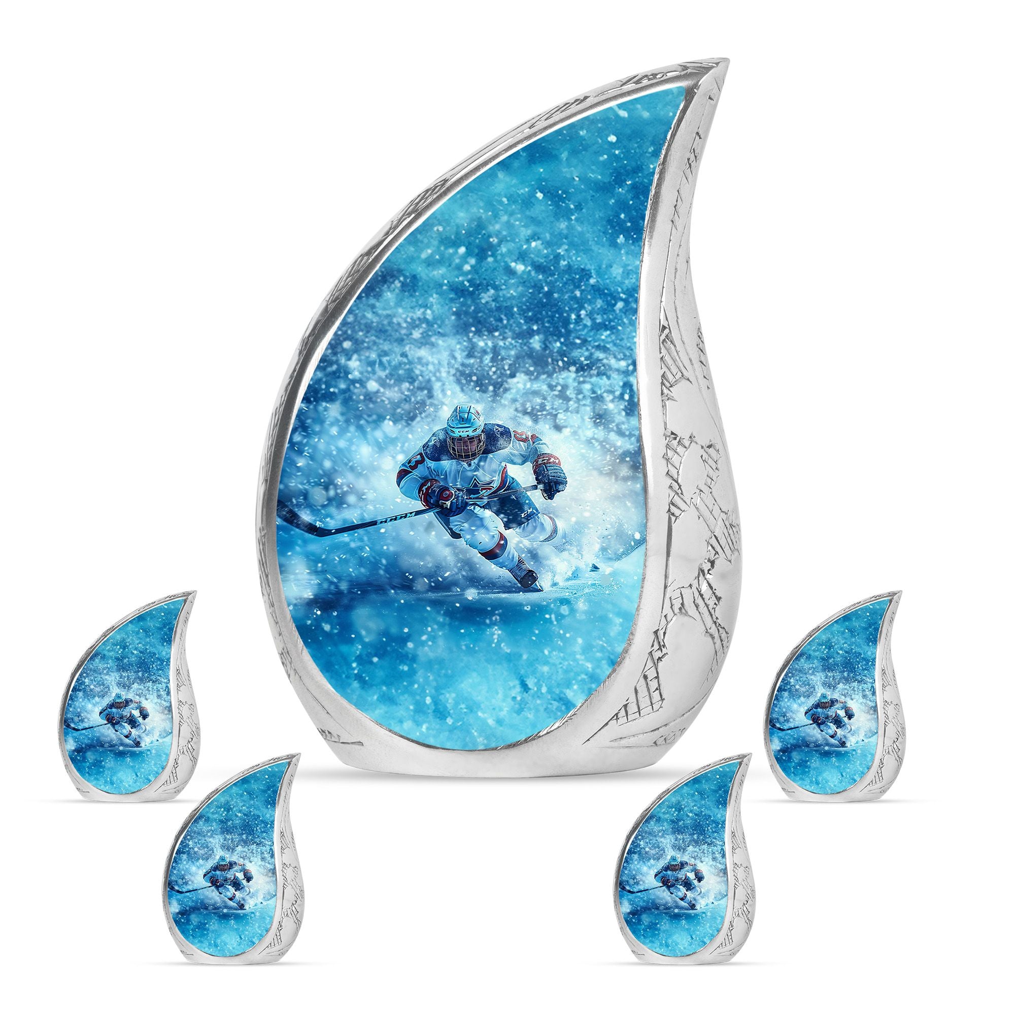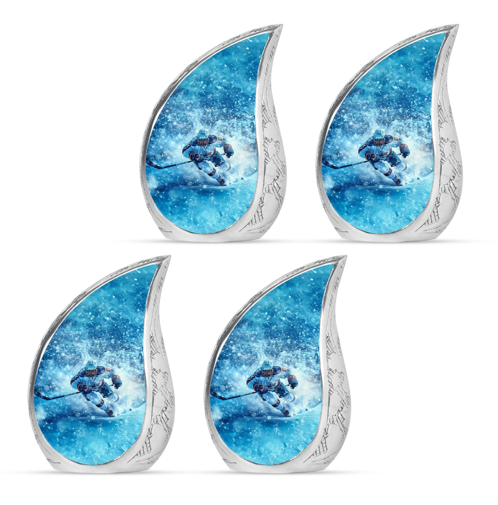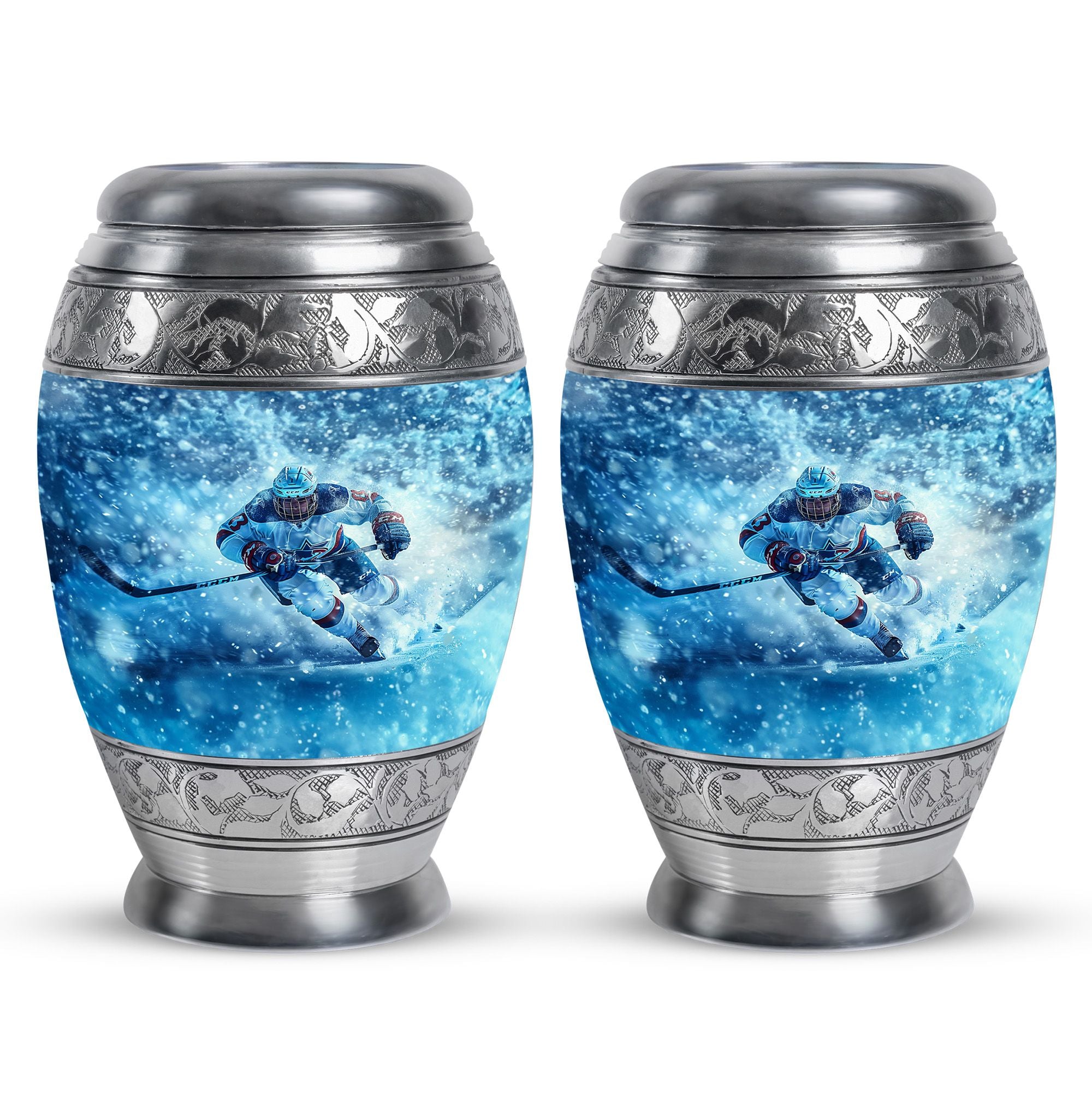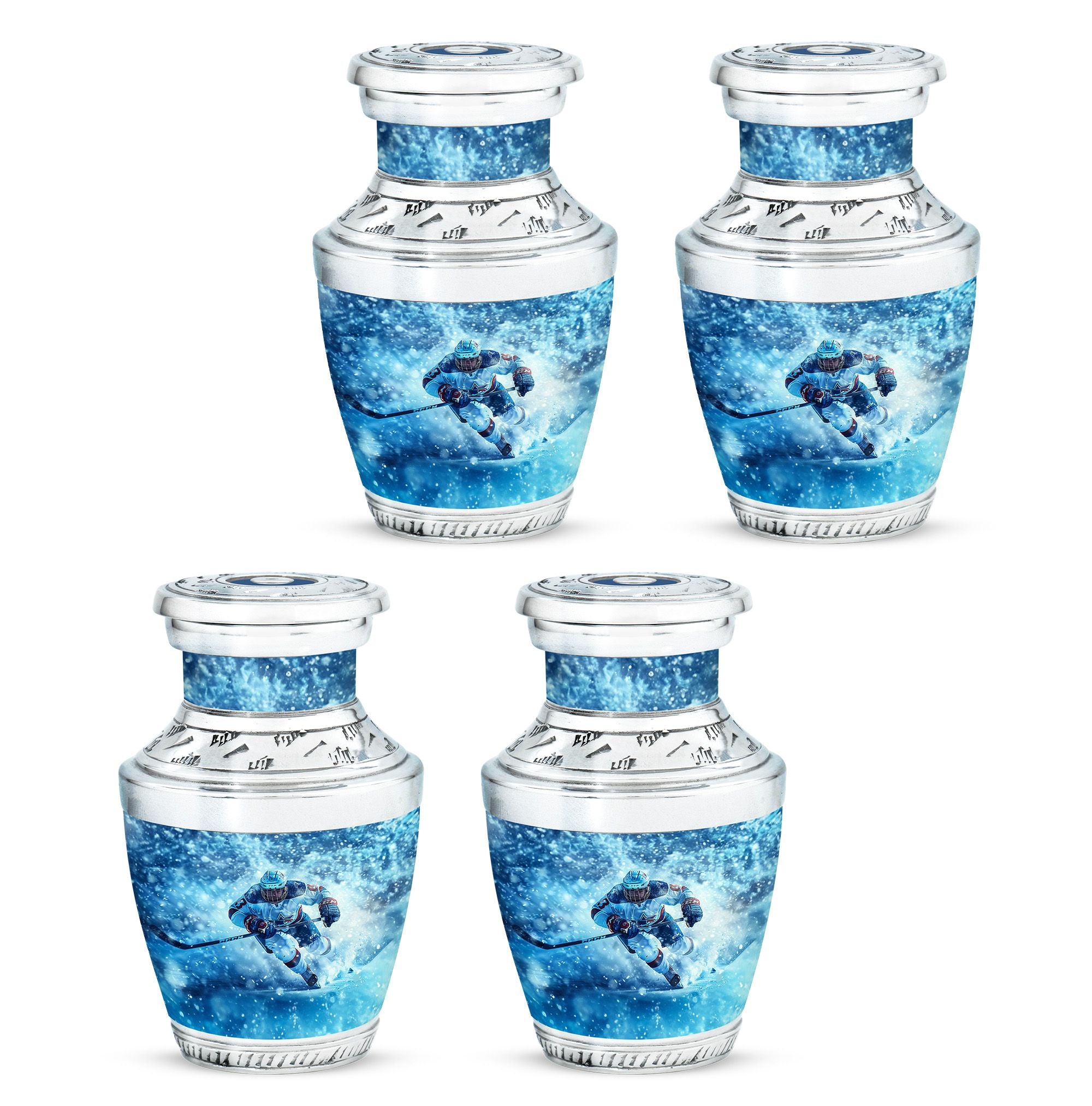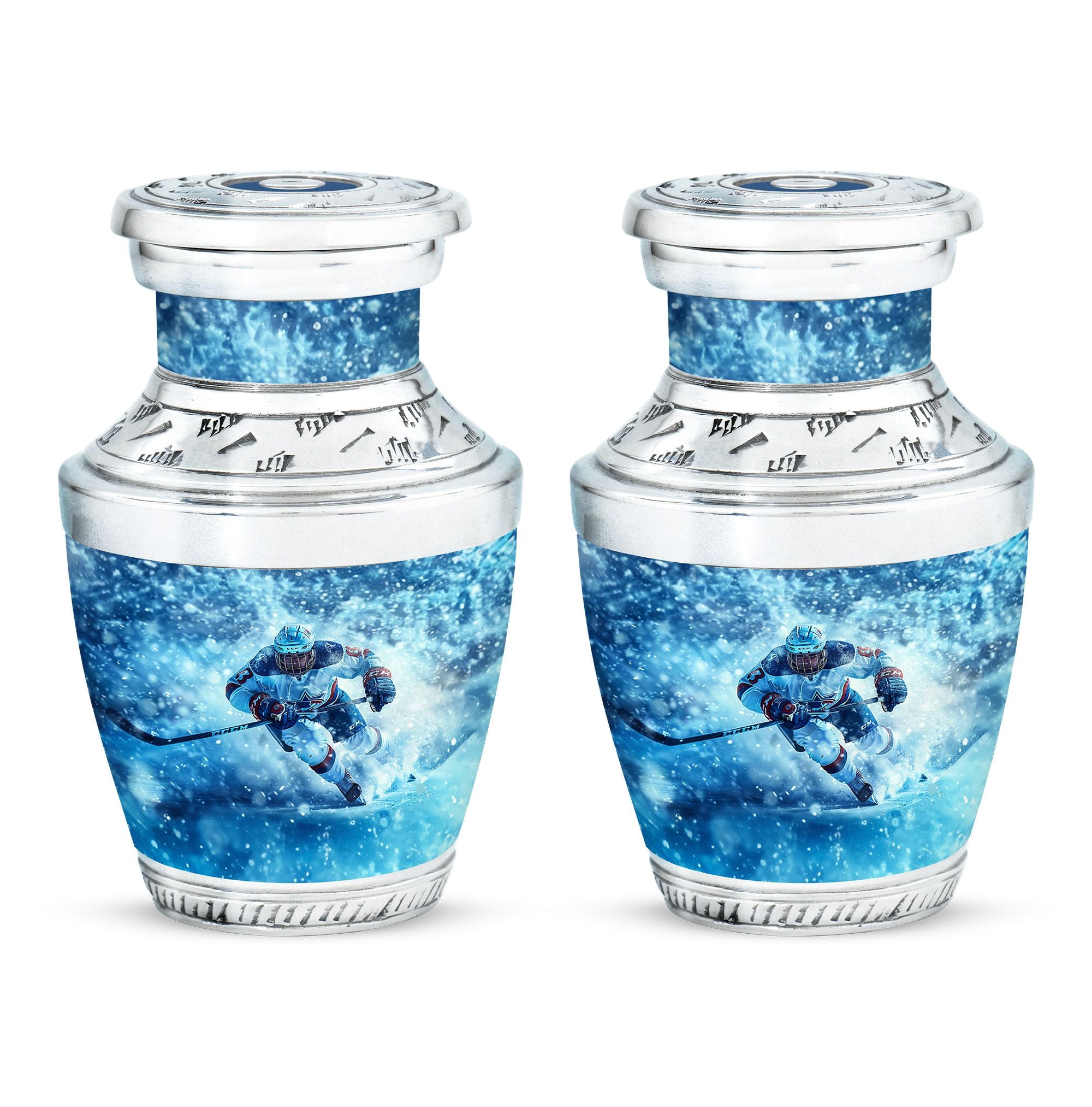 Made from durable aluminum, this urn combines strength and style. The icy blue finish represents peace and remembrance, while the ice hockey theme makes it a fitting cremation urn for humans who cherished the sport. Designed with a secure screw-top lid, it ensures ashes are protected. It can be used as a primary cremation urn ashes container, or paired with mini keepsake urns for human ashes in a family memorial display. This makes it a versatile choice for those seeking both a small decorative urn and a urn with keepsake combo.