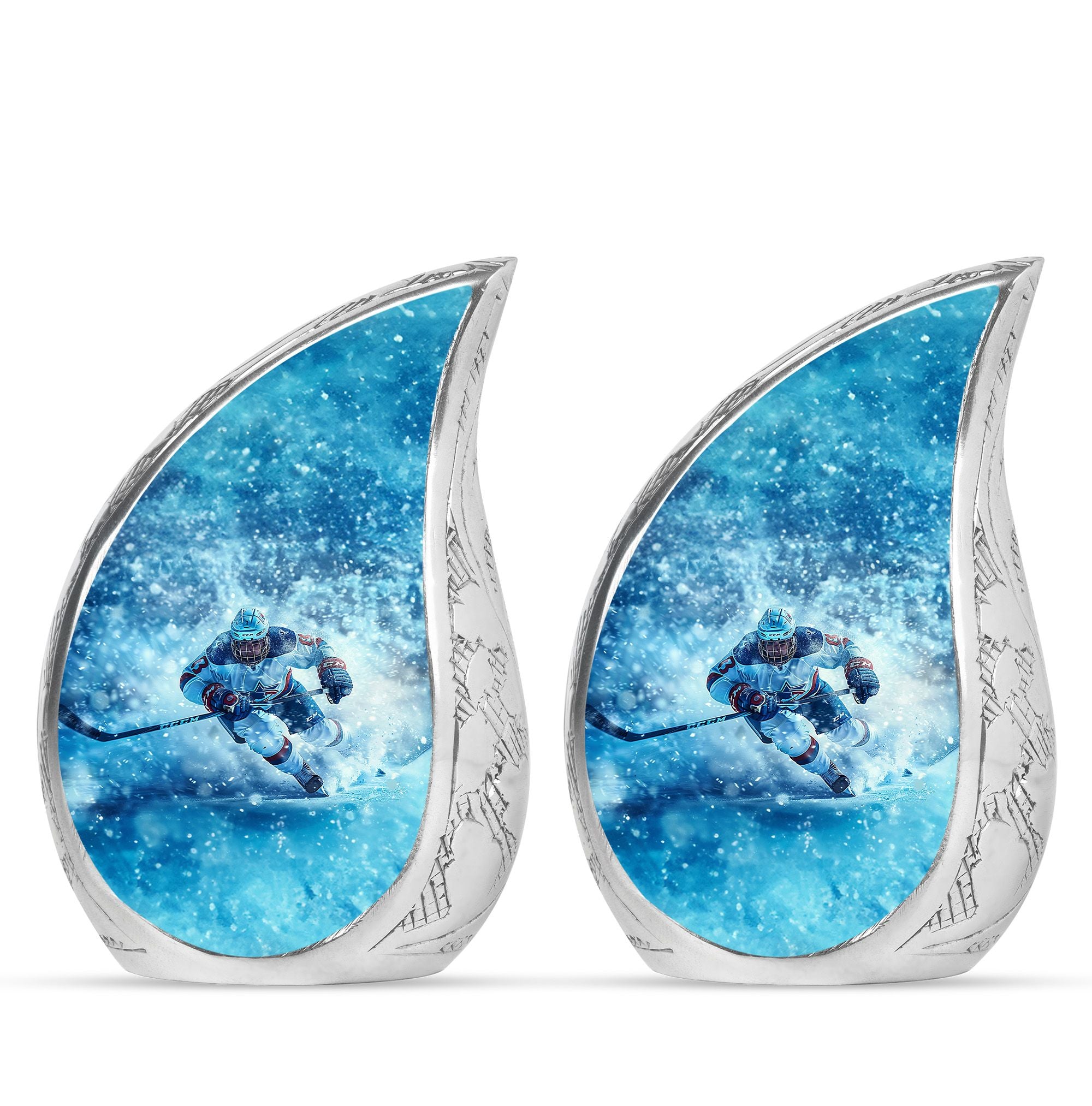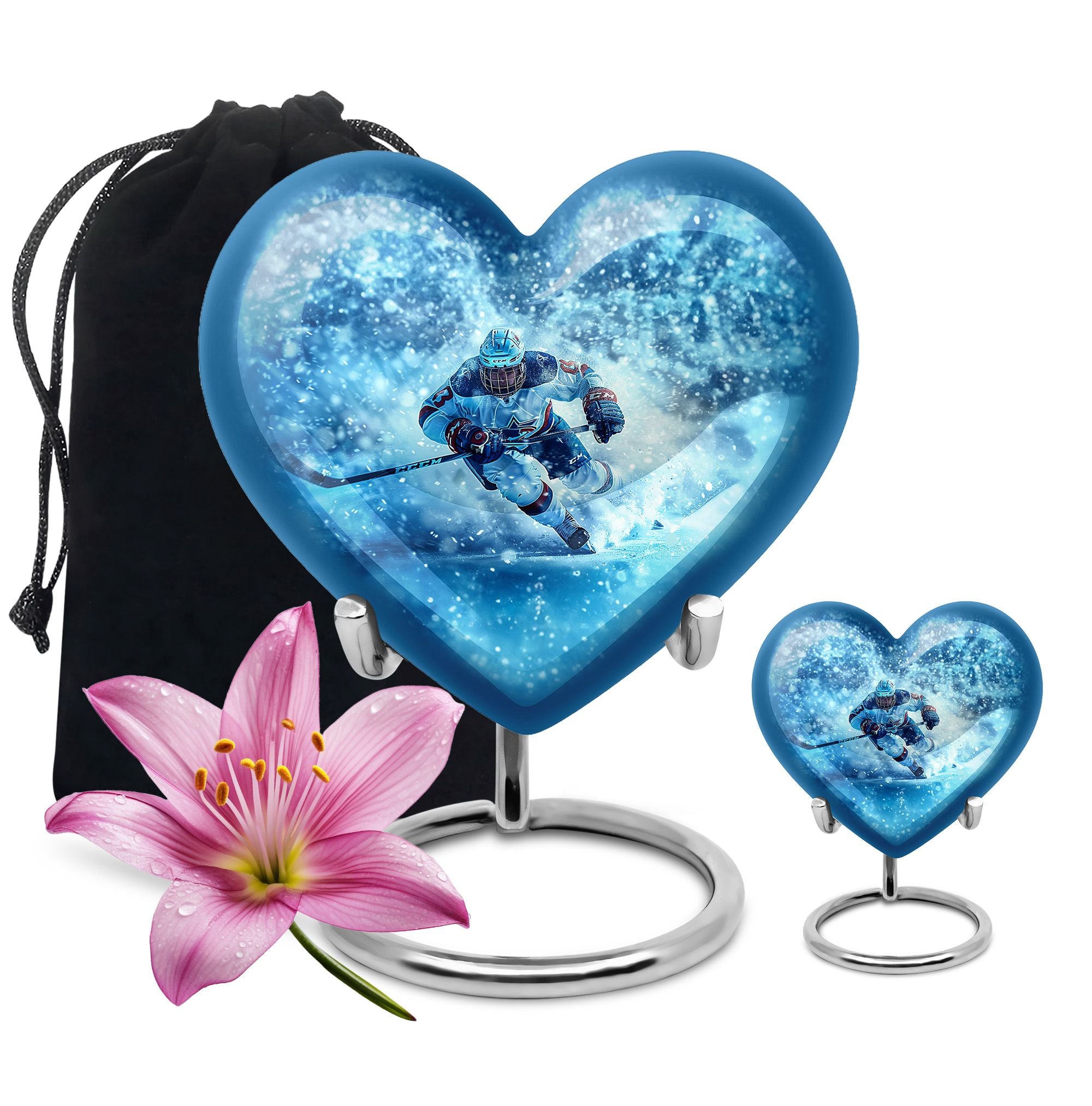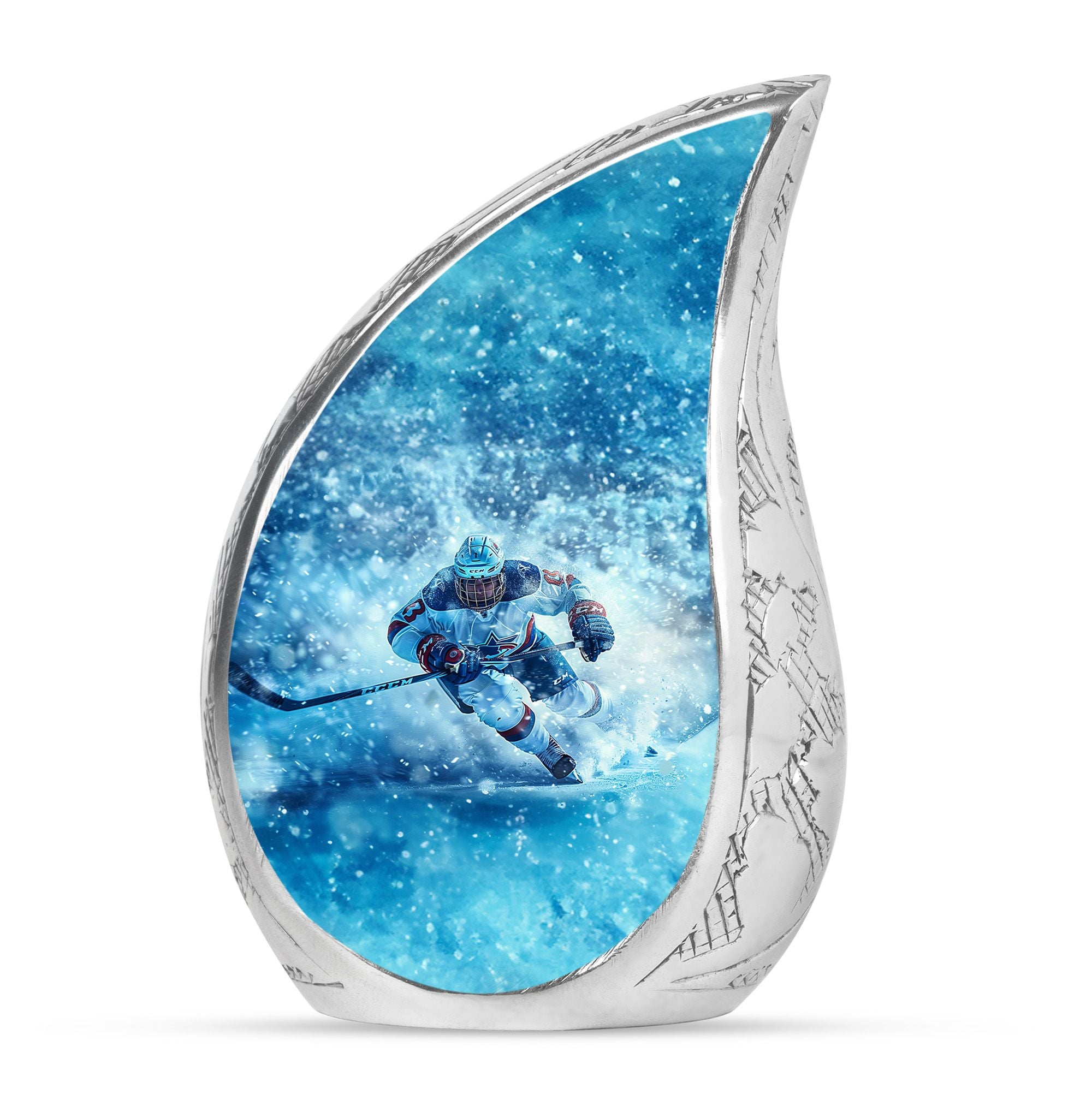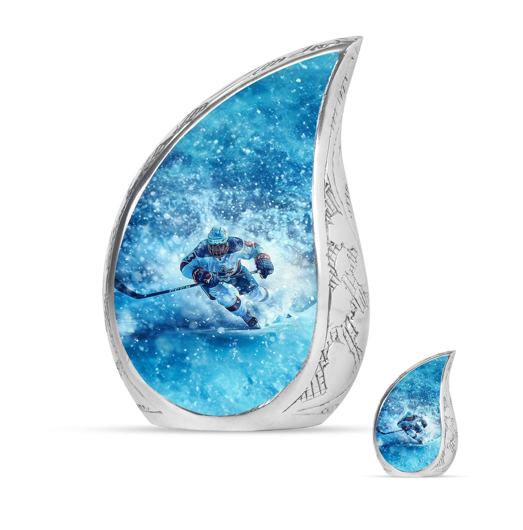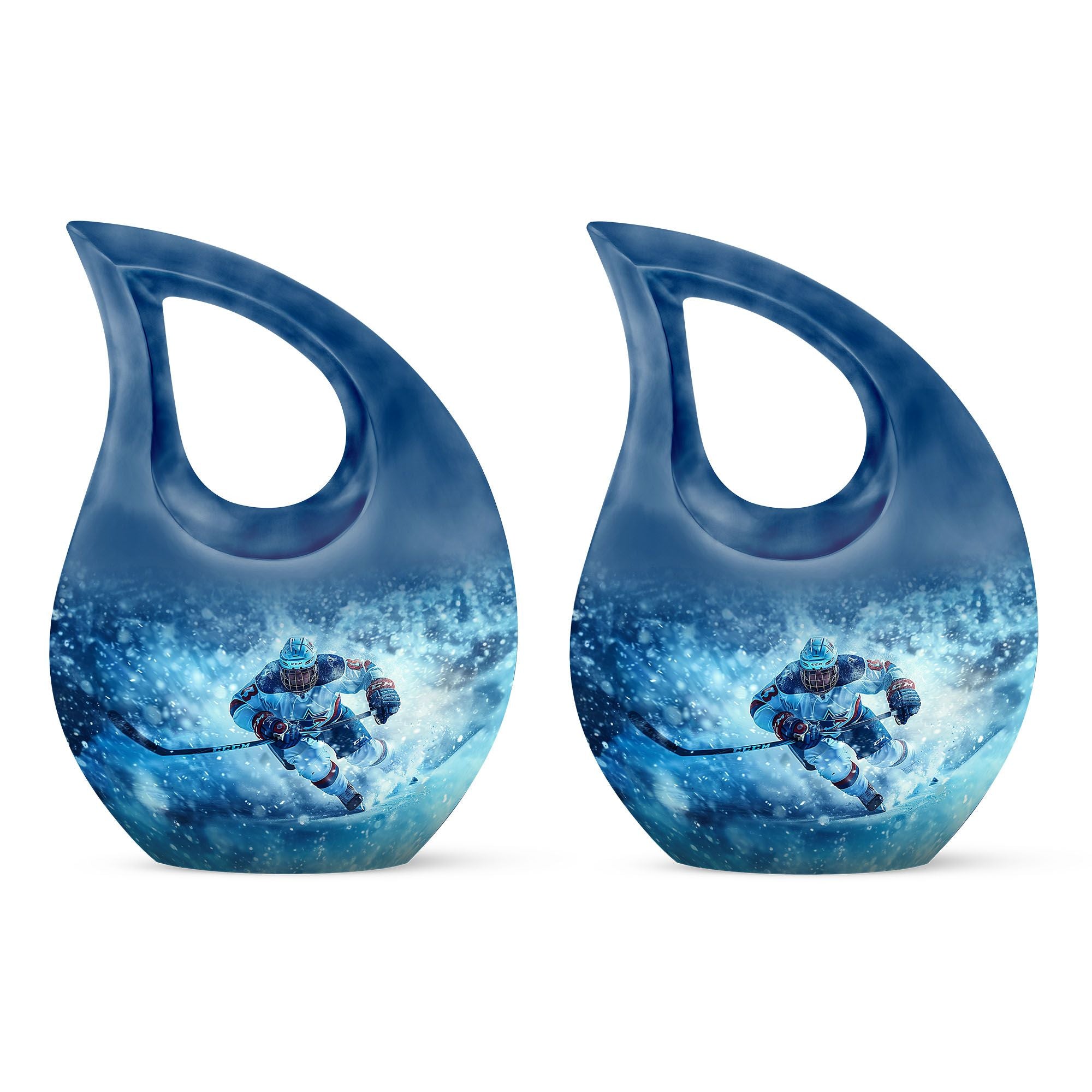 Made from durable aluminum, this urn combines strength and style. The icy blue finish represents peace and remembrance, while the ice hockey theme makes it a fitting cremation urn for humans who cherished the sport. Designed with a secure screw-top lid, it ensures ashes are protected. It can be used as a primary cremation urn ashes container, or paired with mini keepsake urns for human ashes in a family memorial display. This makes it a versatile choice for those seeking both a small decorative urn and a urn with keepsake combo.