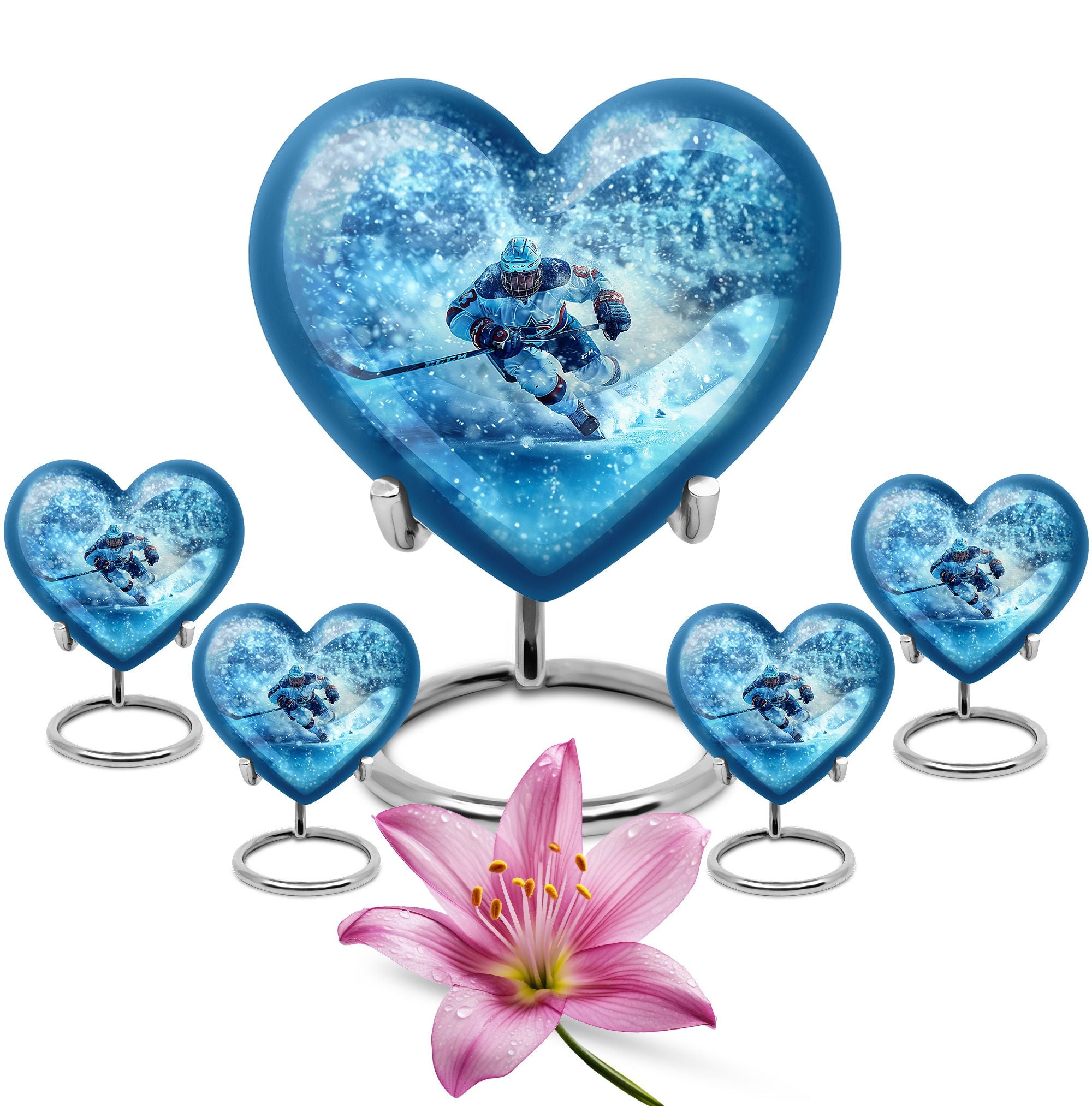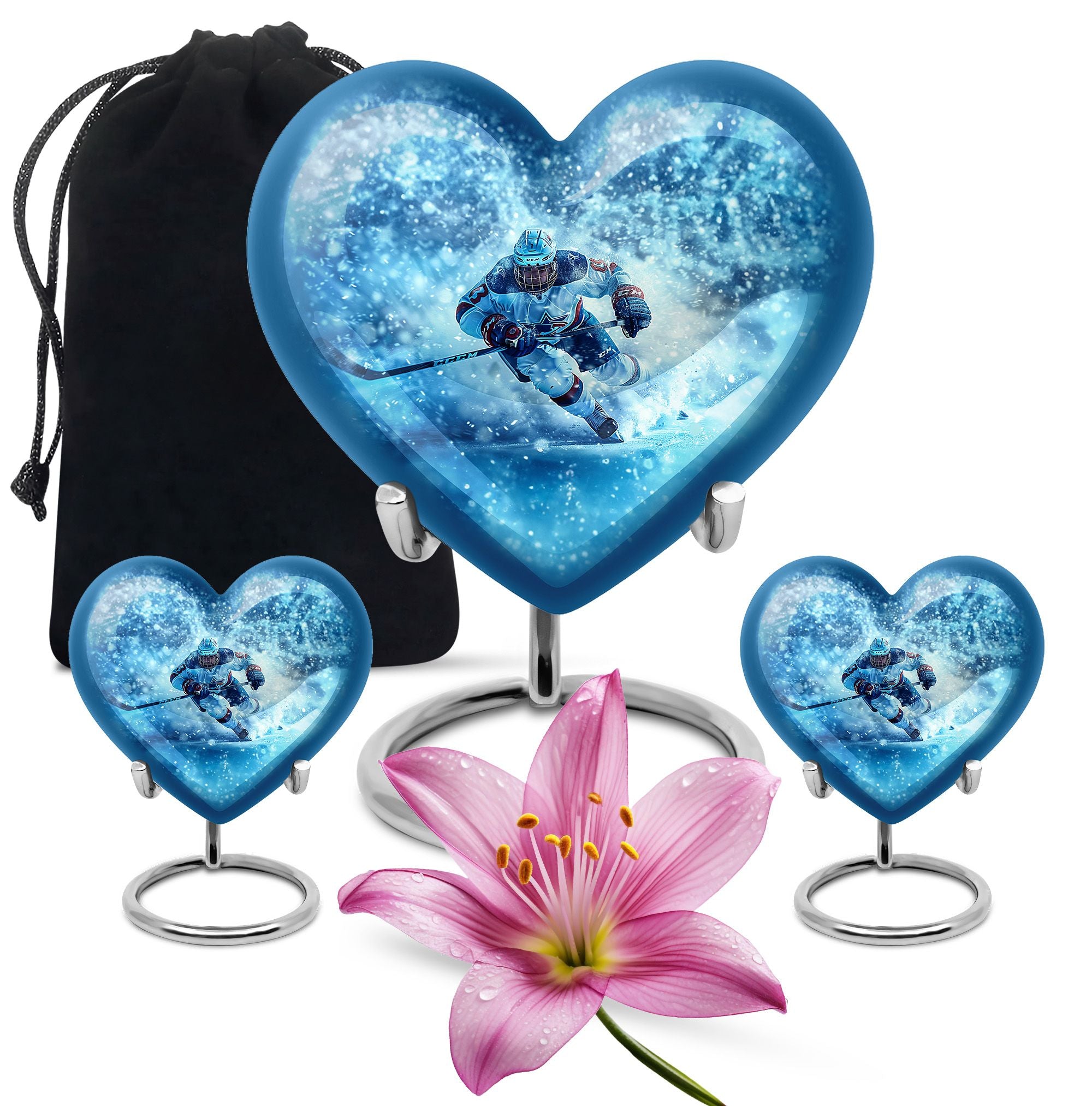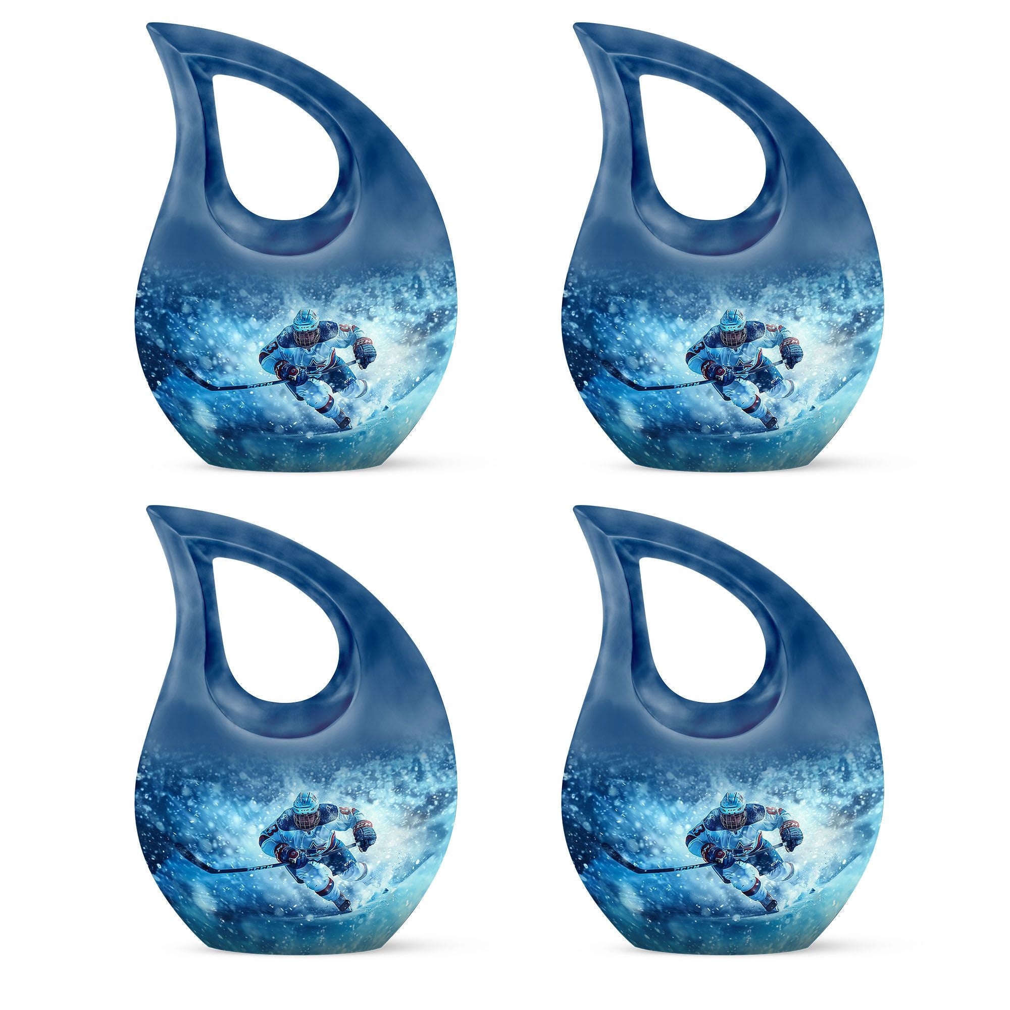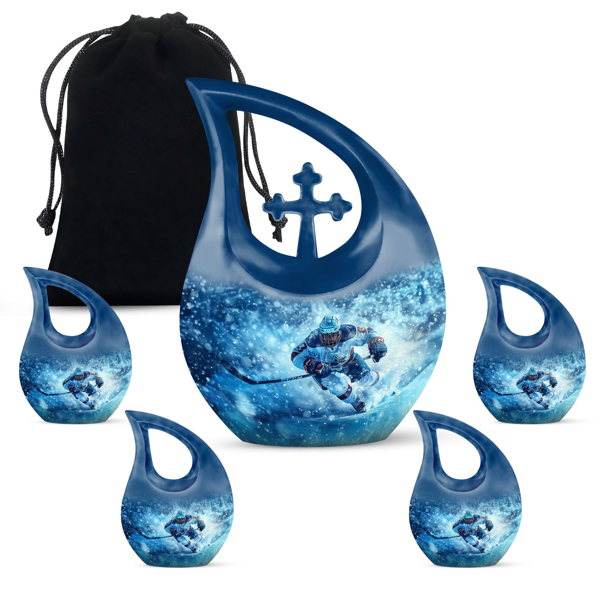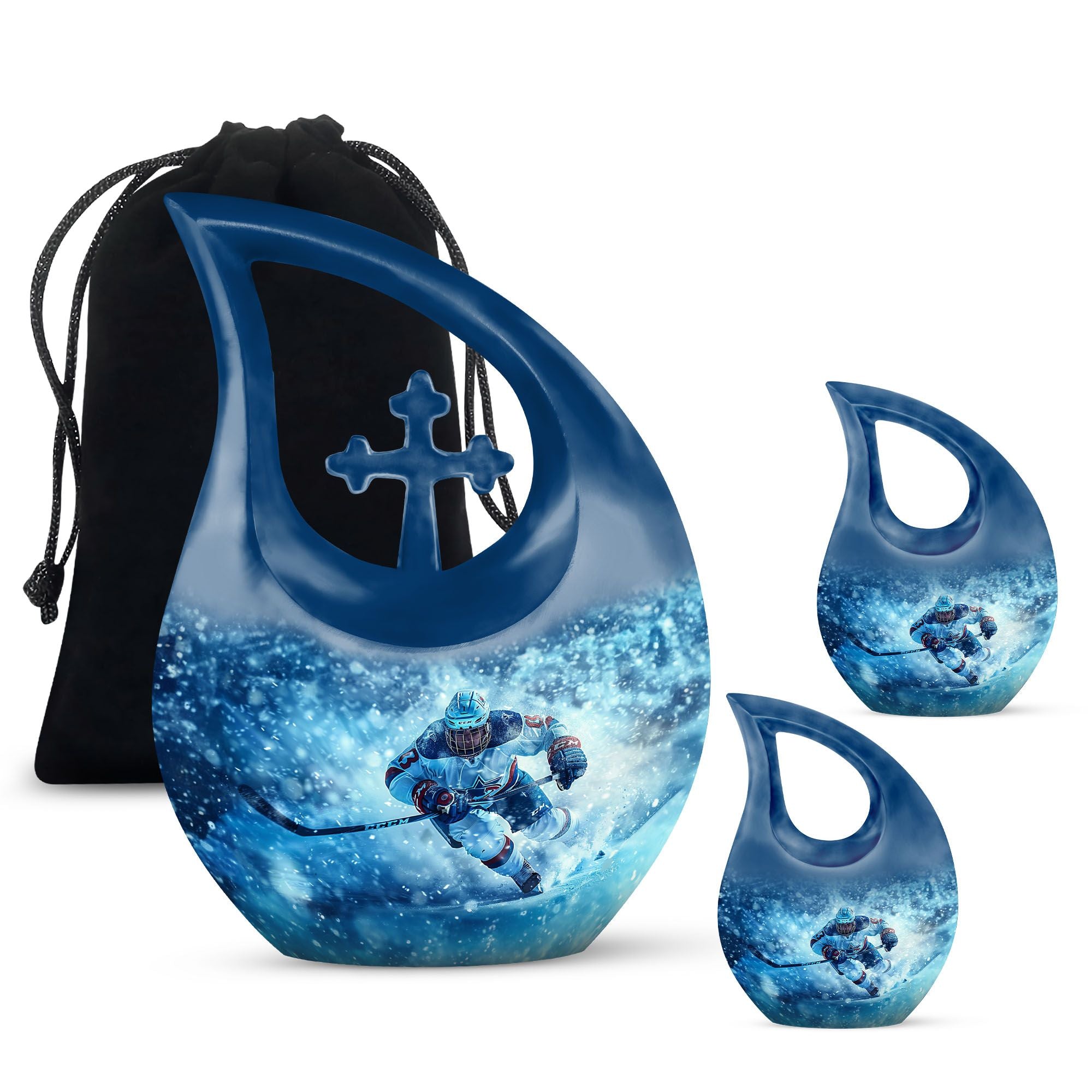 Made from durable aluminum, this urn combines strength and style. The icy blue finish represents peace and remembrance, while the ice hockey theme makes it a fitting cremation urn for humans who cherished the sport. Designed with a secure screw-top lid, it ensures ashes are protected. It can be used as a primary cremation urn ashes container, or paired with mini keepsake urns for human ashes in a family memorial display. This makes it a versatile choice for those seeking both a small decorative urn and a urn with keepsake combo.