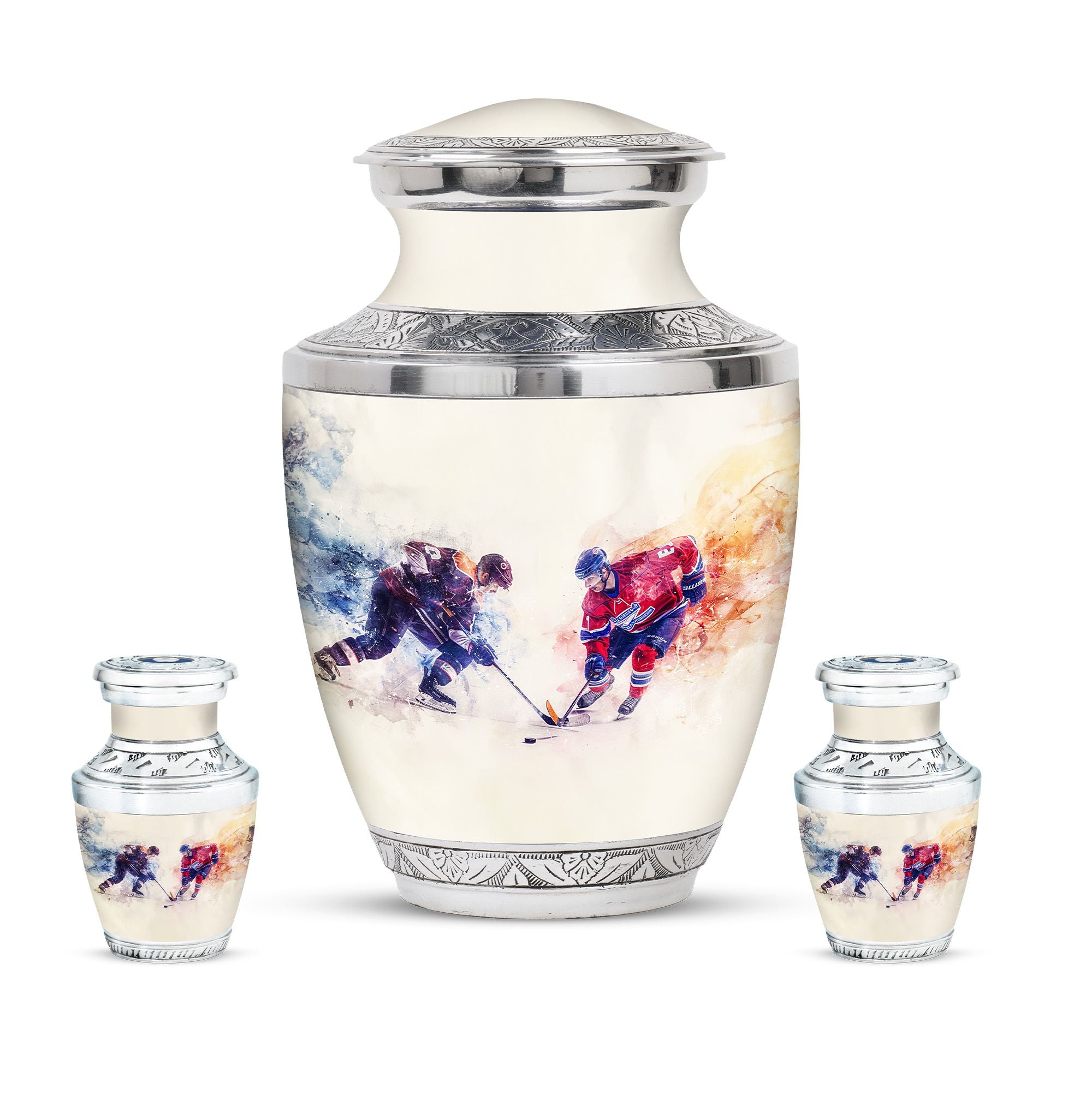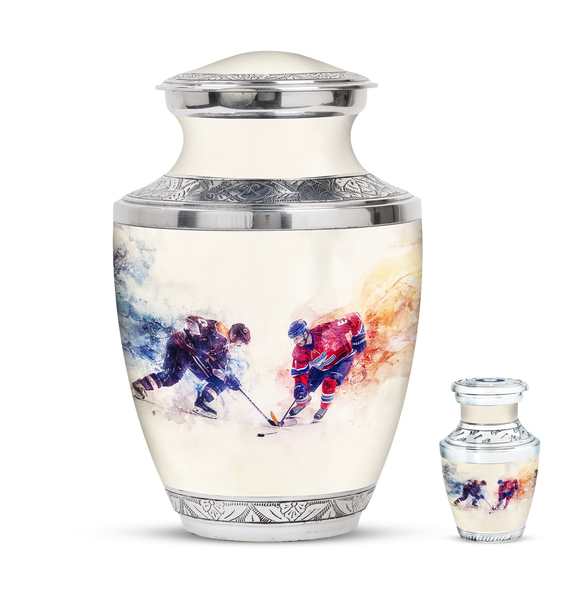 This urn is meticulously crafted from durable aluminum, ensuring strength and security for years to come. The design is available in two striking finishes—a bold red ice hockey urn and a calming blue ice hockey urn—each reflecting individuality and love. With a secure screw-top lid, this large human urn keeps ashes safe while serving as a beautiful display piece at home or in a memorial service. Its versatile style makes it suitable as an adult urn for human ashes men or as one of the cremation urns for women, offering families a dignified choice.