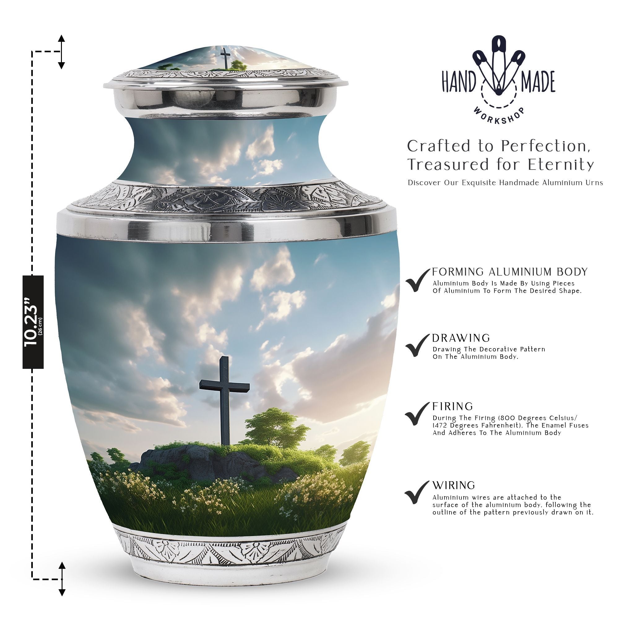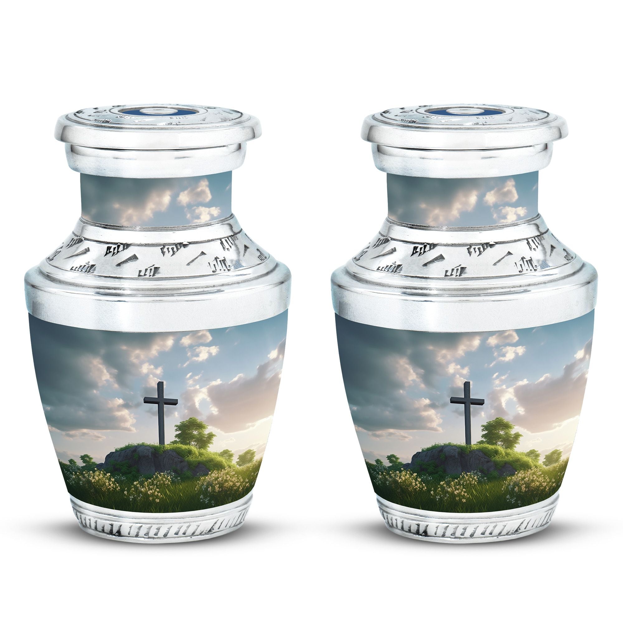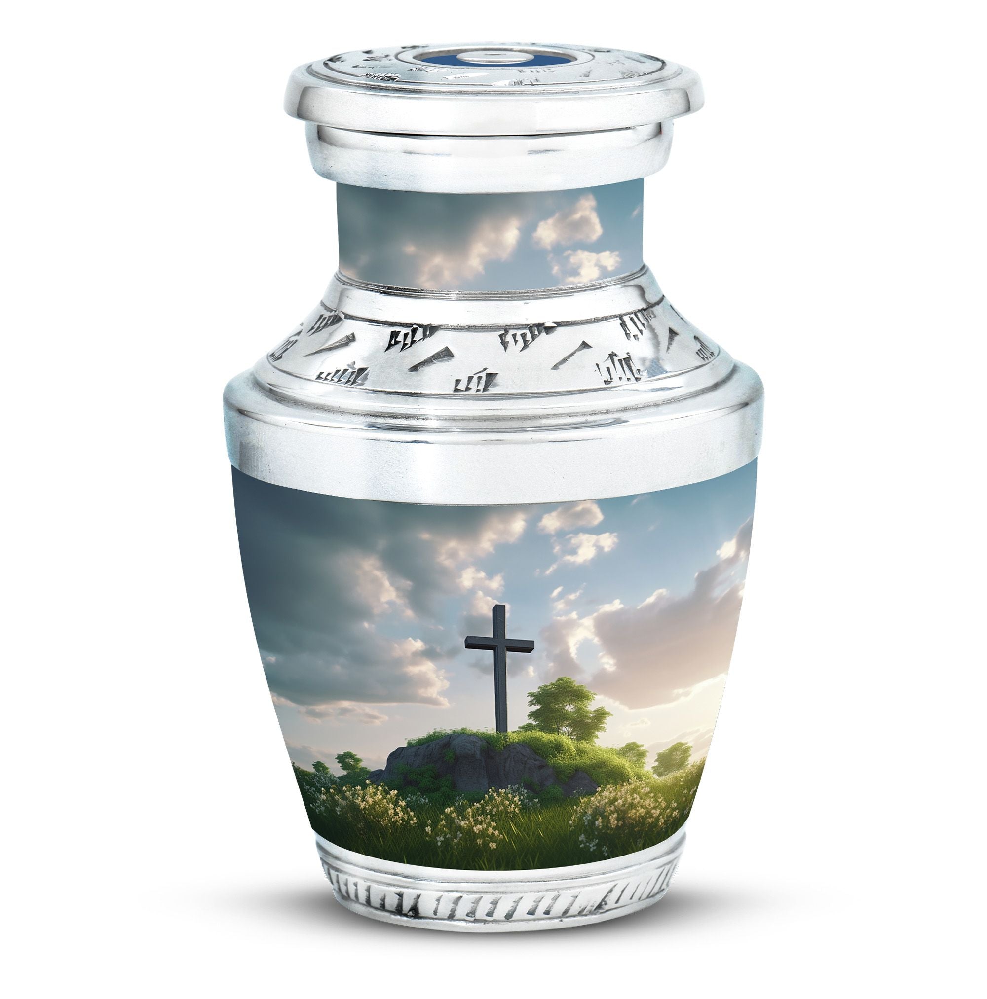 Encompassed in prayerful reverence, this 'Jesus Christ Cross Memorial Urn' is a tasteful remembrance piece, ideal for those in the 'Religious & Ceremonial' goods marketplace. Expertly fashioned from durable Aluminium, this Large Urn has a weight of 3.3 pounds and dimensions of 10 inches in height. Its unheard-of classic urn stature holds a capacity of 200 cubic inches, being able to preserve sacred tokens of affection gracefully. The velvet pouch included with each purchase offers dignified containment of ashes. Notably, personalizing with engraved names allows for an added touch of sentiment, turning this urn into a unique, heartfelt tribute. This '3 Inch' memorial holds strong significance for loved ones lost, like your Mom or your Dad.