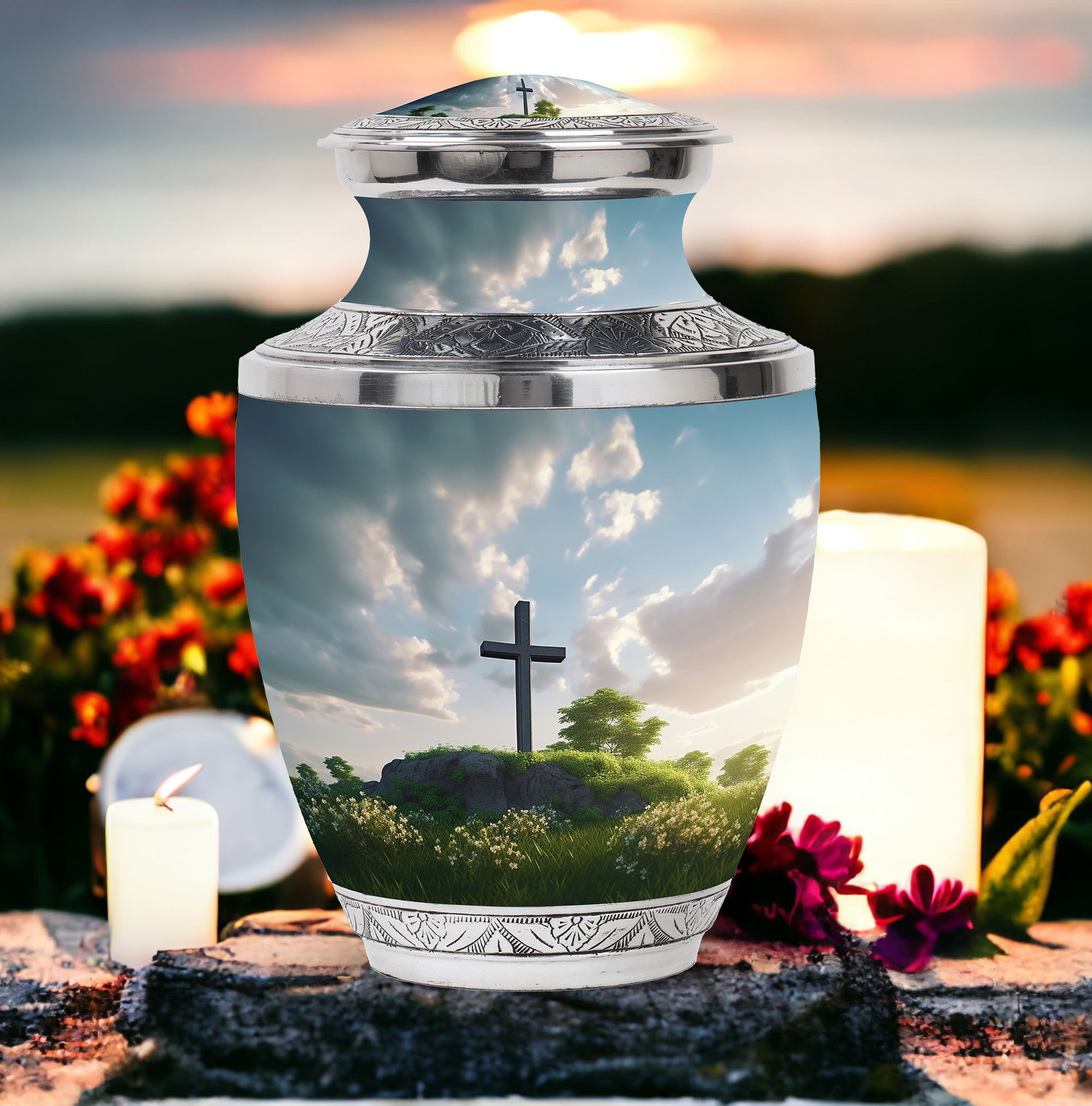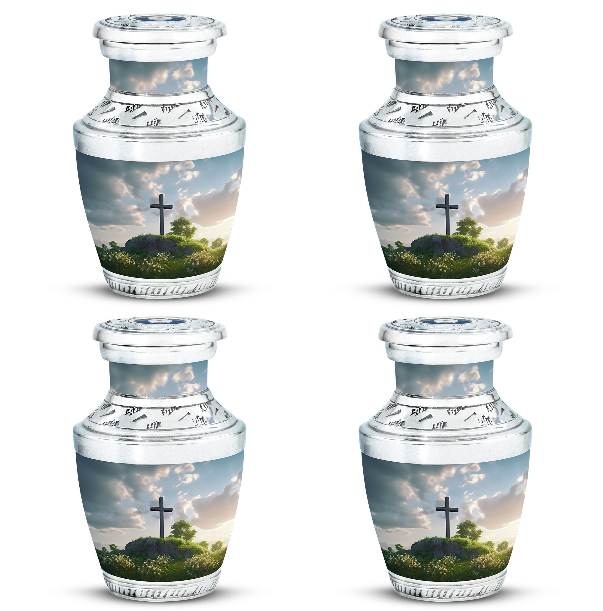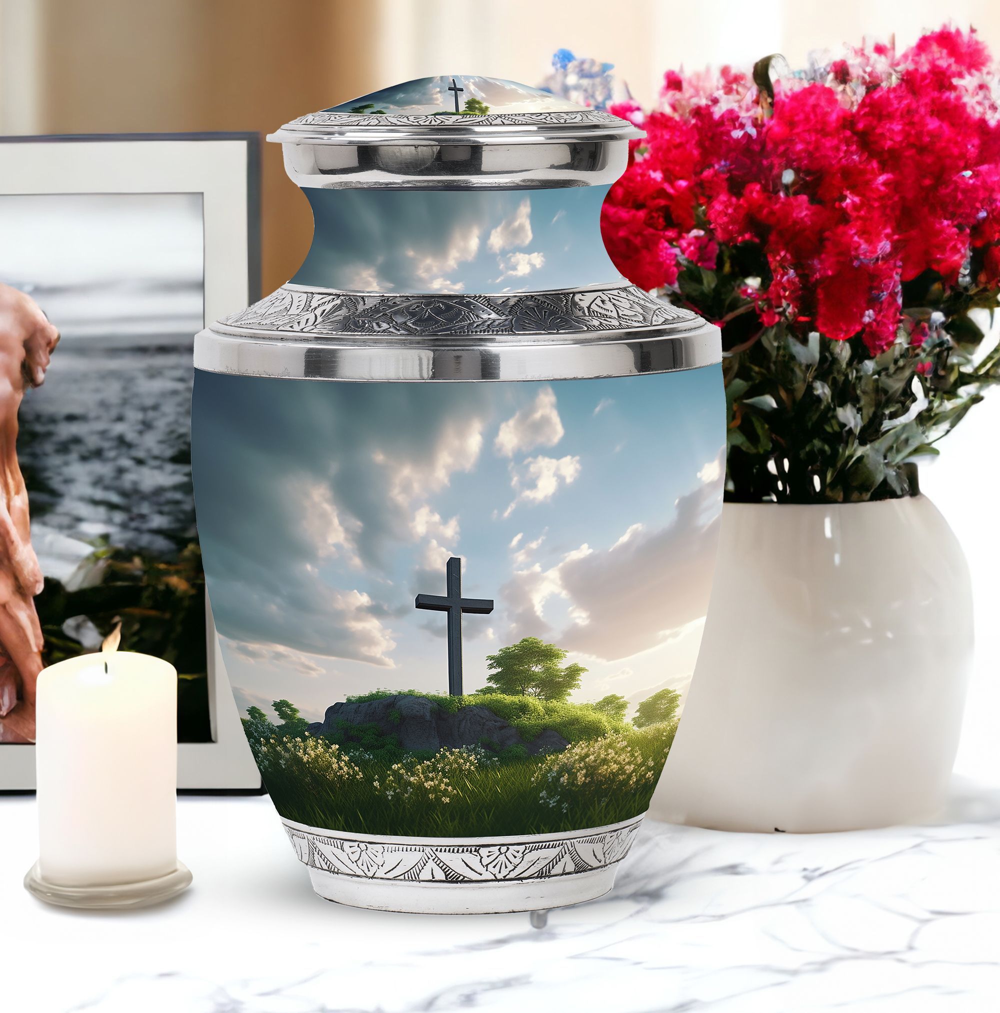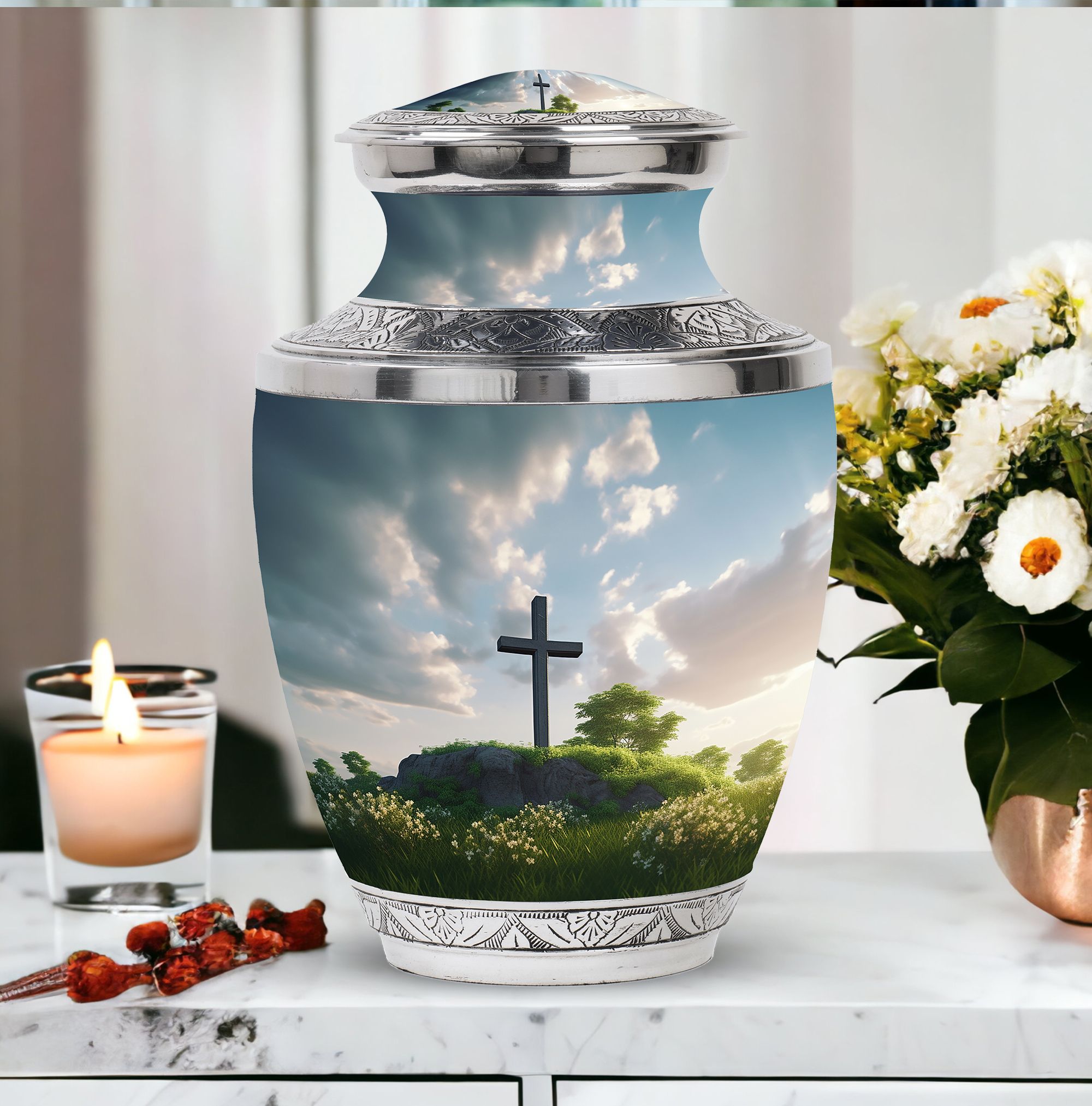 Encompassed in prayerful reverence, this 'Jesus Christ Cross Memorial Urn' is a tasteful remembrance piece, ideal for those in the 'Religious & Ceremonial' goods marketplace. Expertly fashioned from durable Aluminium, this Large Urn has a weight of 3.3 pounds and dimensions of 10 inches in height. Its unheard-of classic urn stature holds a capacity of 200 cubic inches, being able to preserve sacred tokens of affection gracefully. The velvet pouch included with each purchase offers dignified containment of ashes. Notably, personalizing with engraved names allows for an added touch of sentiment, turning this urn into a unique, heartfelt tribute. This '3 Inch' memorial holds strong significance for loved ones lost, like your Mom or your Dad.