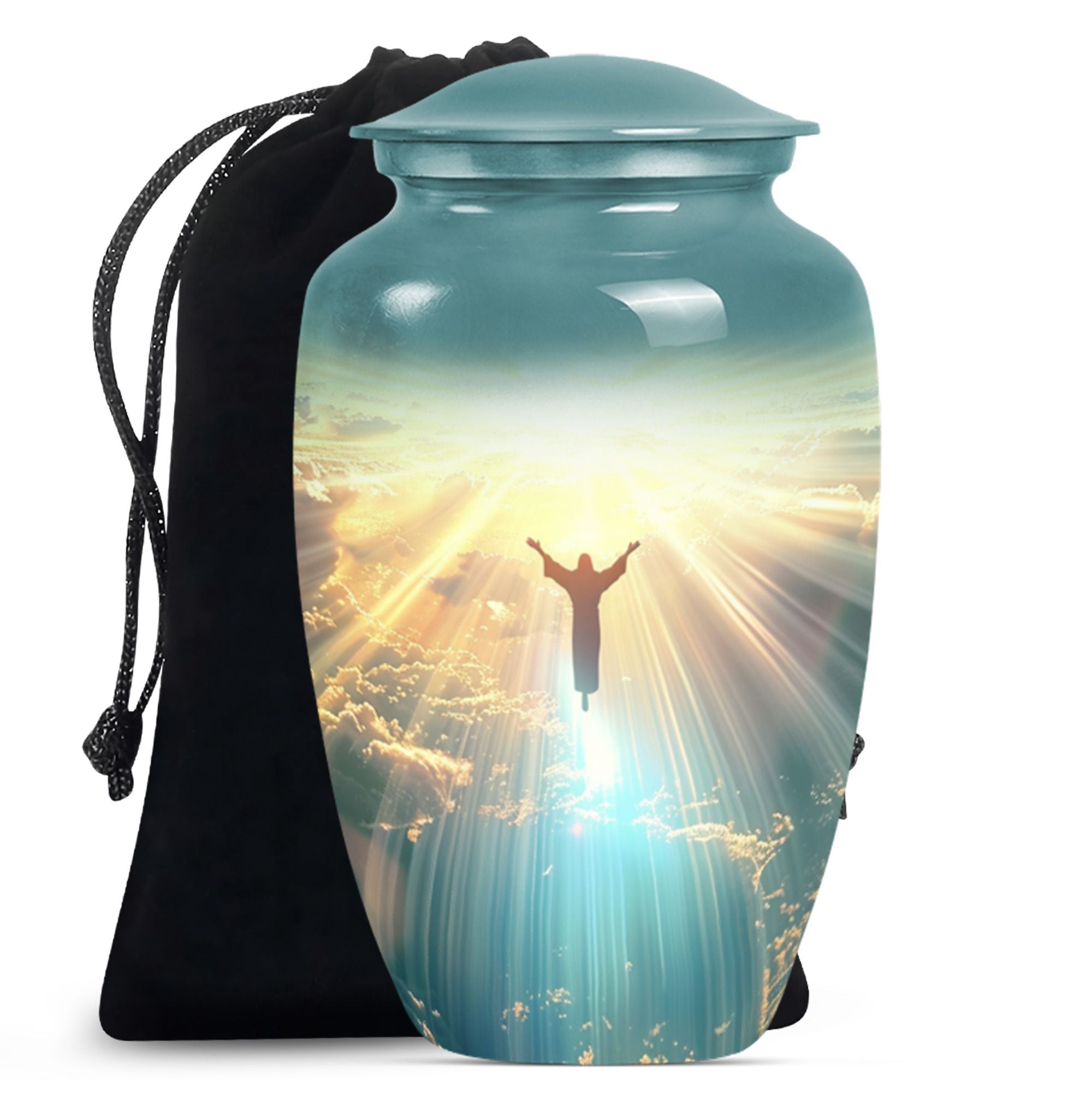 This Jesus Urn, ideal for any burial urns for cremation ashes, pays tribute to your loved one in a significant and respectful manner. It's a 'Large Urn' standing 10 inches high and meticulously crafted from high-grade Aluminium. Its size and weight, 3.3 pounds, enhance its sturdiness and longevity. The 'Classic Urn' design, combined with an unconventional 'Abstract' theme, conveys a sense of soothing reverence at memorial ceremonies. This cremation urn can contain up to 200 cubic inches of ashes, ensuring a fitting resting place. As a thoughtful touch, each urn comes with a velvet pouch to safely contain the ashes. Befitting the thoughtfulness of the urn, you can personalize it with engraved names, making it a heartfelt memento of your cherished ones. With its balance of dignified design and utility, this 'cremation urn for human ashes' presents a worthy epitaph for adult human ashes, making it an invaluable addition to memorial ceremony supplies. Keywords for your convenience: Jesus Urn, burial urns for cremation ashes, Large Urns, cremation urn for human ashes, adult human ashes.