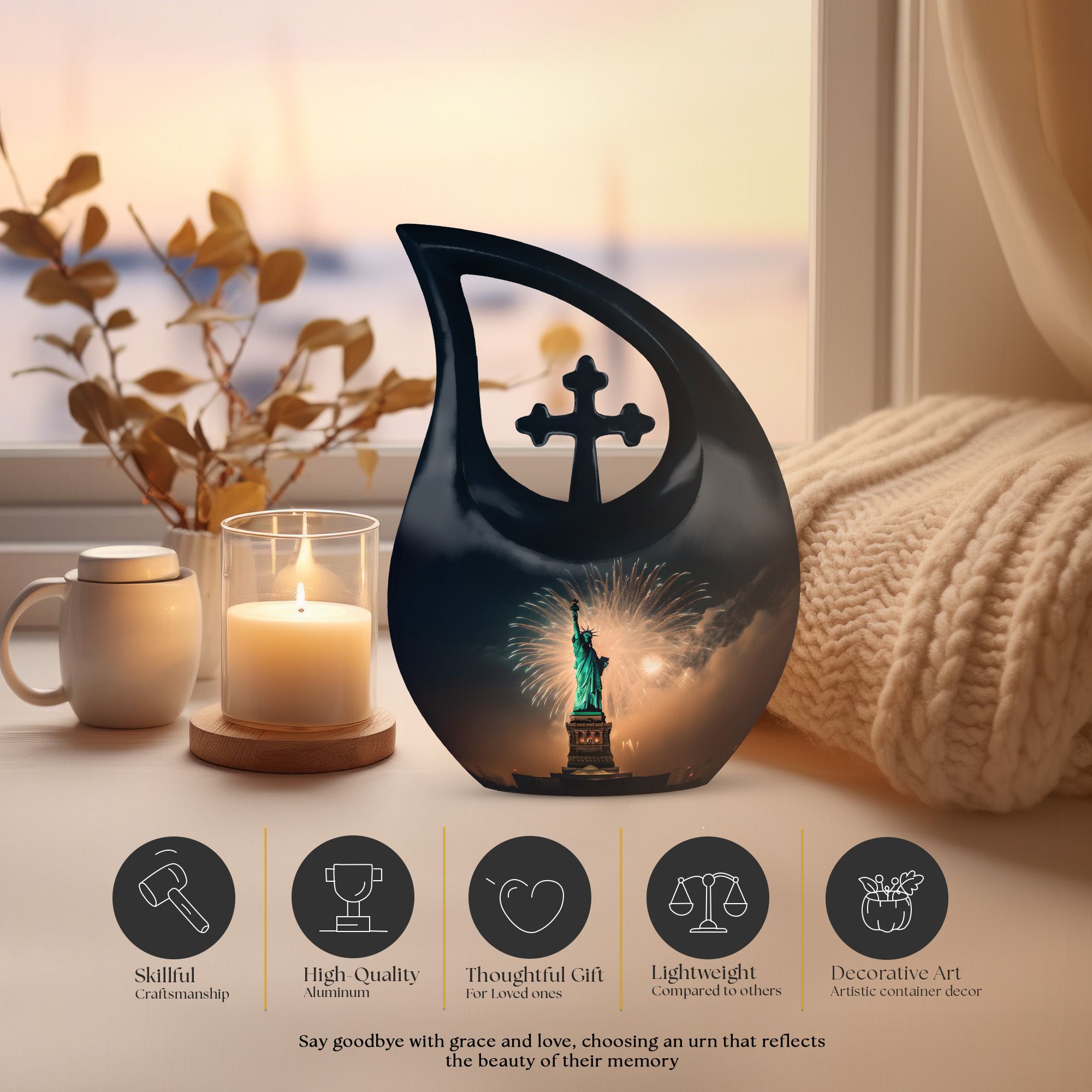Let this large funeral urn serve as a proud and lasting symbol of freedom and love—an enduring reminder that the light of liberty and the memory of your loved one will shine forever.