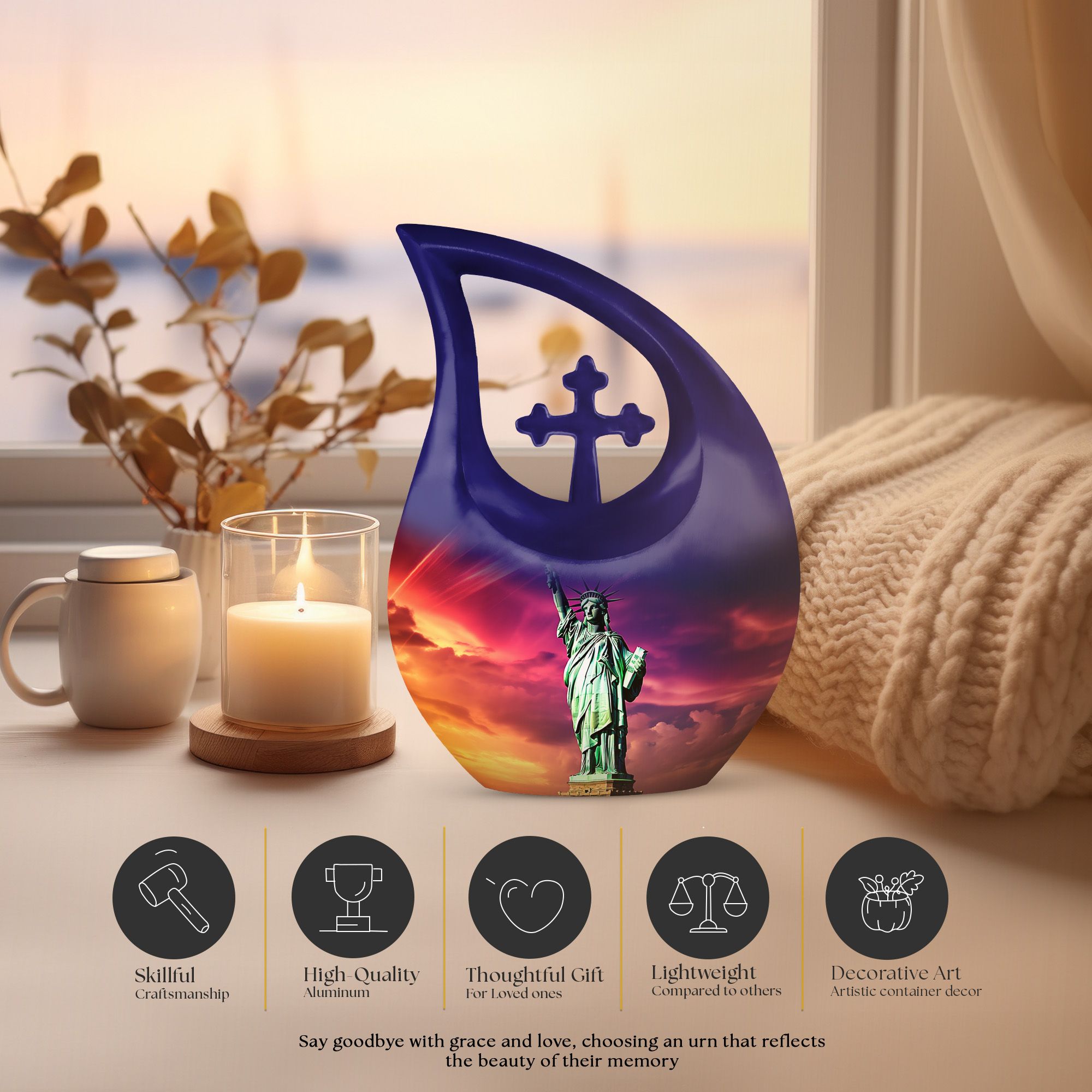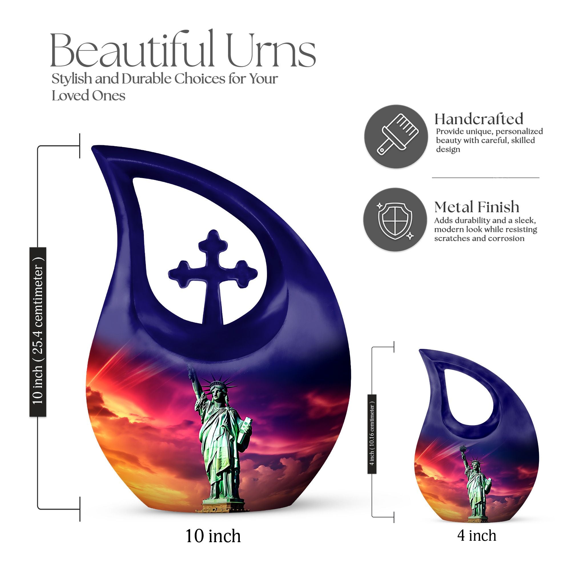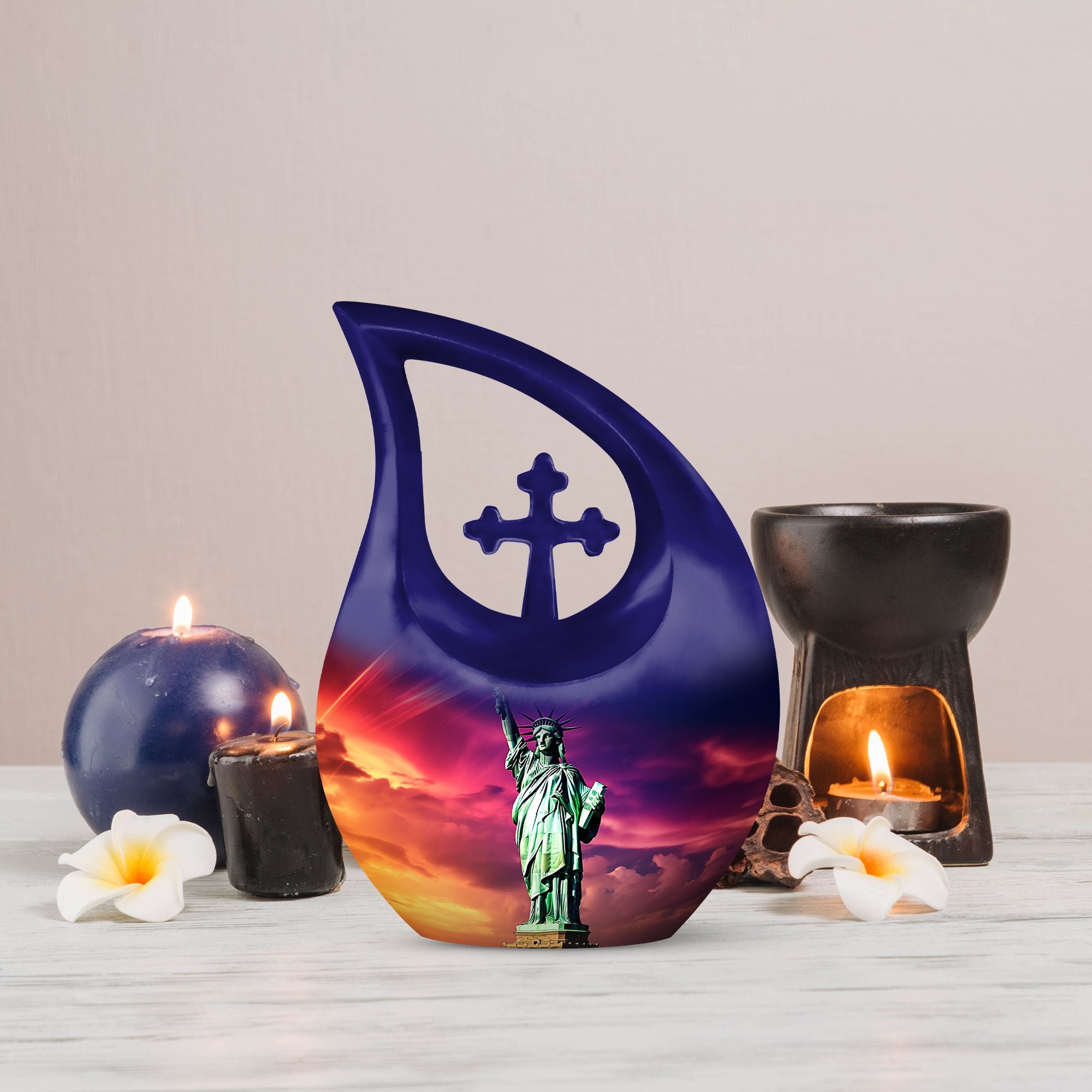 Expertly handcrafted, this urn for human ashes adult female features a striking purple finish adorned with the Statue of Liberty motif — a timeless emblem of hope and independence. Made from high-quality aluminum, this urn is built for longevity, offering both durability and grace. Whether you’re looking for large urns for human ashes adult male or urns for ashes adult male small keepsake, this design balances elegance and function perfectly, ensuring your loved one’s ashes are preserved securely and beautifully.