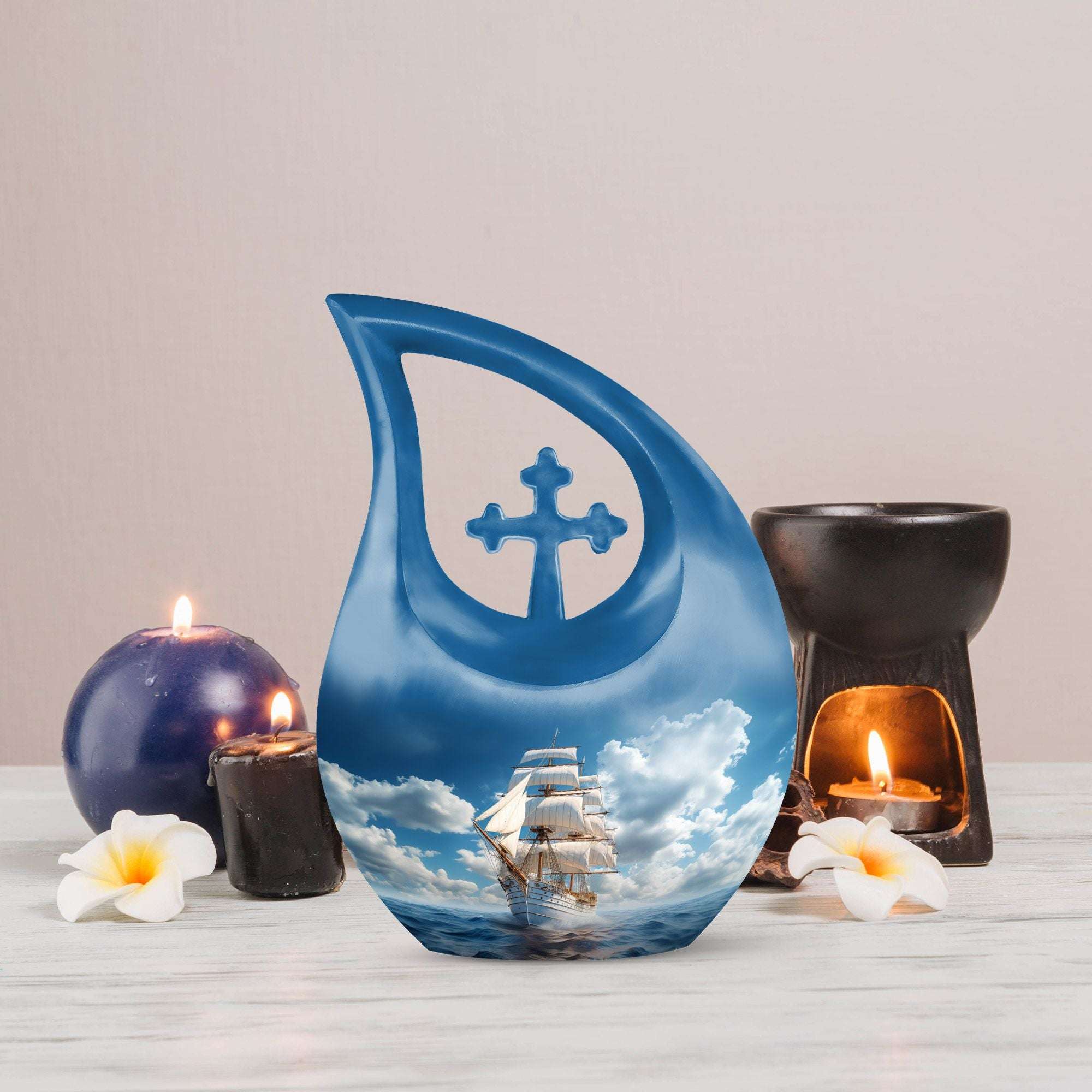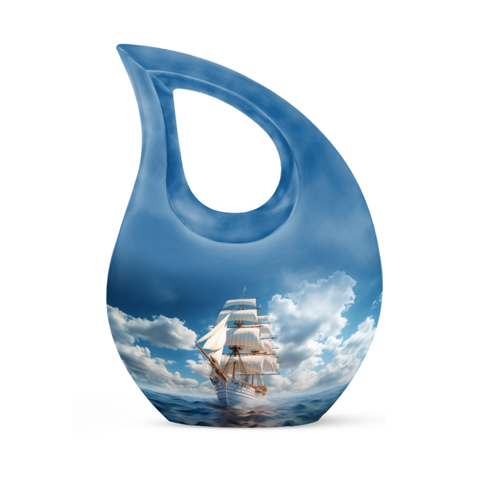 Celebrate a life of calm strength and gentle spirit with our Blue Teardrop Memorial Urn with Sailboat. This elegant urn reflects life’s final journey — a peaceful voyage across tranquil waters. Designed for both men and women, it’s a touching choice among funeral urns men, funeral urns women, or burial urns urn for ashes for women, offering timeless beauty and comfort.
