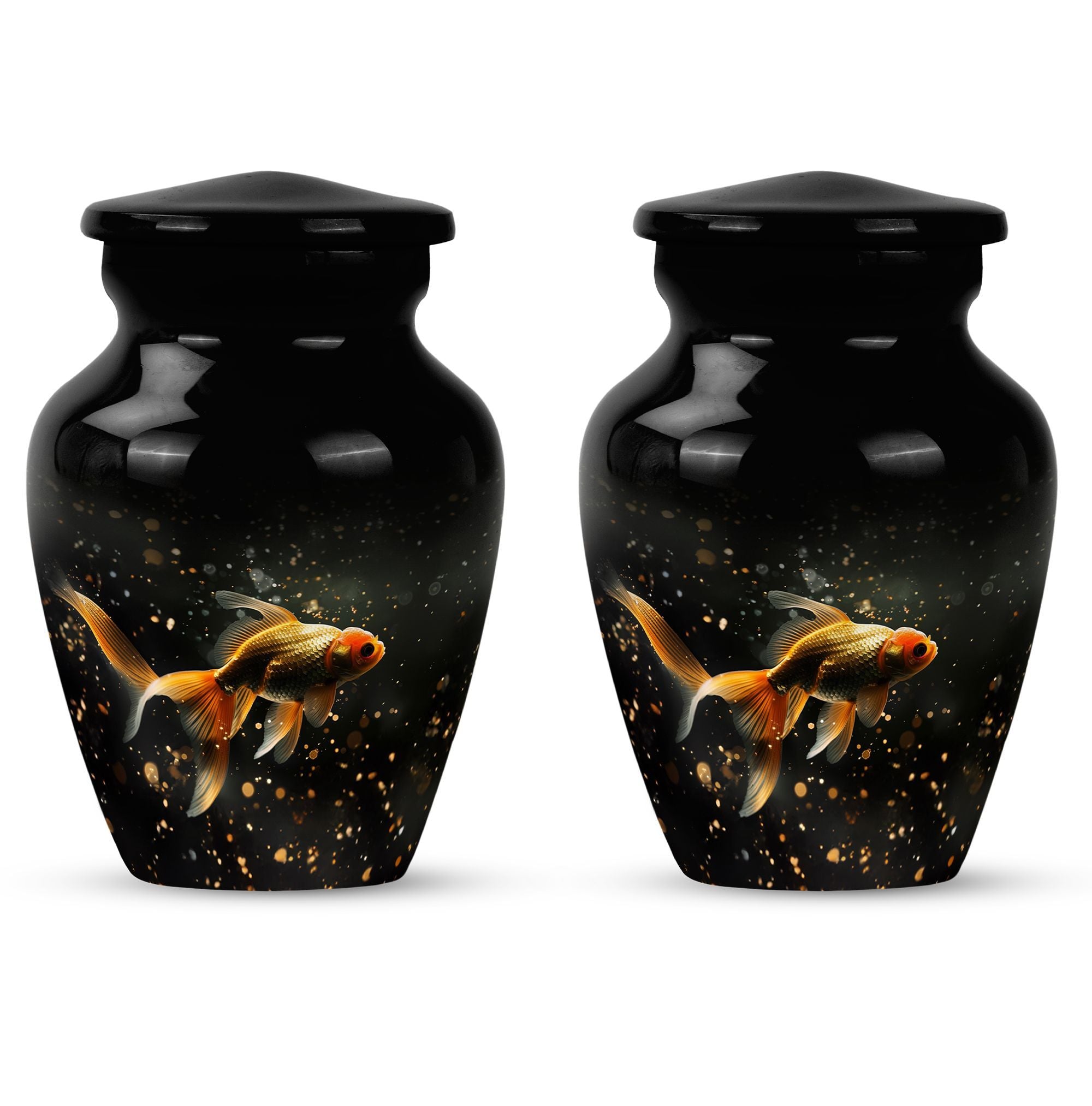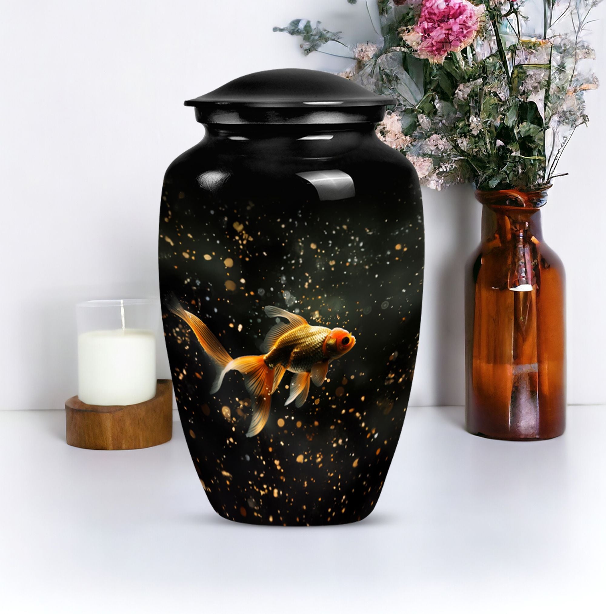 The Gold Fish Urn is more than just a resting place for your loved one’s ashes; it is a beautiful piece of art. It is made from durable aluminium and stands at 10 inches in height. With a weight of just 3.3 pounds, it's sturdy and substantial but not overly heavy. This thoughtful design signifies a fitting tribute wrapped in elegance and sophistication. Encased within this large urn's 200 cubic inch capacity is a soft velvet pouch, providing a dignified containment for your fallen loved one's cremains. The butterfly theme adds a subtle touch of whimsy to the classic urn shape - like a symbol of rebirth and renewal. The urn also offers the options for personal engravings, allowing you to add your loved one's name, thus creating a persona unique to their memory. Ideal for adults, this burial urn for cremation ashes truly serves as a worthy memorial item. The Gold Fish Urn elegantly binds together functionality and aesthetics, ensuring each remembrance is a celebration of life beautifully lived and profoundly missed.