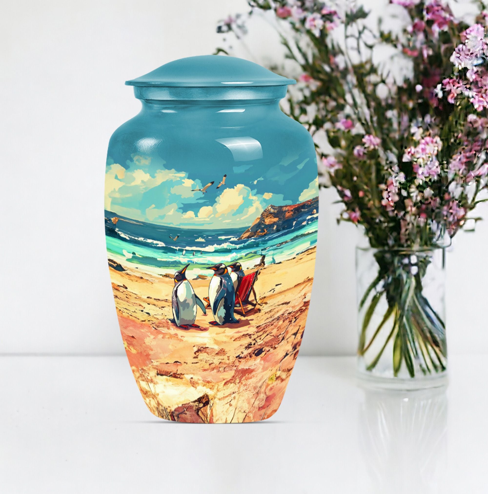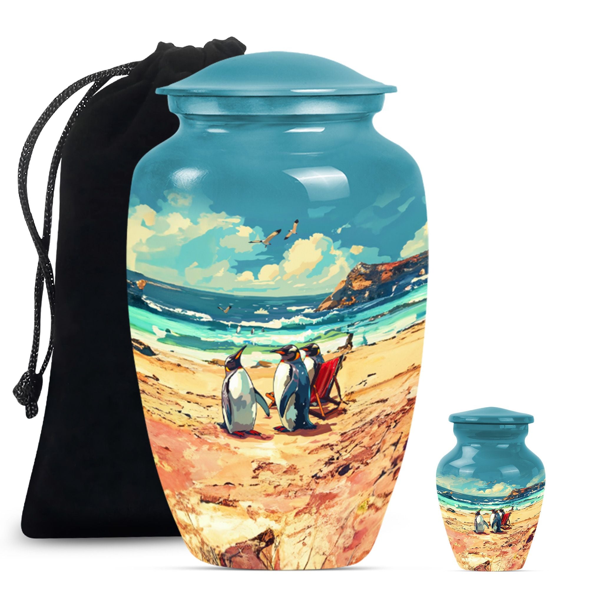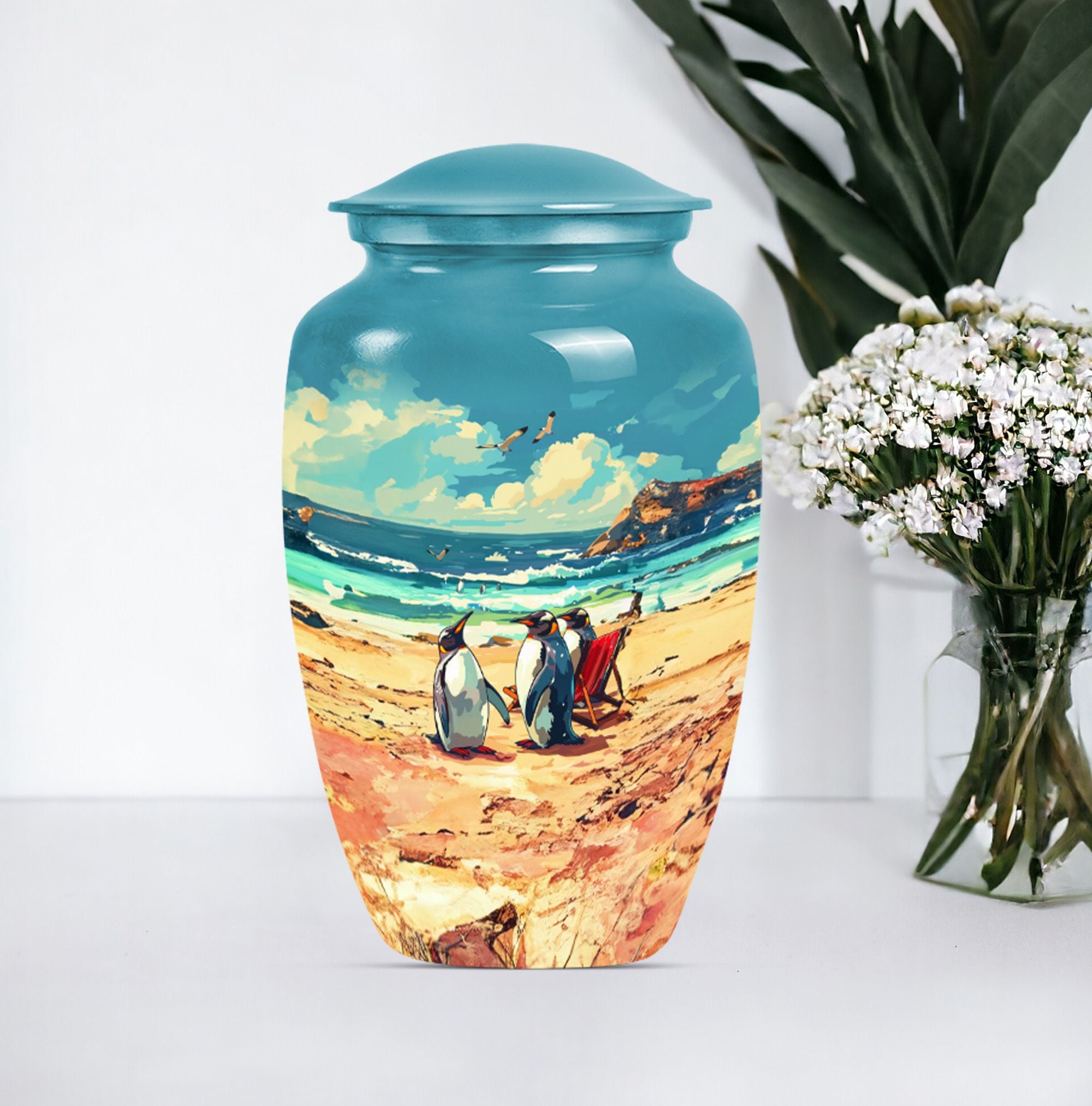 Experience divine serenity with this meticulously crafted Penguin Urn, a cremation dad urn designed with precision and elegance. This 10-inch classic urn, made from premium aluminium, exhibits a resplendent butterfly theme that evokes tranquility and peace. Weighing 3.3 pounds, it's ideally suited to hold up to 200 cubic inches of ashes safely. This large urn comes along with a soft velvet pouch to keep the cherished remnants of your loved ones secure. Enjoy personalizing this cremation urn, making it more meaningful by engraving names on it. When searching for Affordable urns or burial urns for adult men's ashes, our Penguin Urn serves as the ultimate choice. It's not merely a cremation urn; it's a testament to a life well-lived and deeply missed. With its iridescent metal finish, this urn radiates warmth and remembrance. Comforting, durable, and elegant – your perfect memorial ceremony companion.
