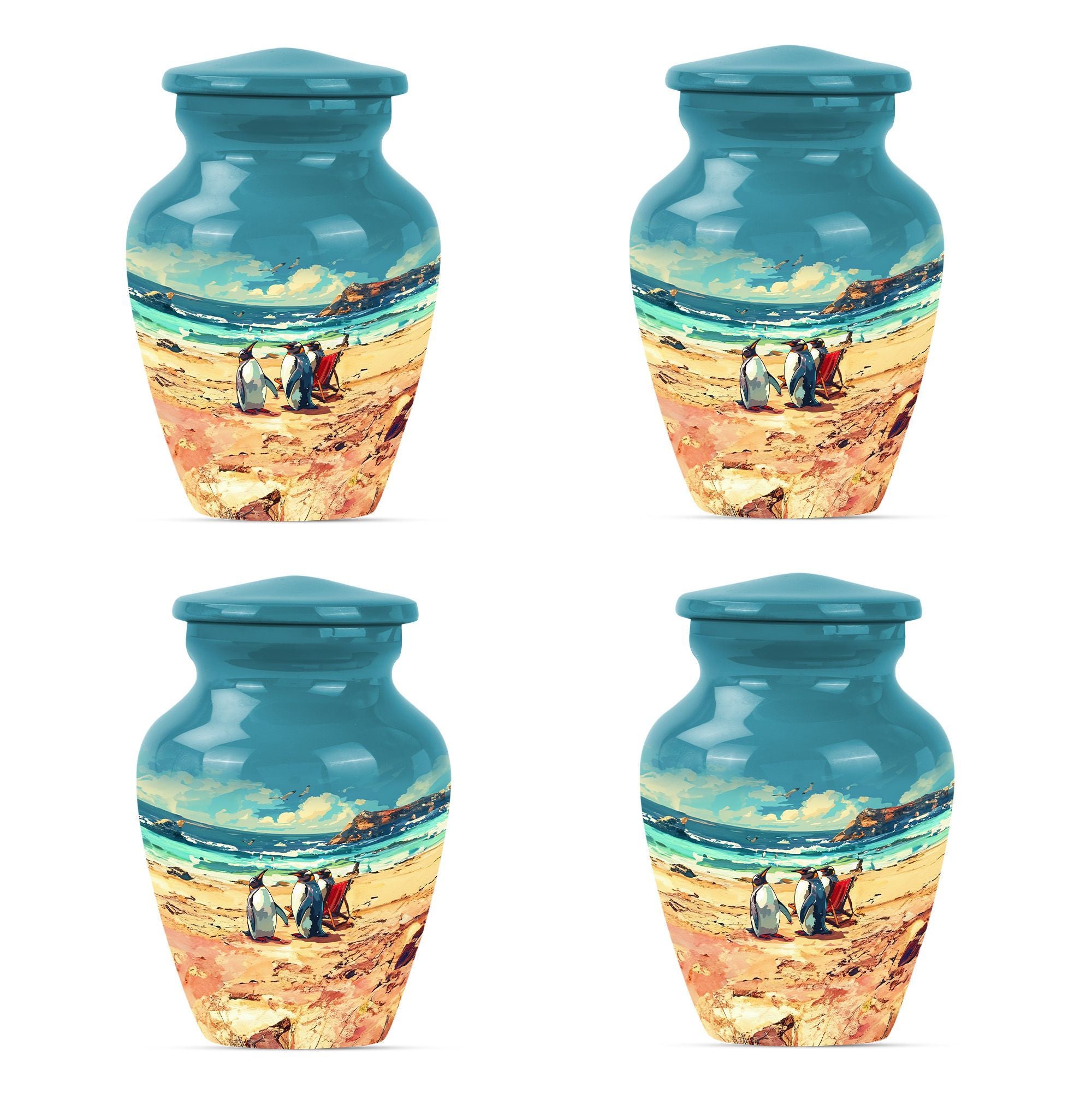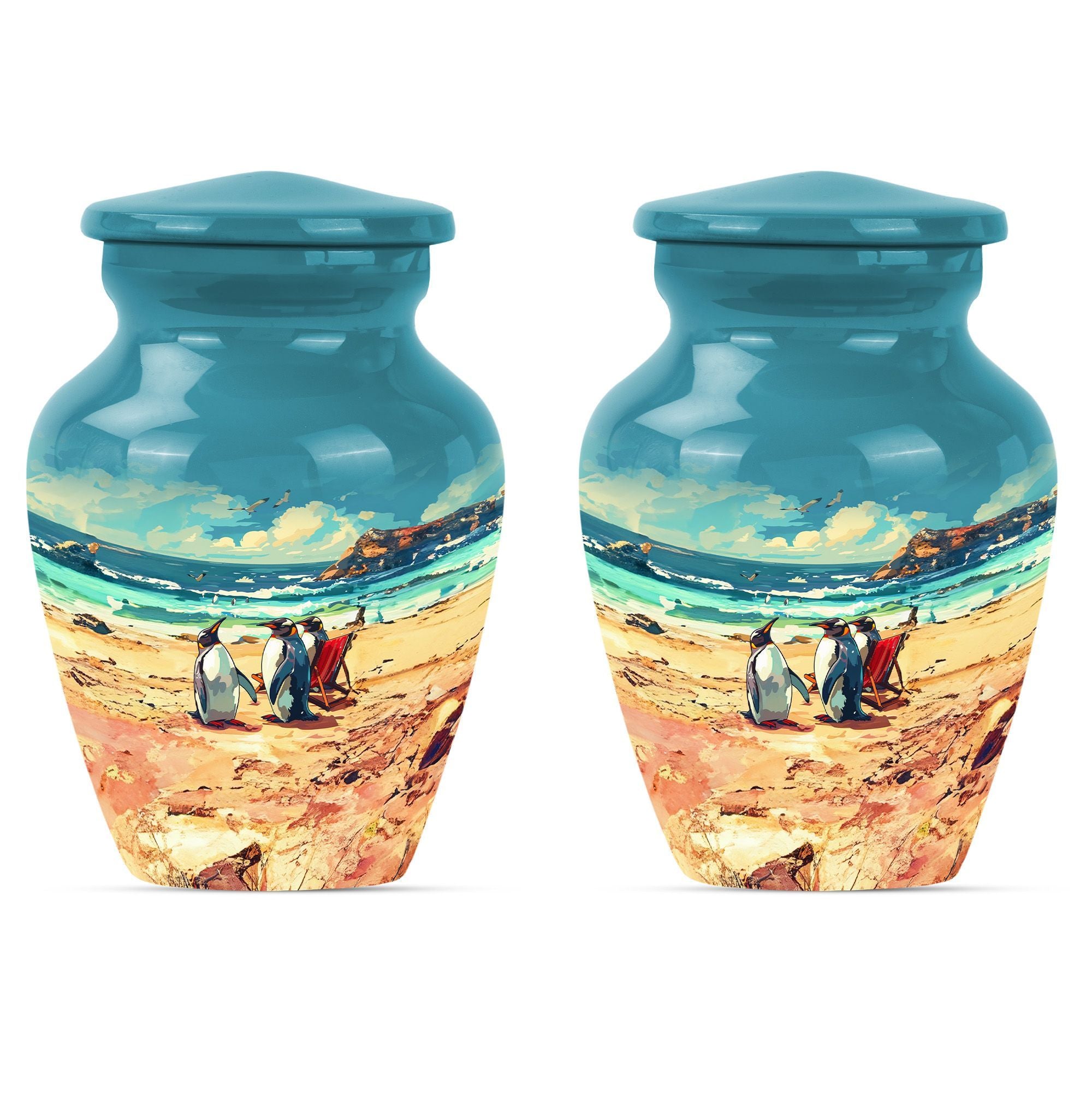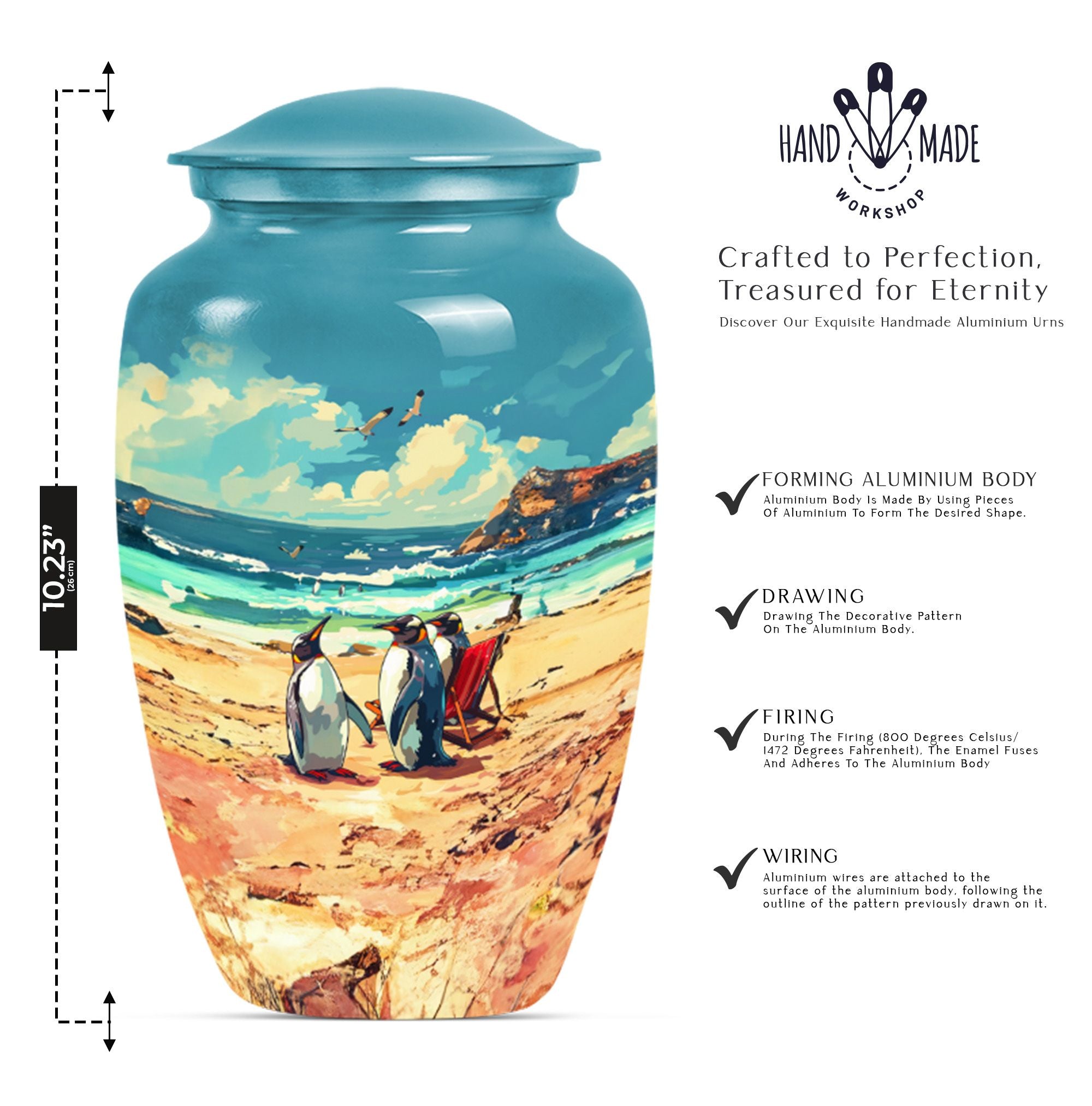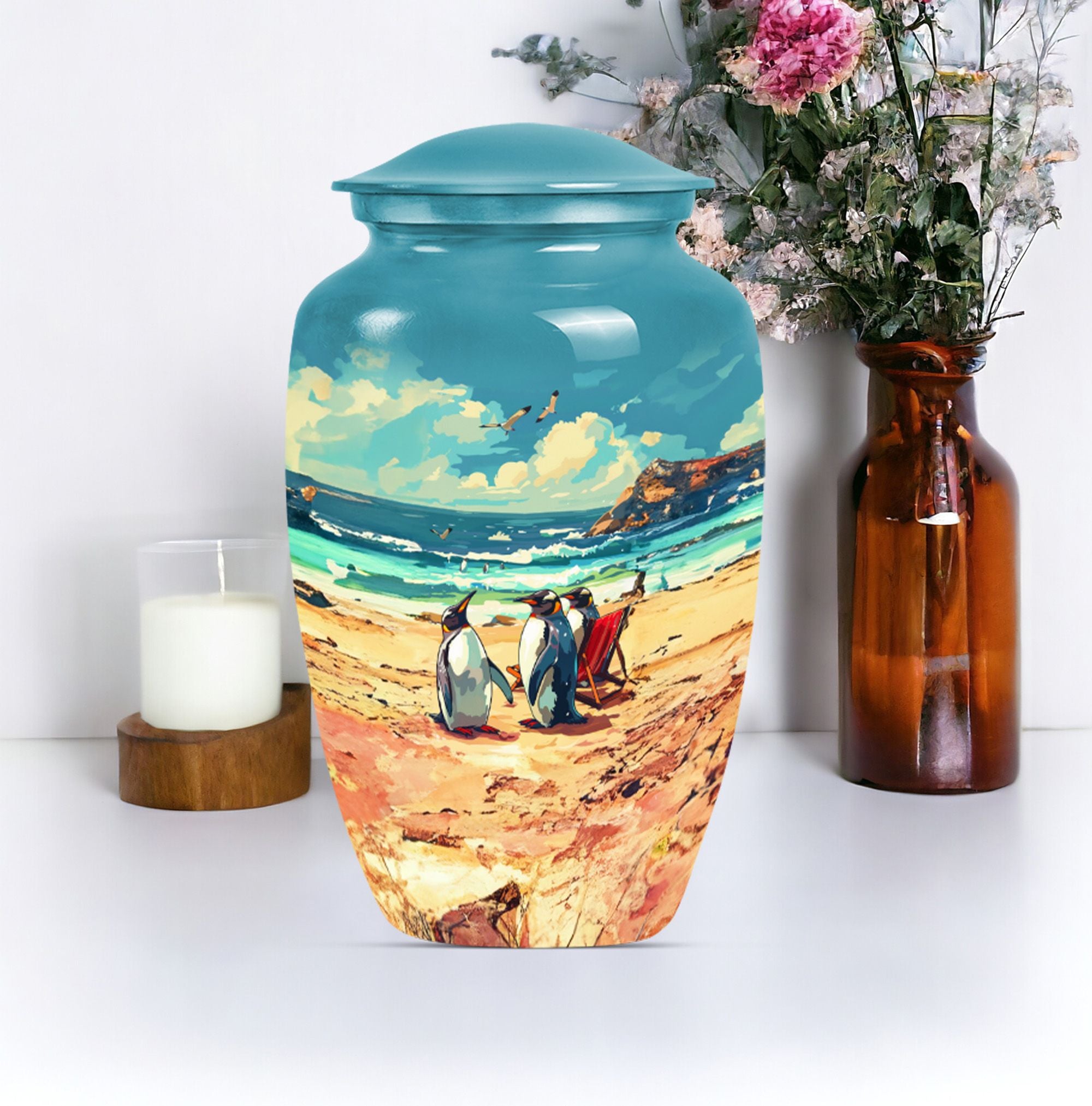 Experience divine serenity with this meticulously crafted Penguin Urn, a cremation dad urn designed with precision and elegance. This 10-inch classic urn, made from premium aluminium, exhibits a resplendent butterfly theme that evokes tranquility and peace. Weighing 3.3 pounds, it's ideally suited to hold up to 200 cubic inches of ashes safely. This large urn comes along with a soft velvet pouch to keep the cherished remnants of your loved ones secure. Enjoy personalizing this cremation urn, making it more meaningful by engraving names on it. When searching for Affordable urns or burial urns for adult men's ashes, our Penguin Urn serves as the ultimate choice. It's not merely a cremation urn; it's a testament to a life well-lived and deeply missed. With its iridescent metal finish, this urn radiates warmth and remembrance. Comforting, durable, and elegant – your perfect memorial ceremony companion.