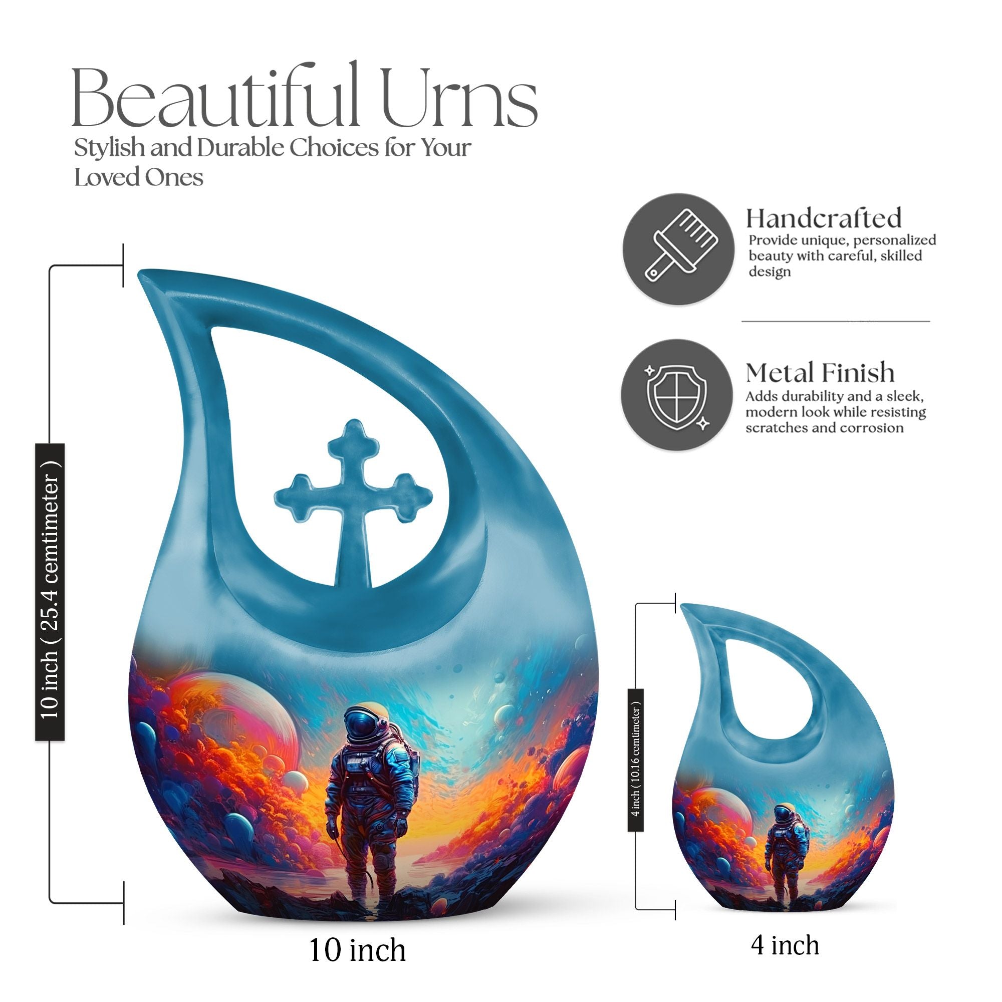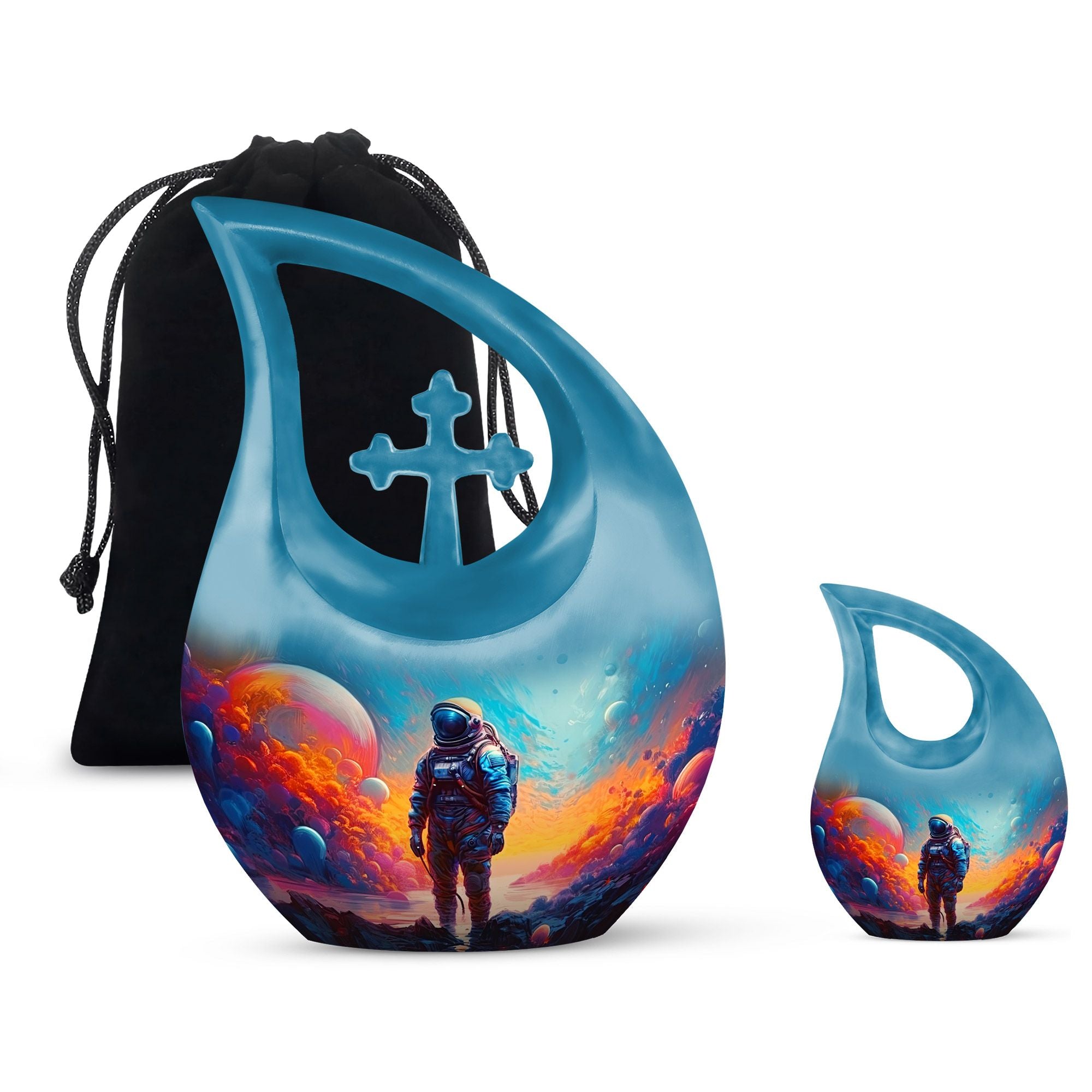 Expertly handcrafted from high-quality aluminum, this adult cremation urn features a dazzling galaxy-inspired pattern with a serene astronaut motif — a design that embodies peace, wonder, and eternity. Whether used as a cremation urn for adult or part of a cremation urns for human ashes adult set, it combines durability and elegance, making it an ideal memorial for both men and women. Families may also pair this with small cremation urns for human ashes adult or cremation ashes keepsake options for shared remembrance.