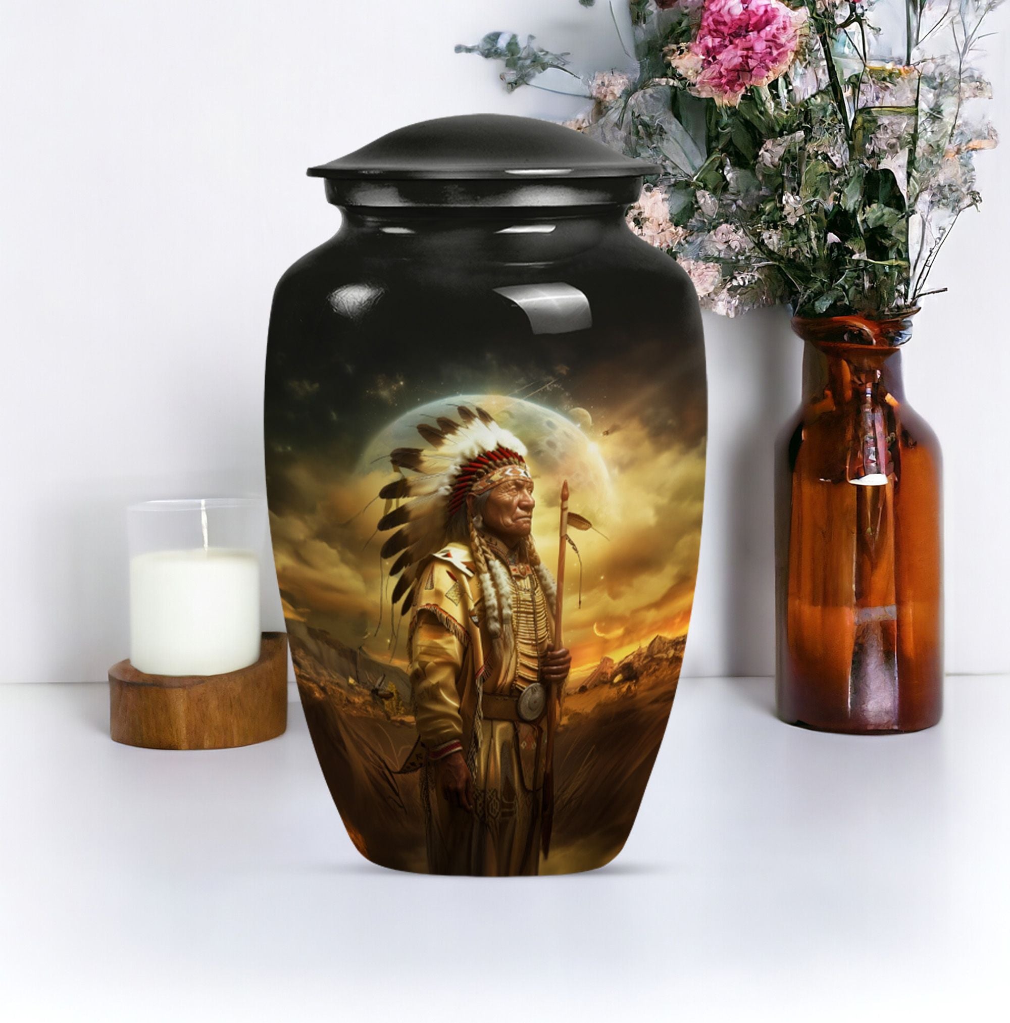Introducing our Large Aluminium Native American Urn, a timeless tribute to commemorate your loved ones. This cremation urn caters perfectly to the adult male segment. At 10 inches tall and weighing 3.3 pounds, our memorial urn exudes a solemn charm. Large yet manageable, it holds an impressive 200 cubic inches, ensuring ample space for honoring the departed. The package comes complete with a velvet pouch for safe containment of the ashes. Considering everyone's unique journey, we offer customization options like engraved names, making the urn all the more personal. This artefact stands out with an abstract theme that respects both men and women ashes alike. Whether you're looking for funeral metal urns or burial urns for in-ground interment, our urn serves the purpose. Offering you not just an object, but a testament of remembrance that withstands the test of time.