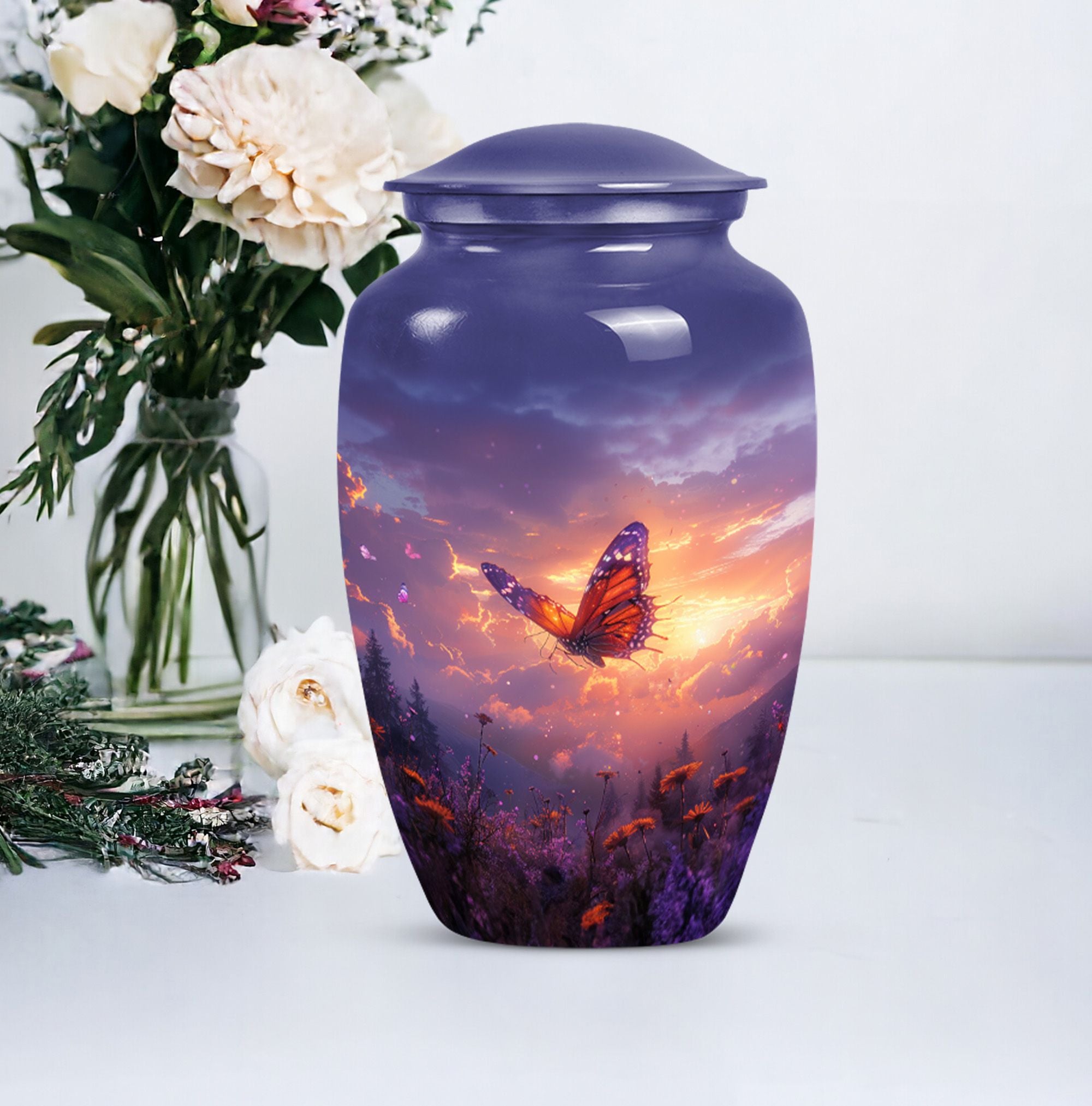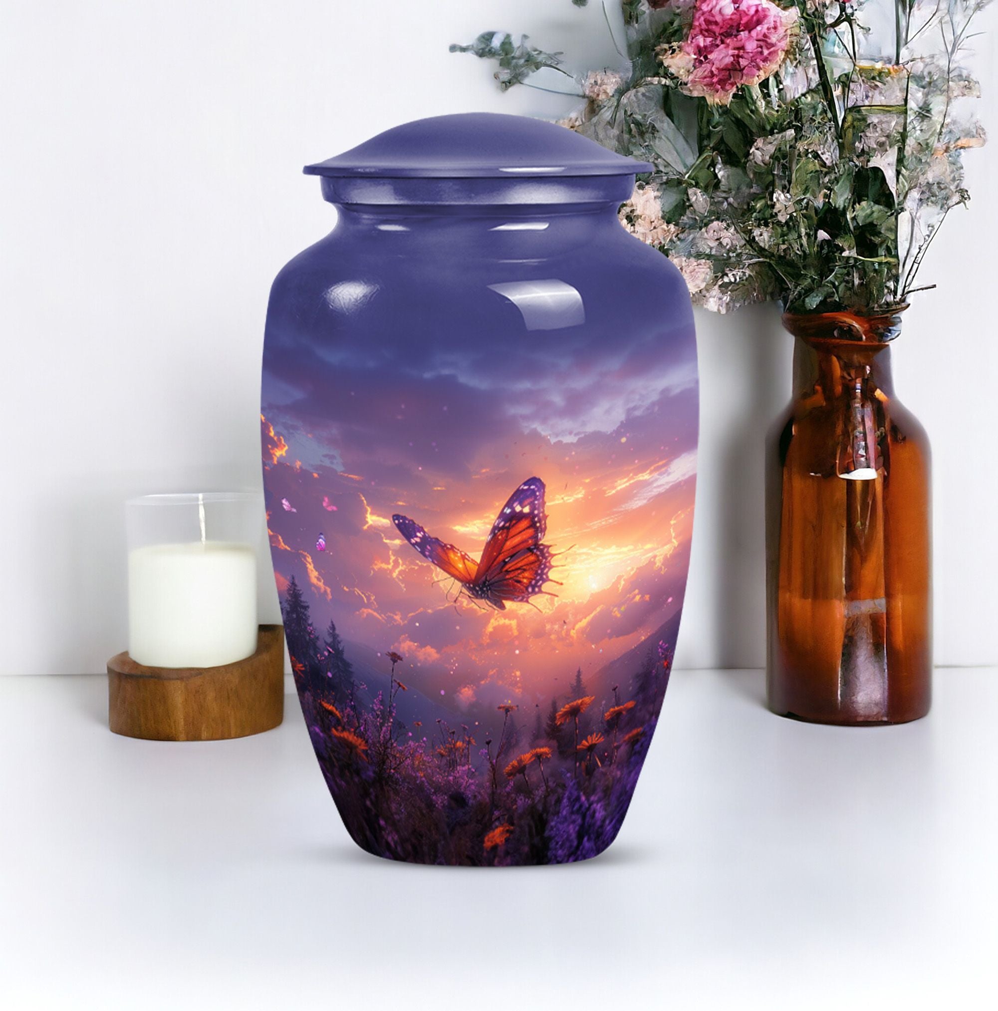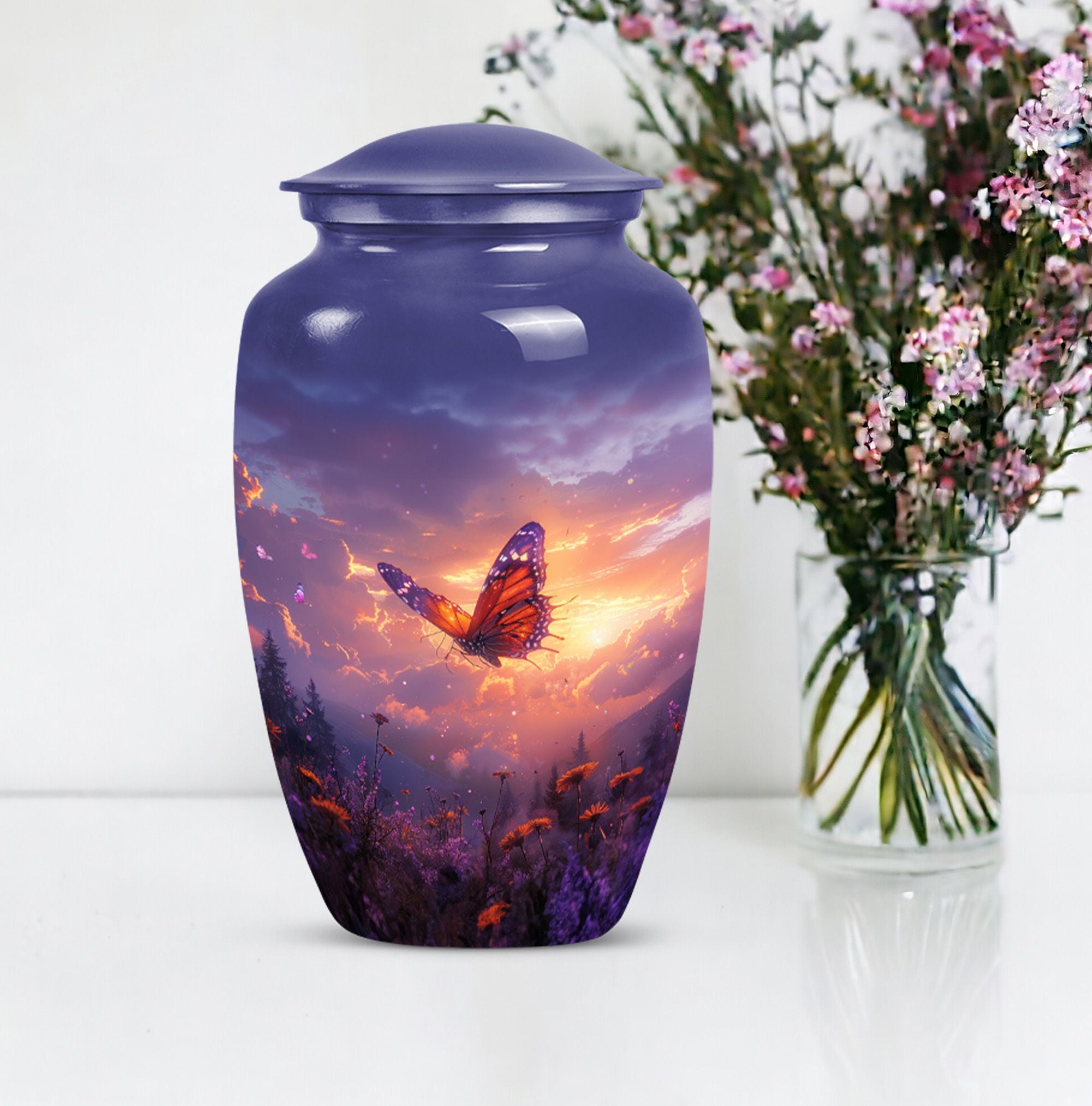 Embrace the ethereal beauty and tranquility of the 'Purple Meadow Urn', a striking Large Urn designed to honor and remember your beloved. With a capacity of a substantial 200 cubic inches, this aluminium-crafted funeral urn for adult is befitting for a memorable tribute. The 'Purple Meadow Urn' is substantial, with a weight of 3.3 pounds and dimensions of 10 inches in height, ensuring a stately presence. Our cremation urn offers the personalized touch of engraved names, adding an intimate detail that sings of your affection. The urn comes with a velvet pouch to safely contain the ashes, symbolizing our belief that your loved one should rest with elegance and care. With this large urn, remember your mom or dad in a dignified and beautiful way. For those seeking urns for cremation ashes, the 'Purple Meadow Urn' encapsulates the connection between the earthly and the divine.