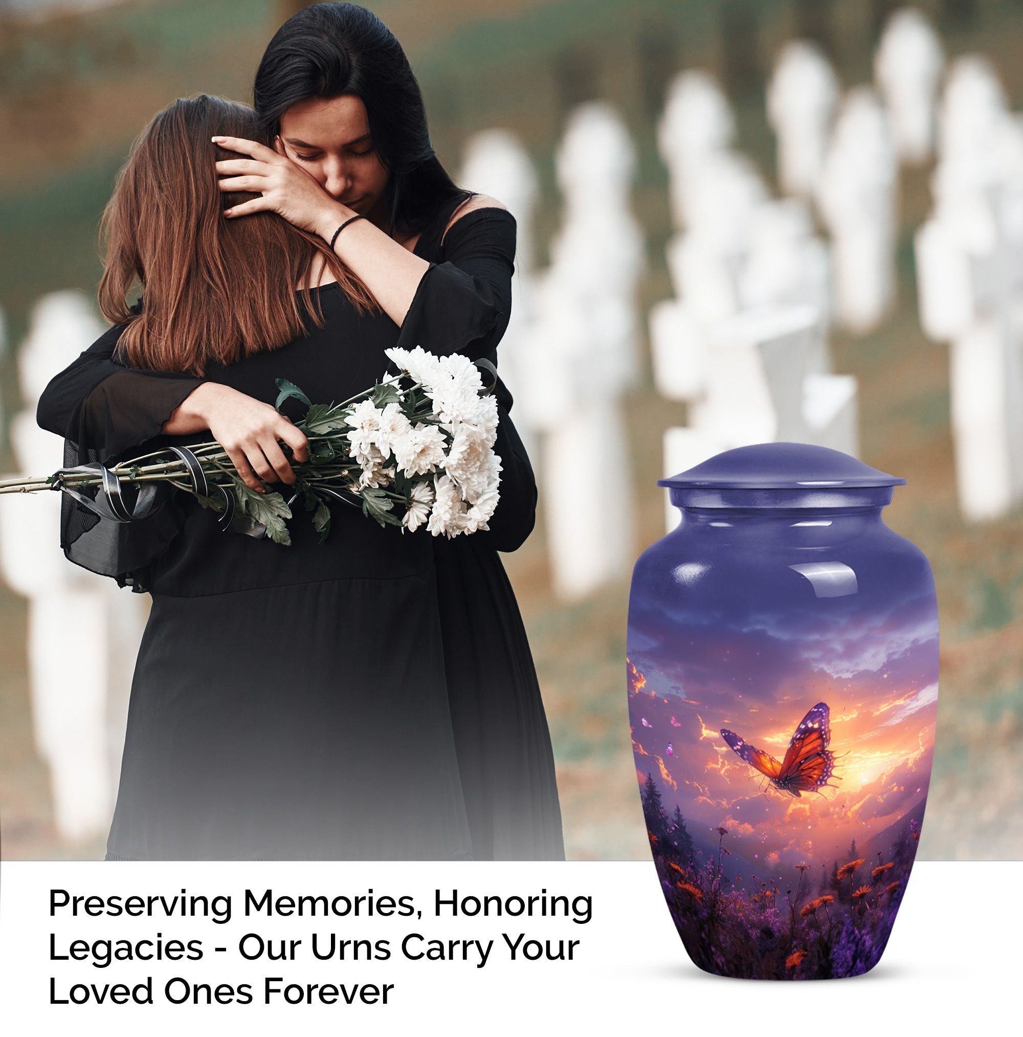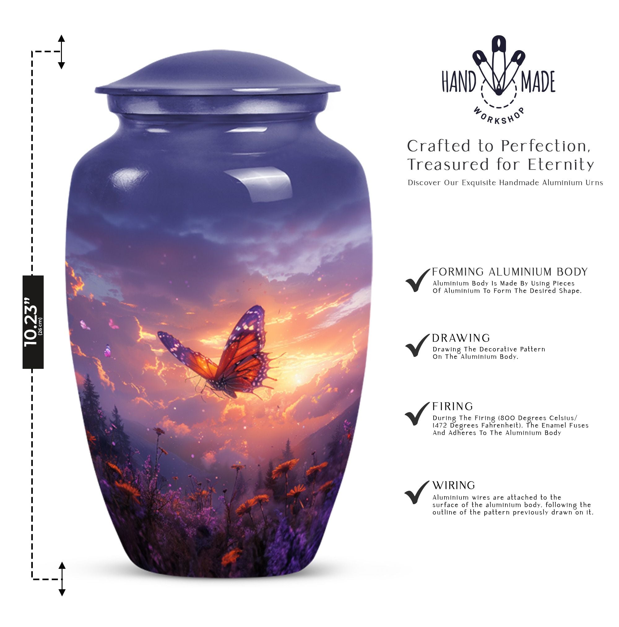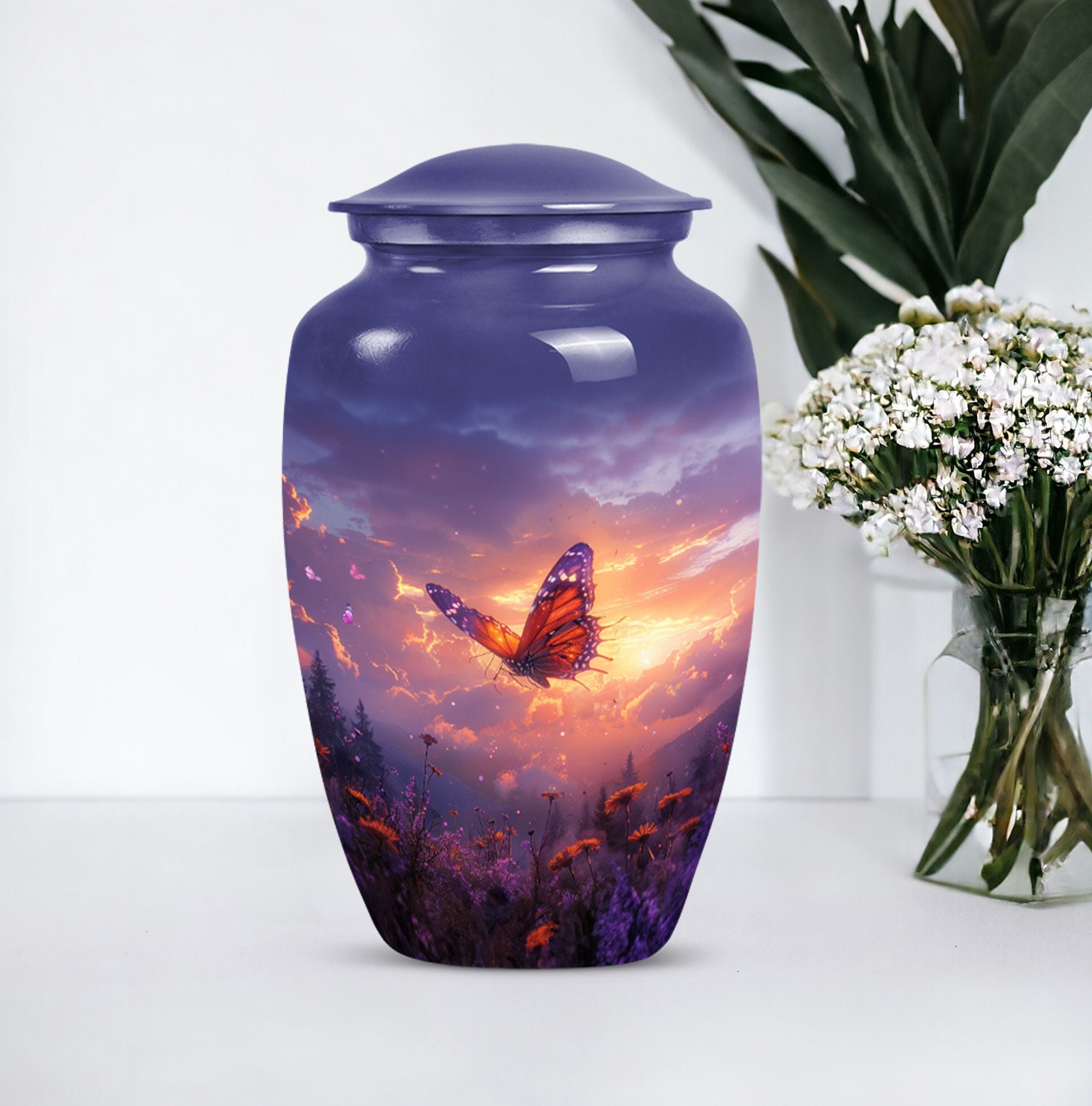 Embrace the ethereal beauty and tranquility of the 'Purple Meadow Urn', a striking Large Urn designed to honor and remember your beloved. With a capacity of a substantial 200 cubic inches, this aluminium-crafted funeral urn for adult is befitting for a memorable tribute. The 'Purple Meadow Urn' is substantial, with a weight of 3.3 pounds and dimensions of 10 inches in height, ensuring a stately presence. Our cremation urn offers the personalized touch of engraved names, adding an intimate detail that sings of your affection. The urn comes with a velvet pouch to safely contain the ashes, symbolizing our belief that your loved one should rest with elegance and care. With this large urn, remember your mom or dad in a dignified and beautiful way. For those seeking urns for cremation ashes, the 'Purple Meadow Urn' encapsulates the connection between the earthly and the divine.