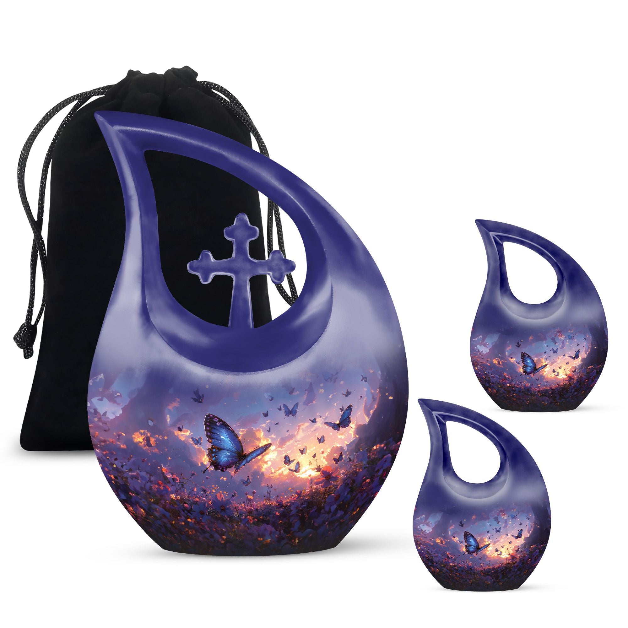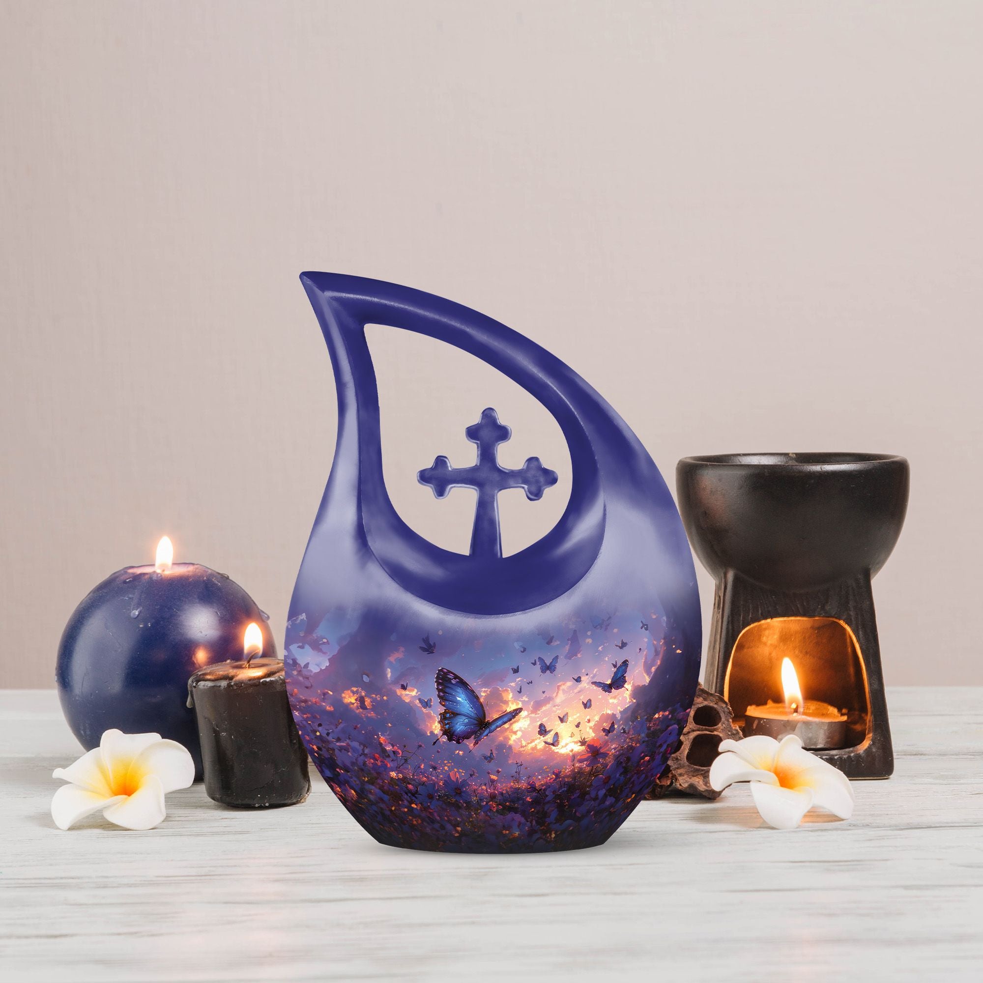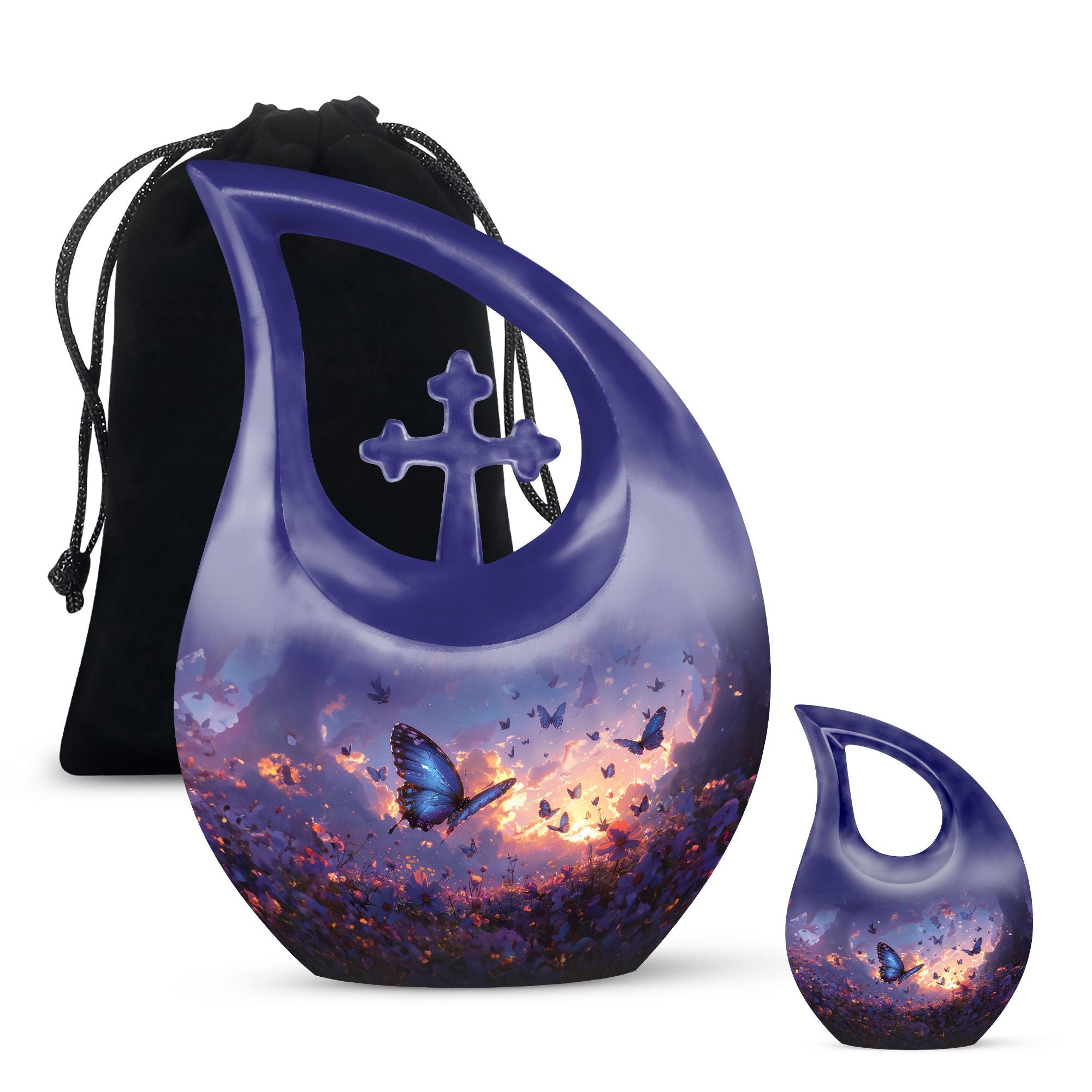 Introducing our Purple Meadow Urn - a sentimental keepsake piece representing tranquility and peace. This large urn stands tall at 10 inches, making it an exquisite symbol of remembrance. It's crafted from sturdy aluminium, ensuring durability while adding a touch of elegance. Its unique 'Cross Drop'' theme evokes a feeling of serenity, further enhanced by its vibrant purple meadow theme. We offer an added touch of personalization with our engraving service for names, making this not just an urn, but a deeply personal tribute. Each urn weighs approximately 3.3 pounds and, is designed to hold 200 cubic inches of ashes. This urn comes with a velvet pouch, providing a respectful containment for the ashes of your loved one. Ideal for memorial urns, cremation urn vault, or unique cremation keepsakes. Buy your urn for ashes from us and experience the special way we treat memories.