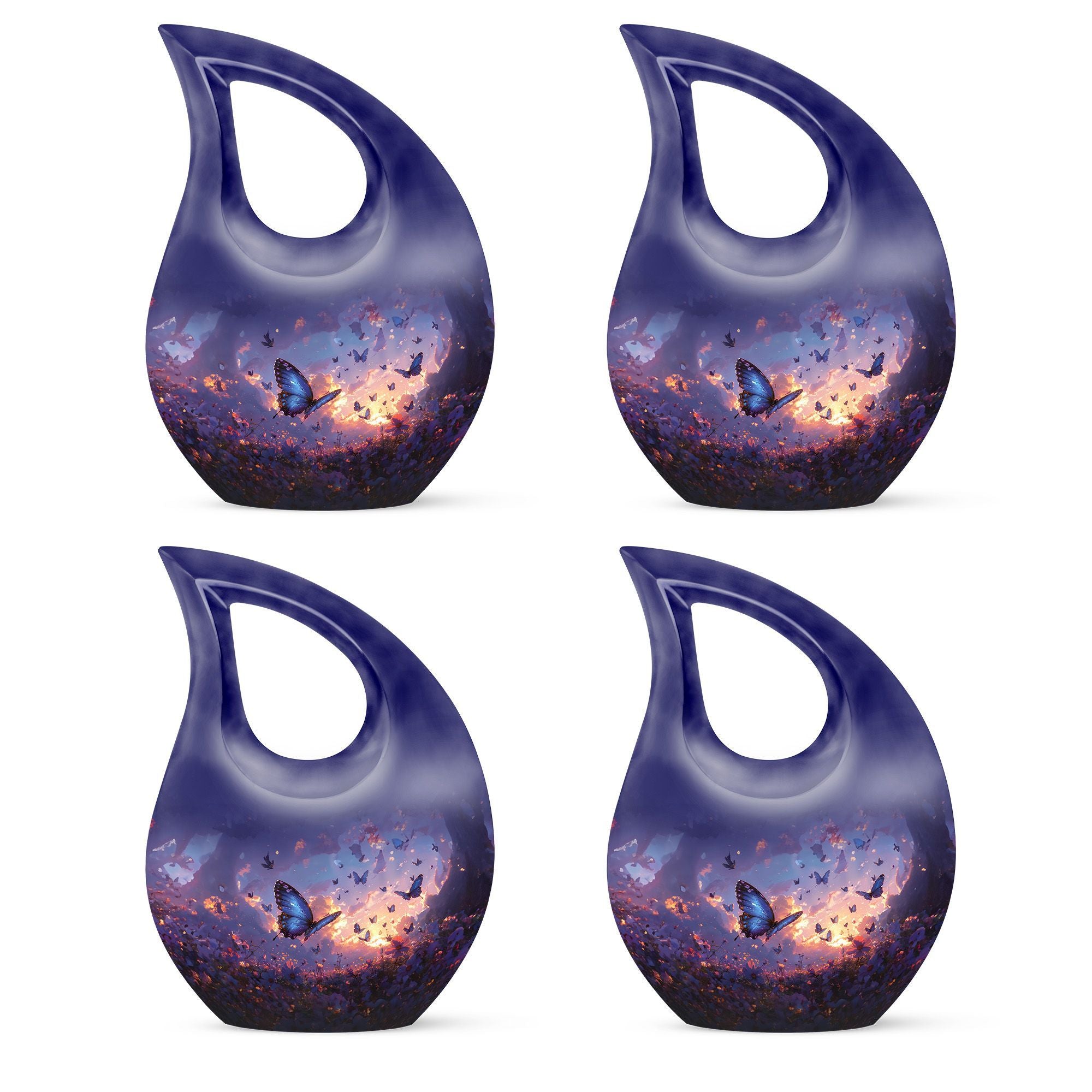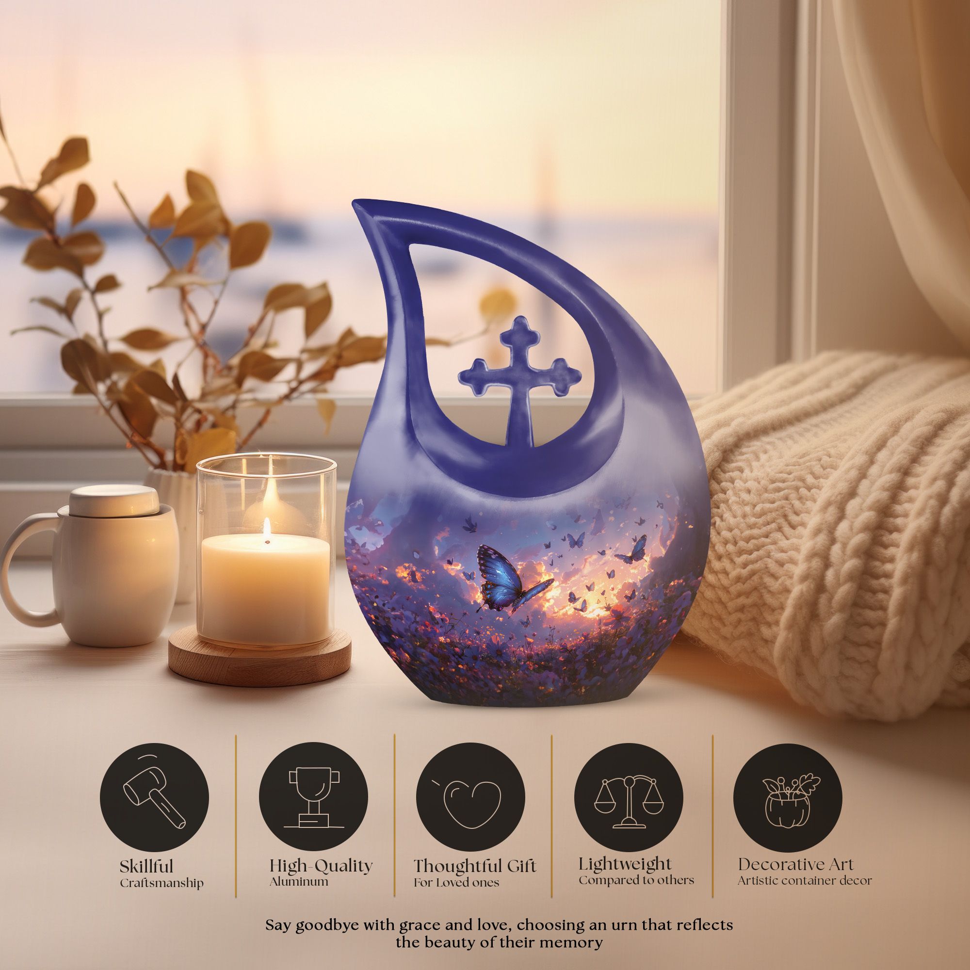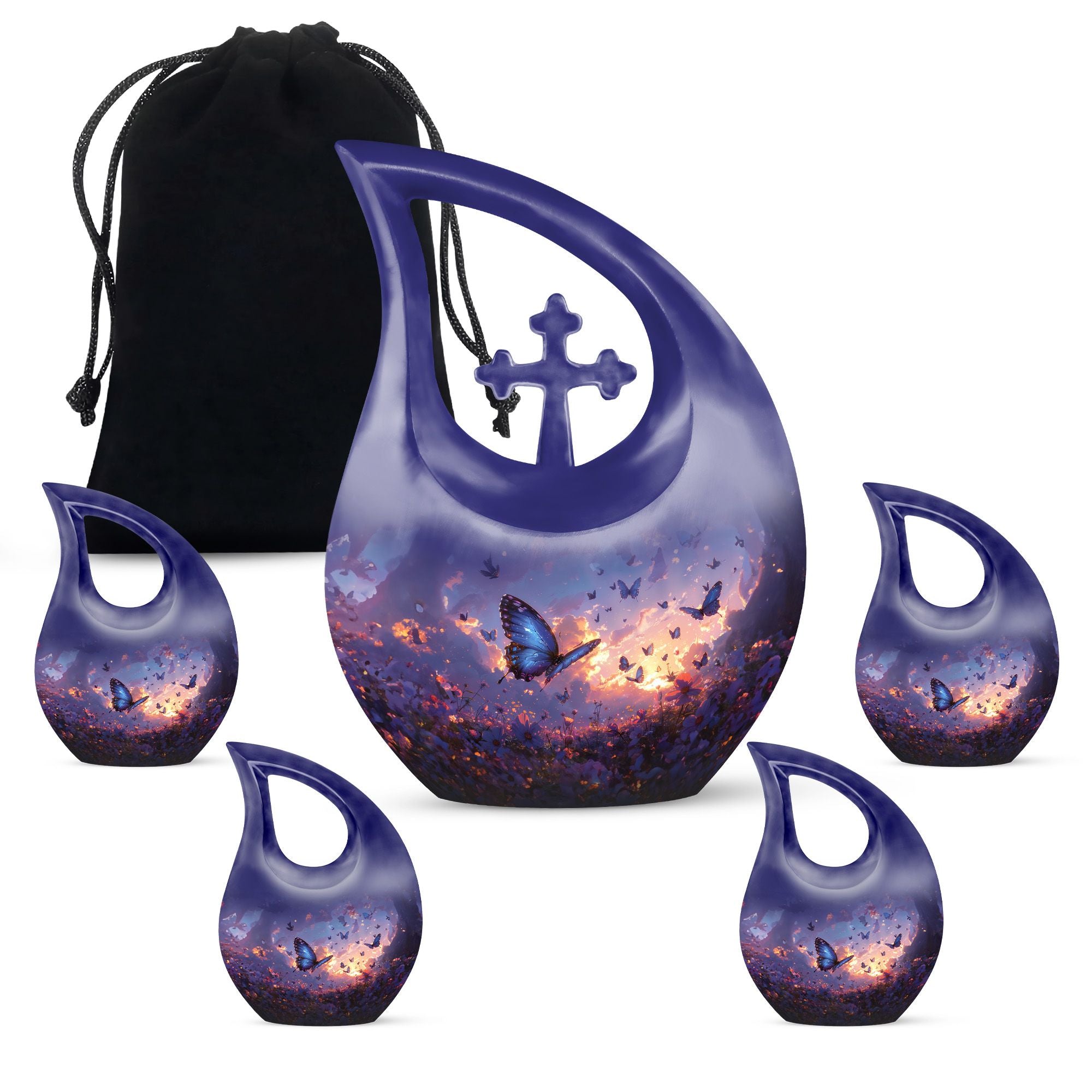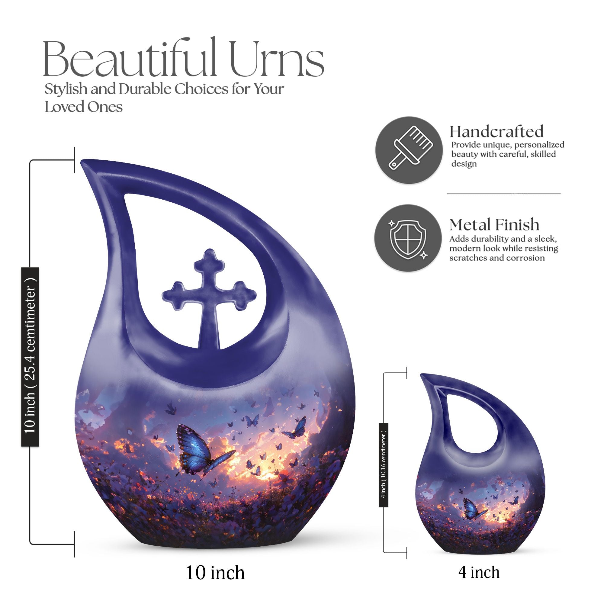 Introducing our Purple Meadow Urn - a sentimental keepsake piece representing tranquility and peace. This large urn stands tall at 10 inches, making it an exquisite symbol of remembrance. It's crafted from sturdy aluminium, ensuring durability while adding a touch of elegance. Its unique 'Cross Drop'' theme evokes a feeling of serenity, further enhanced by its vibrant purple meadow theme. We offer an added touch of personalization with our engraving service for names, making this not just an urn, but a deeply personal tribute. Each urn weighs approximately 3.3 pounds and, is designed to hold 200 cubic inches of ashes. This urn comes with a velvet pouch, providing a respectful containment for the ashes of your loved one. Ideal for memorial urns, cremation urn vault, or unique cremation keepsakes. Buy your urn for ashes from us and experience the special way we treat memories.
