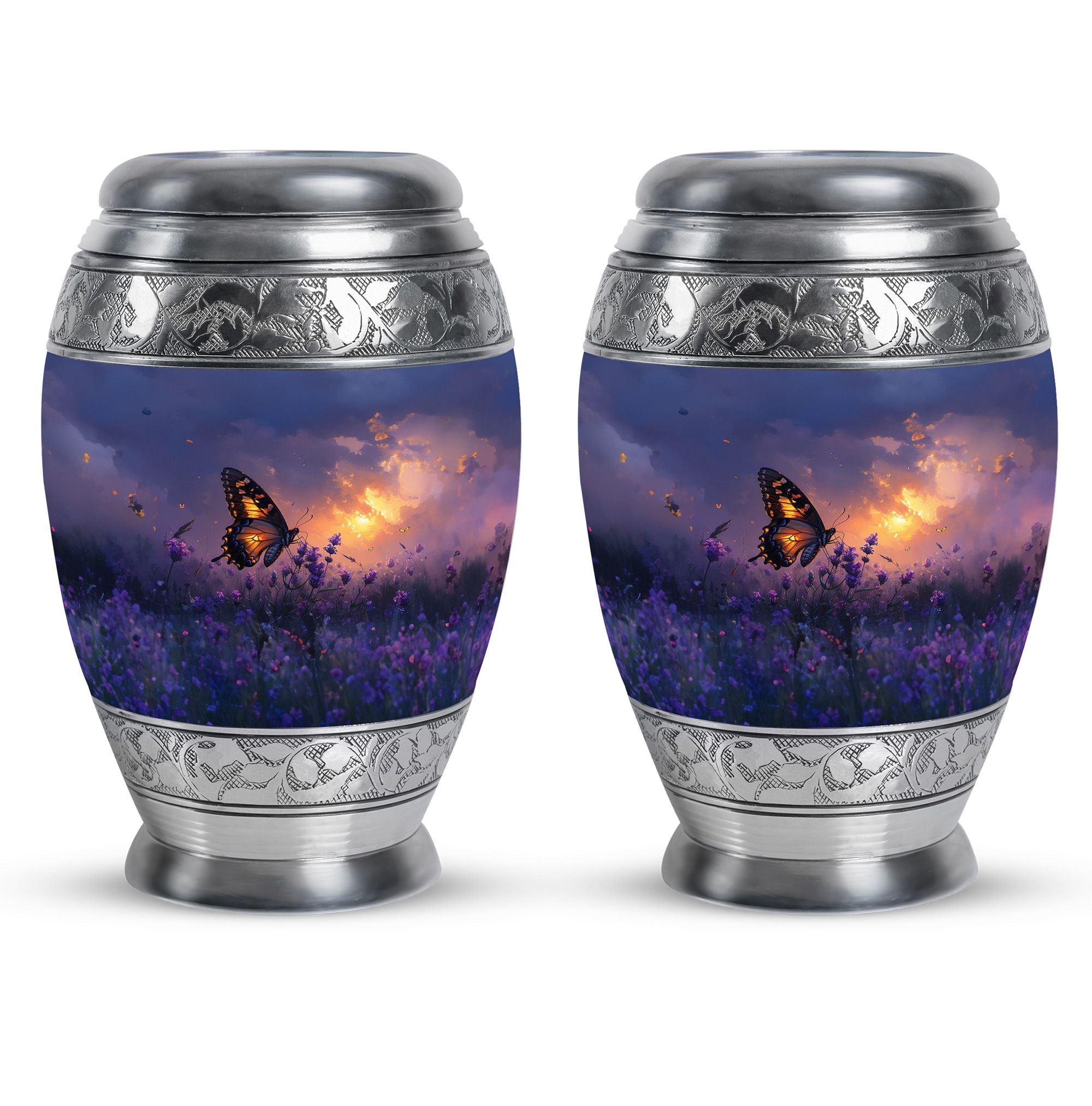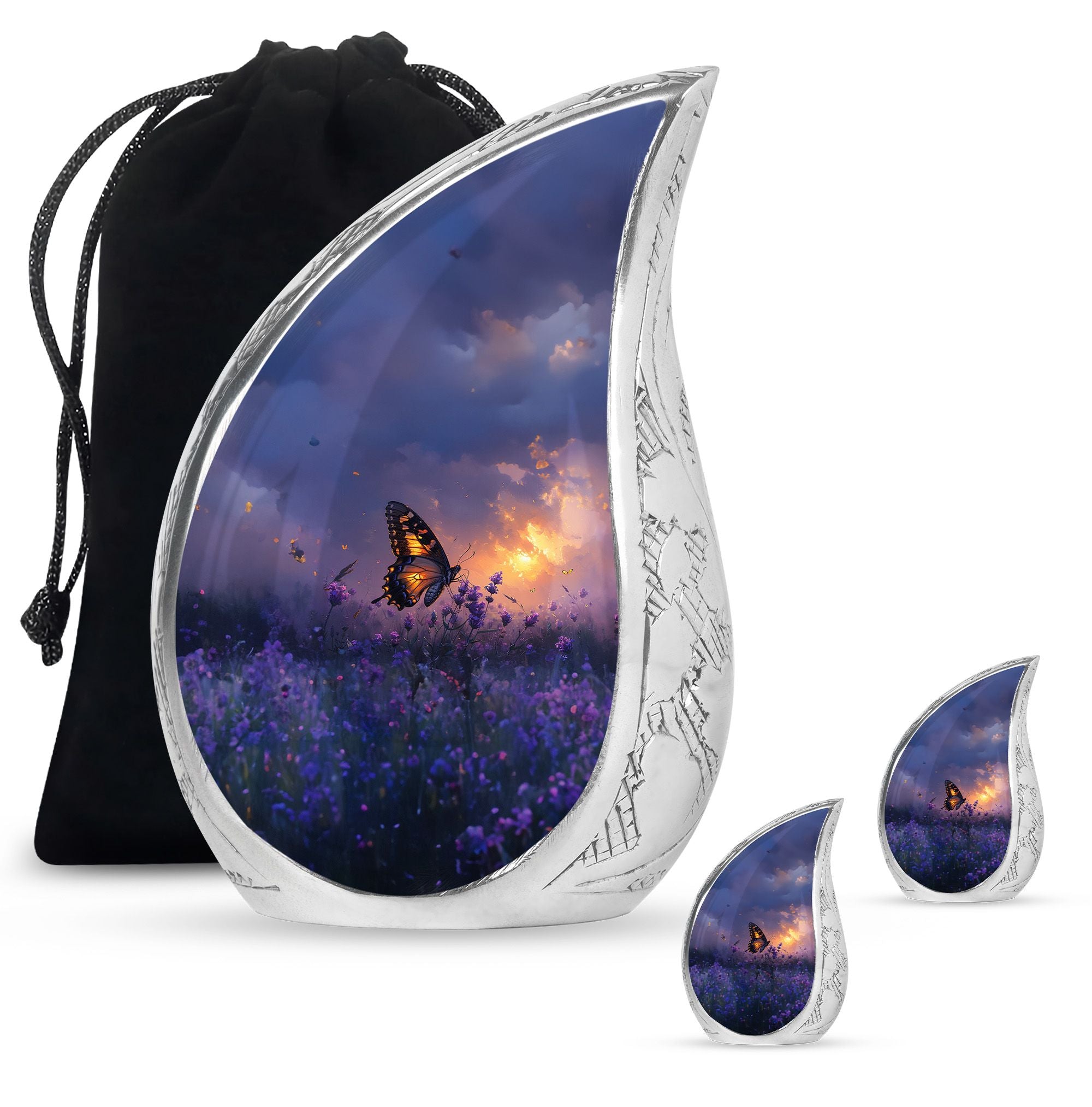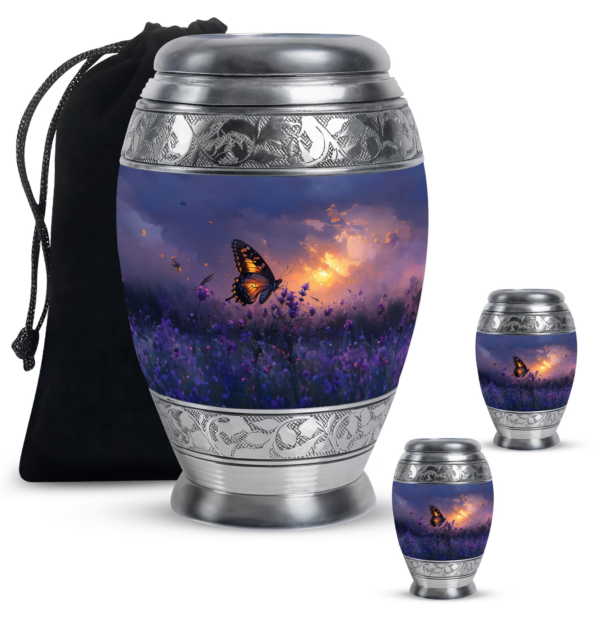 Expertly crafted from durable aluminium, the urn features a serene purple meadow design with a delicate monarch butterfly, symbolizing transformation and remembrance. Its compact form makes it ideal as small keepsake urns or mini urns for ashes, combining graceful style with practical usability for keepsake or burial purposes.