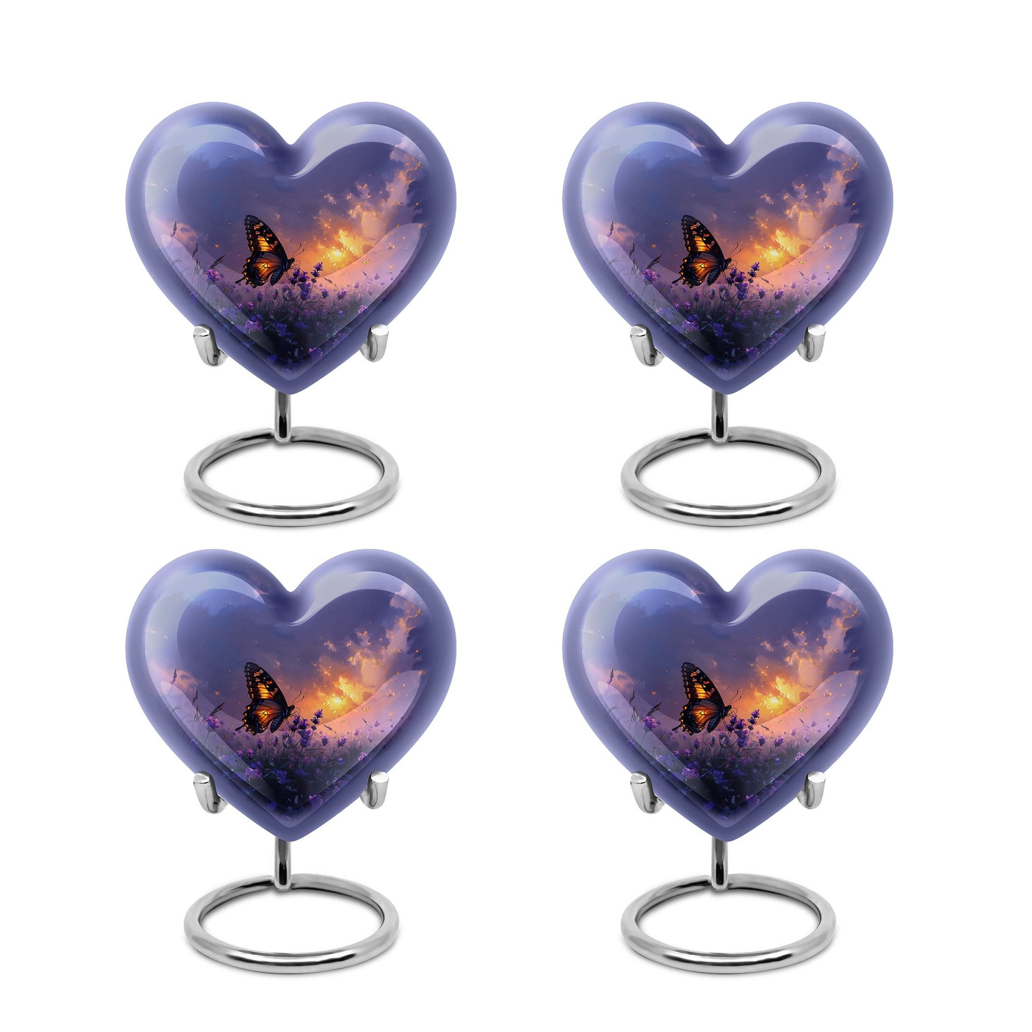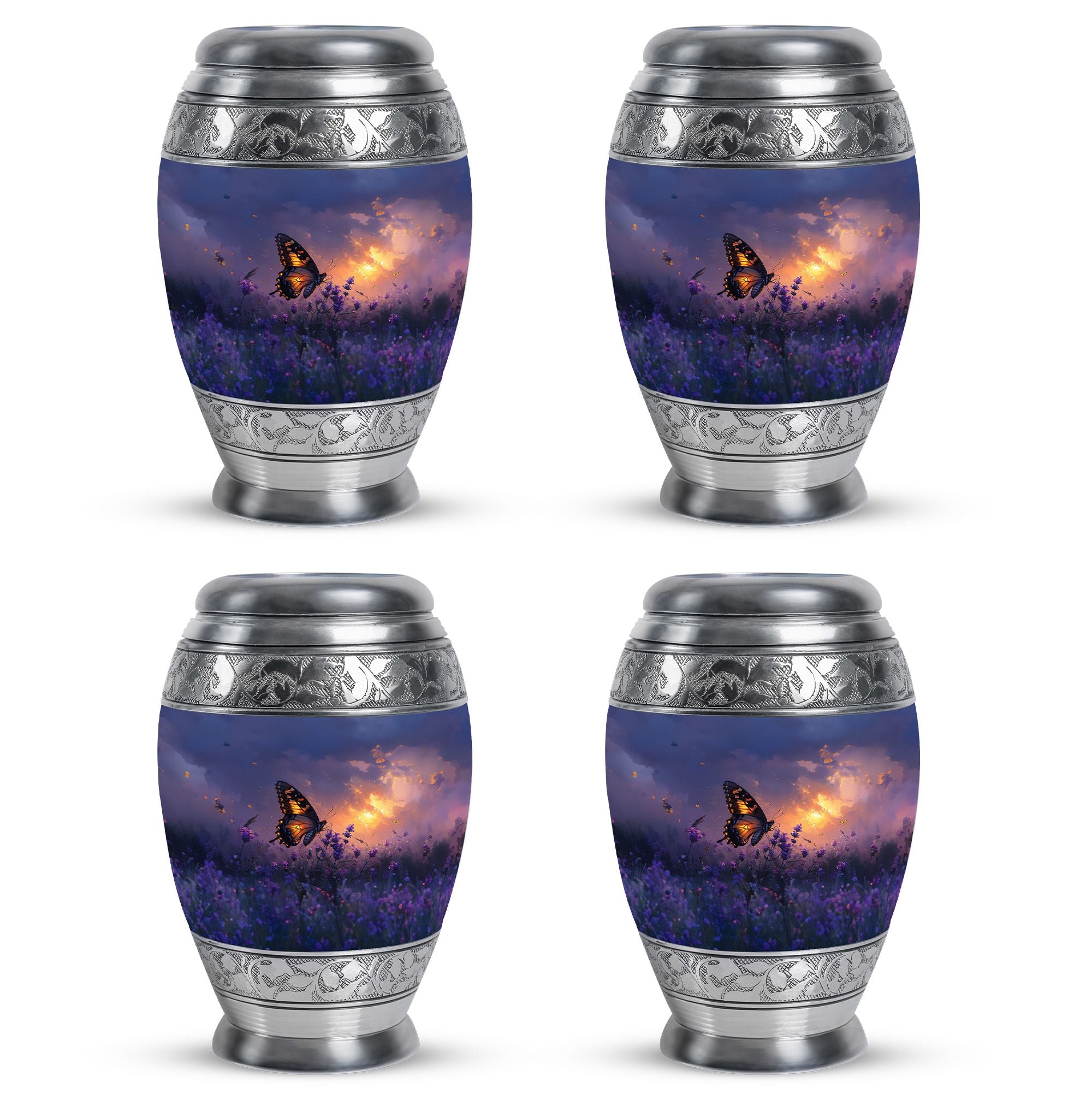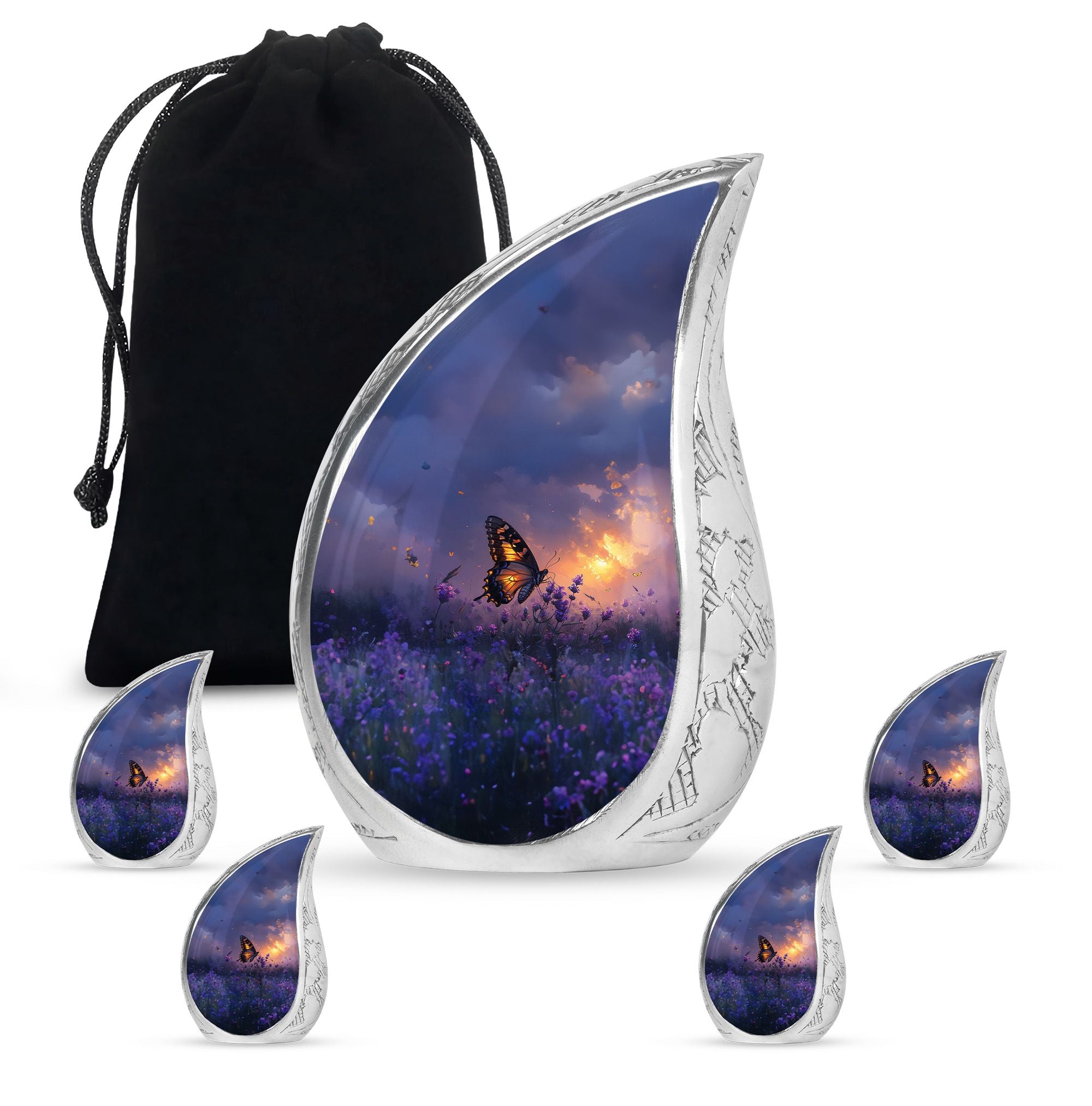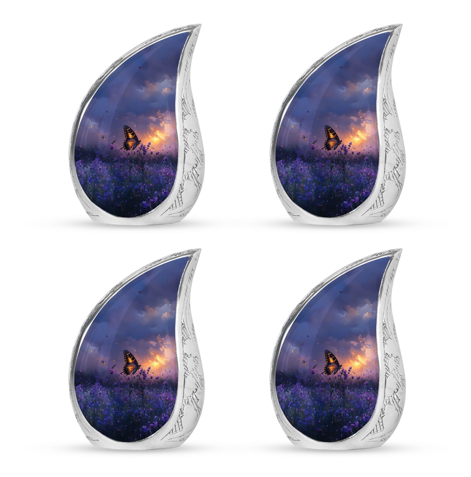 Expertly crafted from durable aluminium, the urn features a serene purple meadow design with a delicate monarch butterfly, symbolizing transformation and remembrance. Its compact form makes it ideal as small keepsake urns or mini urns for ashes, combining graceful style with practical usability for keepsake or burial purposes.