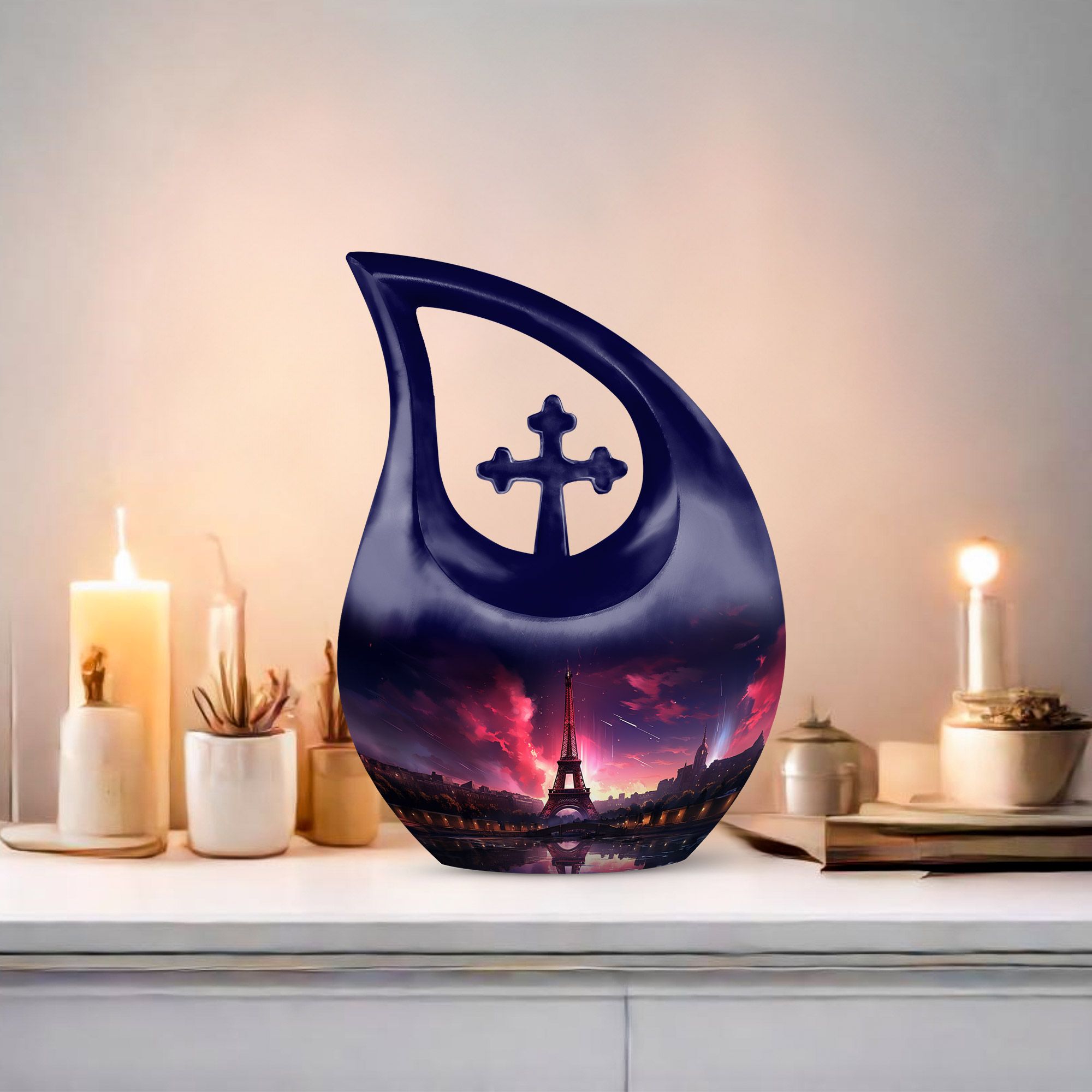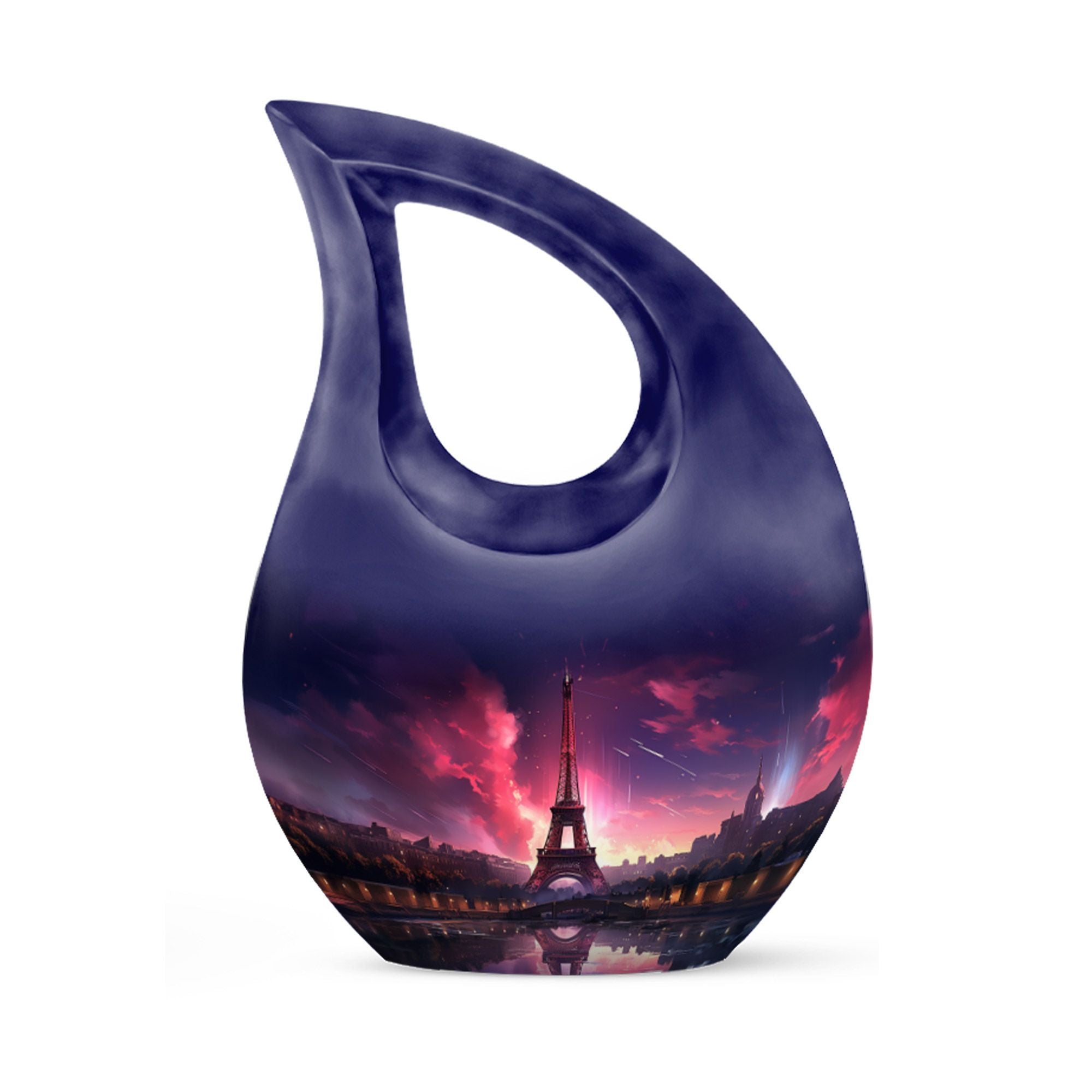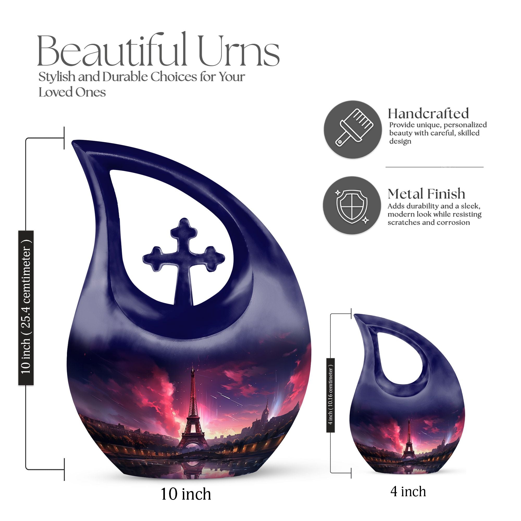 Expertly handcrafted, this urn showcases a graceful Eiffel Tower scene that evokes serenity and peace. Made from durable aluminum, it combines artistic design with premium quality. The smooth metallic finish, detailed artwork, and balanced proportions make it one of the most remarkable adult urns for women or funeral urns for men. This versatile piece is ideal for home display, burial, or niche placement—making it suitable as both an urn for human ashes adult women and adult urns for men & women.