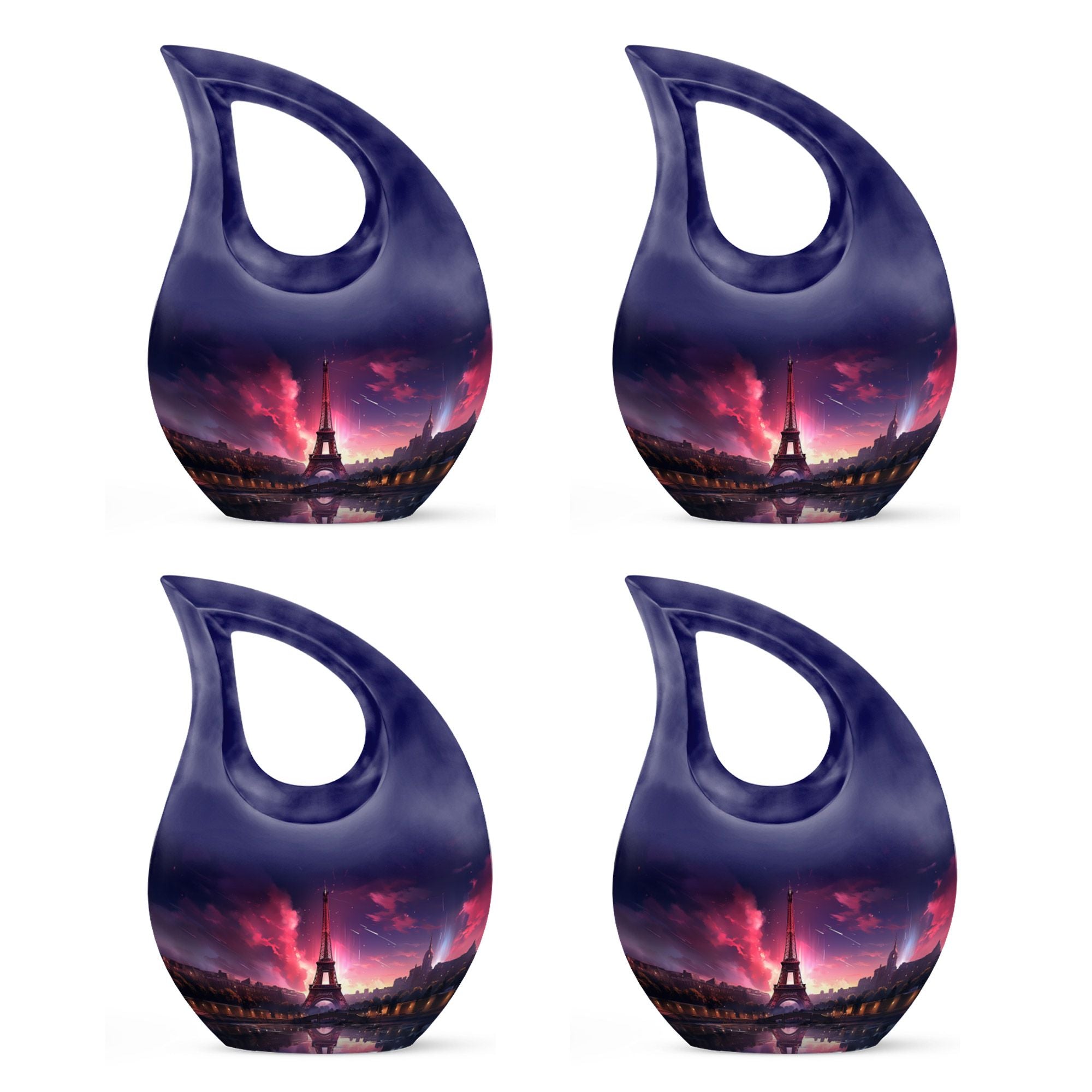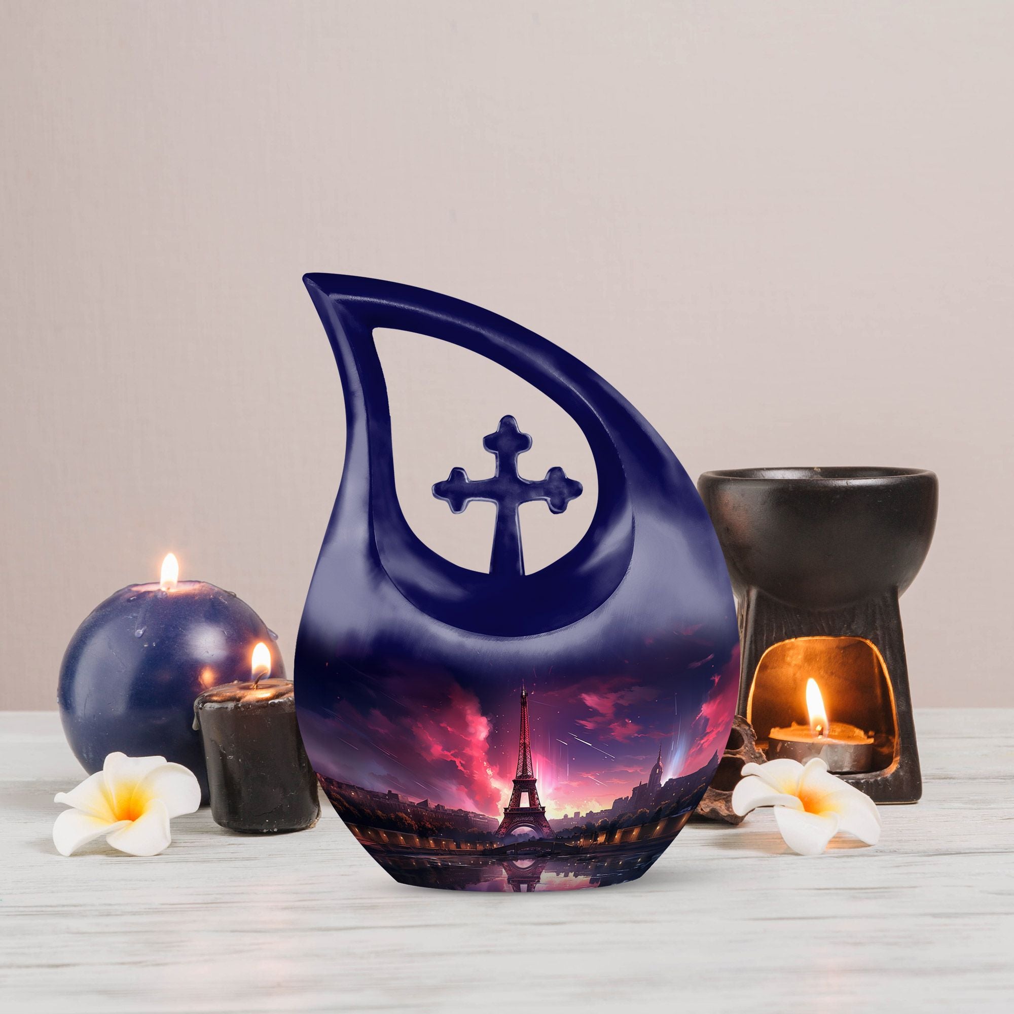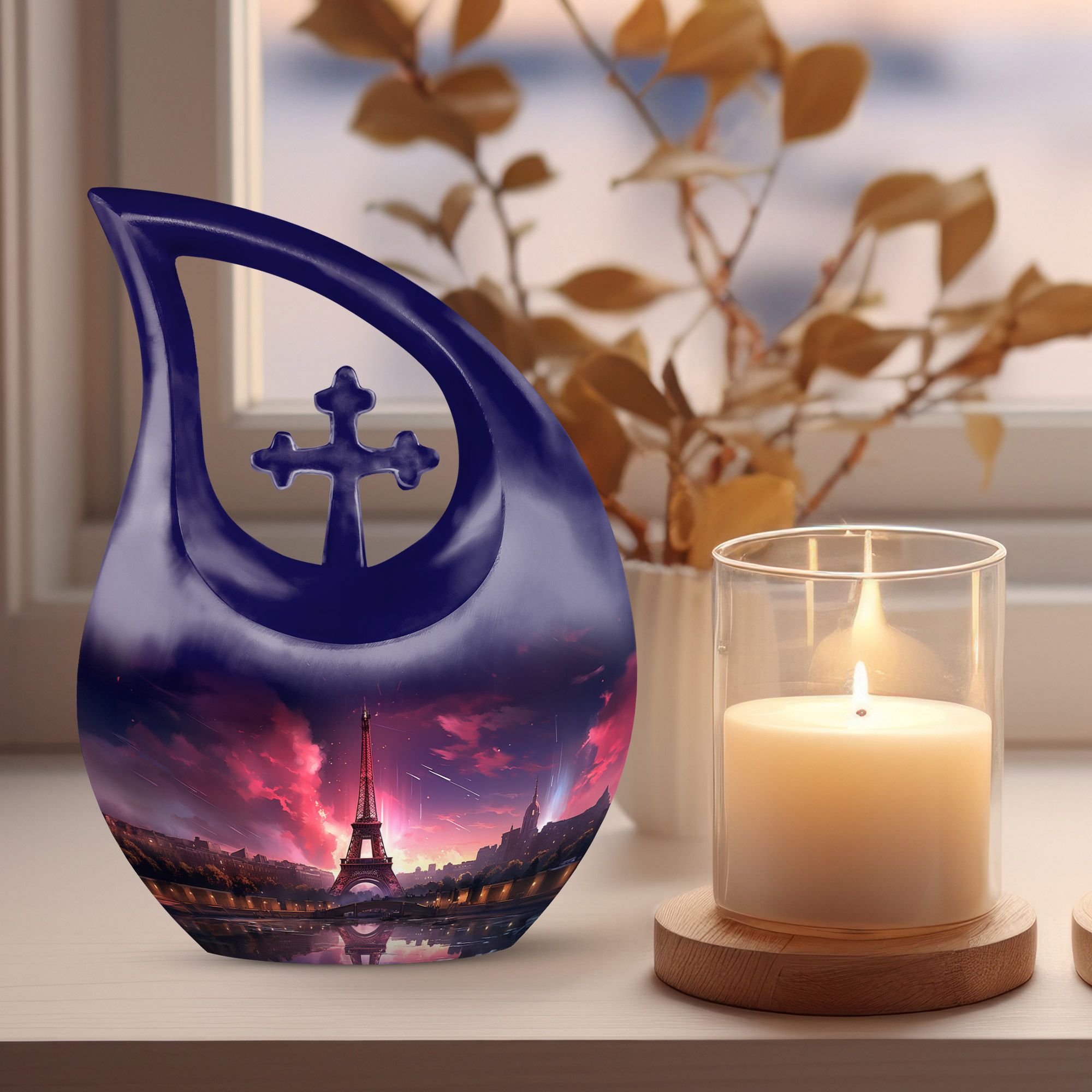 Expertly handcrafted, this urn showcases a graceful Eiffel Tower scene that evokes serenity and peace. Made from durable aluminum, it combines artistic design with premium quality. The smooth metallic finish, detailed artwork, and balanced proportions make it one of the most remarkable adult urns for women or funeral urns for men. This versatile piece is ideal for home display, burial, or niche placement—making it suitable as both an urn for human ashes adult women and adult urns for men & women.