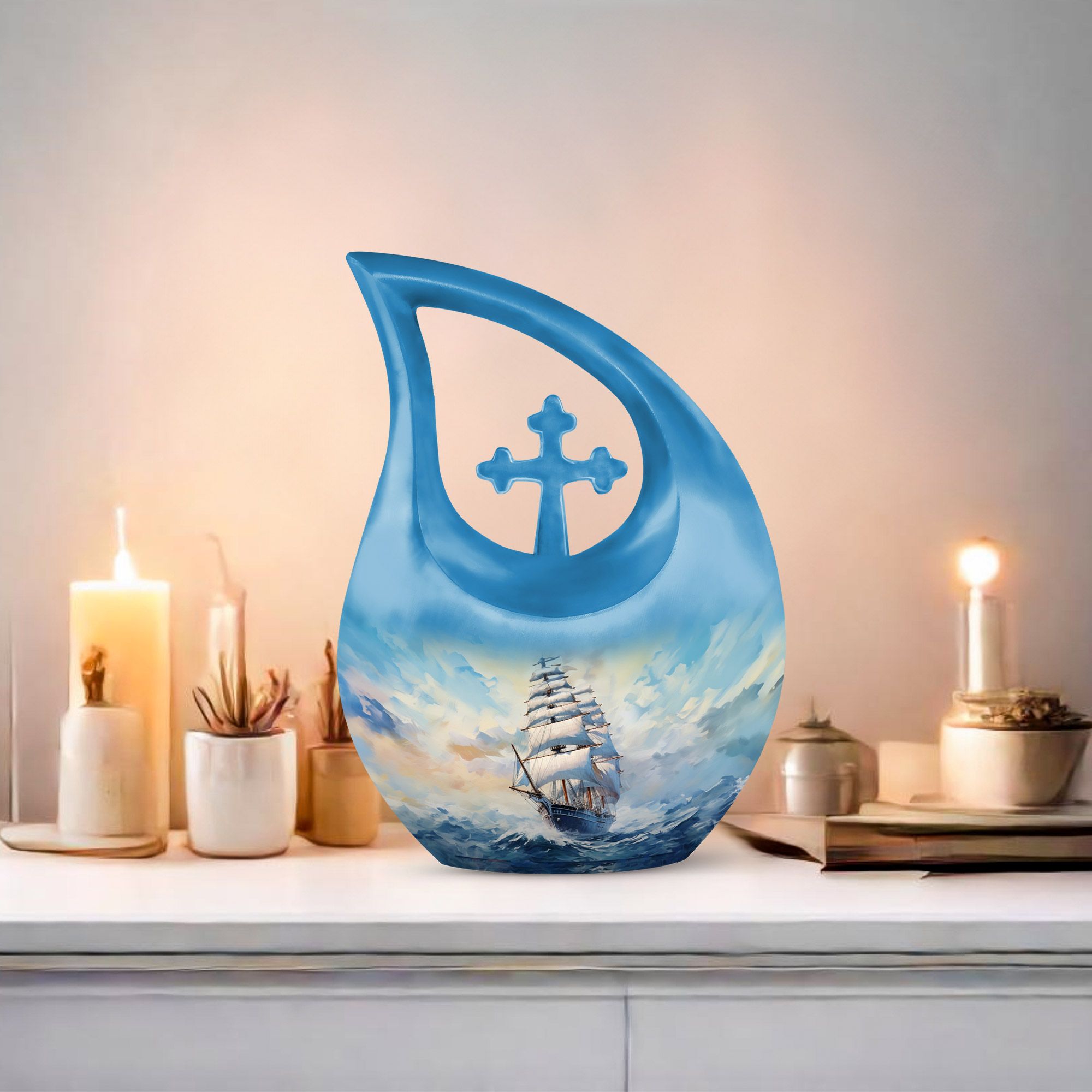 Commemorate a loved one’s voyage through life with the Sailing Ship Memorial Urn, a beautifully crafted tribute representing freedom, peace, and life’s enduring journey. The elegant sailing ship motif glides across tranquil blue waves, making it a meaningful choice among funeral urns women and funeral urns men for those who lived with purpose and courage.