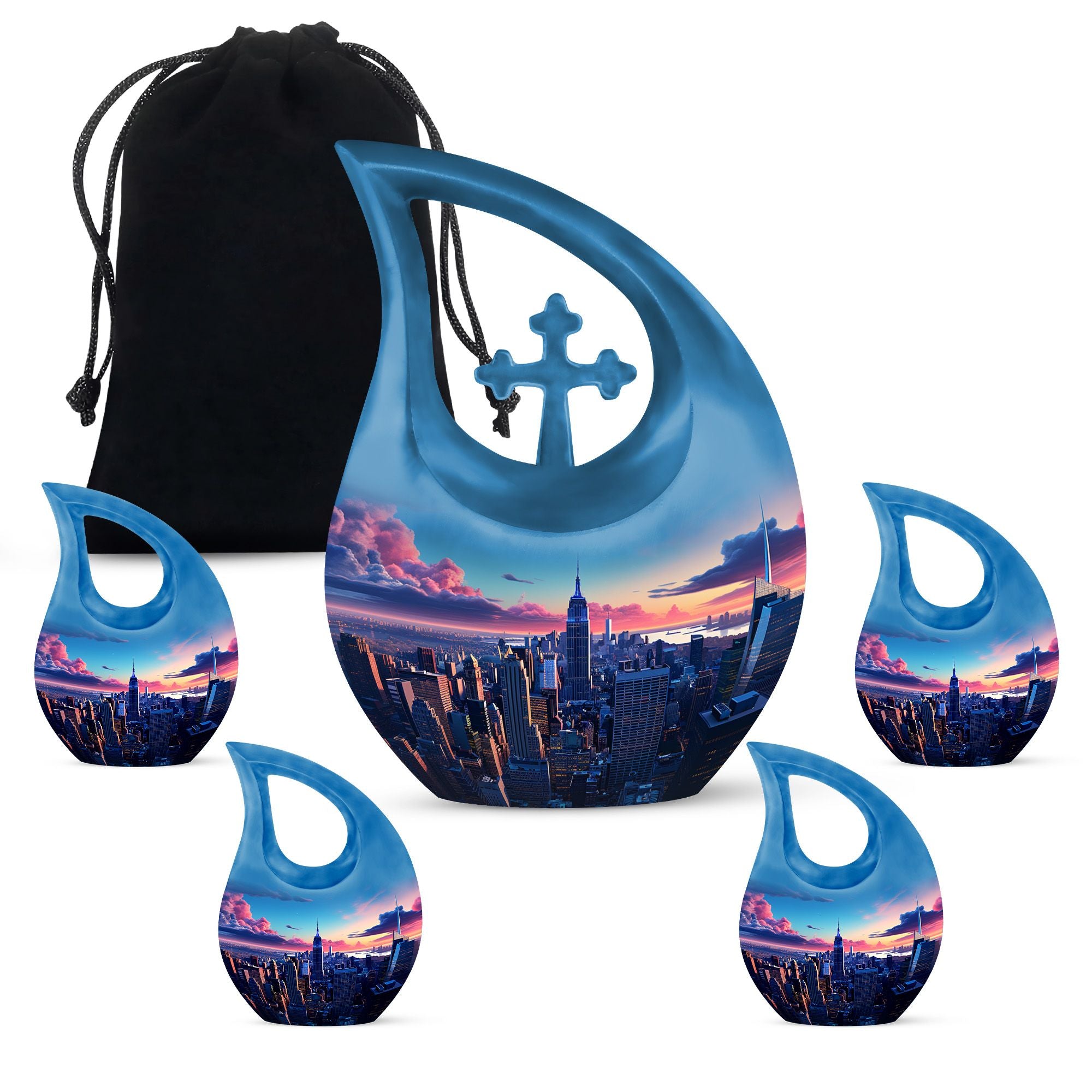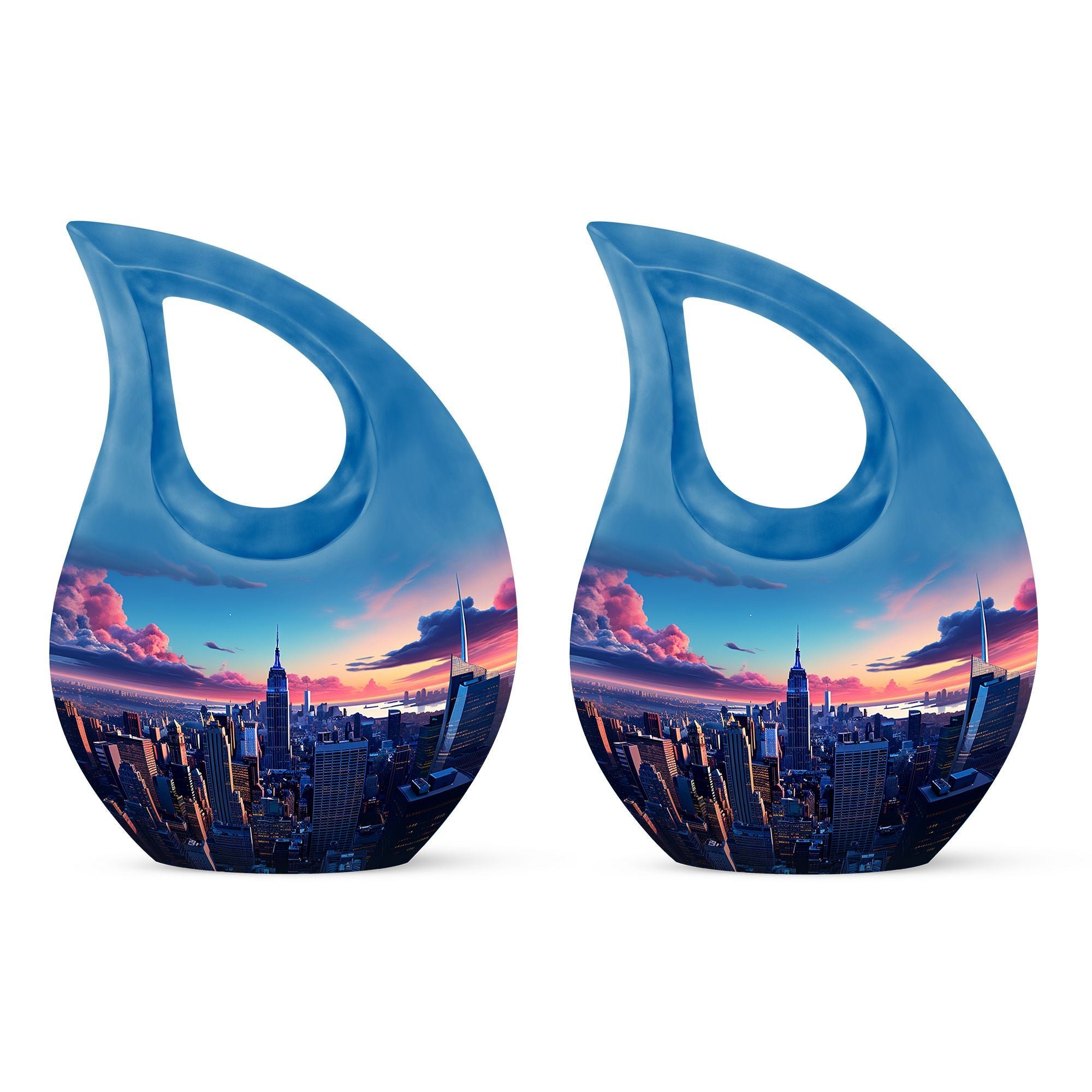 Crafted from premium aluminum, this cremation urn human design features a striking blue teardrop shape adorned with the New York City skyline. Its polished surface reflects both light and emotion, symbolizing hope and remembrance. With a secure screw-top lid, this adult cremation urns for human ashes ensures safety and durability. Matching cremation urns with keepsake options are available for families wishing to share the memory of their loved one in smaller keepsakes.