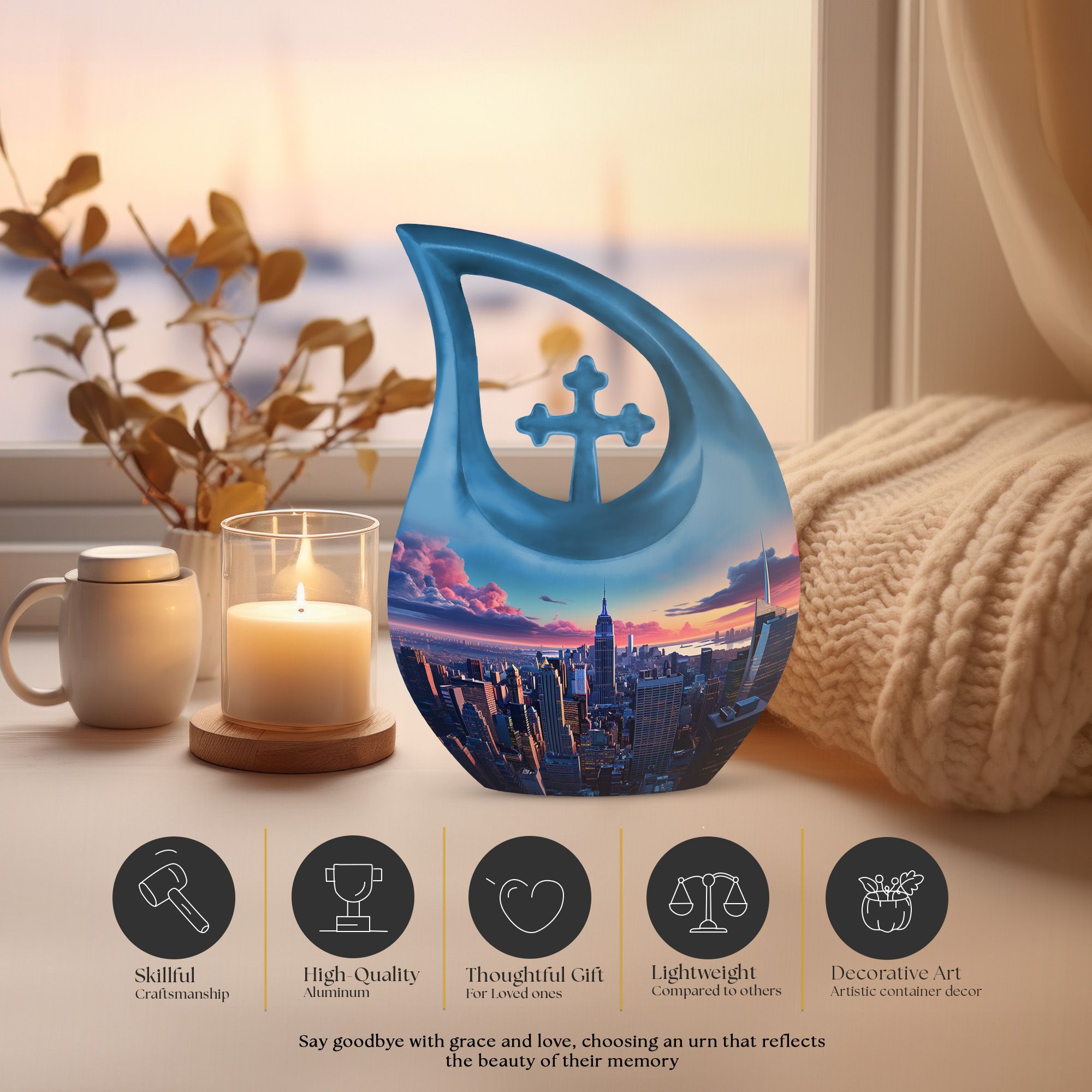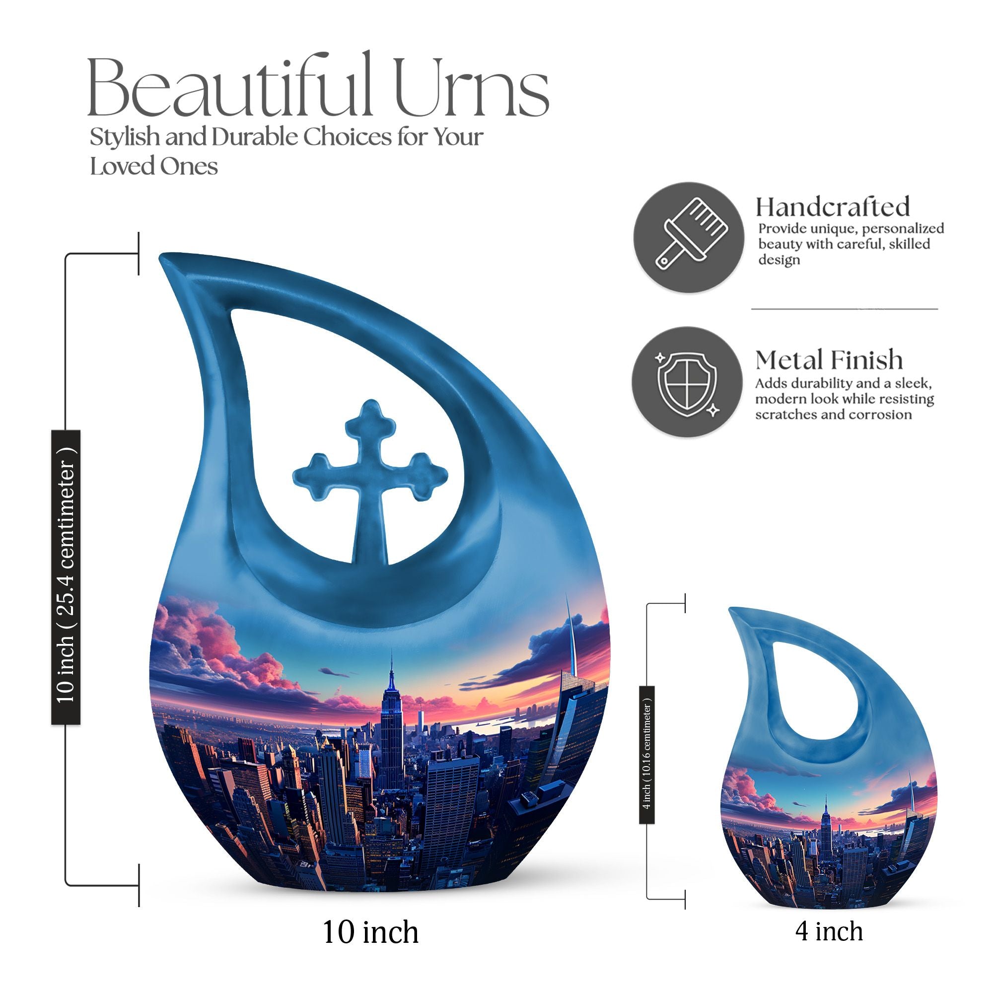 Honor a remarkable life with the New York City Skyline Cremation Urn – Blue Teardrop Memorial Urn. Inspired by the city that never sleeps, this elegant cremation urn for human ashes represents resilience, love, and legacy. Perfect for families seeking a dignified adult size cremation urn, it offers comfort and timeless beauty in every detail.