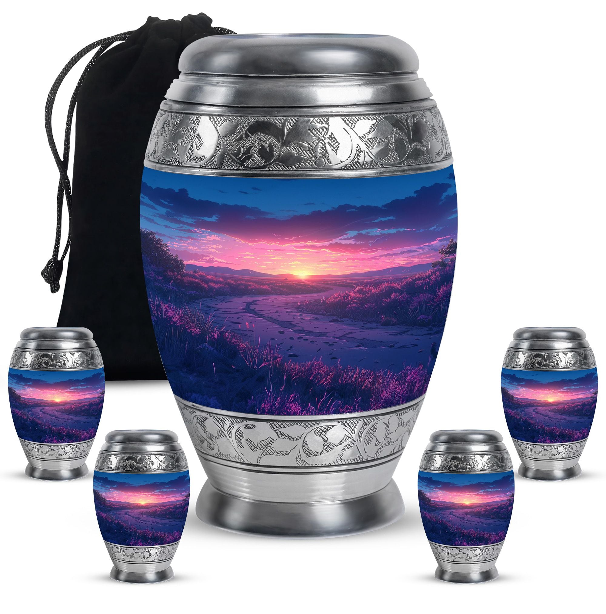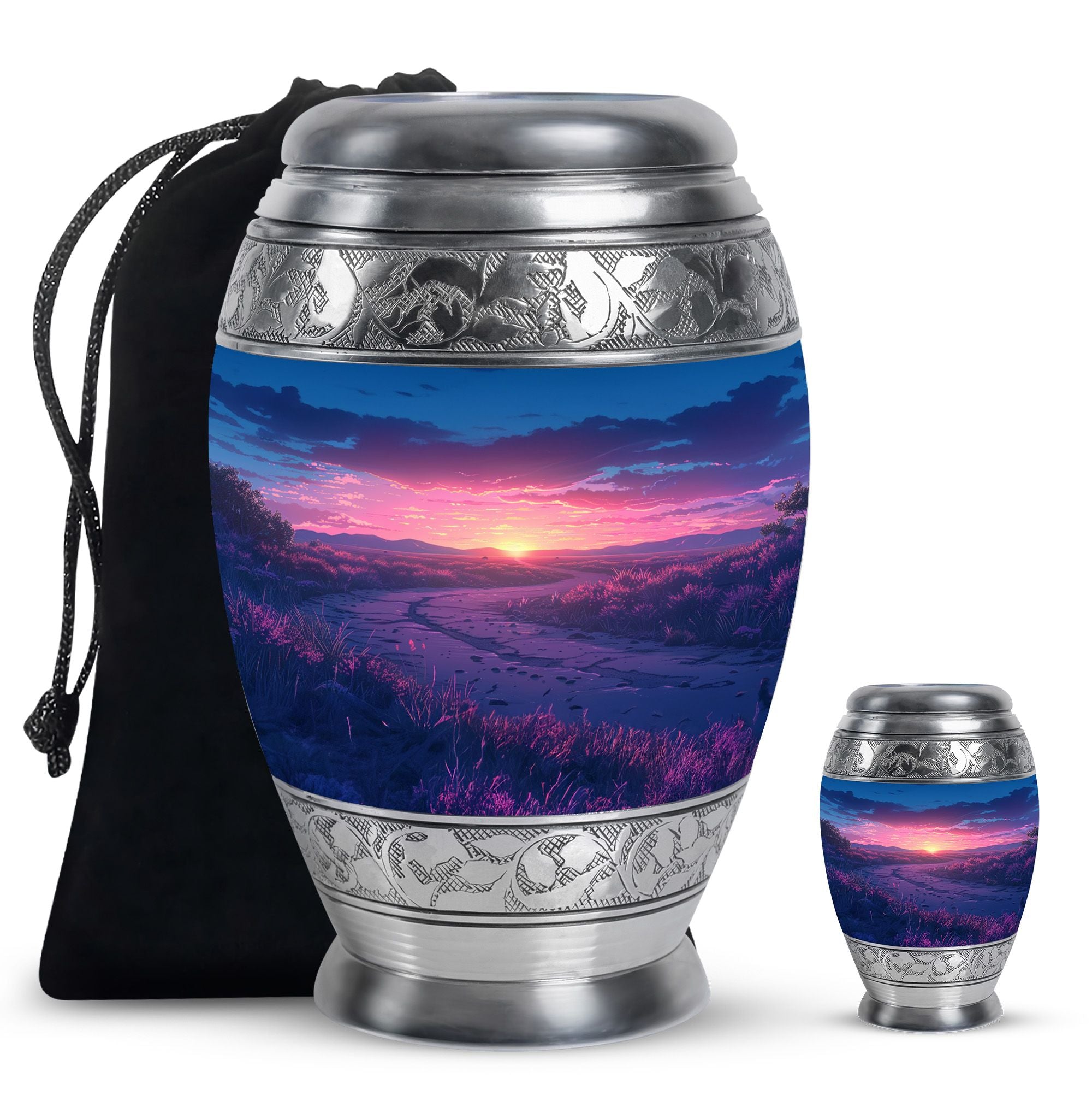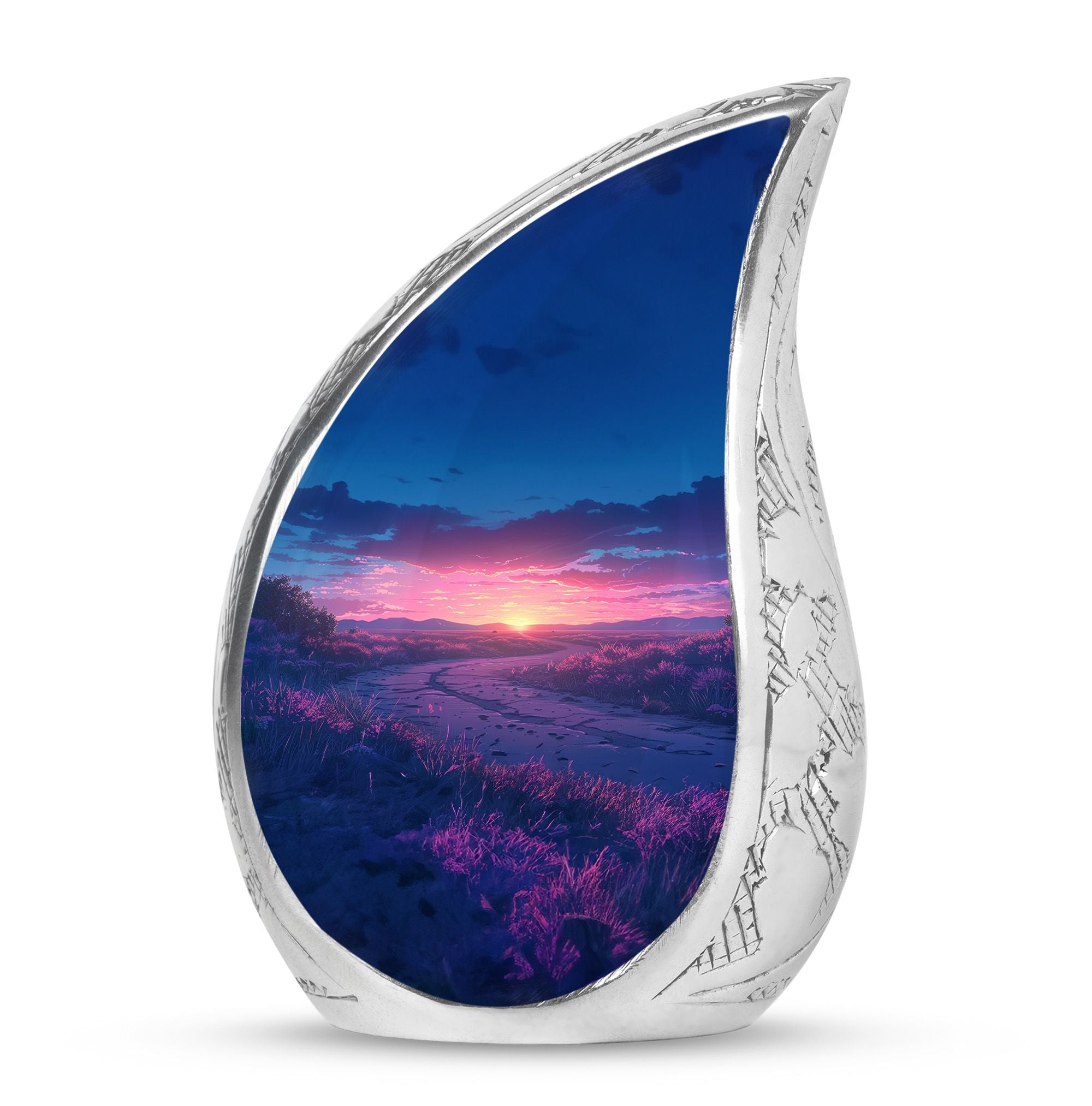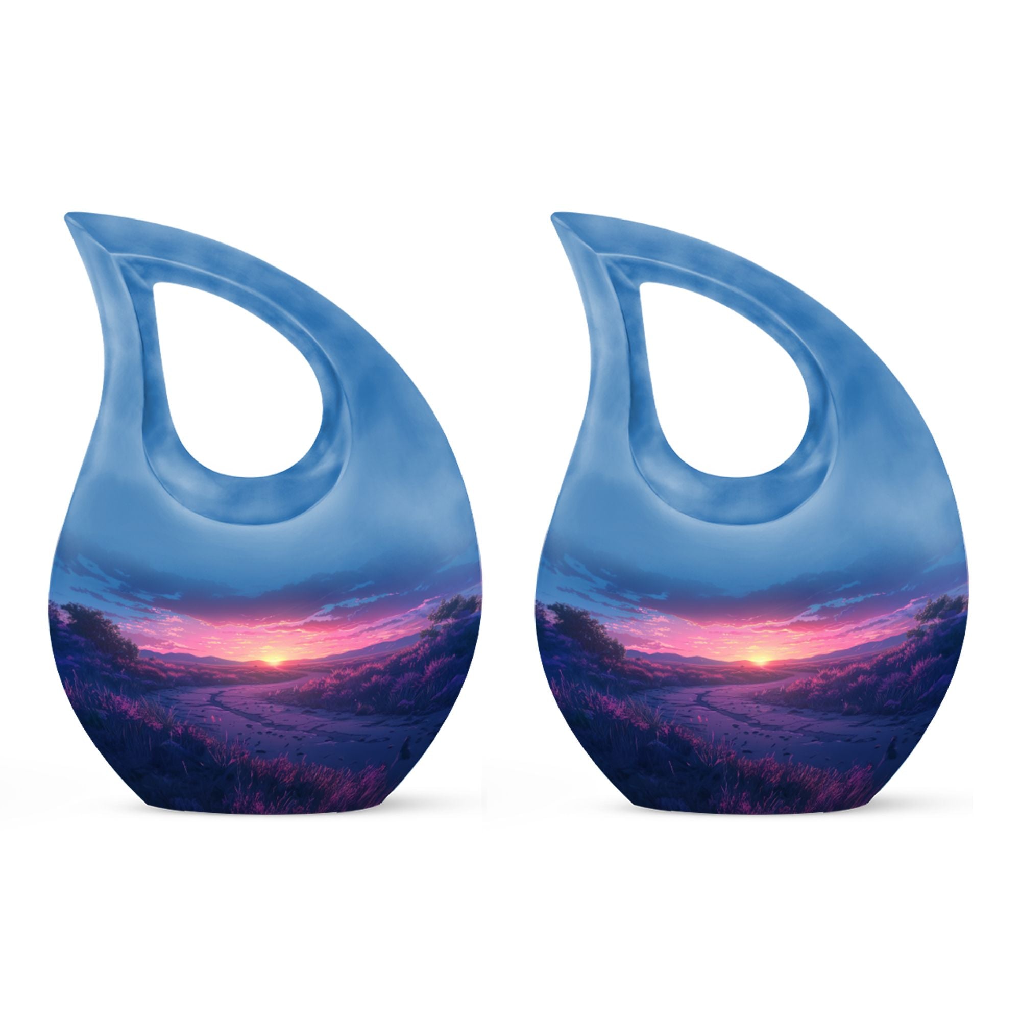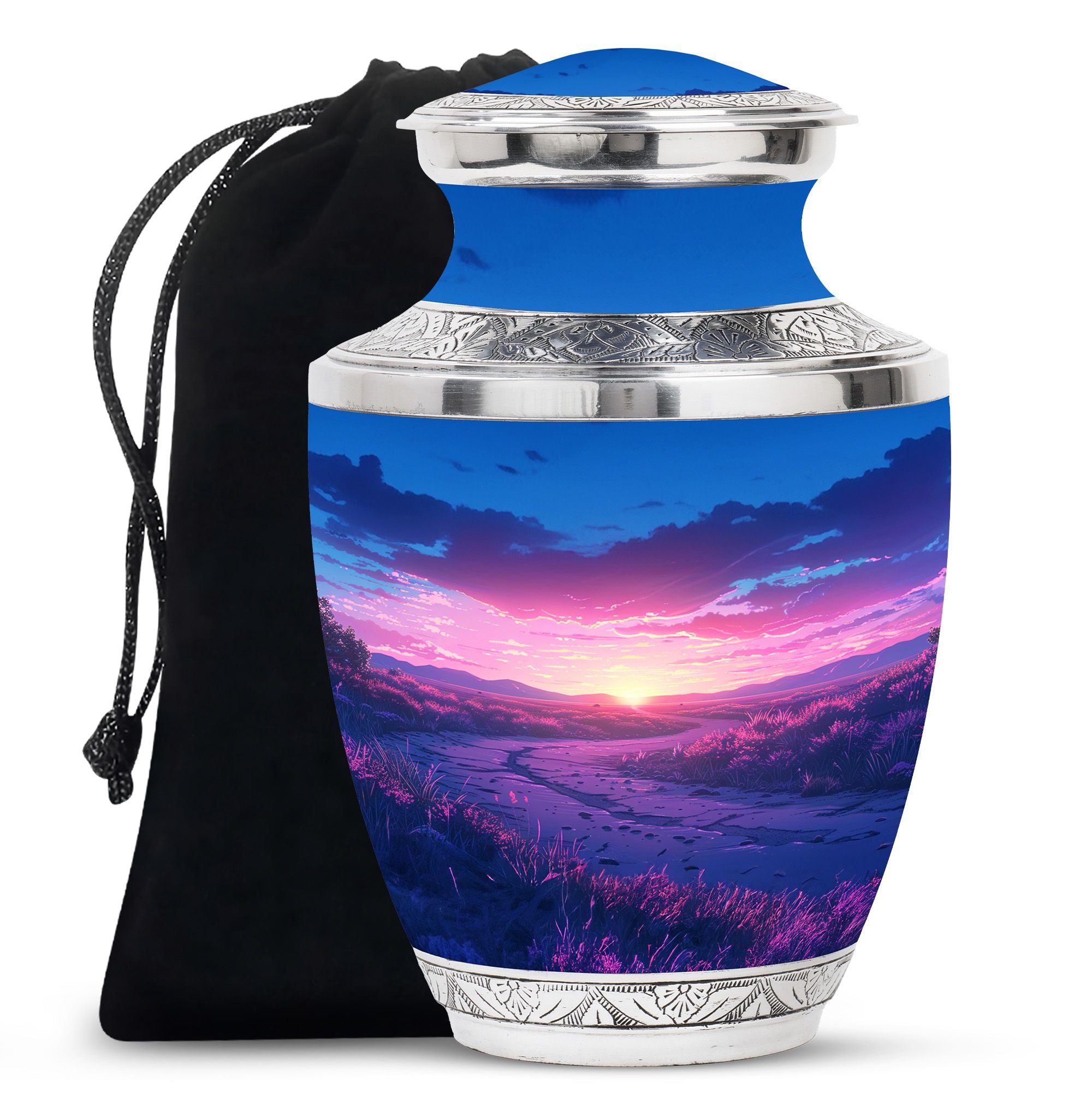 Honor your loved one with this sunrise cremation urn, a beautiful symbol of peace and remembrance. Featuring a serene blue mountain sunrise design, this large decorative urn offers families a meaningful way to preserve memories. Perfect for those seeking a large urn for ashes for women or a large urn for ashes adult male, it combines elegance with lasting strength.