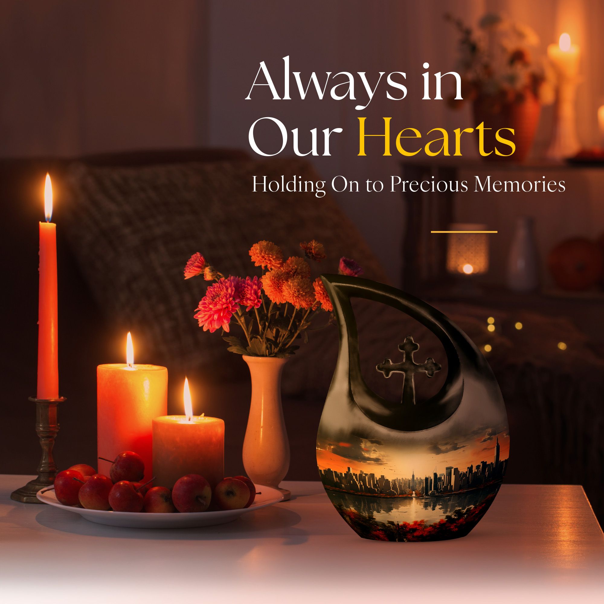 A symbol of eternal light and boundless dreams, this urn for women ashes or men captures the warmth of a sunset over the skyline — a reminder that every ending is just another beginning shining beyond the horizon.