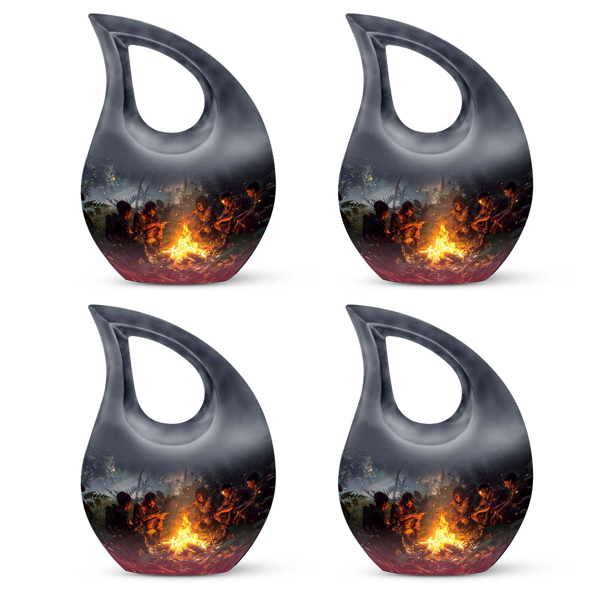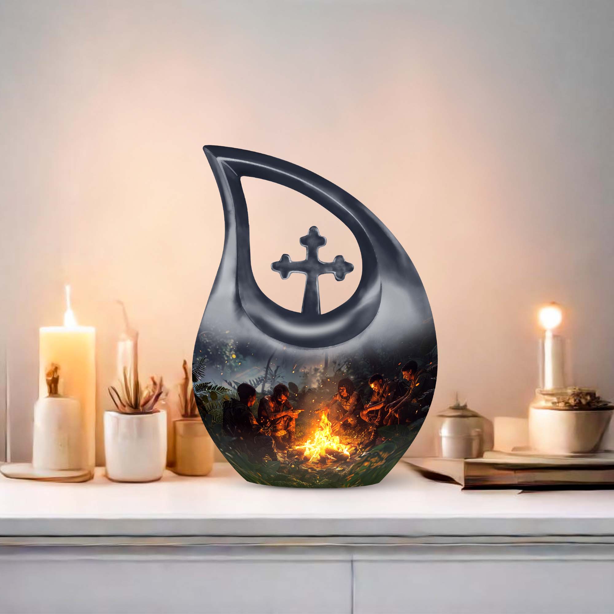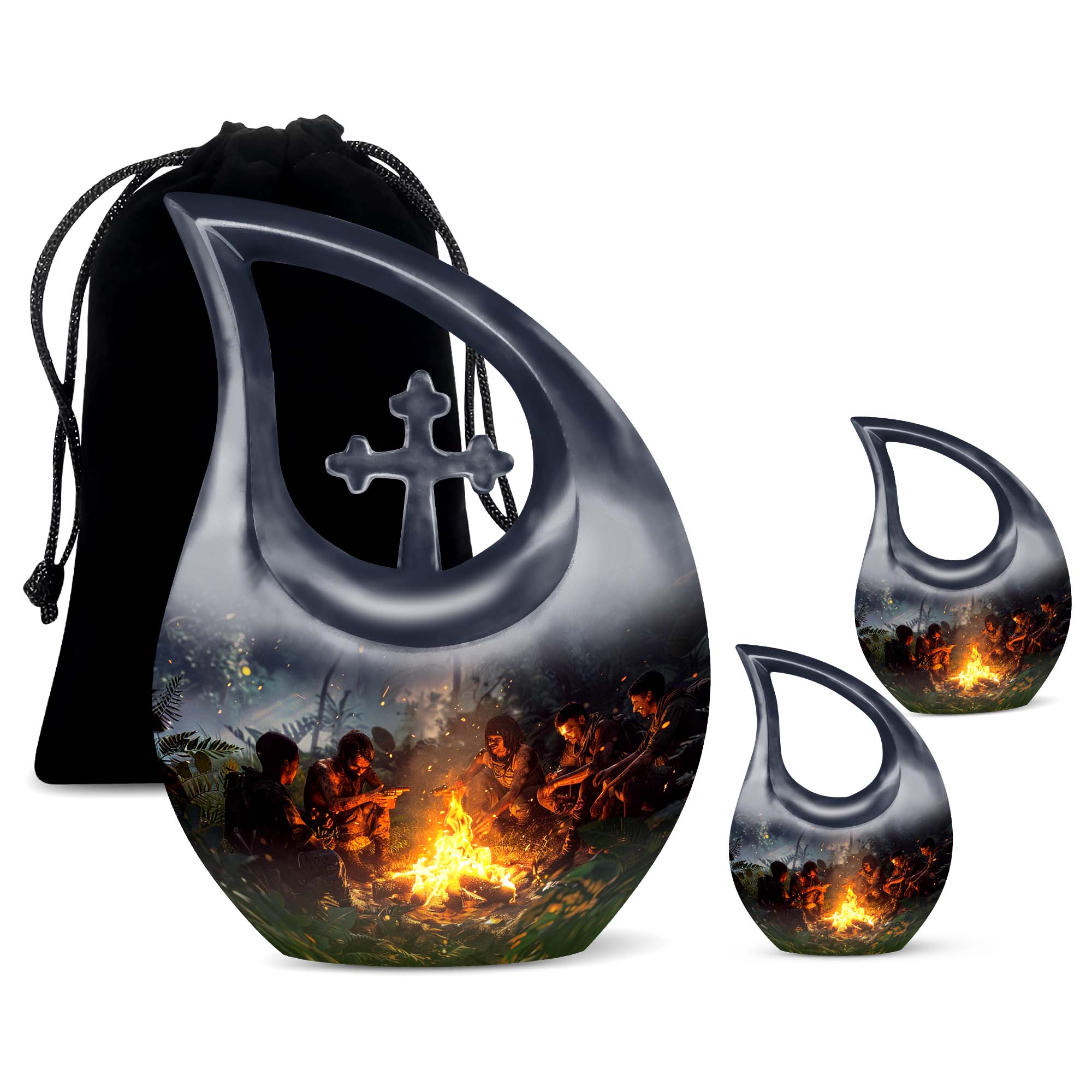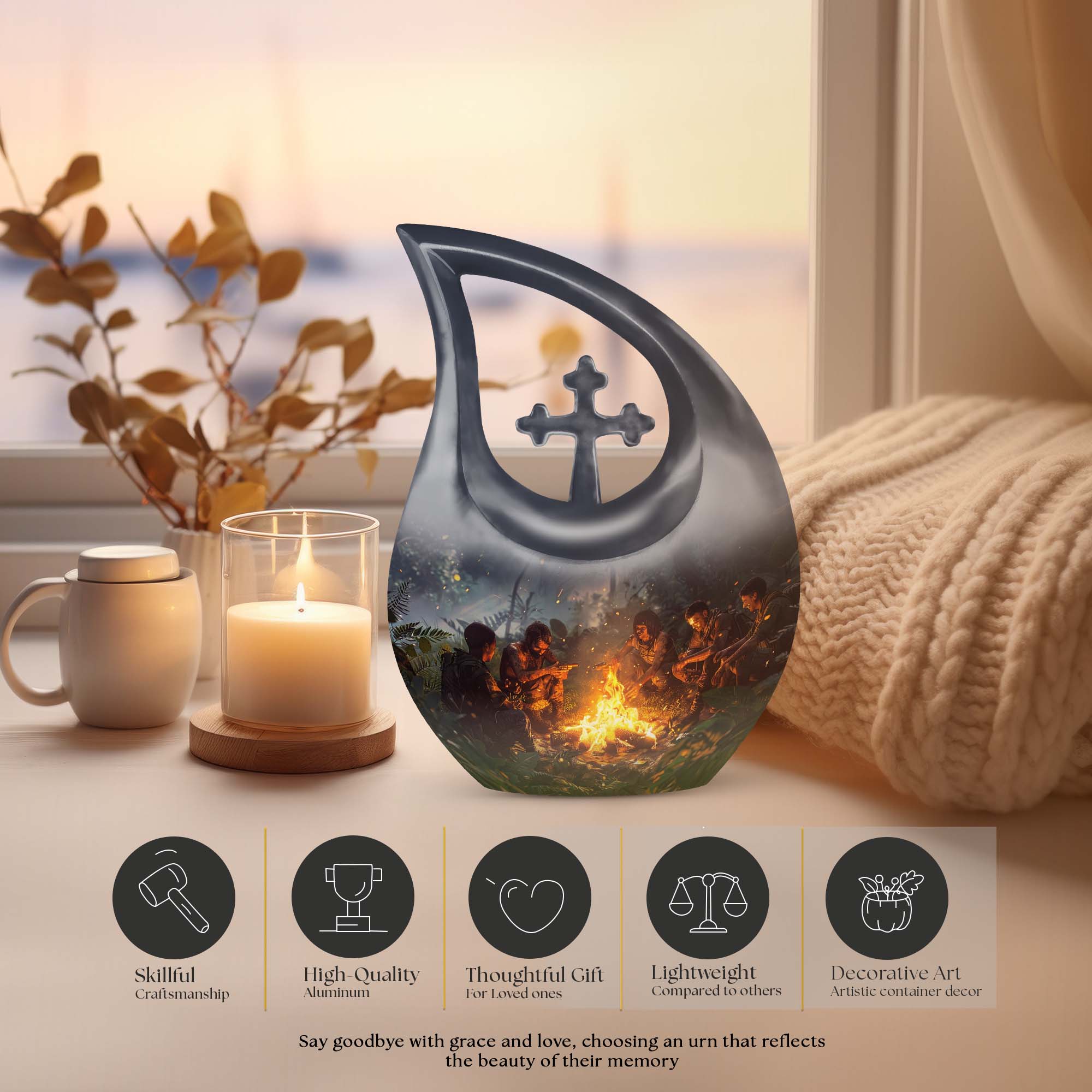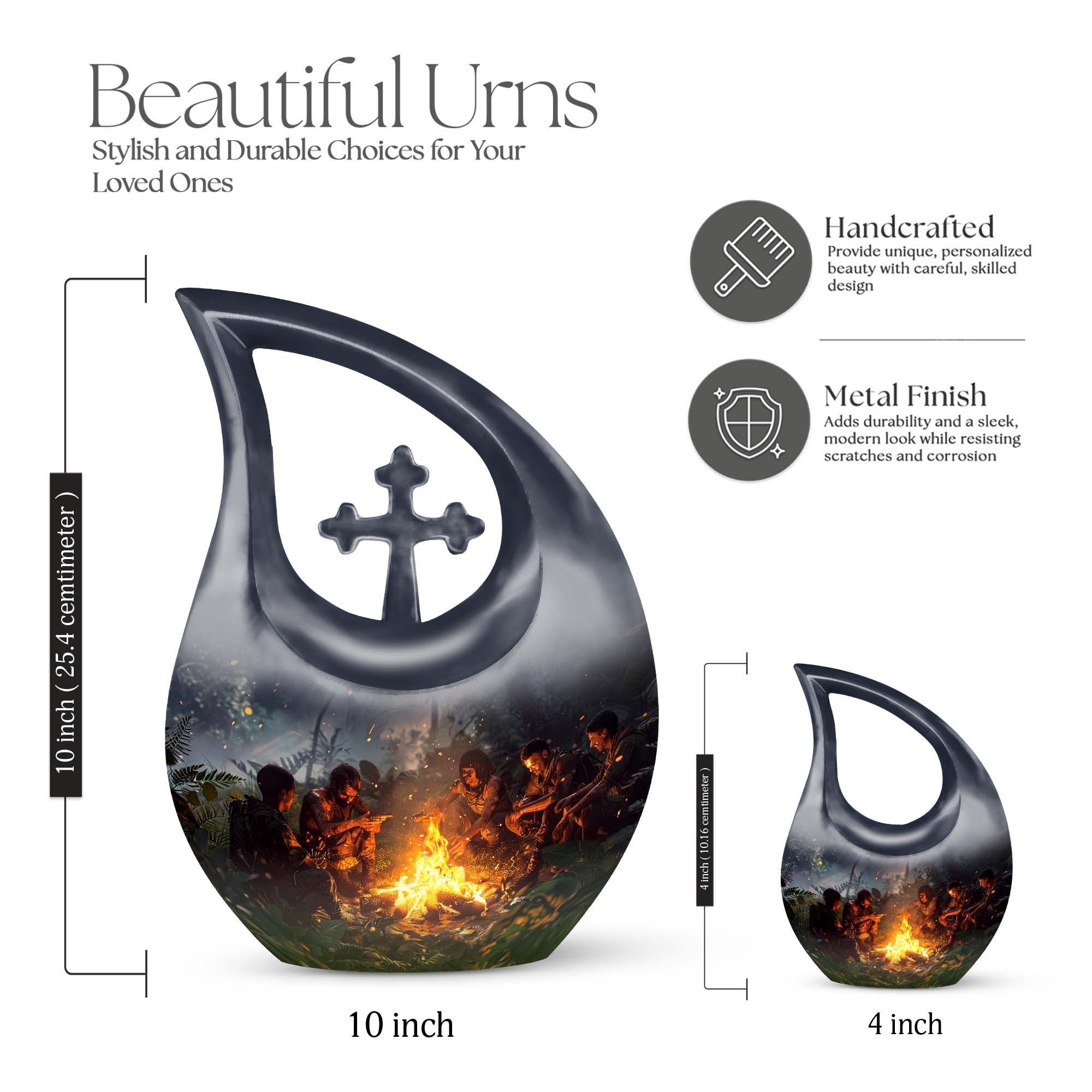Add timeless elegance to a post-life ritual with our 'Survivors' Campfire In Urn,' a larger-than-life representation of distinguished aesthetics. This 10-inch, domestically crafted aluminium urn showcases a unique 'Cross Drop' theme, instantly invoking a sense of serene reverence. This robust memorial urn, weighing in at 3.3 pounds, hosts a generous capacity of 200 cubic inches, suitably envisaged for double cremation purposes. The 'Survivors' Campfire In Urn' then seamlessly blurs the lines between functionality and sophistication through its unique inclusion of an elegant velvet pouch, ensuring worry-free containment of ashes. Flood your remembrance routine with a dedication to quality by opting for an urn that communicates your feelings subtly but assuredly. Customize your urn easily with engraved names. From small urns for cremation ashes to burial urns for ashes and even discount urns, we offer a vast array of superior choices for any requirement. Stand out with your memorialization efforts today with our crafted urns.