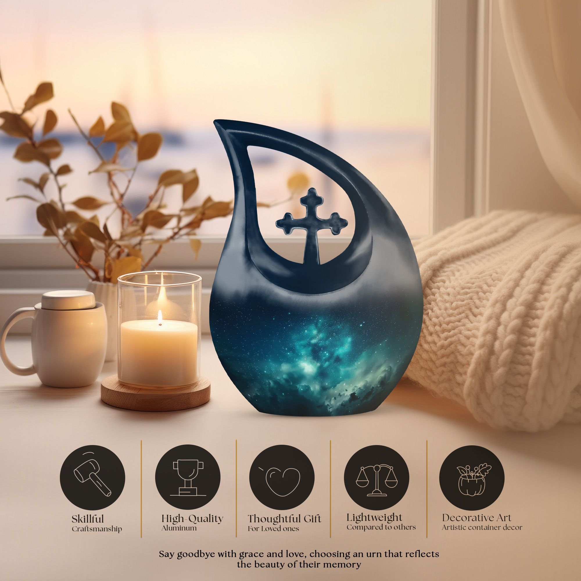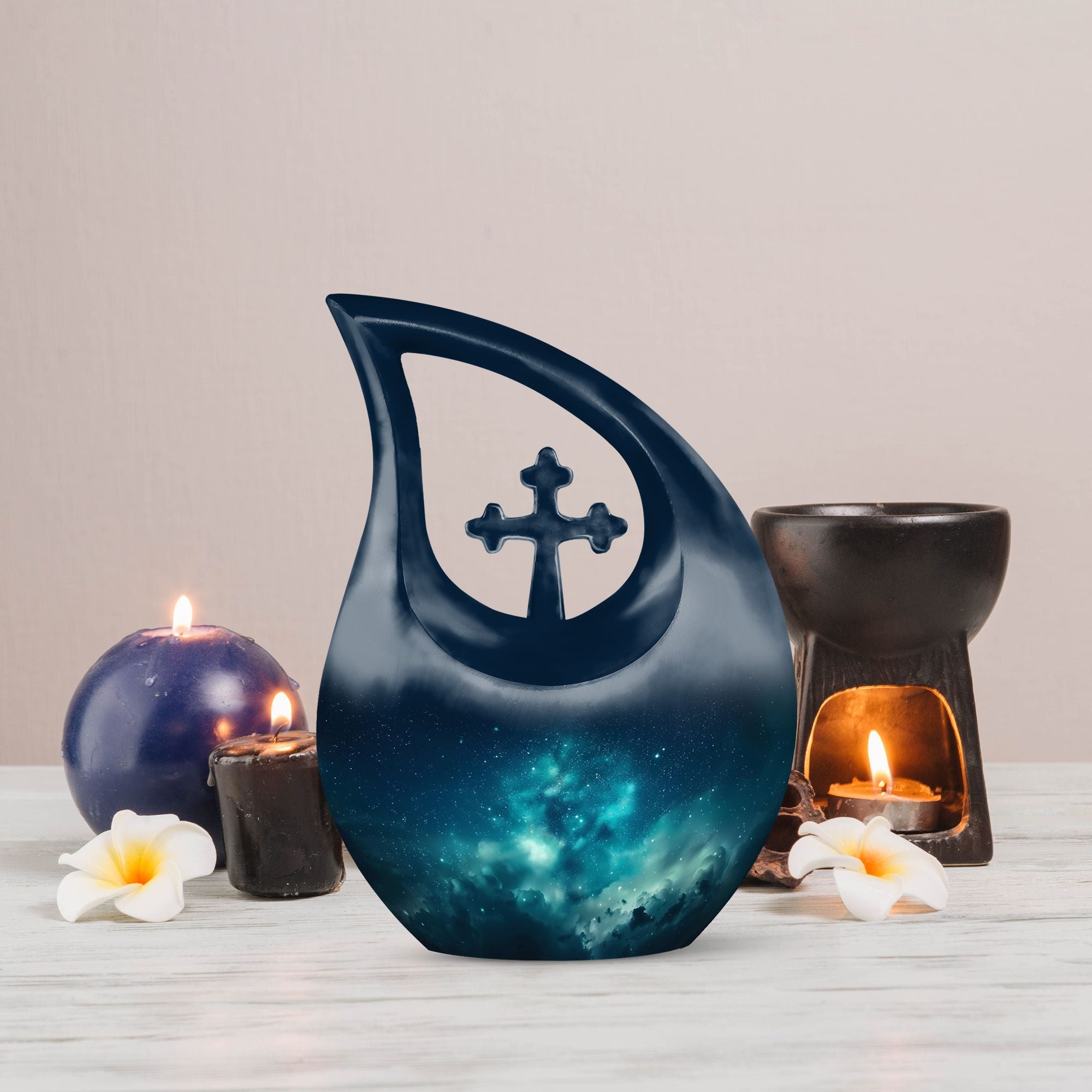 The Night Northern Light Cremation Urn is a heartfelt way to honor the memory of a beloved woman. Inspired by the tranquil dance of the northern lights, this urn symbolizes eternal peace and love. Crafted to cherish the essence of those we’ve lost, it offers a graceful resting place — one of the most dignified urns for human ashes adult female and a comforting tribute for a cherished soul.