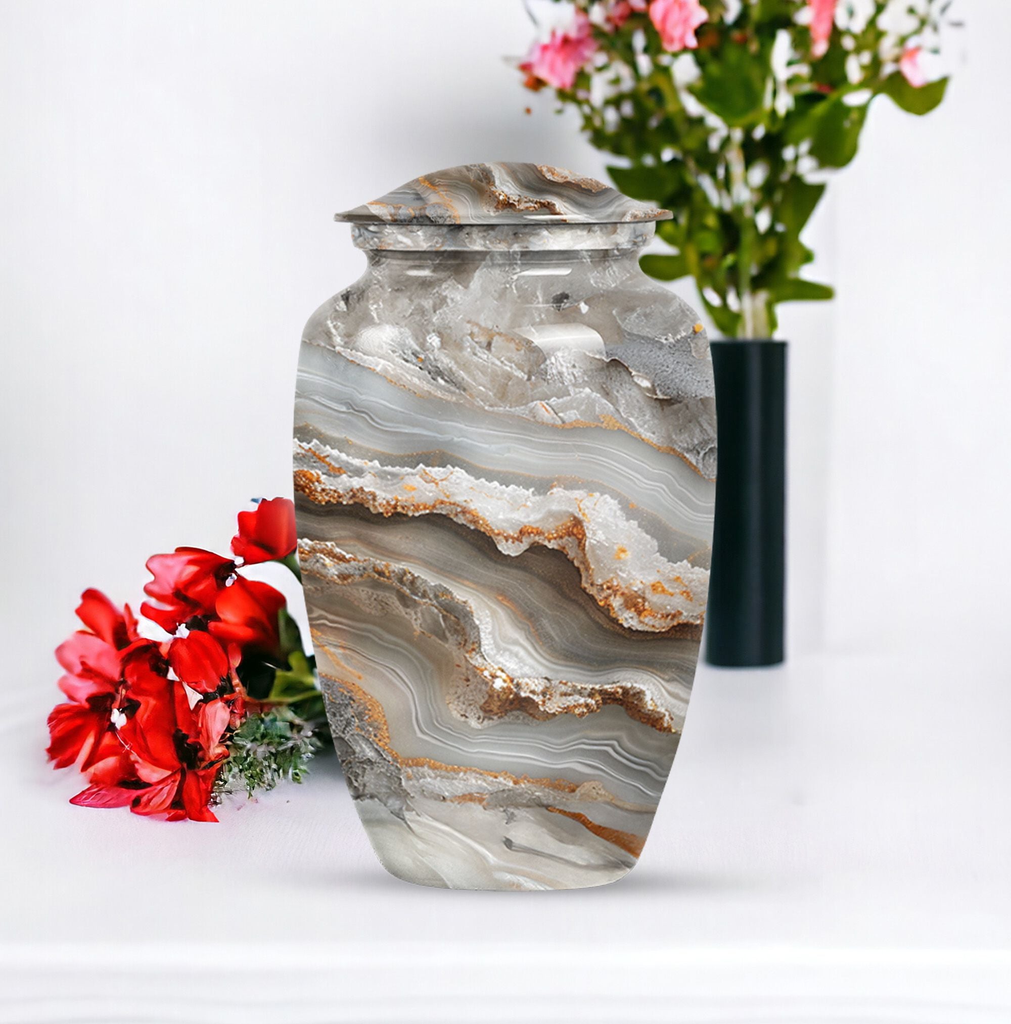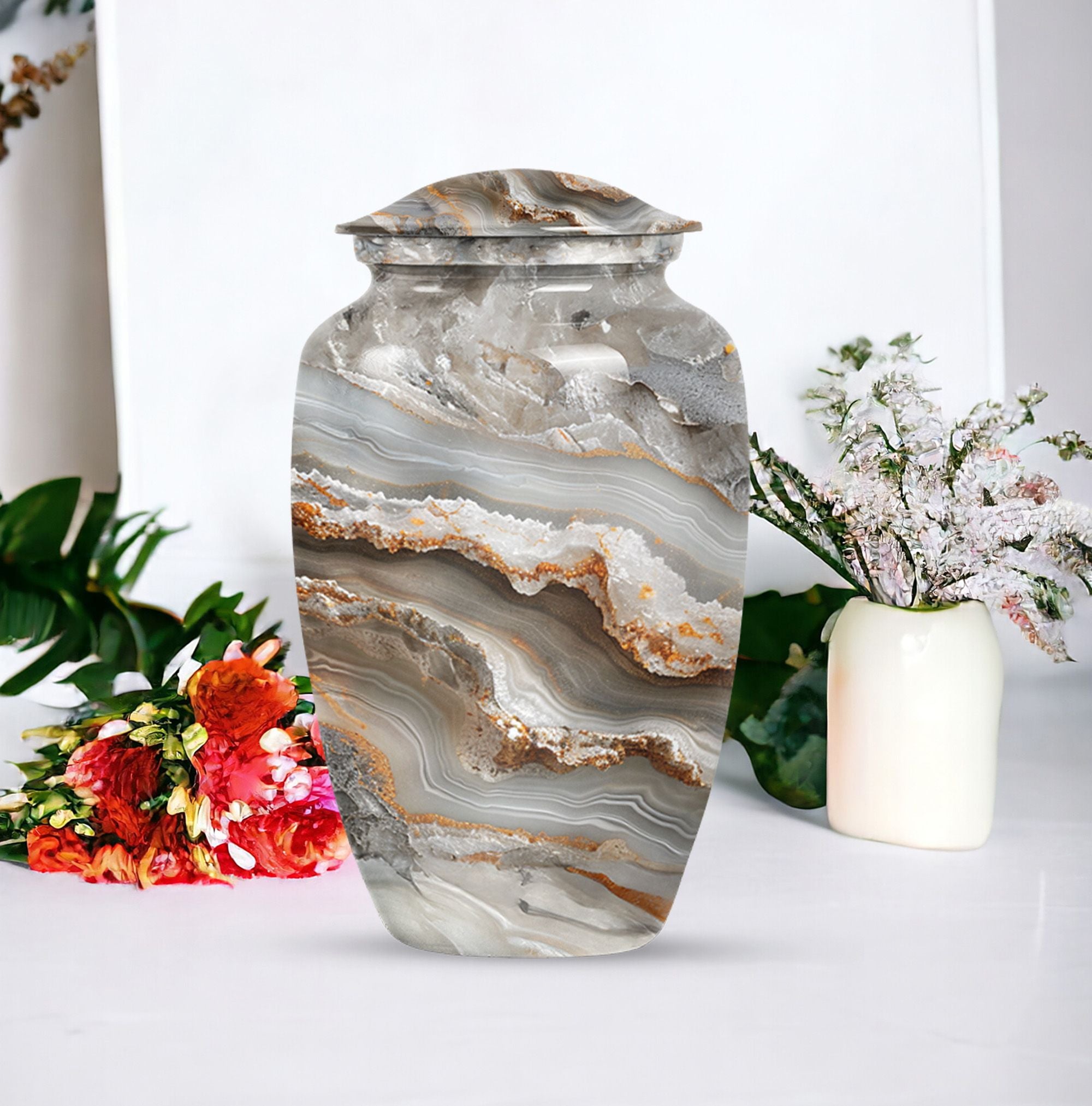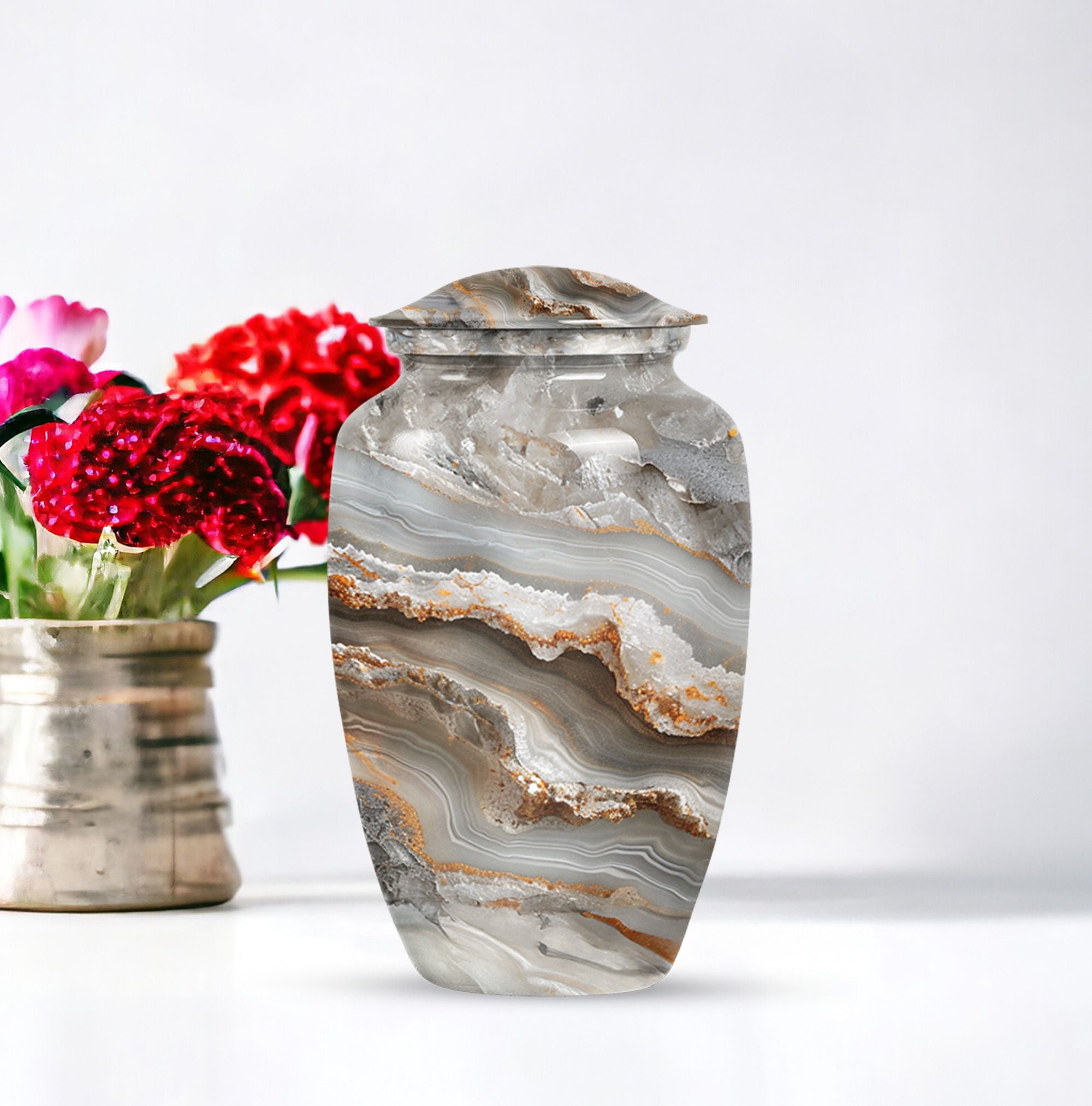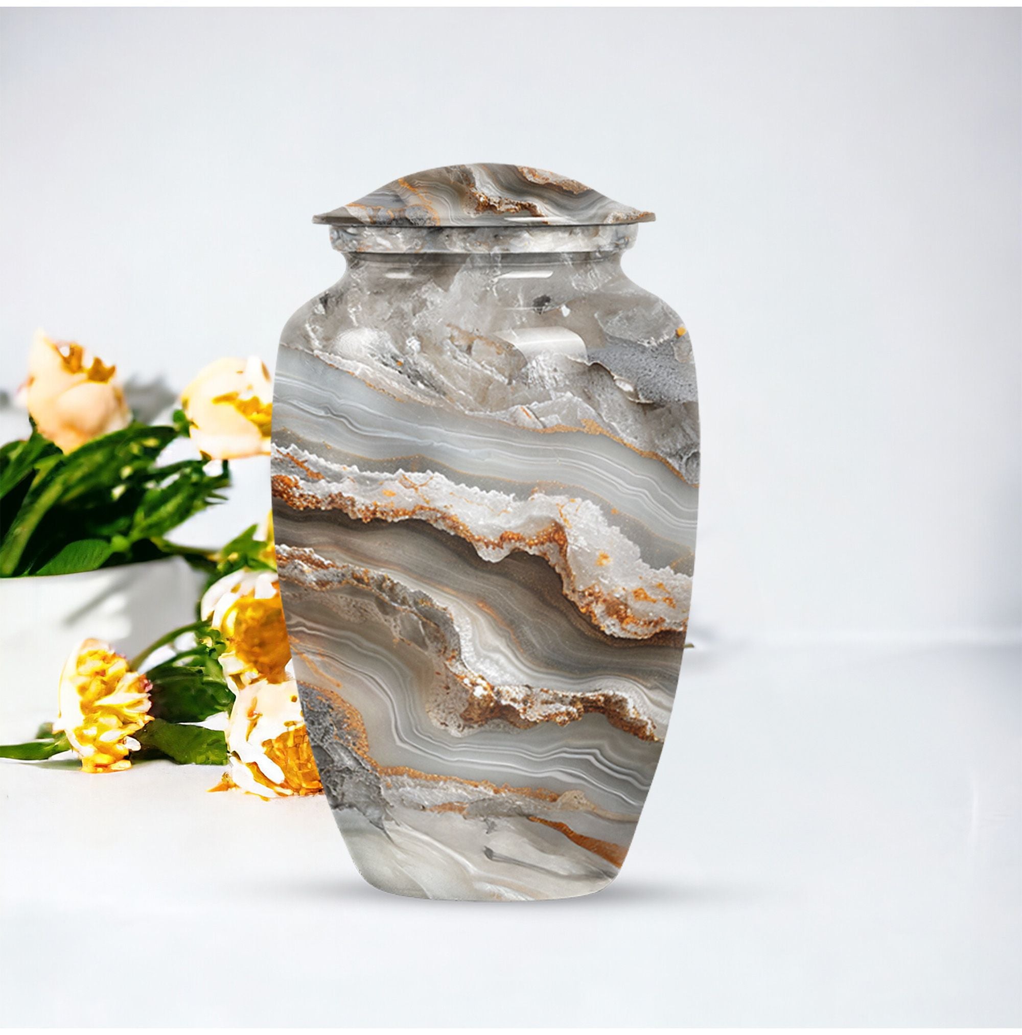 Uncover a unique final resting place for your loved ones with our Vibrant Swirl Large Urn. Crafted with care using robust but lightweight Aluminium, this funeral urn stands at an impressive 10 inches in height and weighs just 3.3 pounds. Tastefully accented with an abstract theme, the urn fits seamlessly into any household or burial setting. It is more than just an urn, it’s a subliminal art piece evoking fond memories. Its commanding size boasts a capacity of up to 200 cubic inches, providing ample space for human ashes. Personalize this memorial urn with engraved names, making it that much more special and heartfelt. Complementing this acquisition, is a velvet pouch to house the ashes securely. Whether you're searching for unique urns for human ashes, or a burial cremation urn, our Vibrant Swirl selection offers a captivating blend of visual appeal and emotional significance. Amplify your memorial ceremony preparations with this remarkable cremation urn.