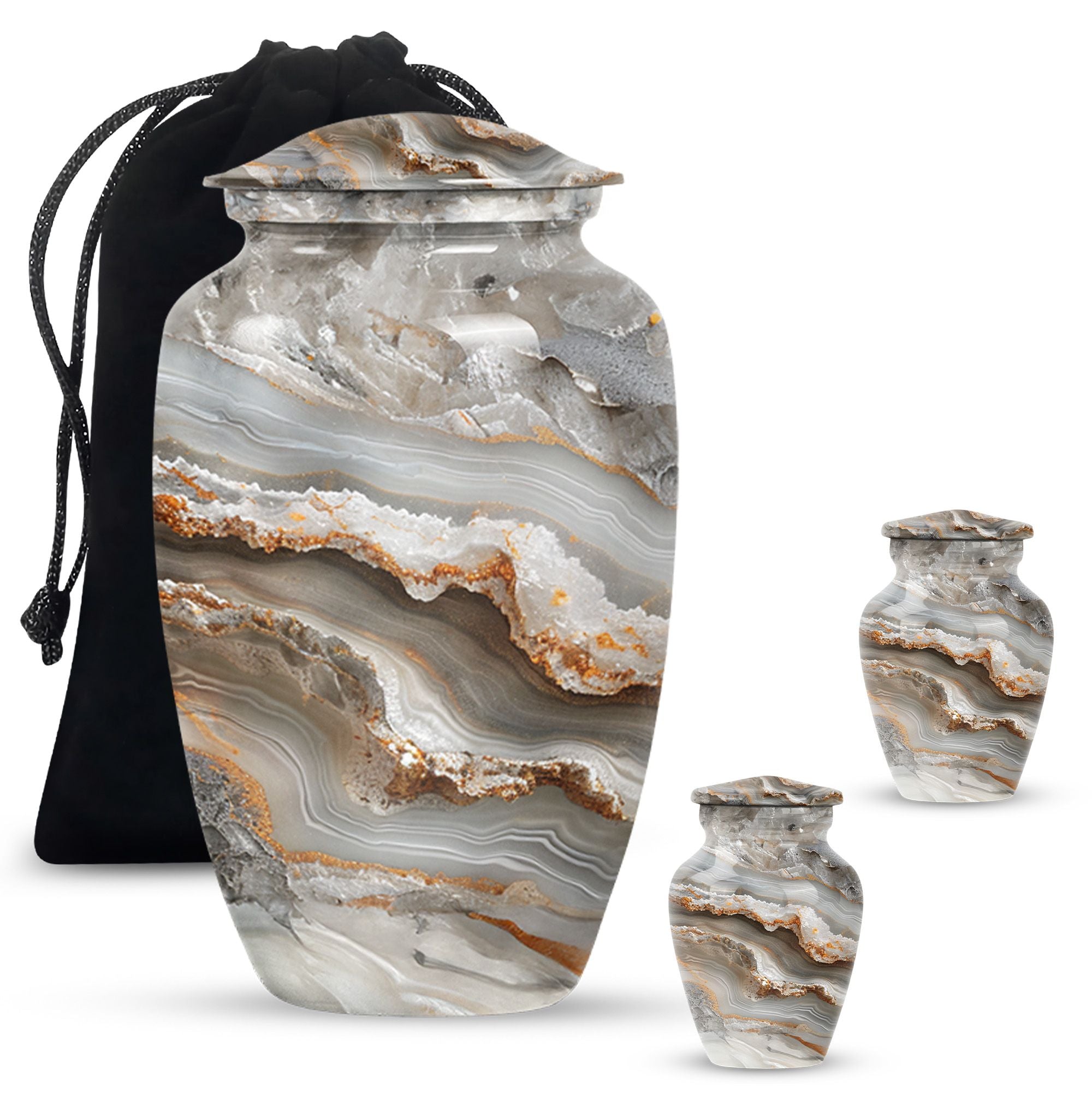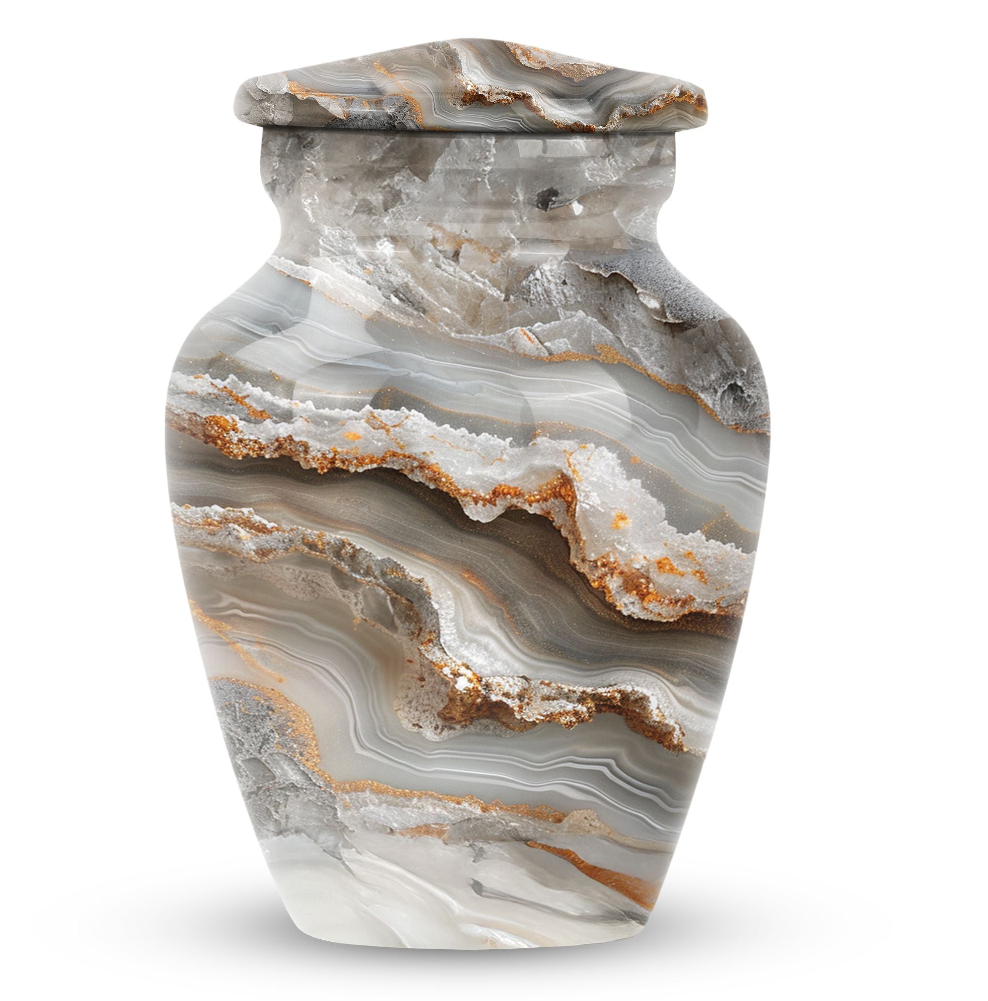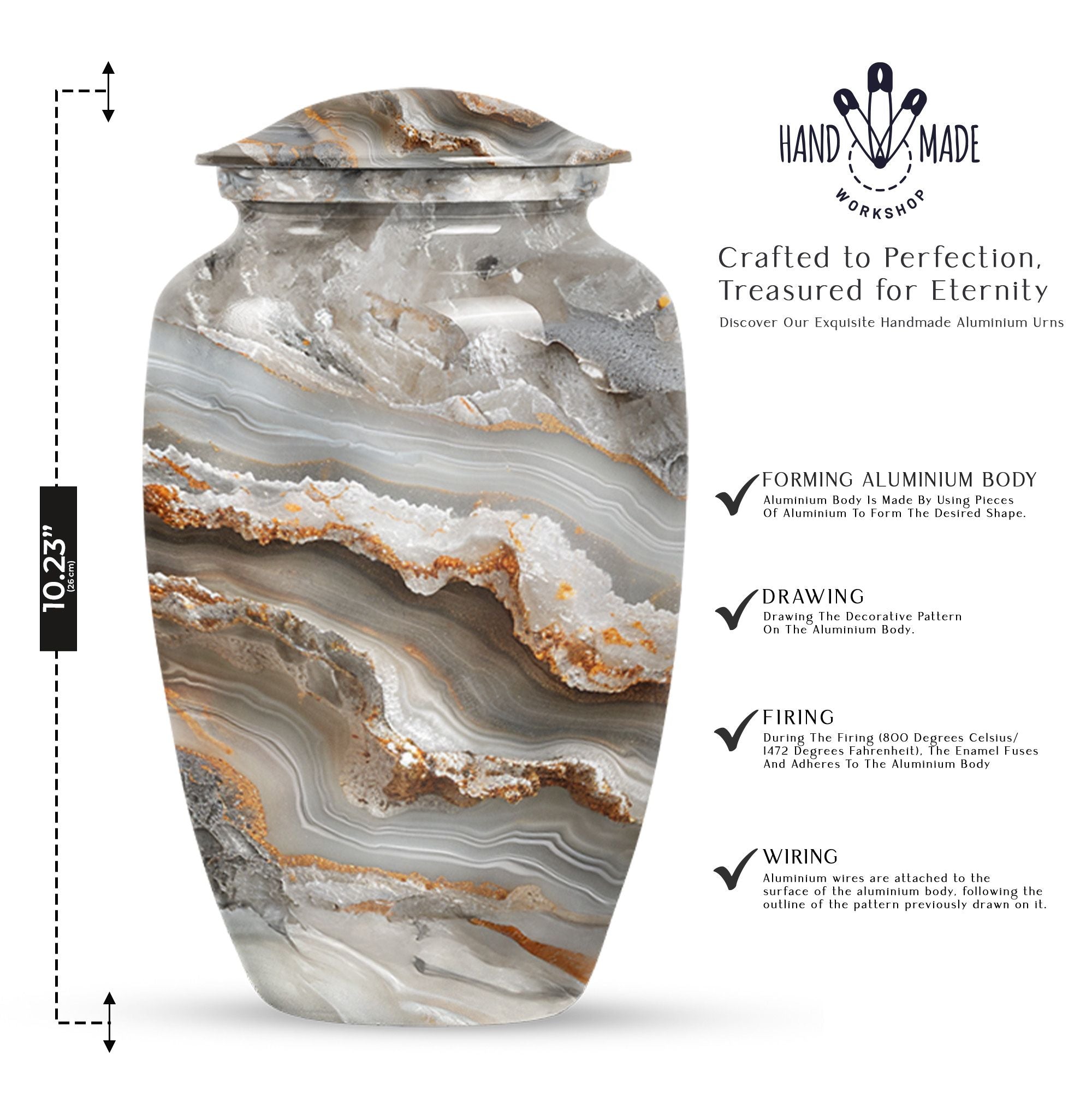 Uncover a unique final resting place for your loved ones with our Vibrant Swirl Large Urn. Crafted with care using robust but lightweight Aluminium, this funeral urn stands at an impressive 10 inches in height and weighs just 3.3 pounds. Tastefully accented with an abstract theme, the urn fits seamlessly into any household or burial setting. It is more than just an urn, it’s a subliminal art piece evoking fond memories. Its commanding size boasts a capacity of up to 200 cubic inches, providing ample space for human ashes. Personalize this memorial urn with engraved names, making it that much more special and heartfelt. Complementing this acquisition, is a velvet pouch to house the ashes securely. Whether you're searching for unique urns for human ashes, or a burial cremation urn, our Vibrant Swirl selection offers a captivating blend of visual appeal and emotional significance. Amplify your memorial ceremony preparations with this remarkable cremation urn.