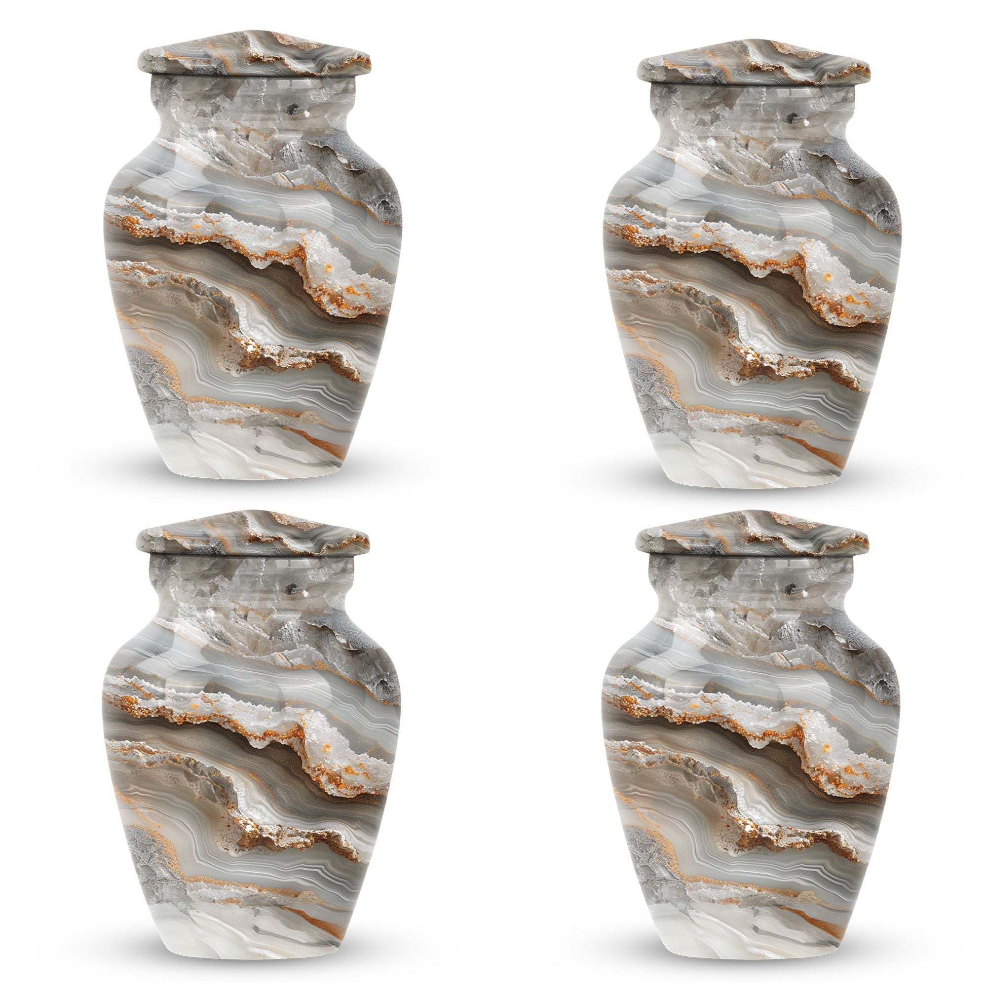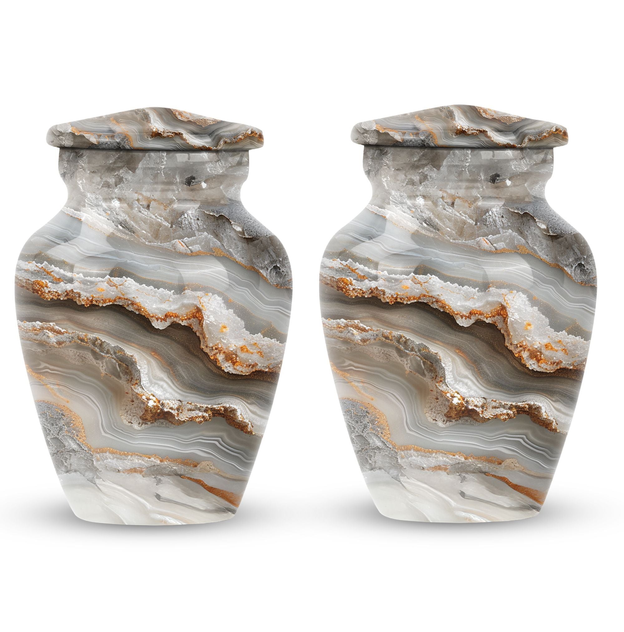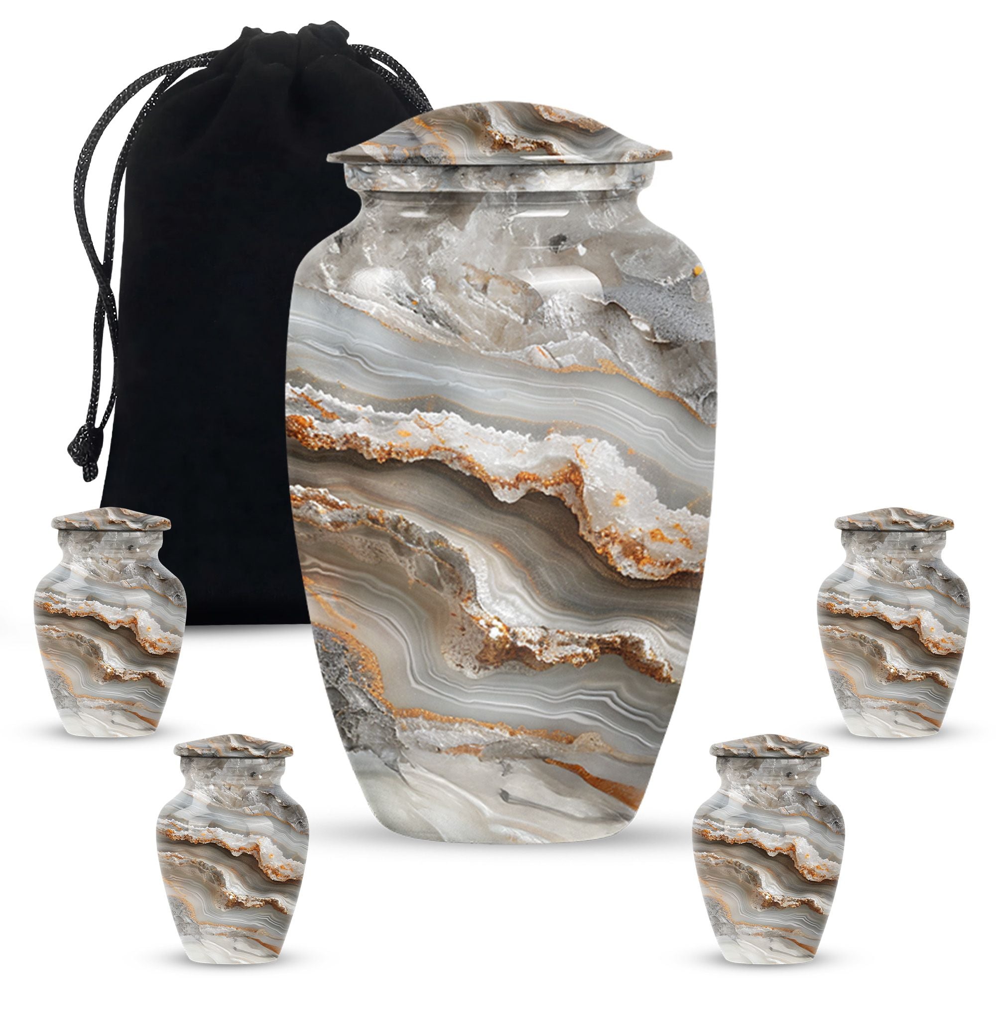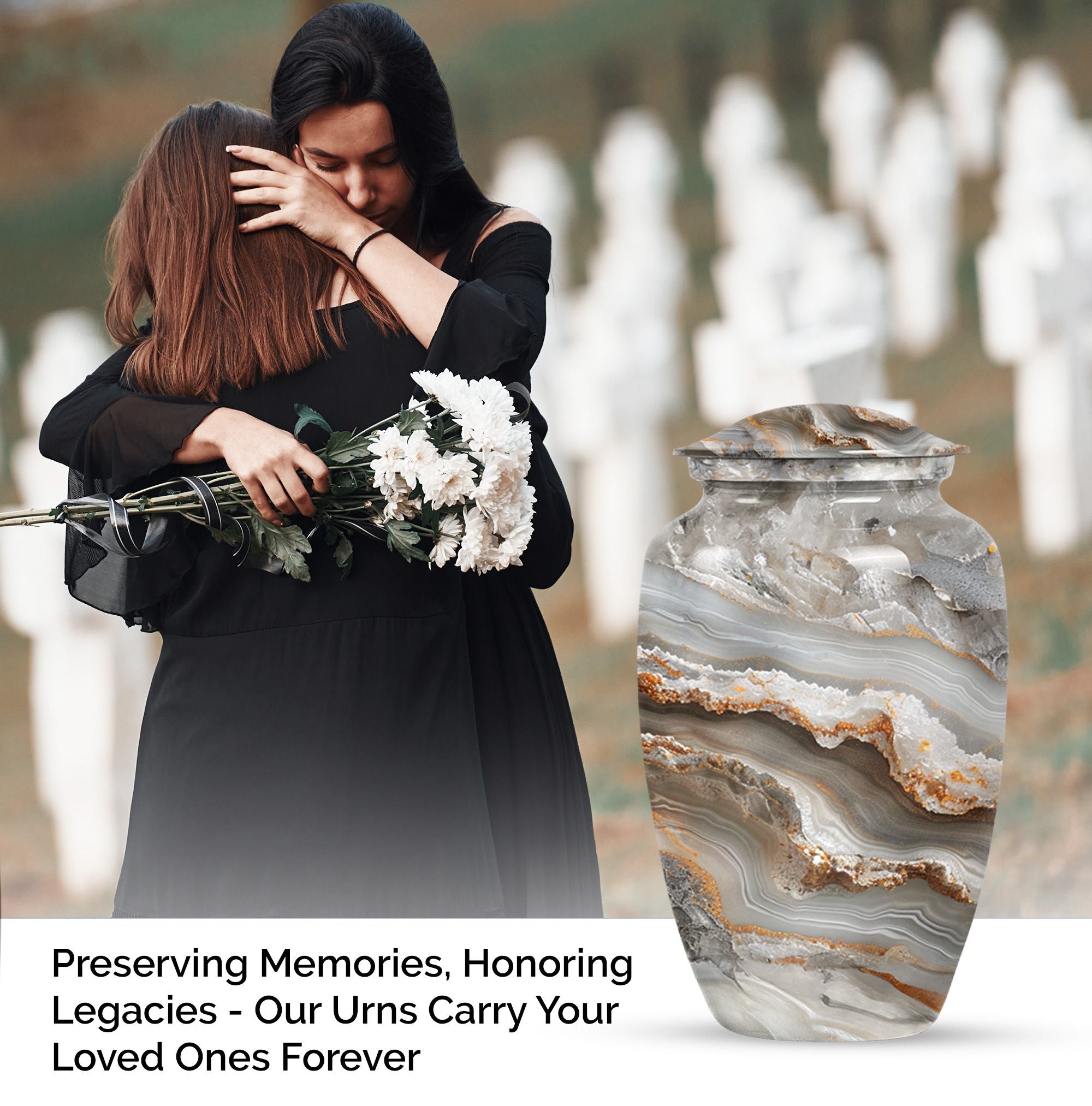 Uncover a unique final resting place for your loved ones with our Vibrant Swirl Large Urn. Crafted with care using robust but lightweight Aluminium, this funeral urn stands at an impressive 10 inches in height and weighs just 3.3 pounds. Tastefully accented with an abstract theme, the urn fits seamlessly into any household or burial setting. It is more than just an urn, it’s a subliminal art piece evoking fond memories. Its commanding size boasts a capacity of up to 200 cubic inches, providing ample space for human ashes. Personalize this memorial urn with engraved names, making it that much more special and heartfelt. Complementing this acquisition, is a velvet pouch to house the ashes securely. Whether you're searching for unique urns for human ashes, or a burial cremation urn, our Vibrant Swirl selection offers a captivating blend of visual appeal and emotional significance. Amplify your memorial ceremony preparations with this remarkable cremation urn.