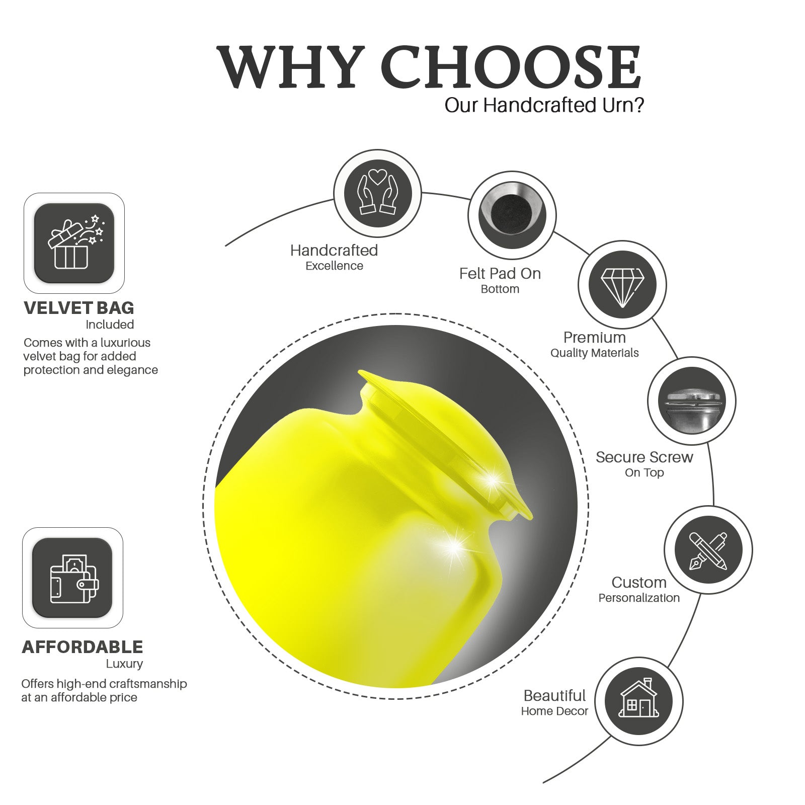 This urn is a premium choice for those seeking custom cremation urns or customized urns with full personalization—engrave a name, date, or short message to create a unique memorial. The bold yellow color symbolizes warmth, energy, and eternal light, while the durable build ensures long-term use for storage or display.
